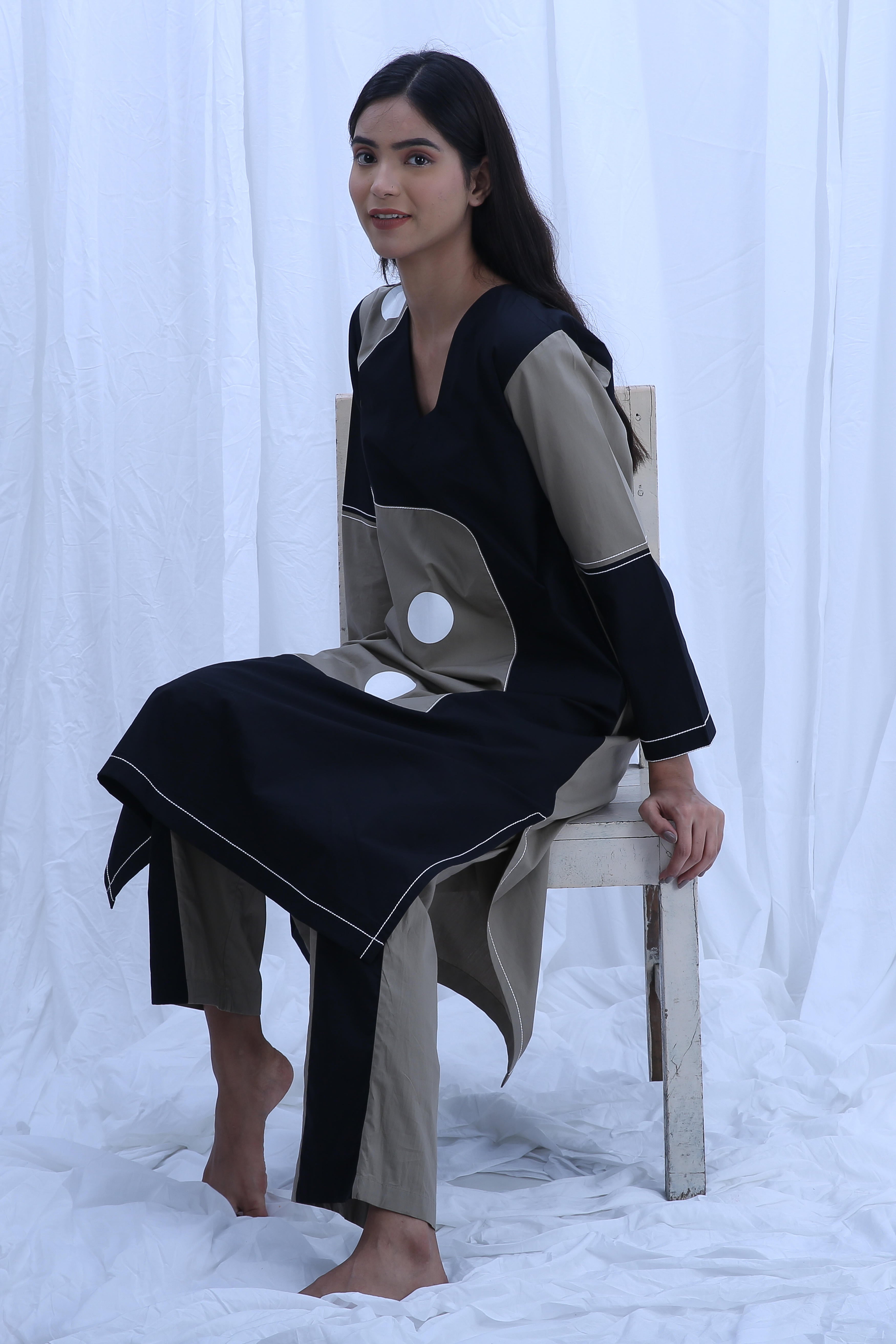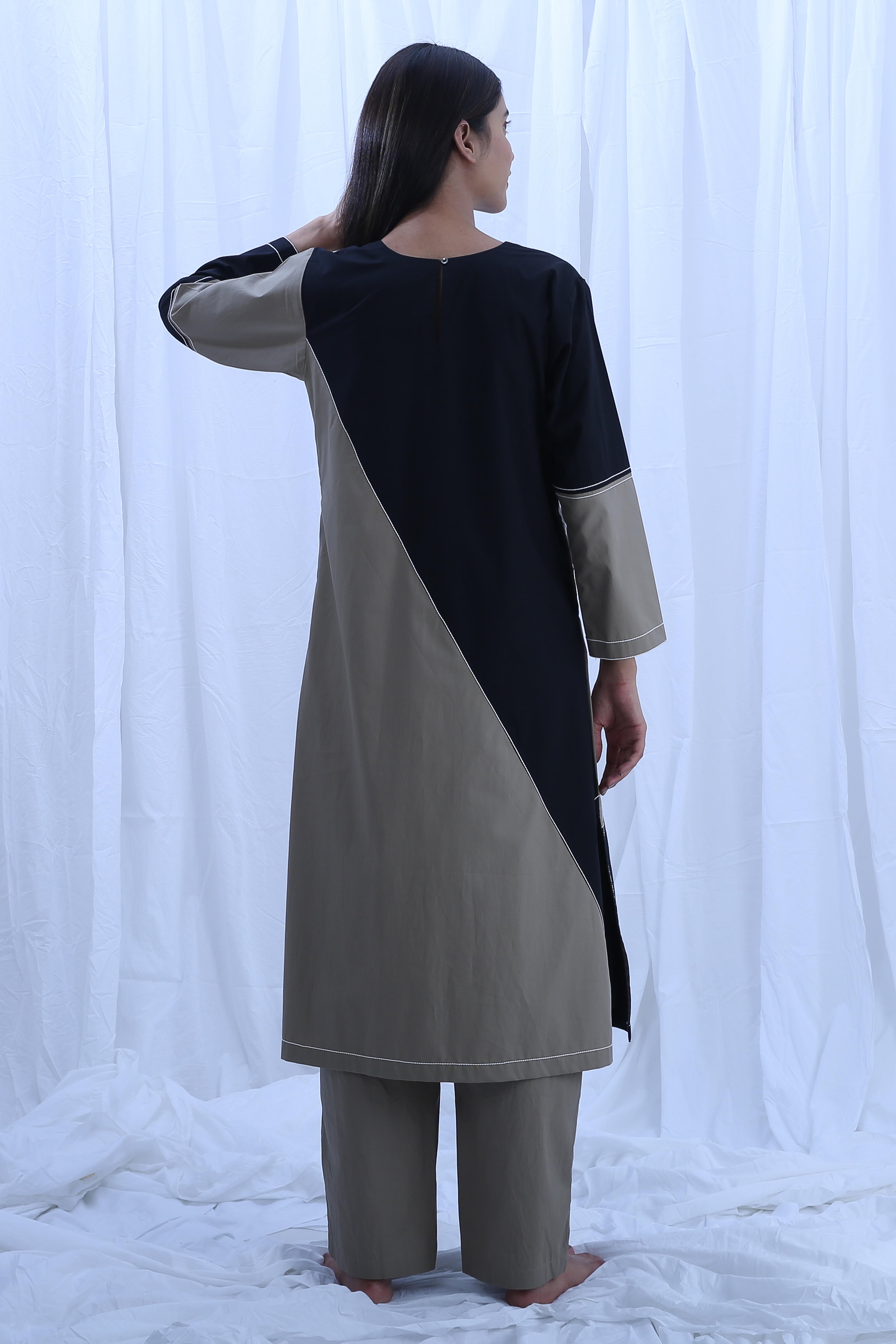 This stunning Poplin Cotton set comes in the beautiful Clary Sage with Black patterns. The top Length is 44 inches and bottom is 38 inches, offering an elegant fit suitable for various occasions. Our model, who is 5'8" tall, is wearing a size S.