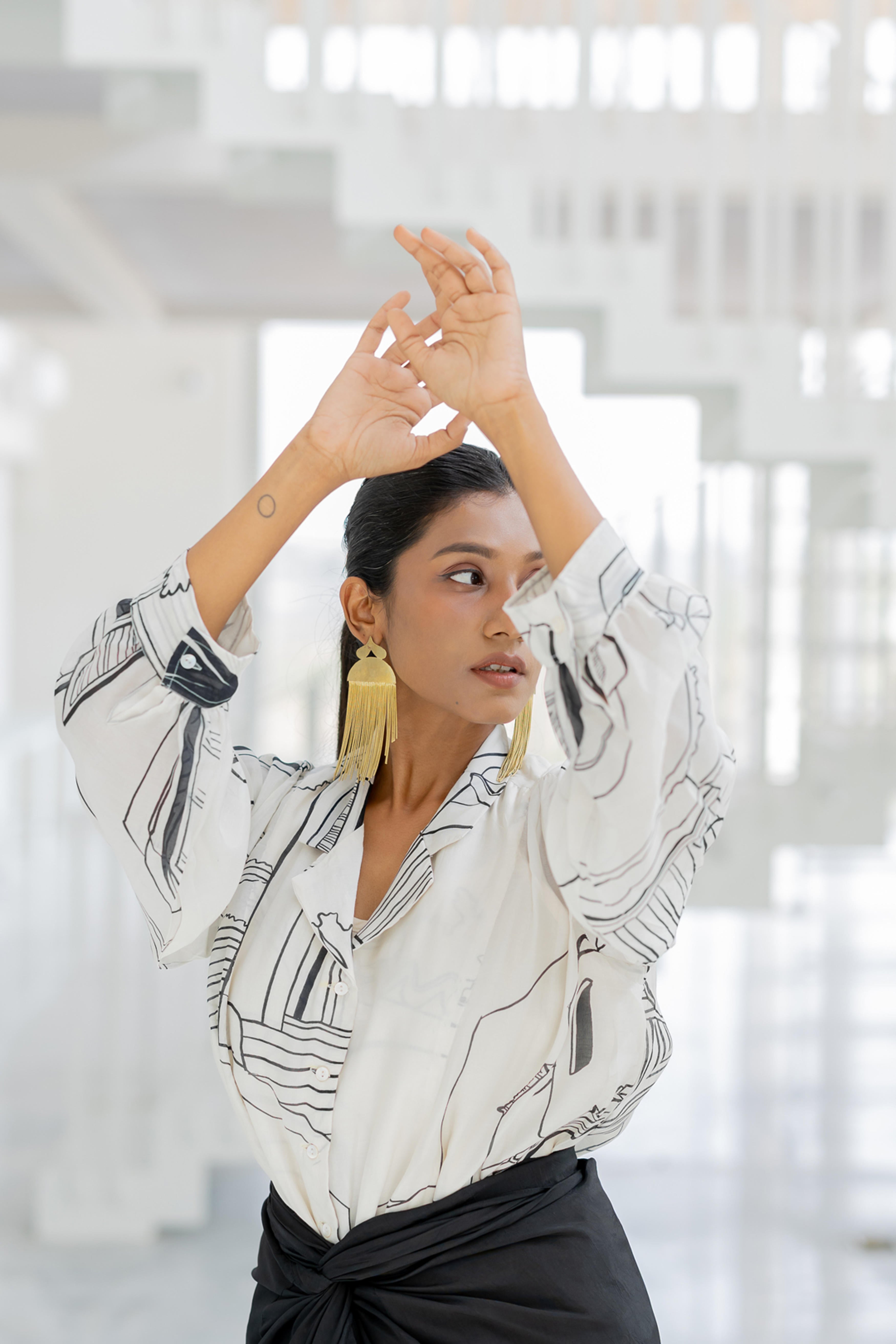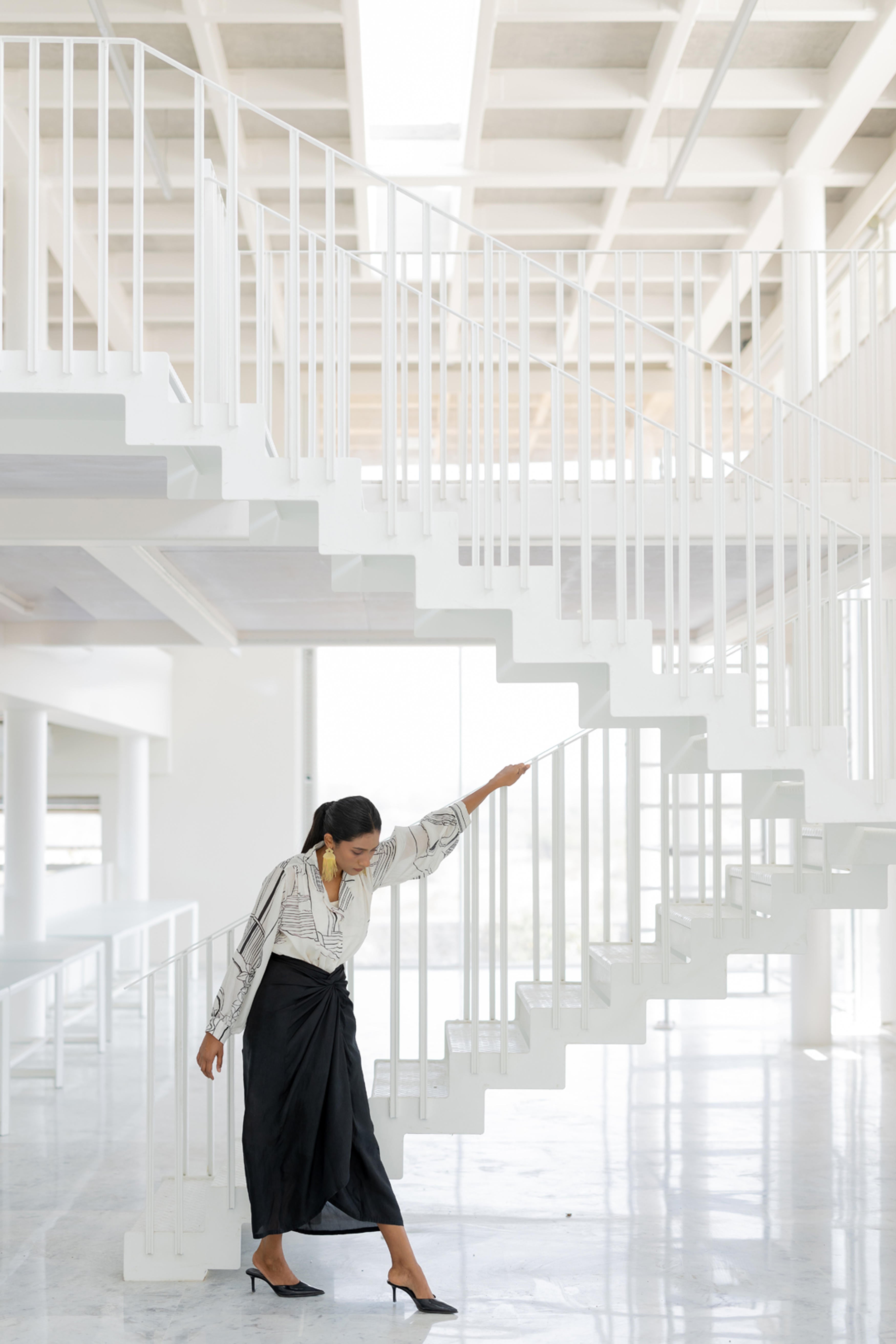 A striking fluid silhouette, the Arched Doorways Skirt is a draped black silk skirt that can be draped in various ways as per user's choice. The drape can be knotted in the centre front(as seen in the photos) or towards the side. Paired with any blouse or tee of your choice, this skirt can be a versatile addition to your stylish basics wardrobe.