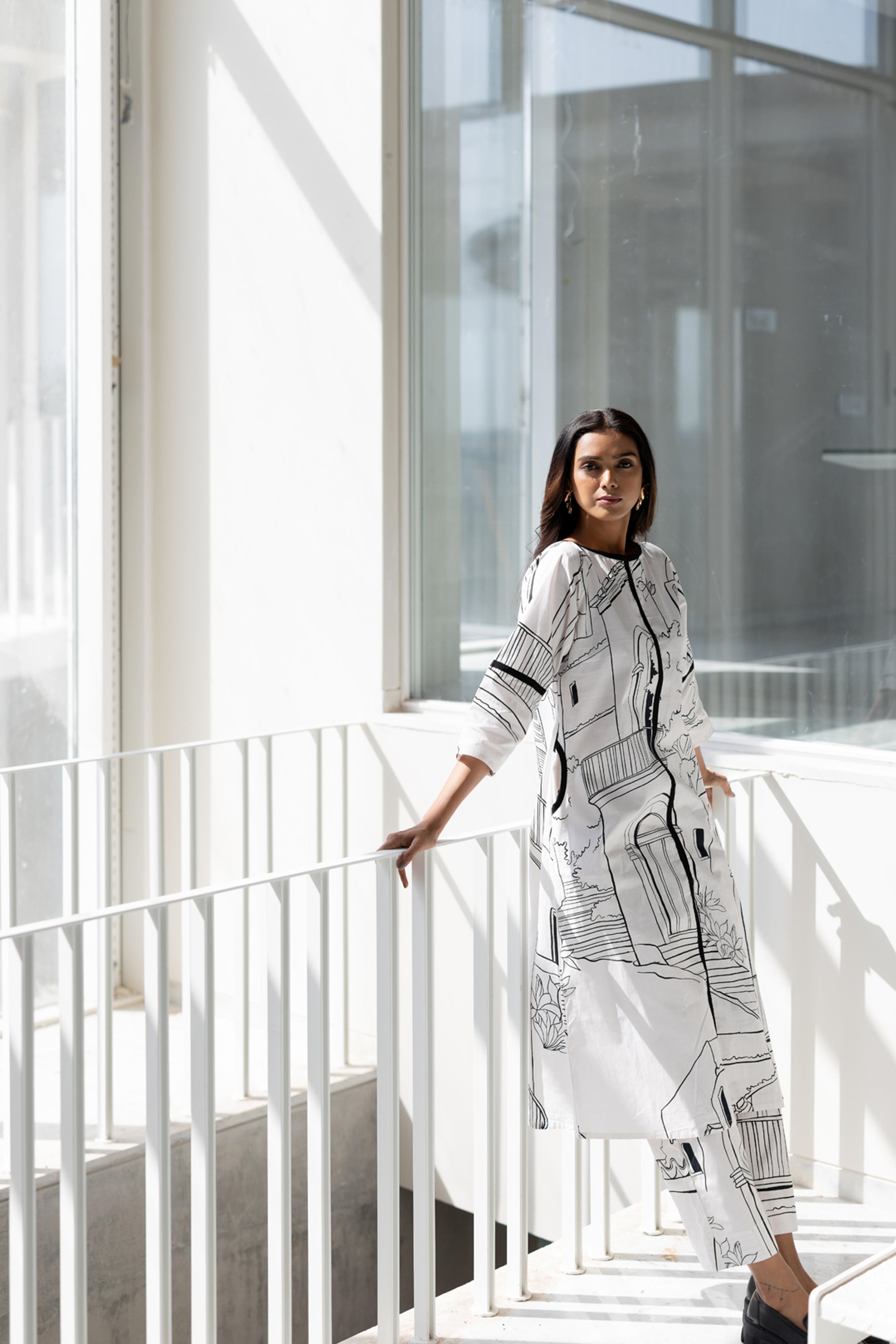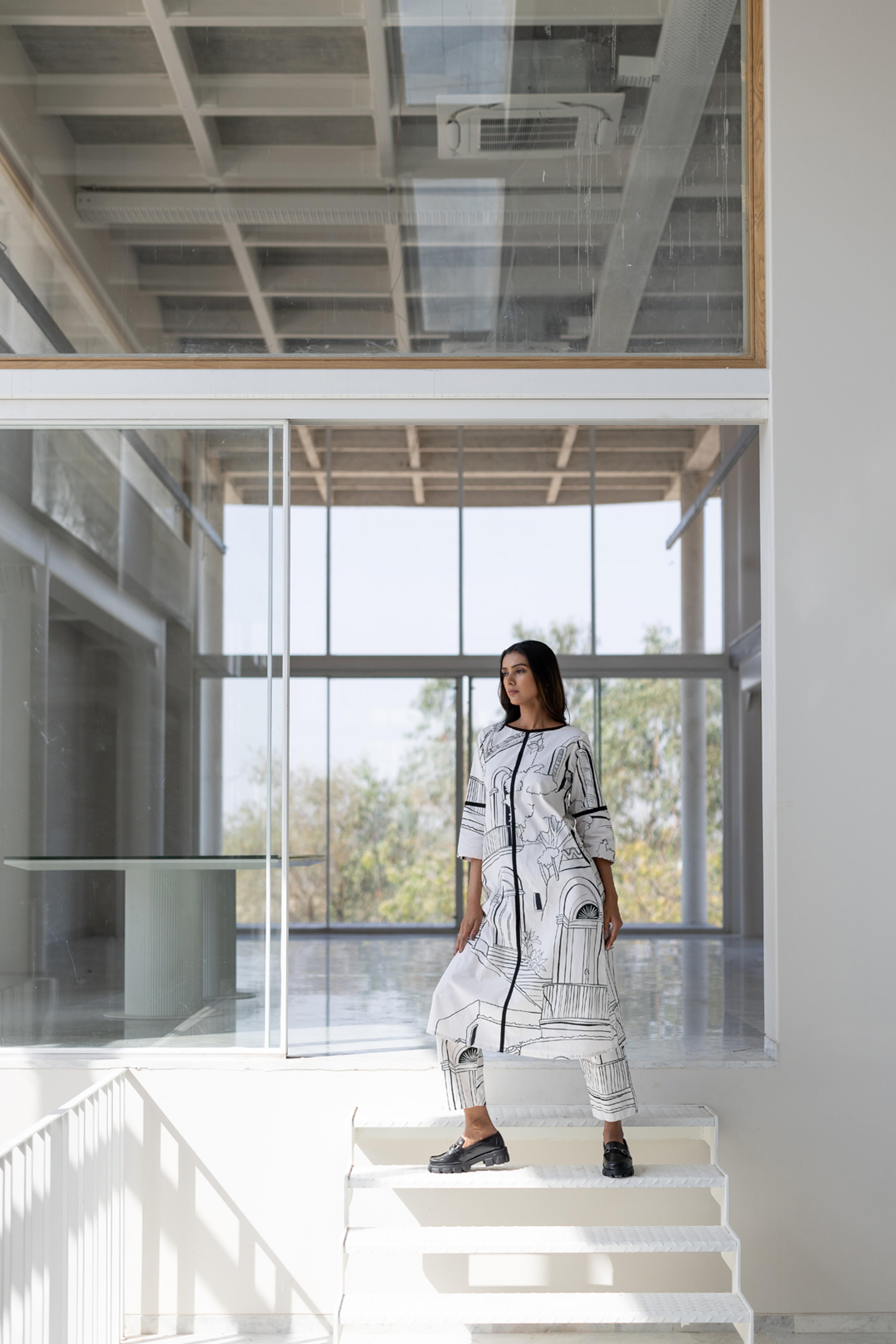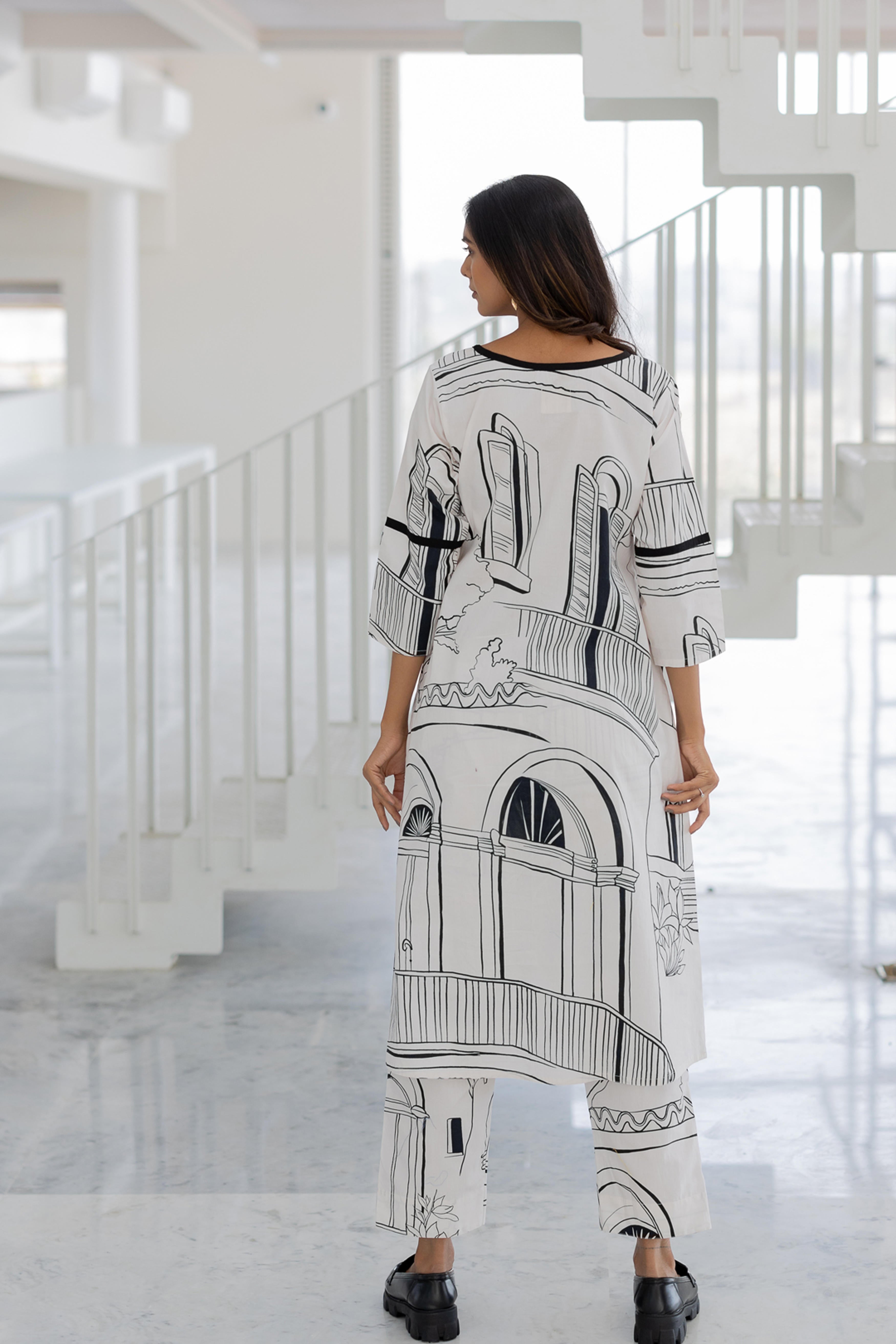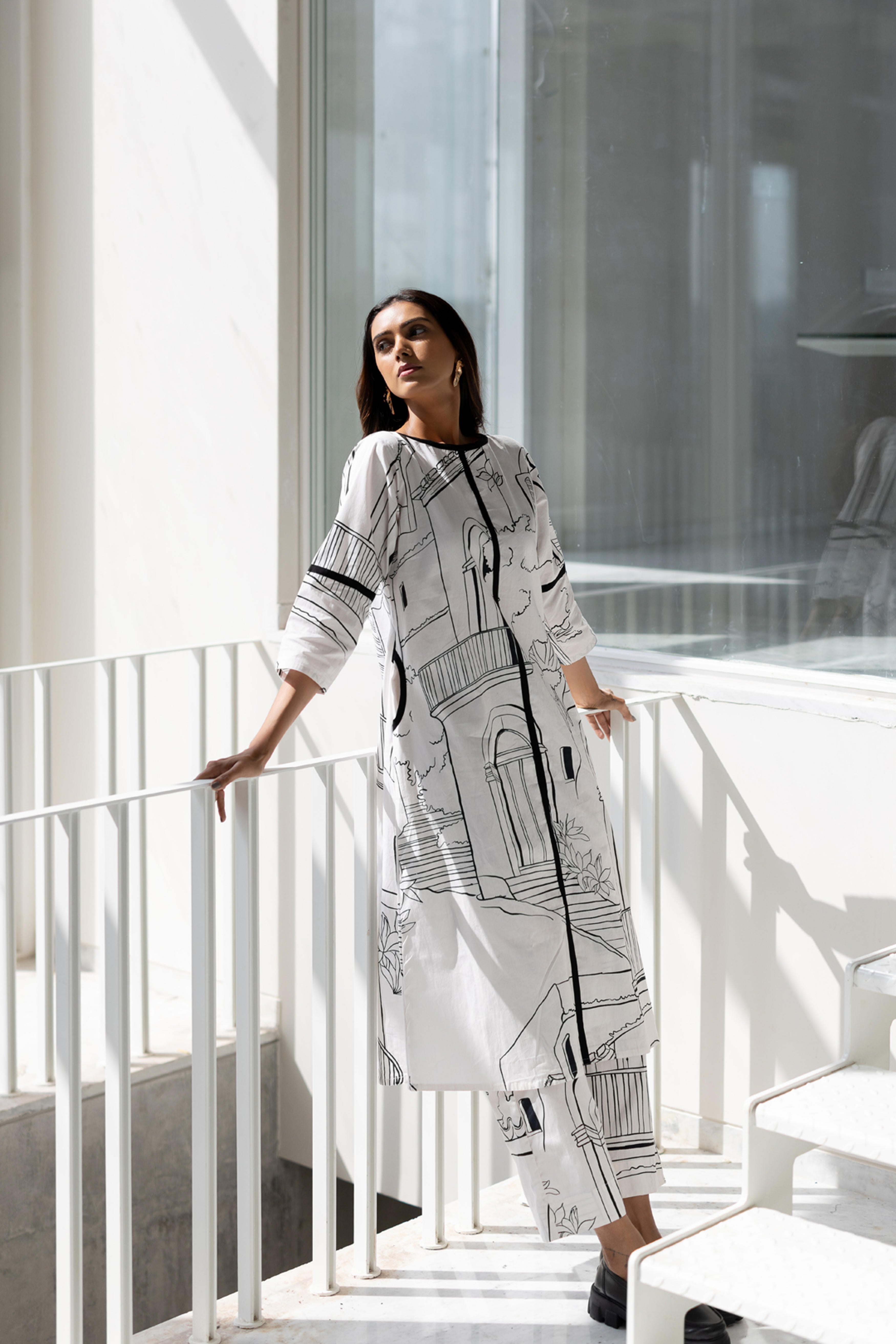 Make a bold statement with the Arches and Avenues Kurta Set, designed for the modern woman who loves artistic expression in fashion. This striking ensemble features a hand-drawn architectural print on a crisp white base, creating a sophisticated yet edgy look. The kurta features black piping details, while the straight-fit trousers complement the design seamlessly. Perfect for workwear, casual outings, or creative events, this set blends minimalism and style effortlessly.