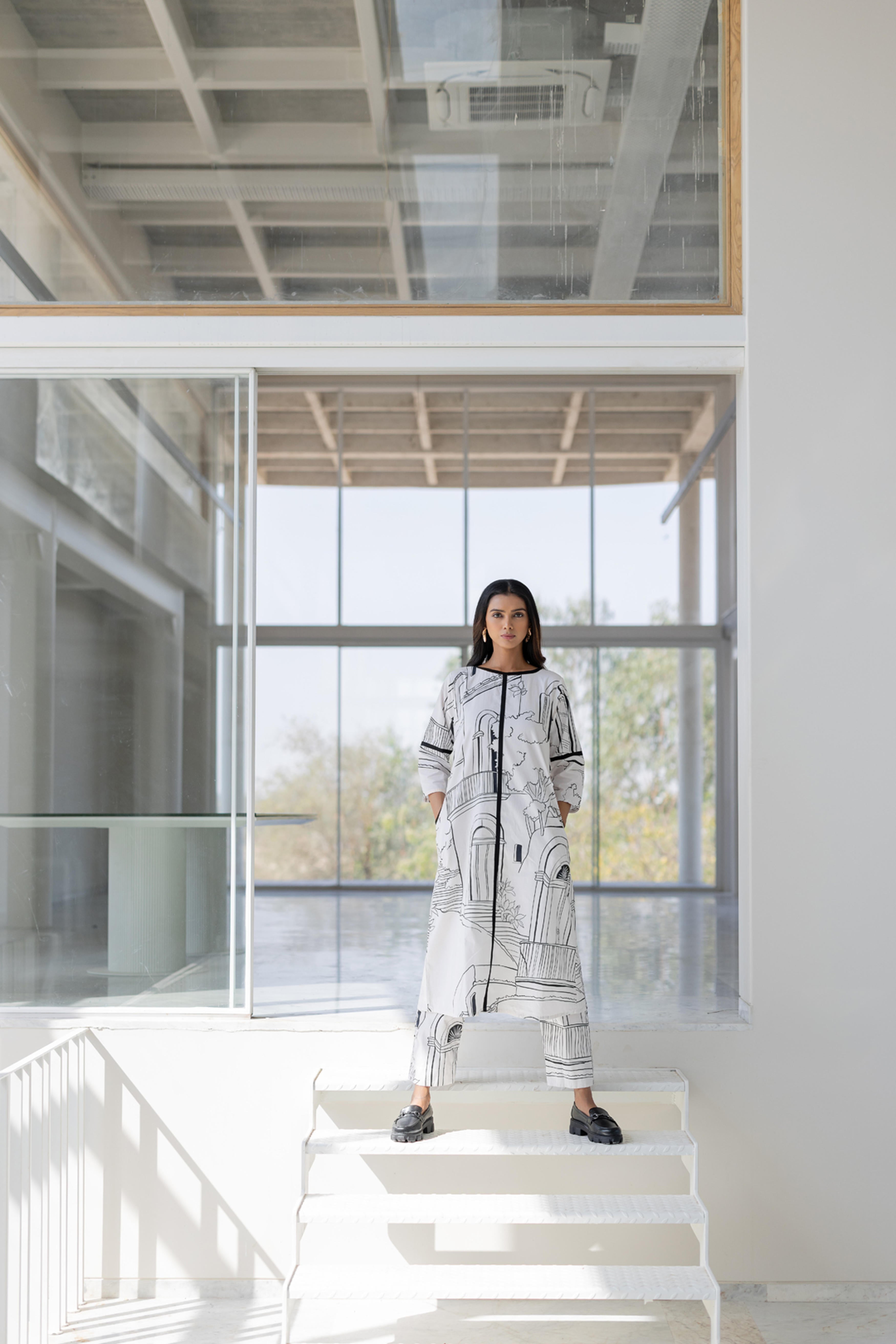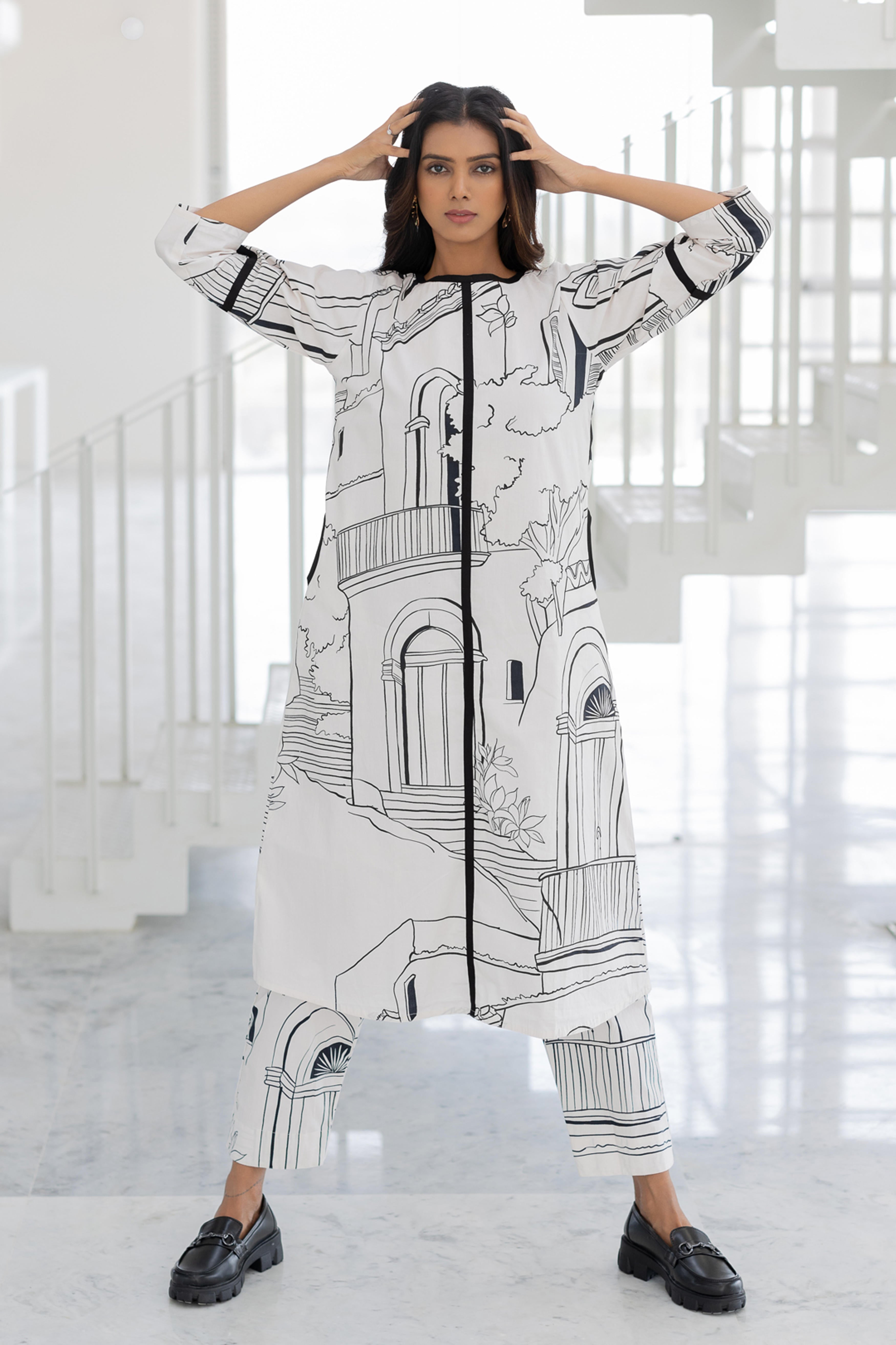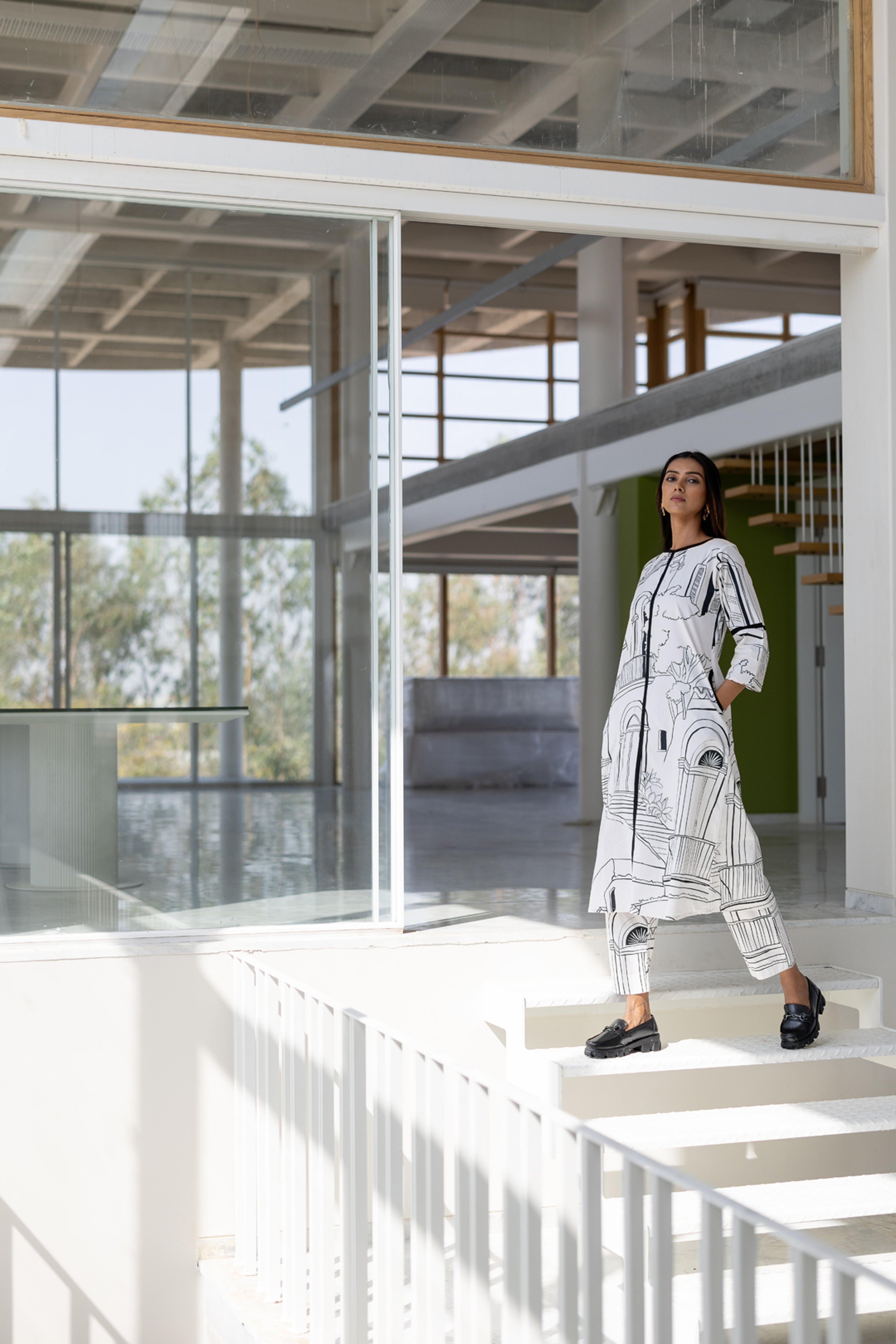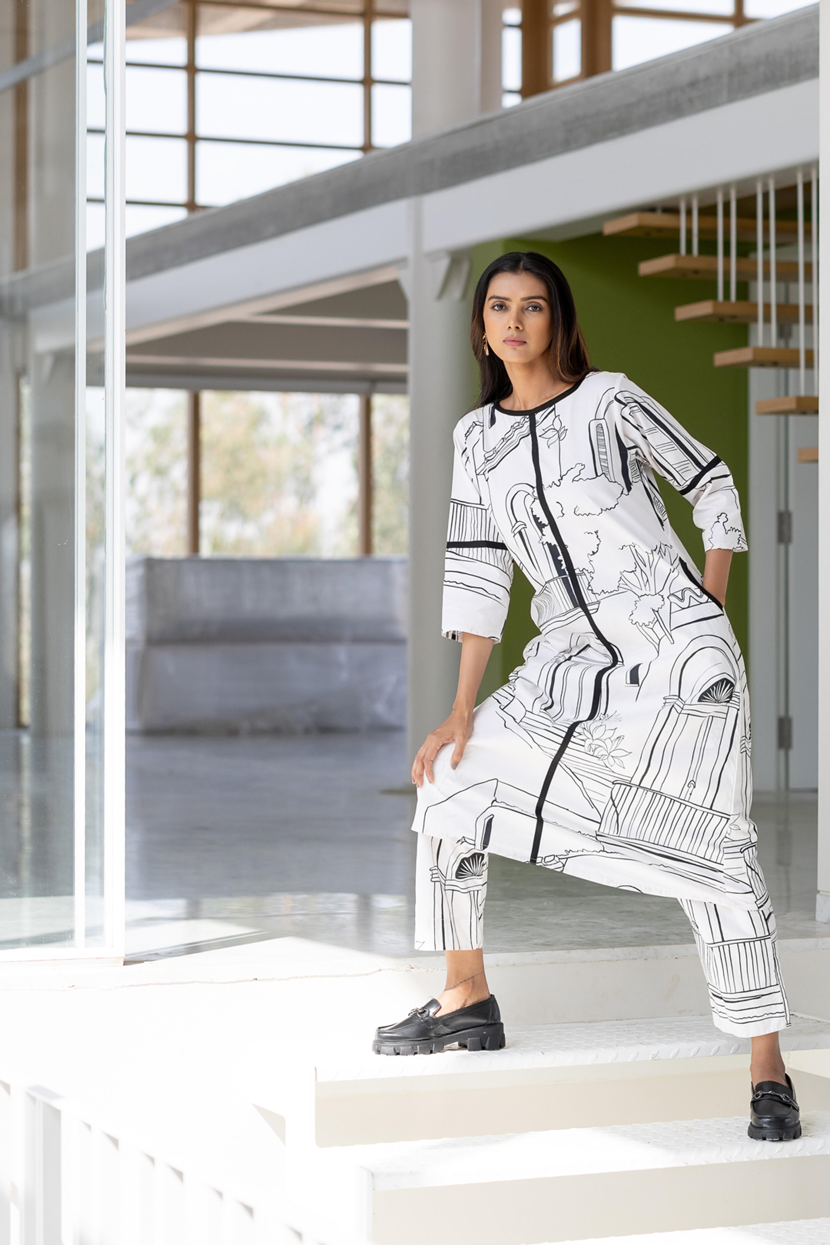 Make a bold statement with the Arches and Avenues Kurta, designed for the modern woman who loves artistic expression in fashion. This striking ensemble features a hand-drawn architectural print on a crisp white base, creating a sophisticated yet edgy look. The kurta features black piping details on the neckline,front and sleeves. Perfect for workwear, casual outings, or creative events, this kurta blends minimalism and style effortlessly.