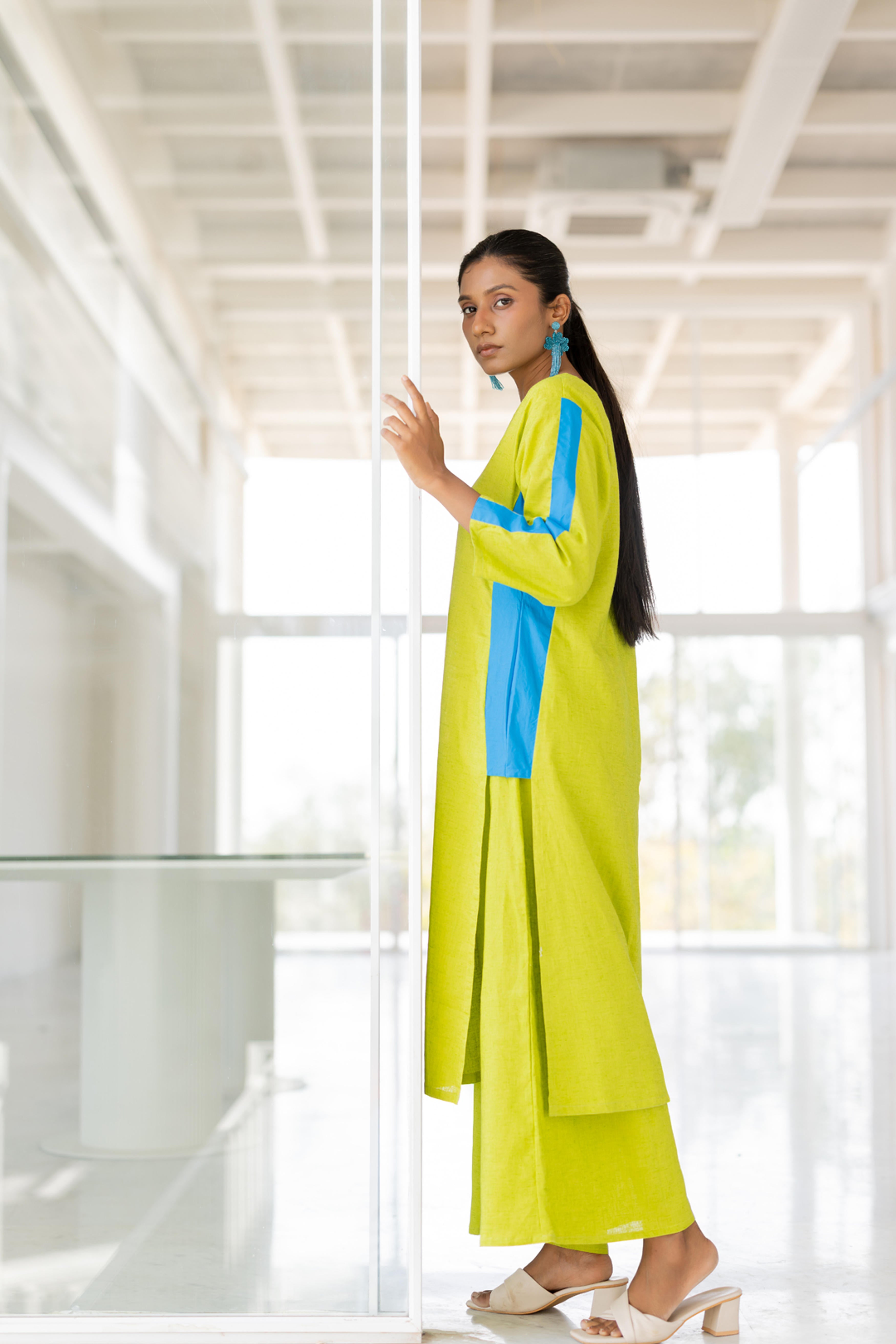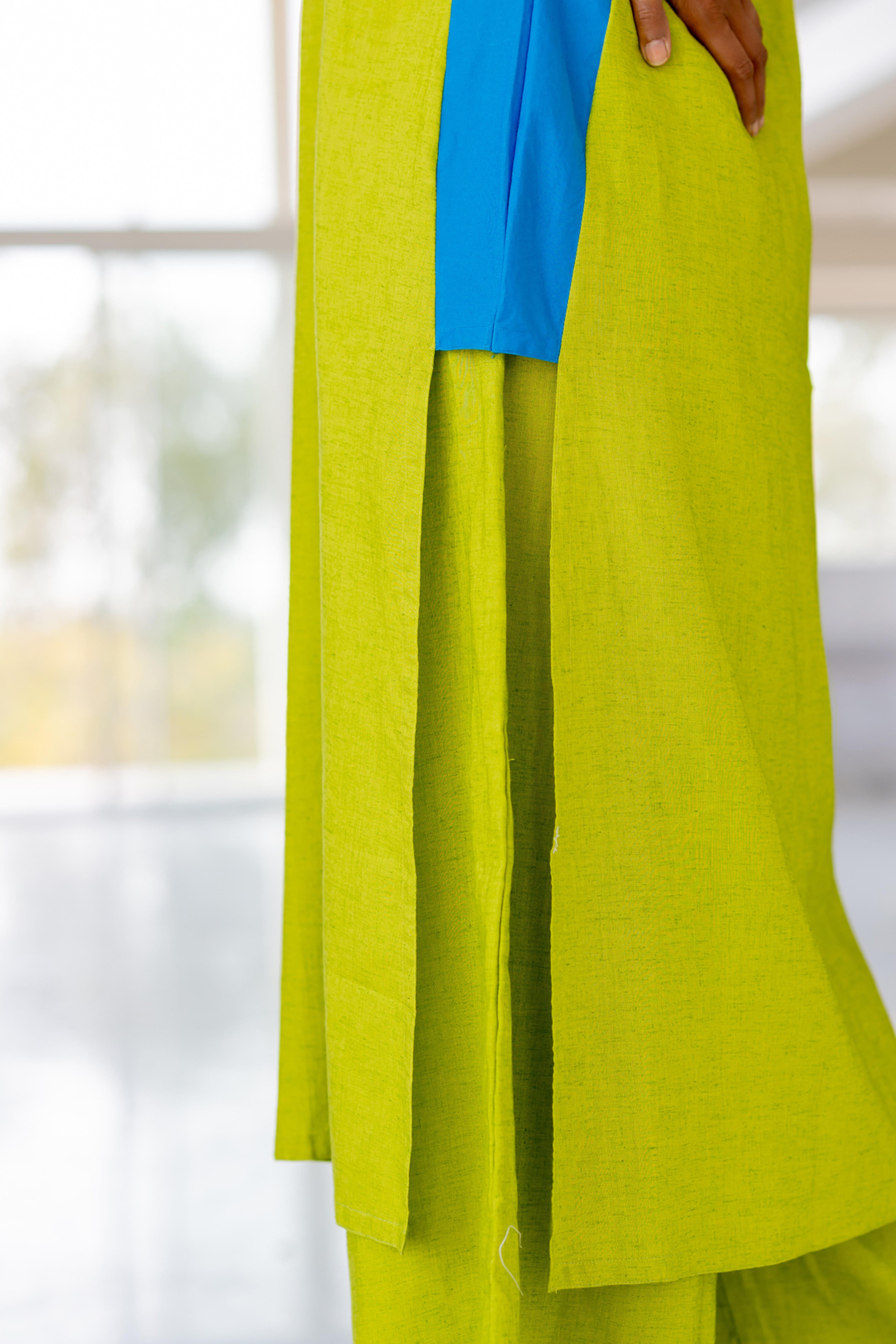 A harmonious blend of elegance and ease, the Avocado Azure Box Slit Kurta is perfect for those who love effortless style. The soothing green tone is enhanced with striking blue side panel details, adding a refreshing contrast. Designed with a relaxed silhouette and a flowy fit, this kurta is ideal for both casual and semi-formal occasions.