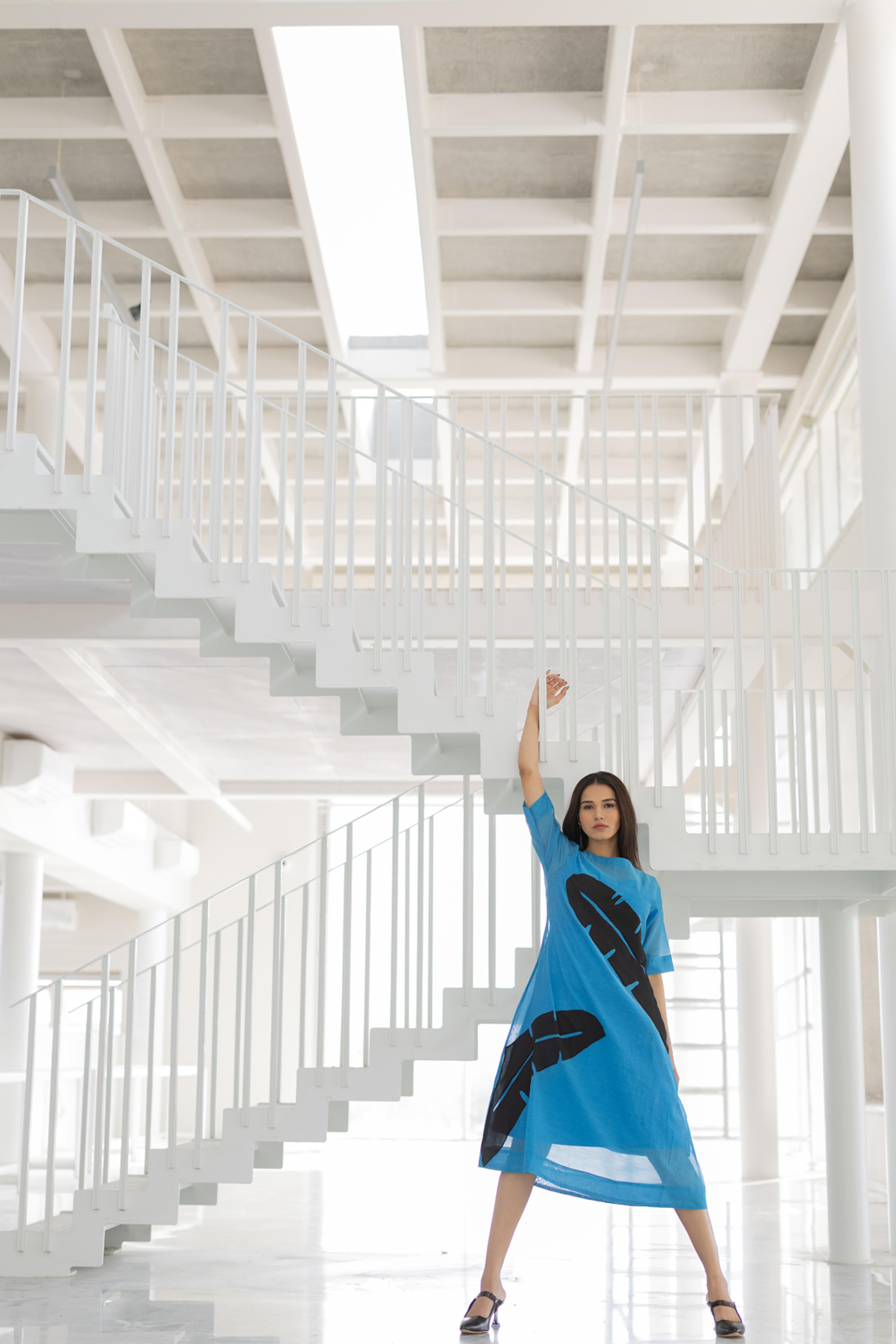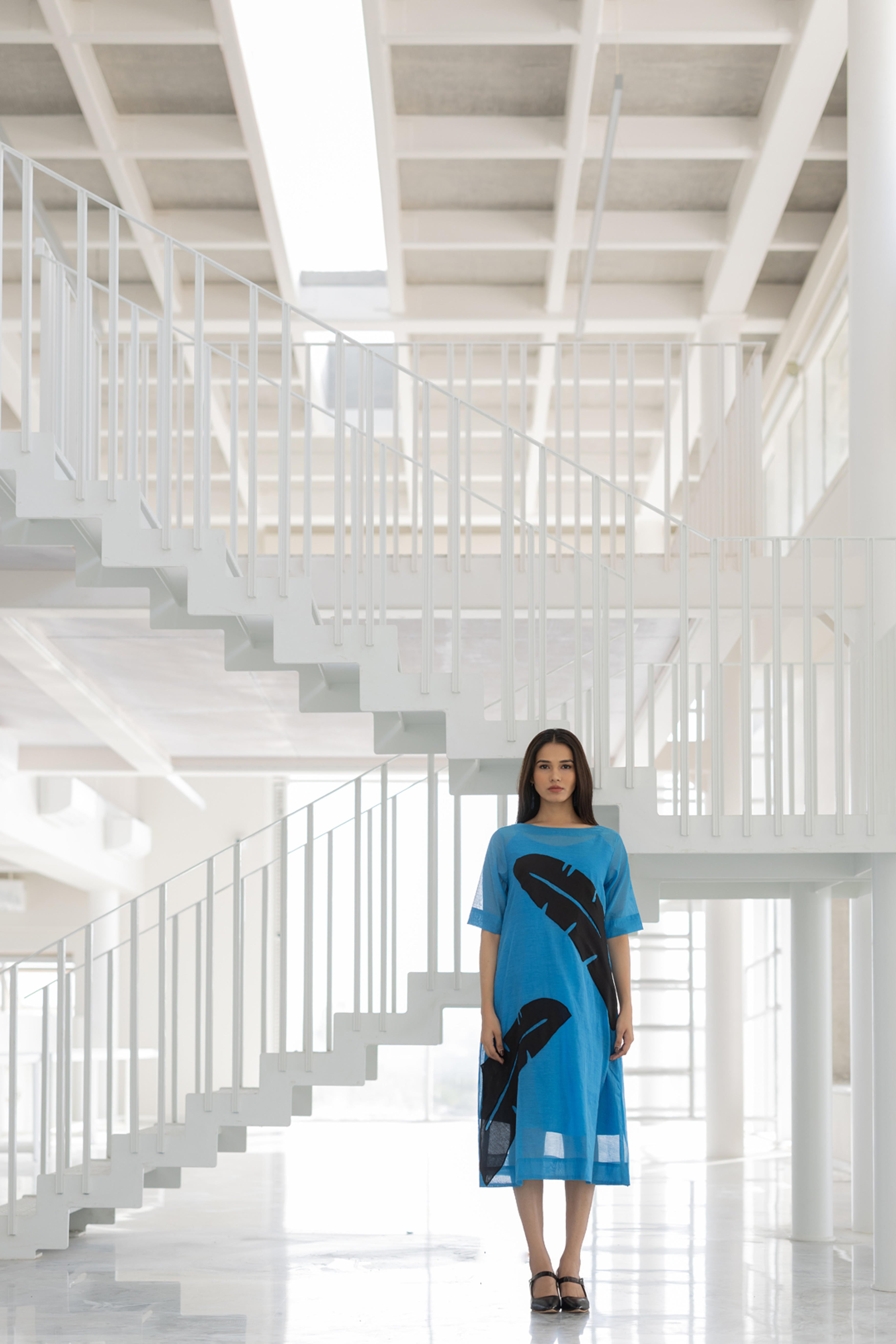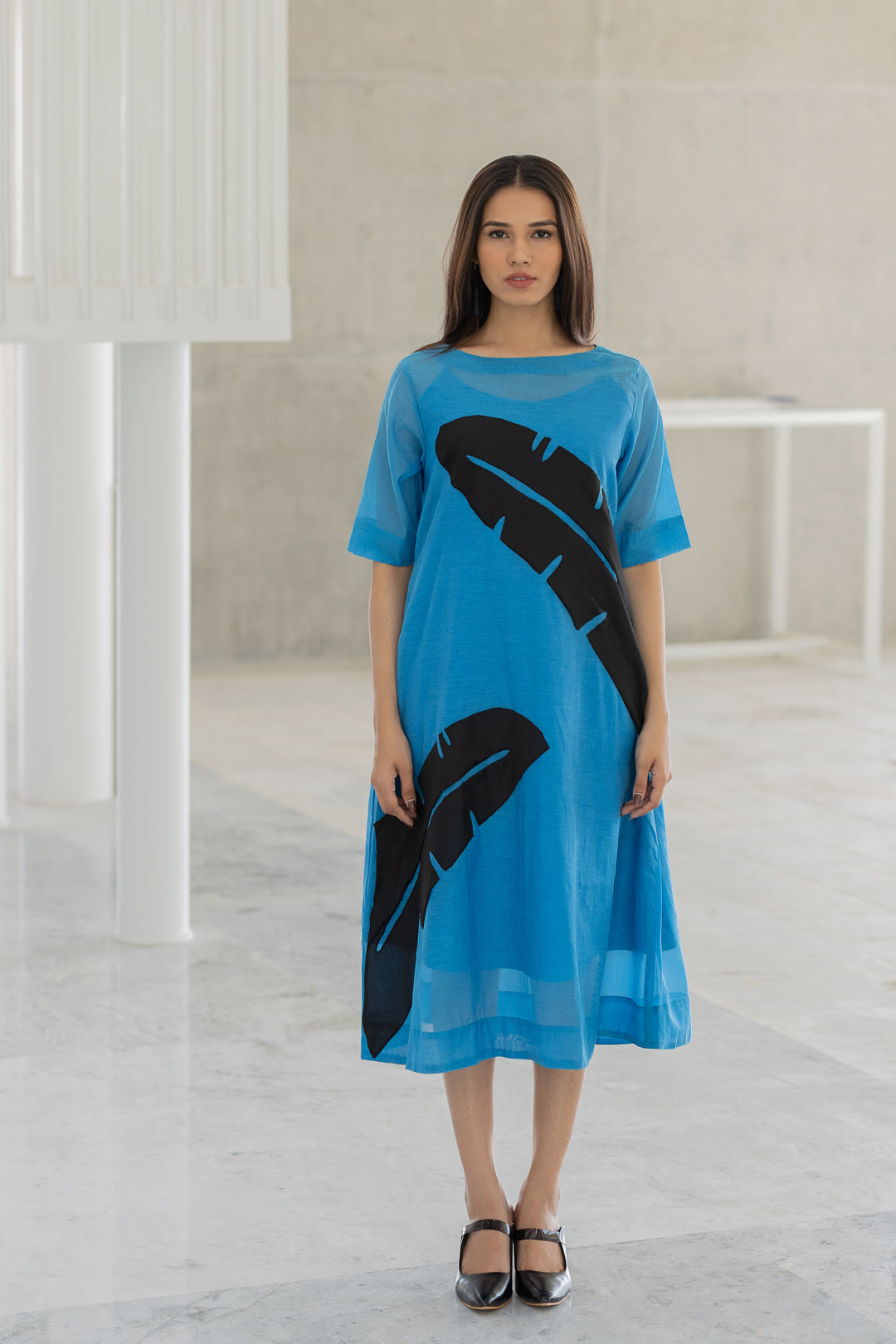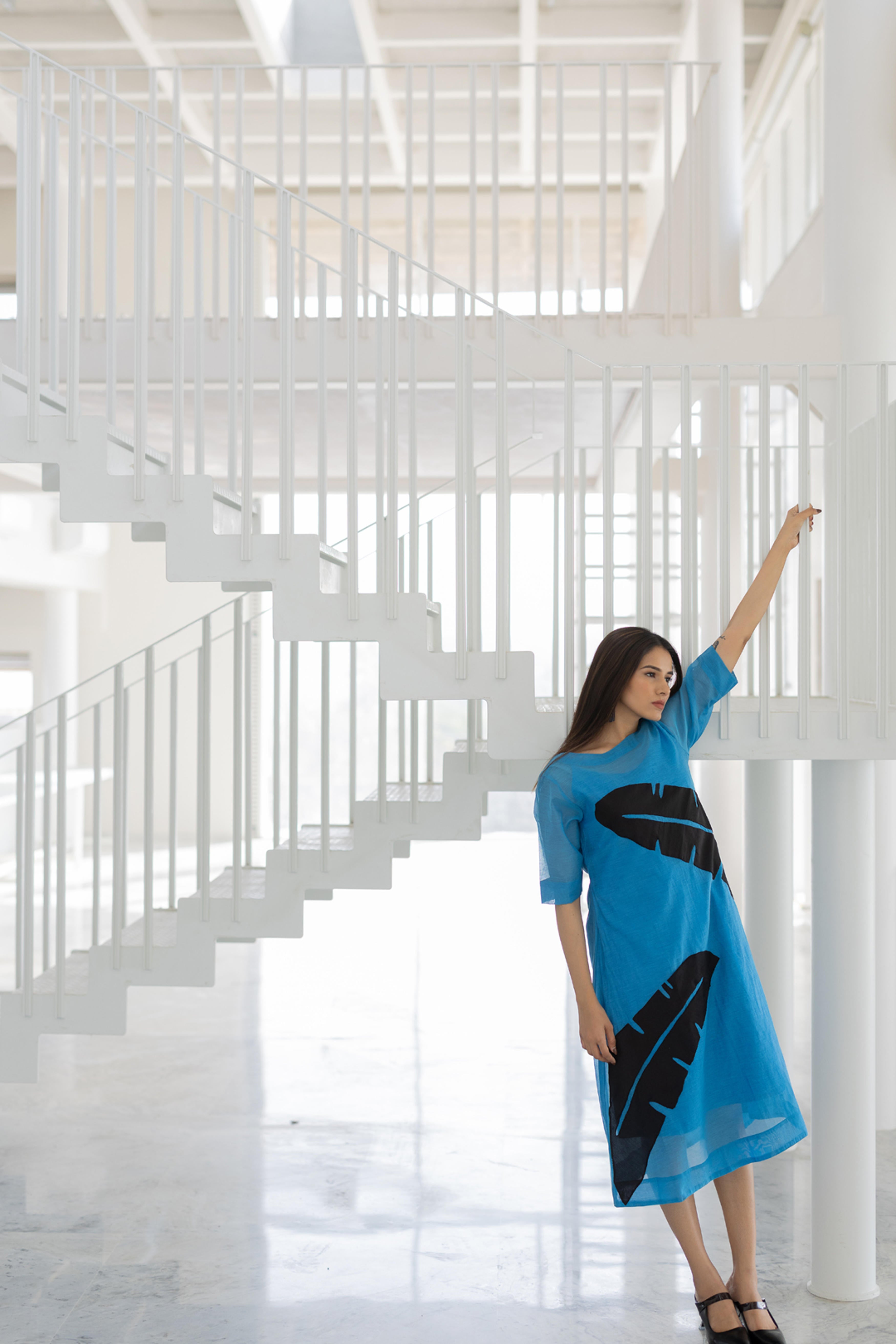 A perfect blend of elegance and comfort, the Azure Black Applique Dress is designed to make a statement. Crafted from lightweight chanderi fabric in a striking blue hue, this dress features bold black banana leaf appliques that add an artistic touch. The relaxed silhouette, boat neckline, and elbow-length sleeves ensure effortless sophistication, making it ideal for both casual outings and evening gatherings.
