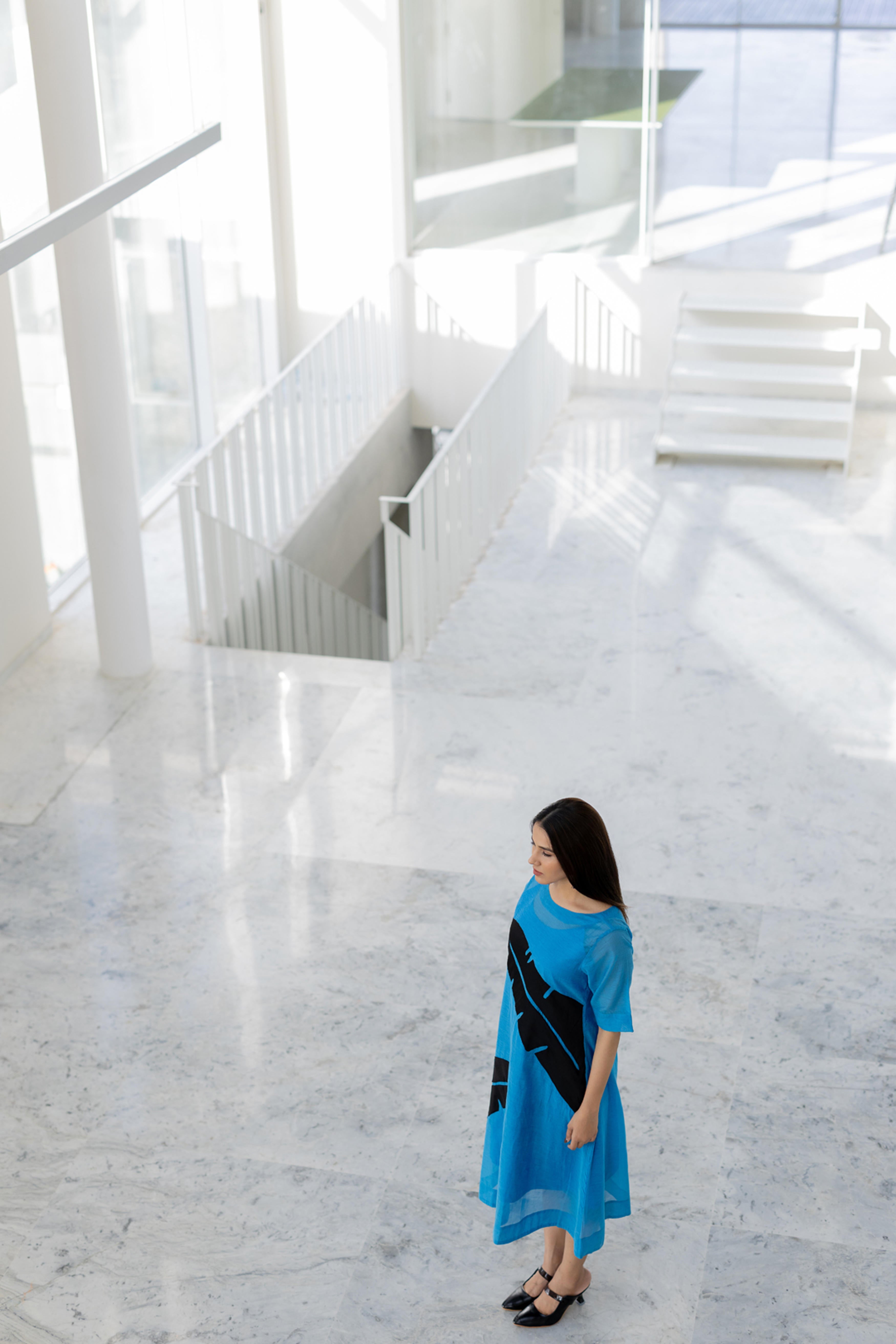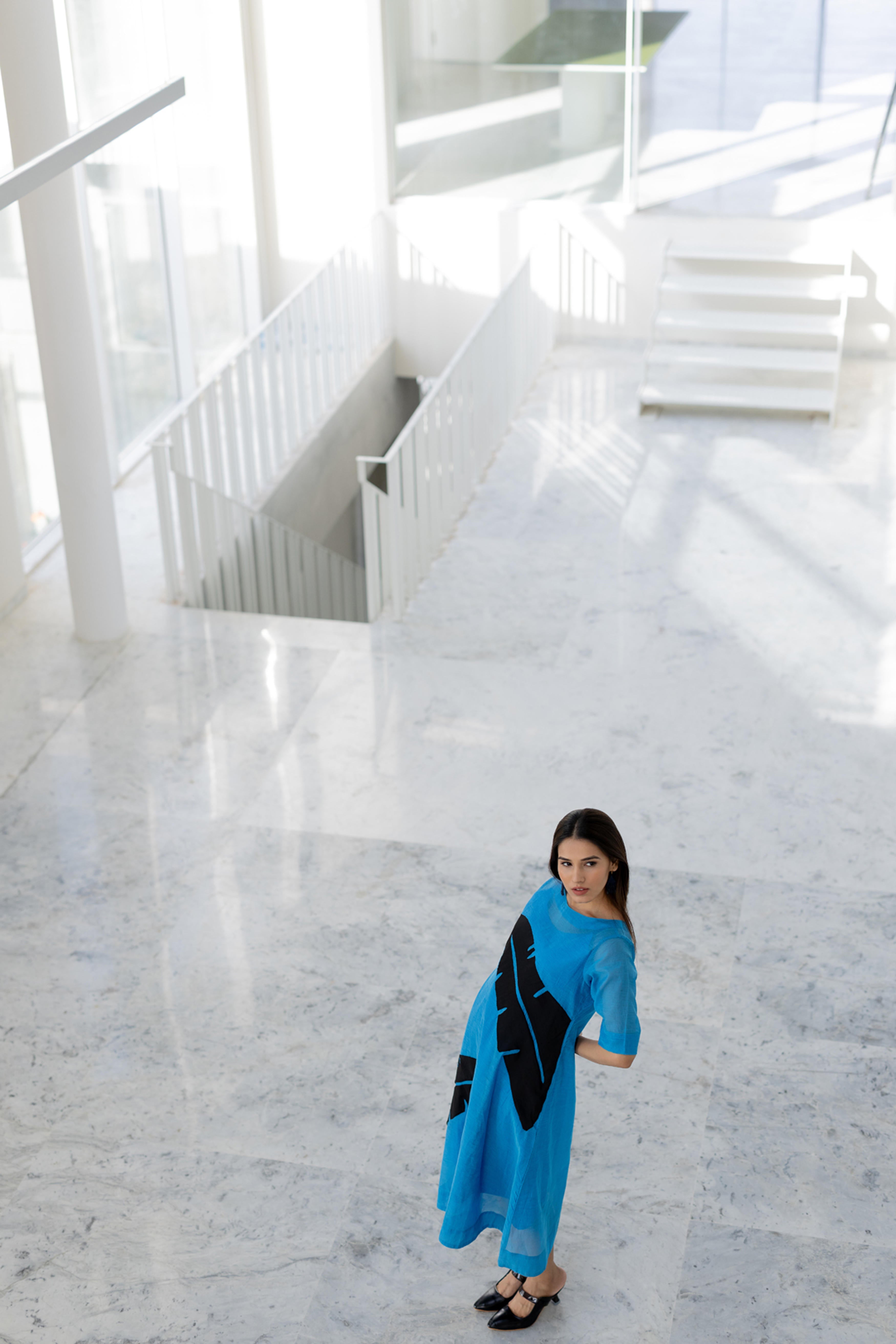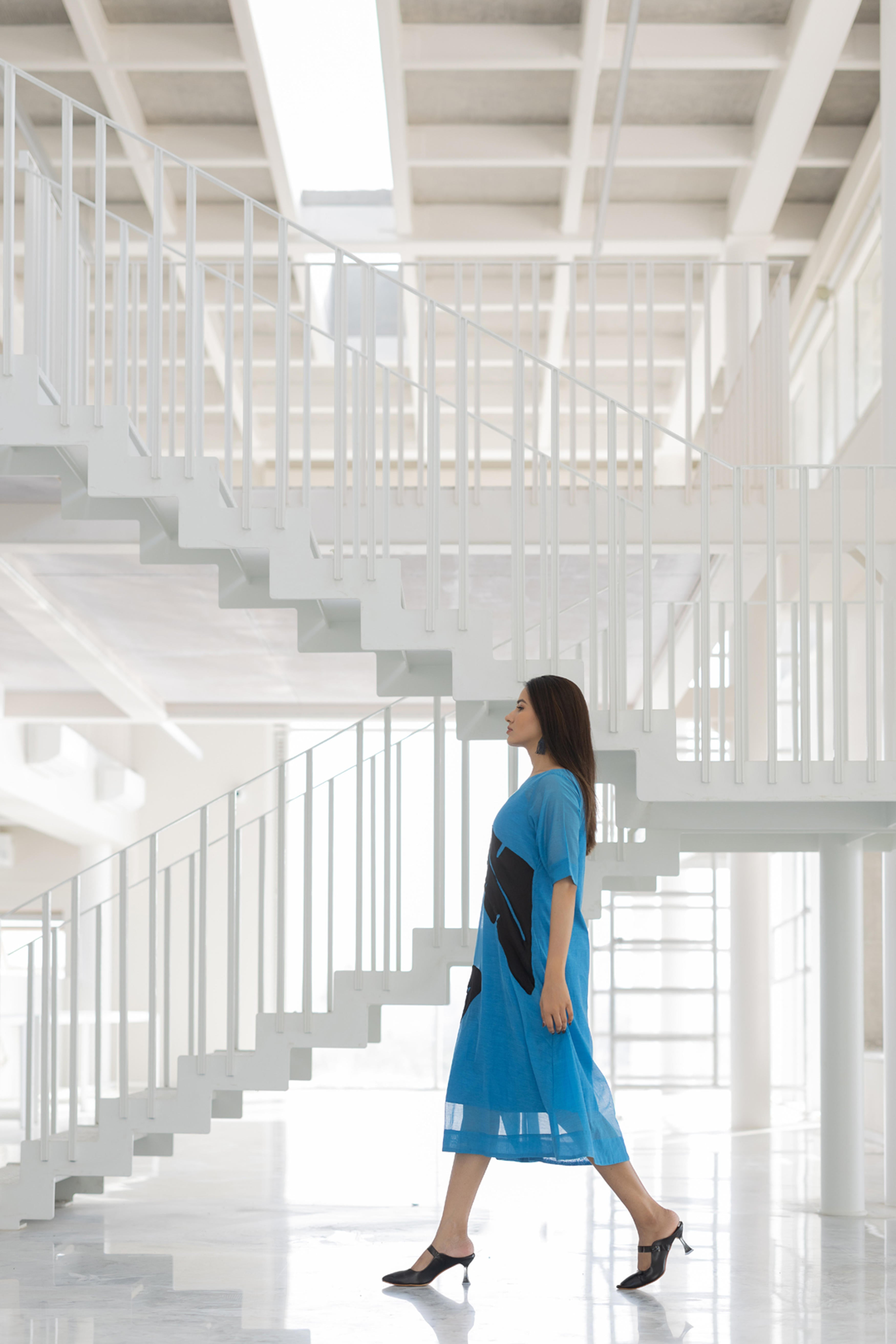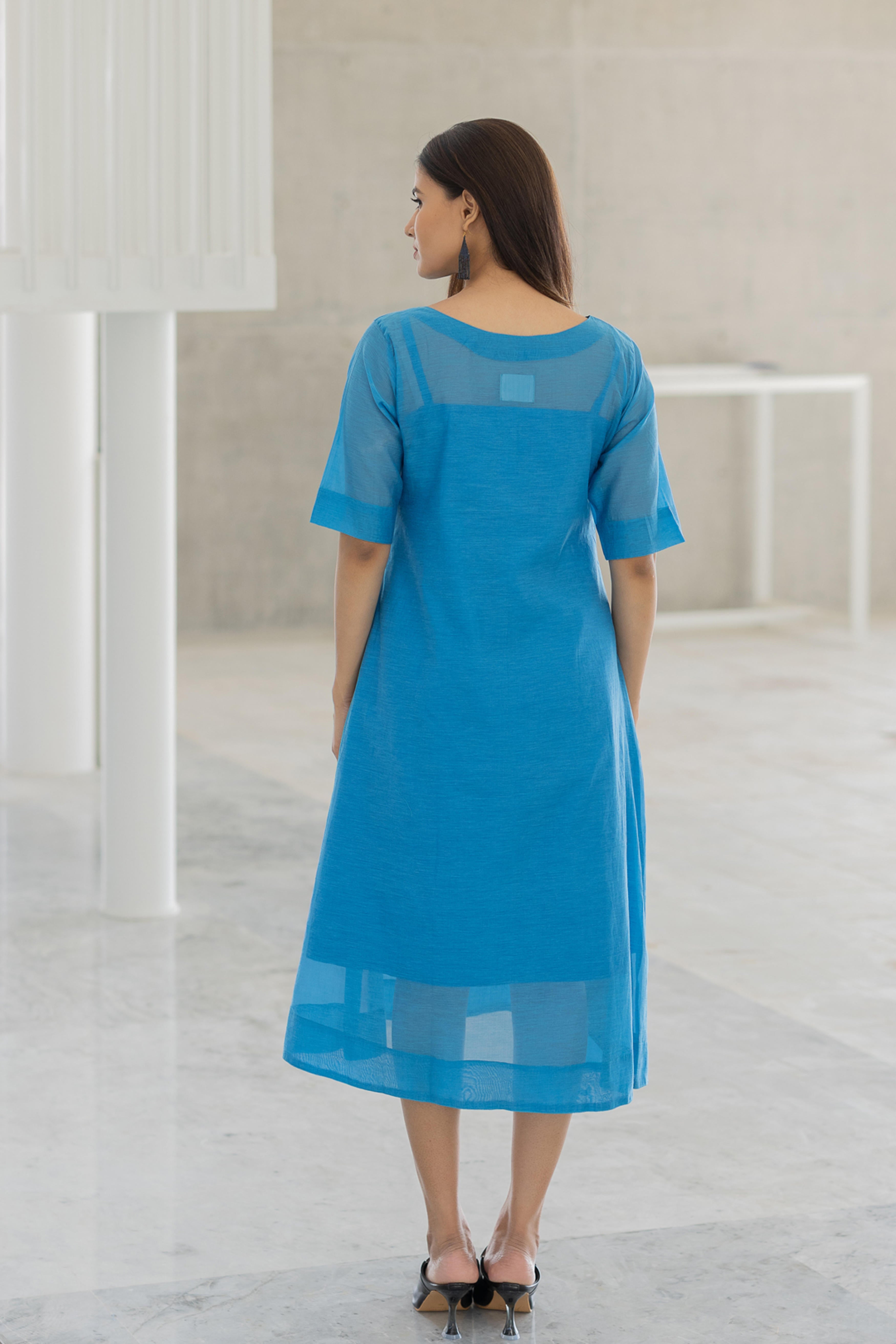 A perfect blend of elegance and comfort, the Azure Black Applique Dress is designed to make a statement. Crafted from lightweight chanderi fabric in a striking blue hue, this dress features bold black banana leaf appliques that add an artistic touch. The relaxed silhouette, boat neckline, and elbow-length sleeves ensure effortless sophistication, making it ideal for both casual outings and evening gatherings.