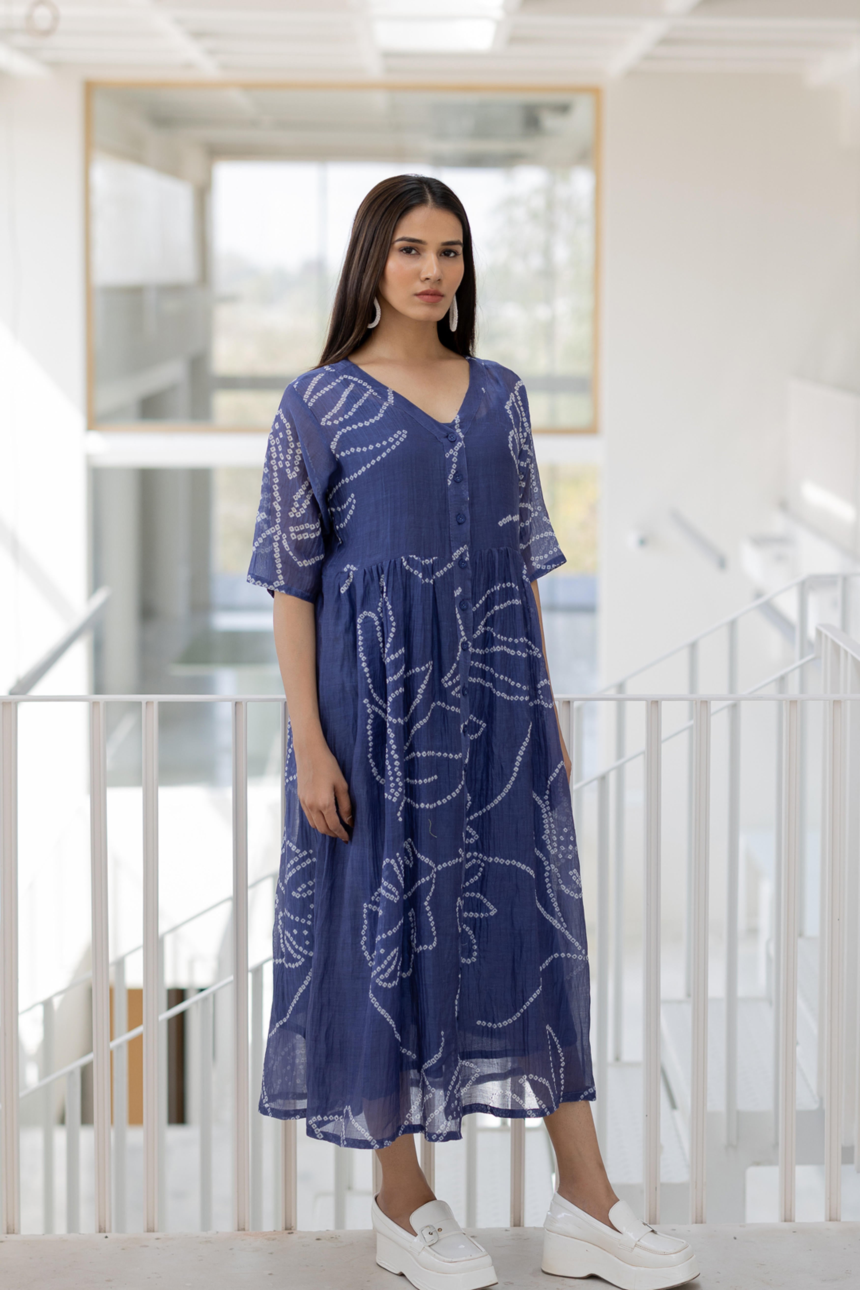 Elevate your wardrobe with the Blue Wildflower Bandhej Dress, a perfect fusion of artisanal charm and effortless elegance. Featuring a rich indigo hue adorned with delicate Bandhani floral patterns, this flowy dress is designed for those who appreciate both comfort and craftsmanship. The soft gathers add volume and movement, making it a versatile choice for day-to-night styling. A timeless piece that celebrates handcrafted beauty and modern simplicity.