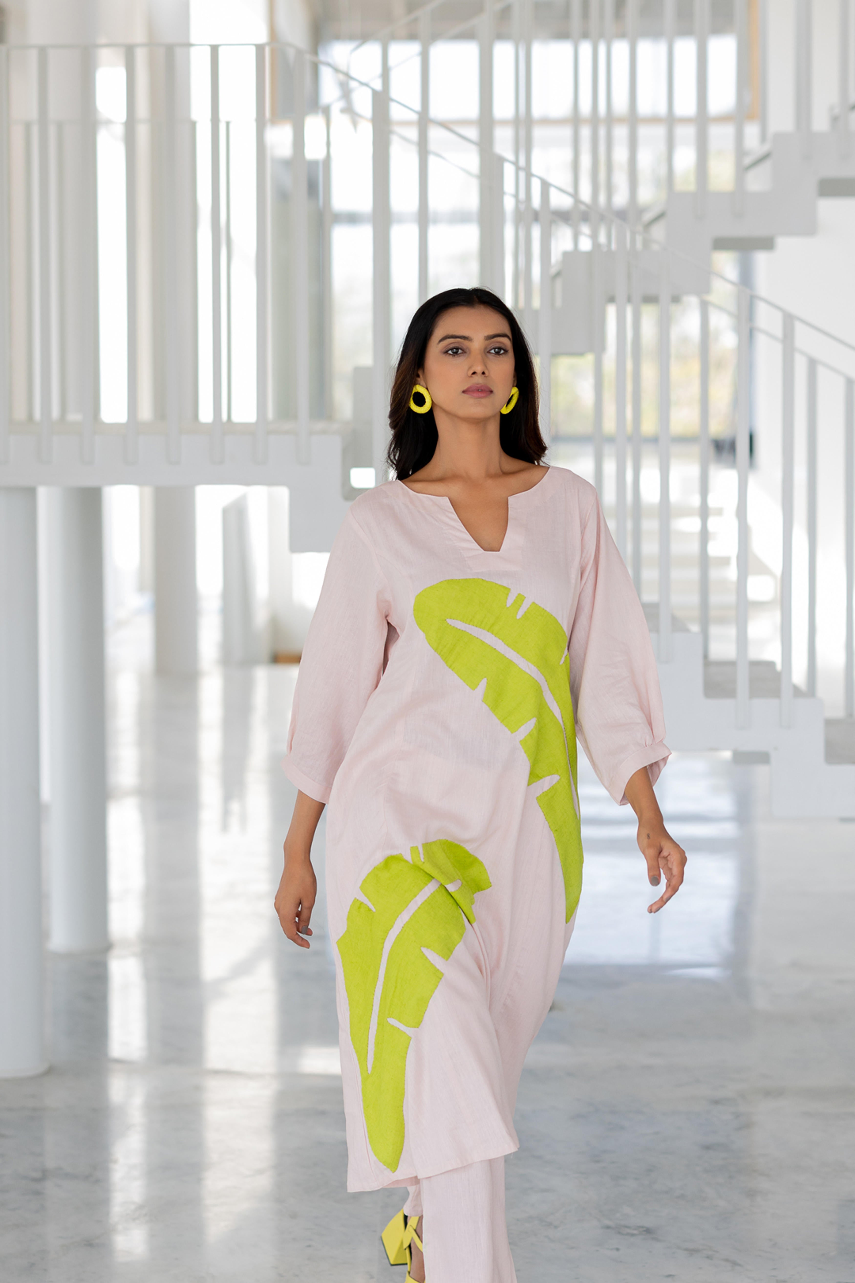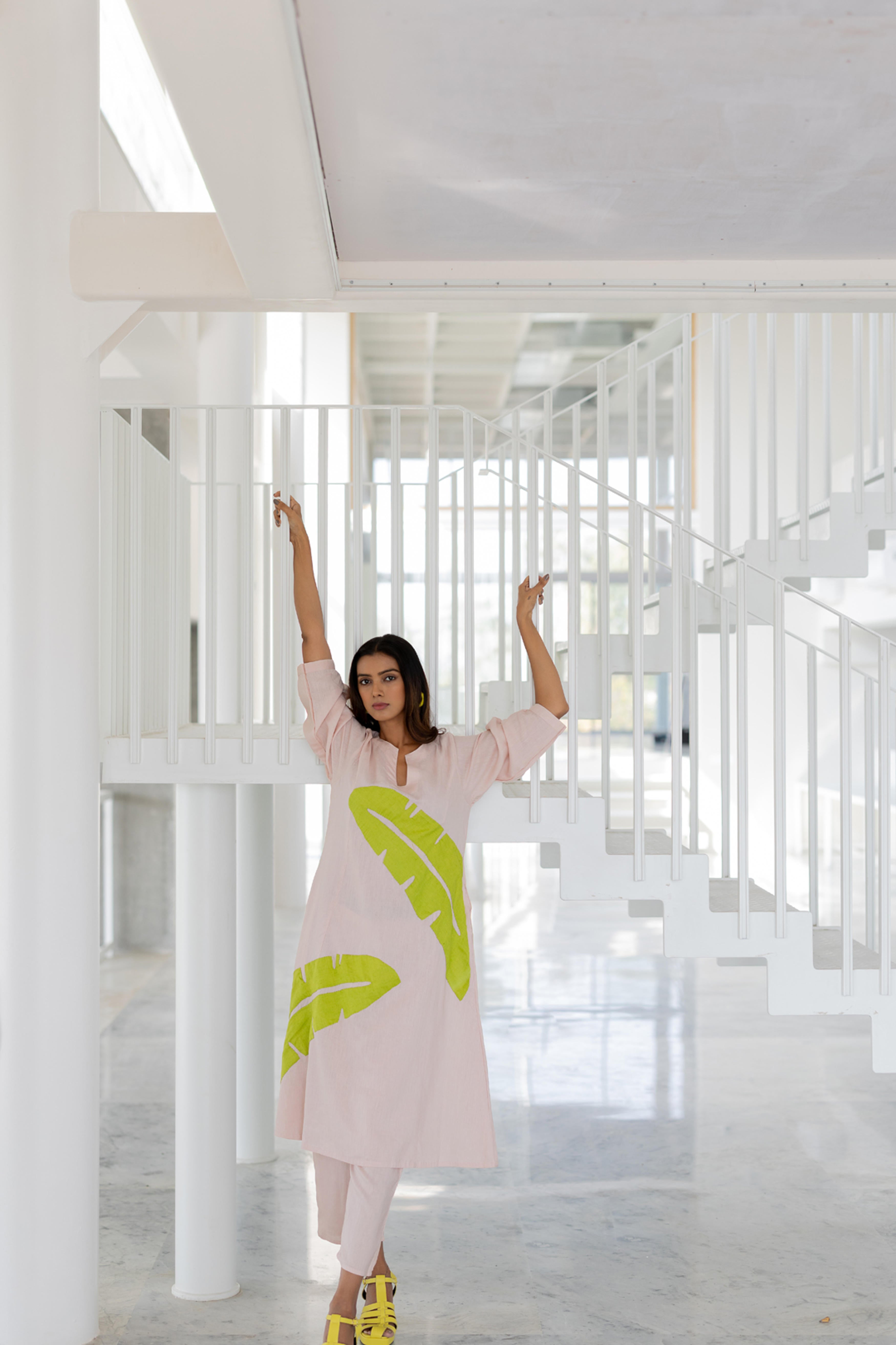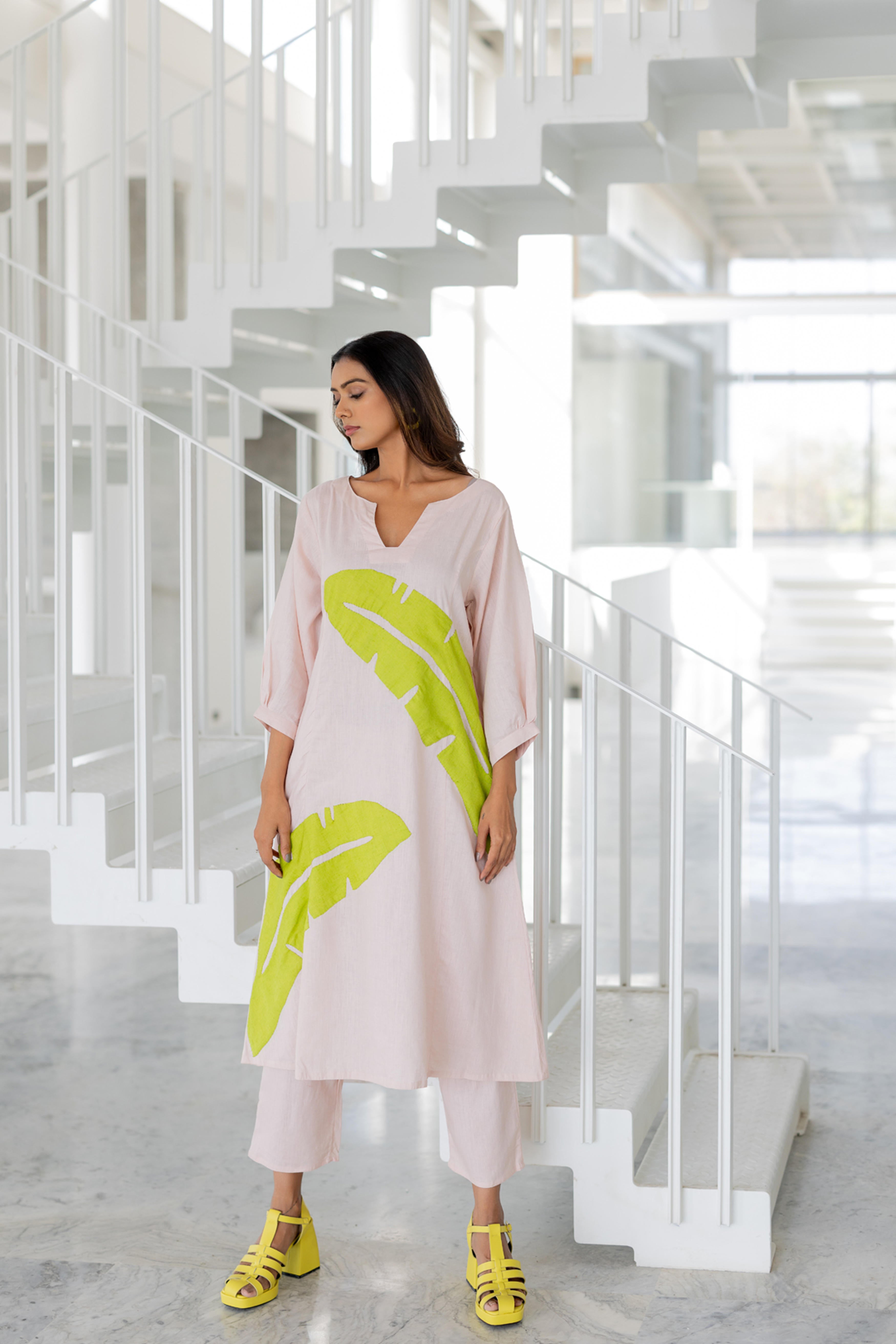 A refreshing blend of elegance and nature-inspired charm, the Blush Basil Applique Kurta Set brings effortless sophistication to your wardrobe. Crafted in a soft pastel pink, the relaxed-fit kurta features a banana leaf appliqué in a vibrant green hue, adding a delicate yet bold touch. Paired with straight-fit pants in a matching pastel pink, this set offers both comfort and style, perfect for casual outings, brunch, or everyday wear.