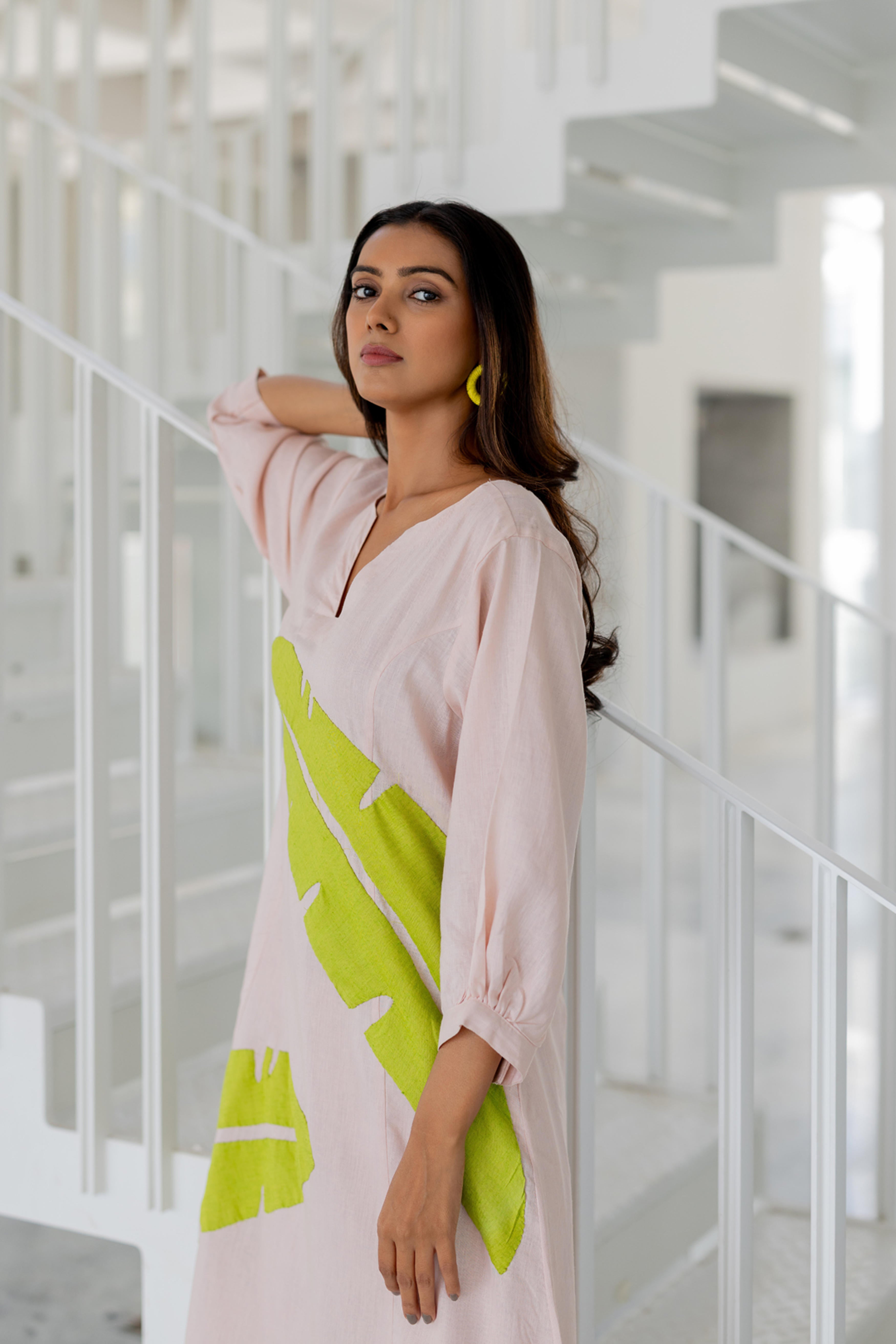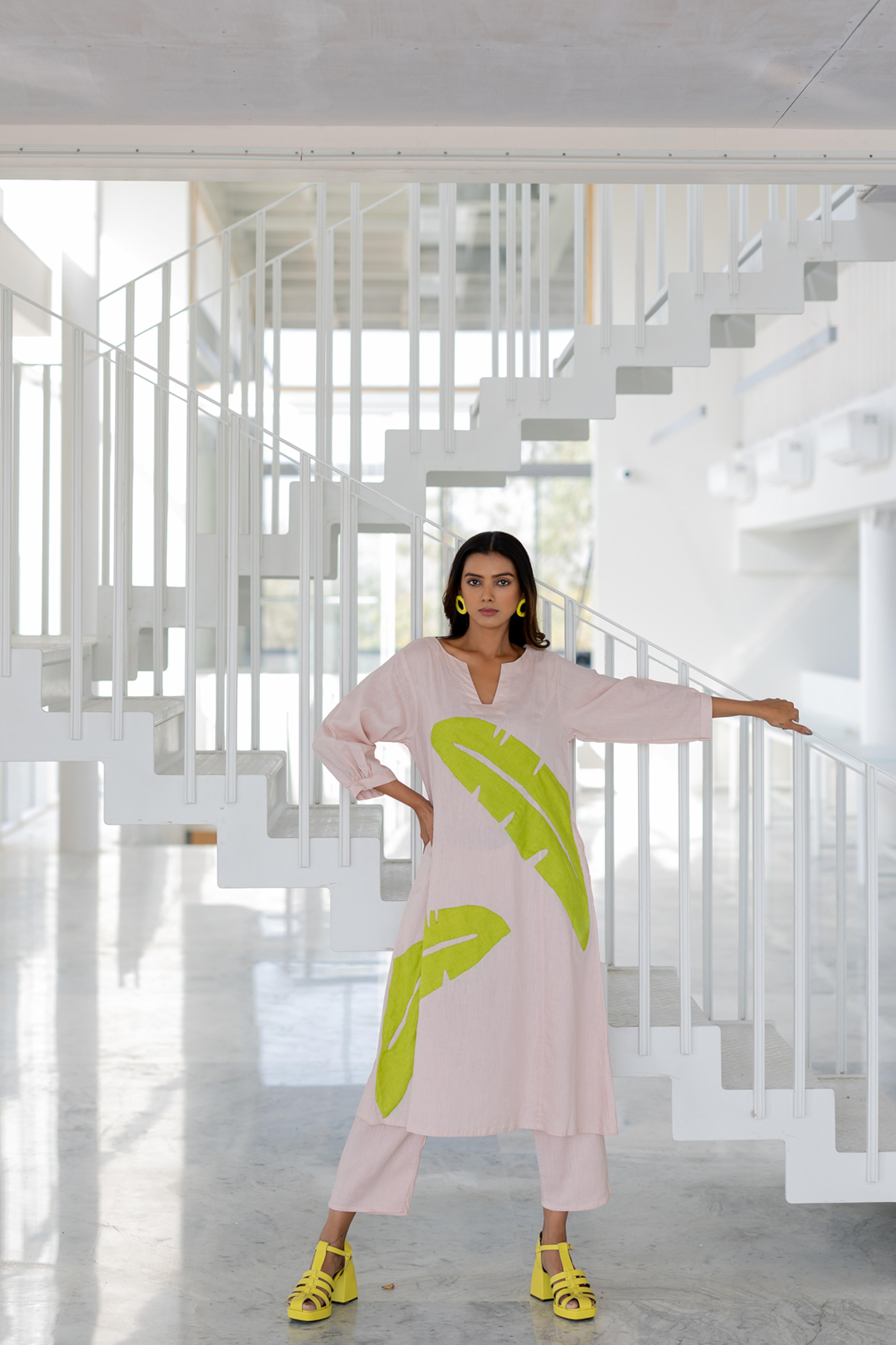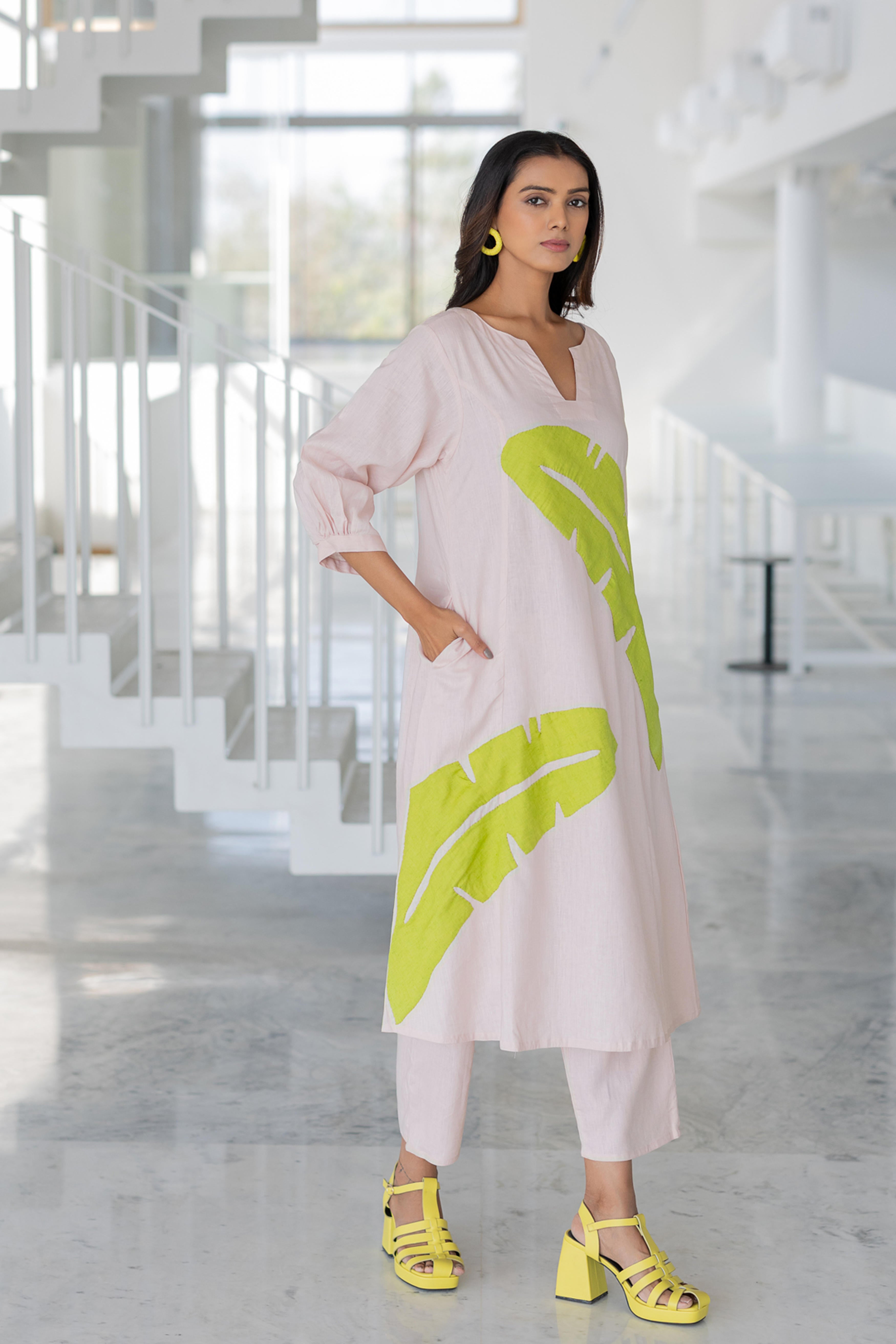 A refreshing blend of elegance and nature-inspired charm, the Blush Basil Applique Kurta Set brings effortless sophistication to your wardrobe. Crafted in a soft pastel pink, the relaxed-fit kurta features a banana leaf appliqué in a vibrant green hue, adding a delicate yet bold touch. Paired with straight-fit pants in a matching pastel pink, this set offers both comfort and style, perfect for casual outings, brunch, or everyday wear.