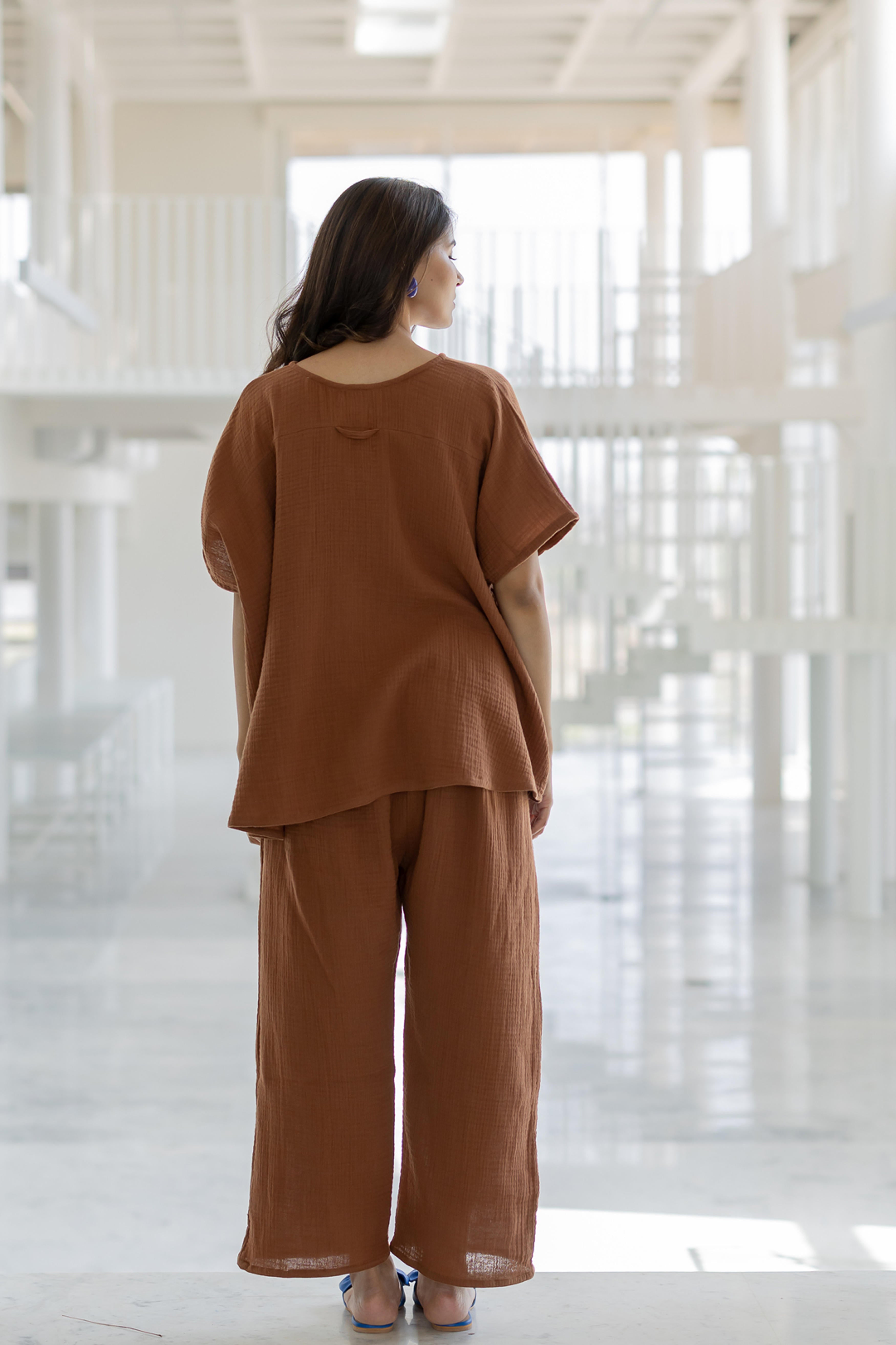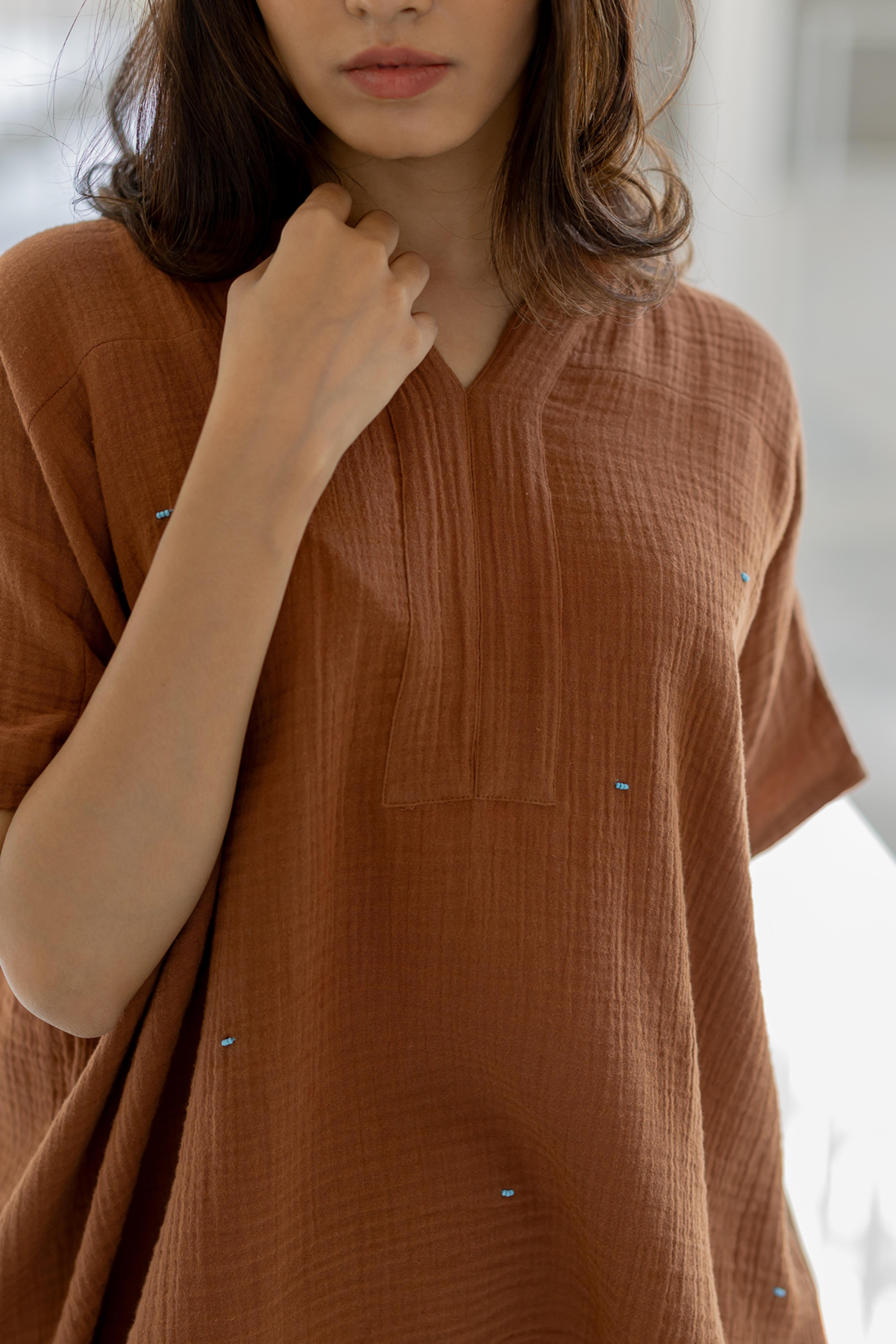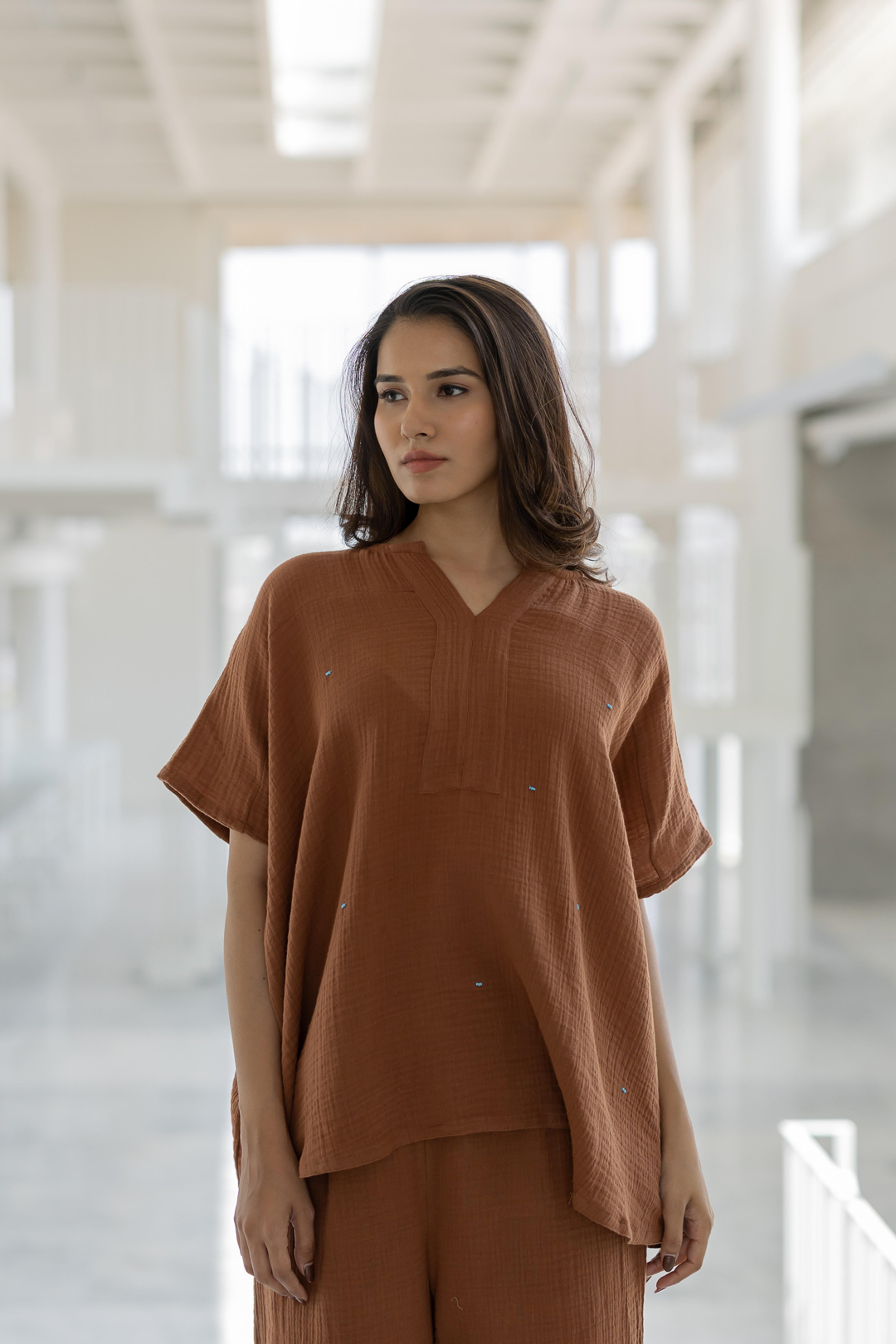 Ground yourself in comfort and style with the Earthbound Anti-Fit Top. Designed for effortless sophistication, this rich brown piece features a lightweight, breathable textured cotton double-cloth fabric that flows beautifully with movement. The structured V-neckline is subtly adorned with delicate hand-embroidery accents, adding an artisanal touch. With its relaxed, anti-fit silhouette, this top strikes the perfect balance between casual chic and understated luxury.