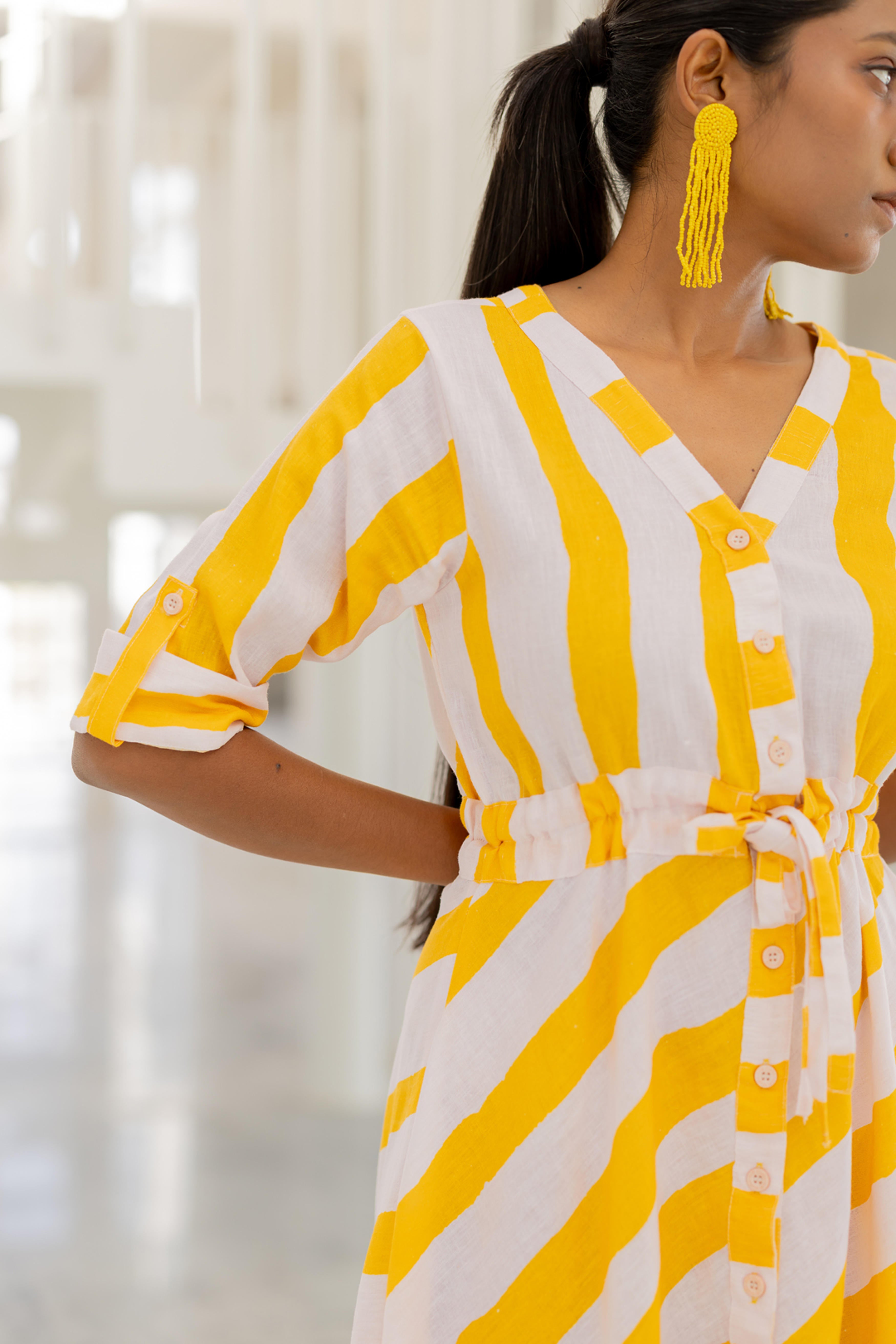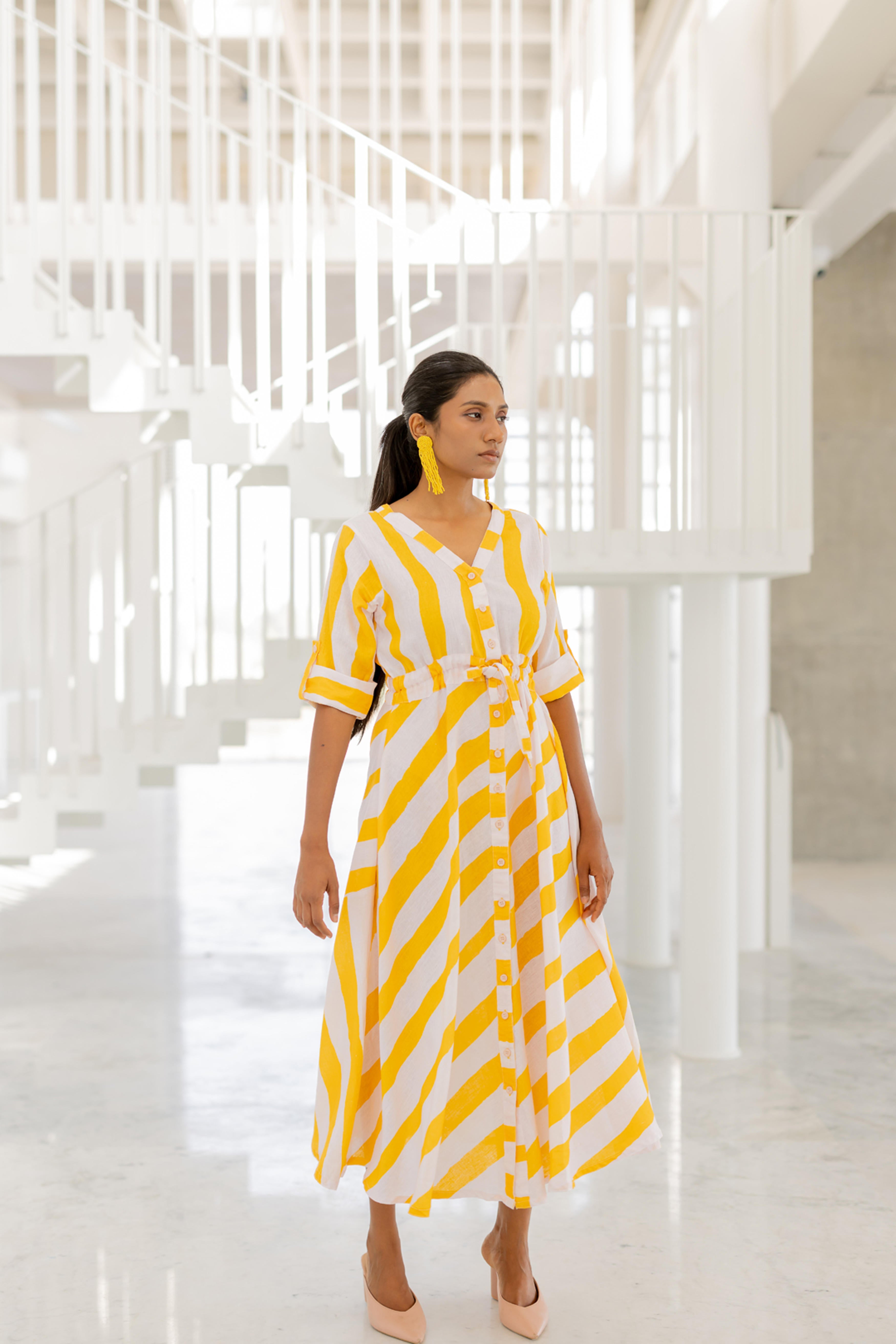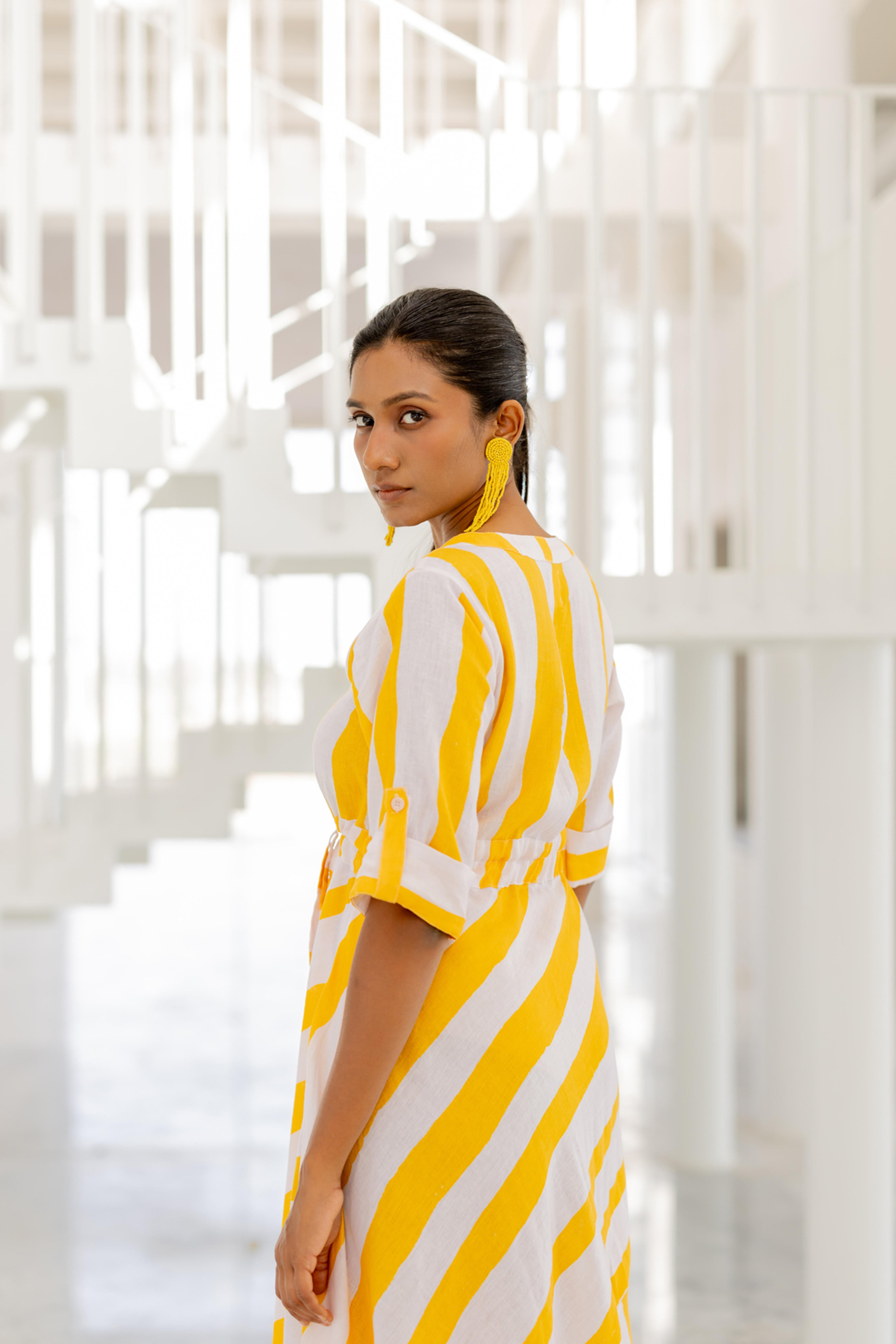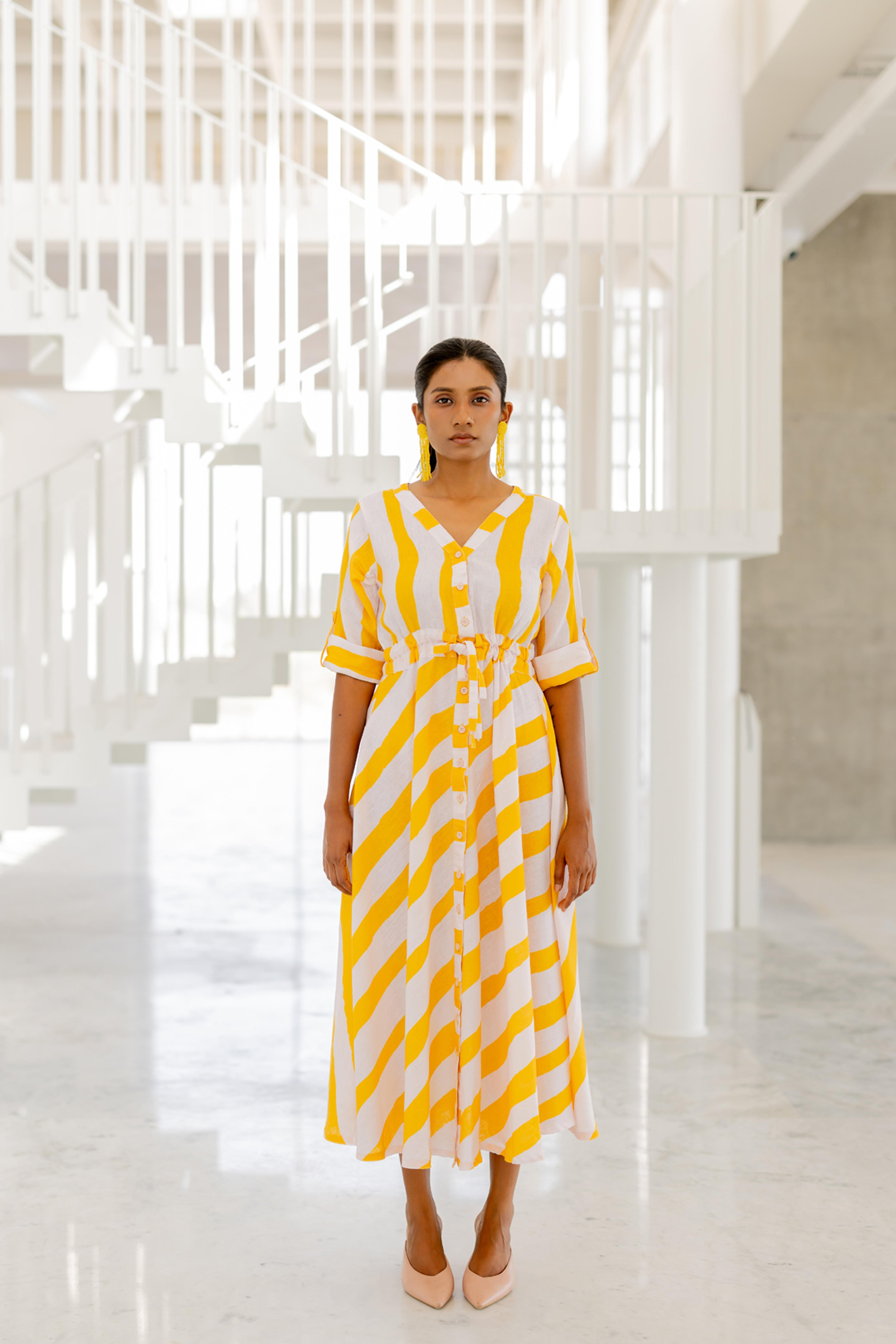 A radiant blend of comfort and elegance. This sunlit midi dress features a sophisticated diagonal stripe pattern in warm mustard yellow and soft beige. The cinched waist with drawcords detail enhances the silhouette, while the button-down front adds a classic touch. Perfect for brunches, vacations, or effortless daywear.