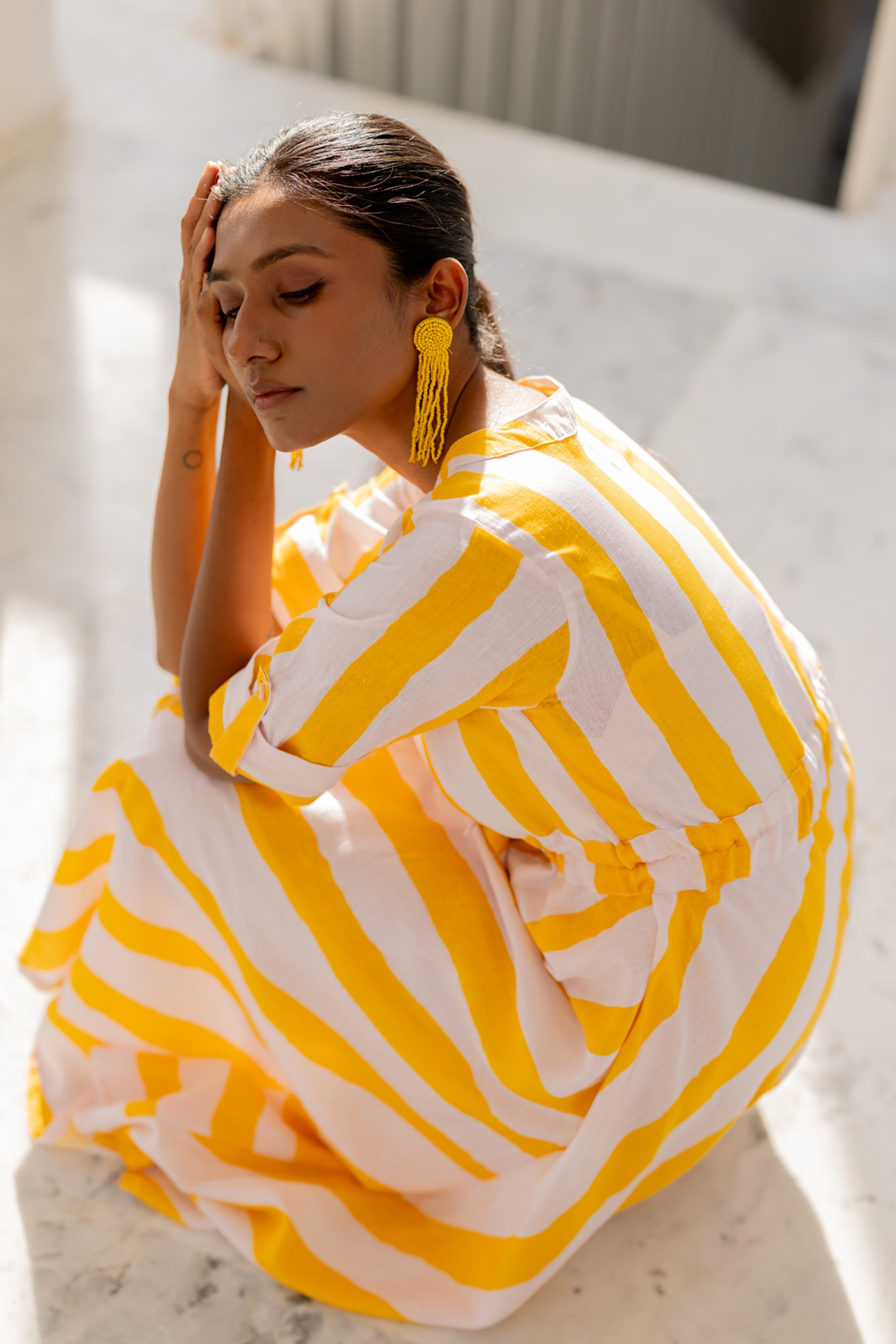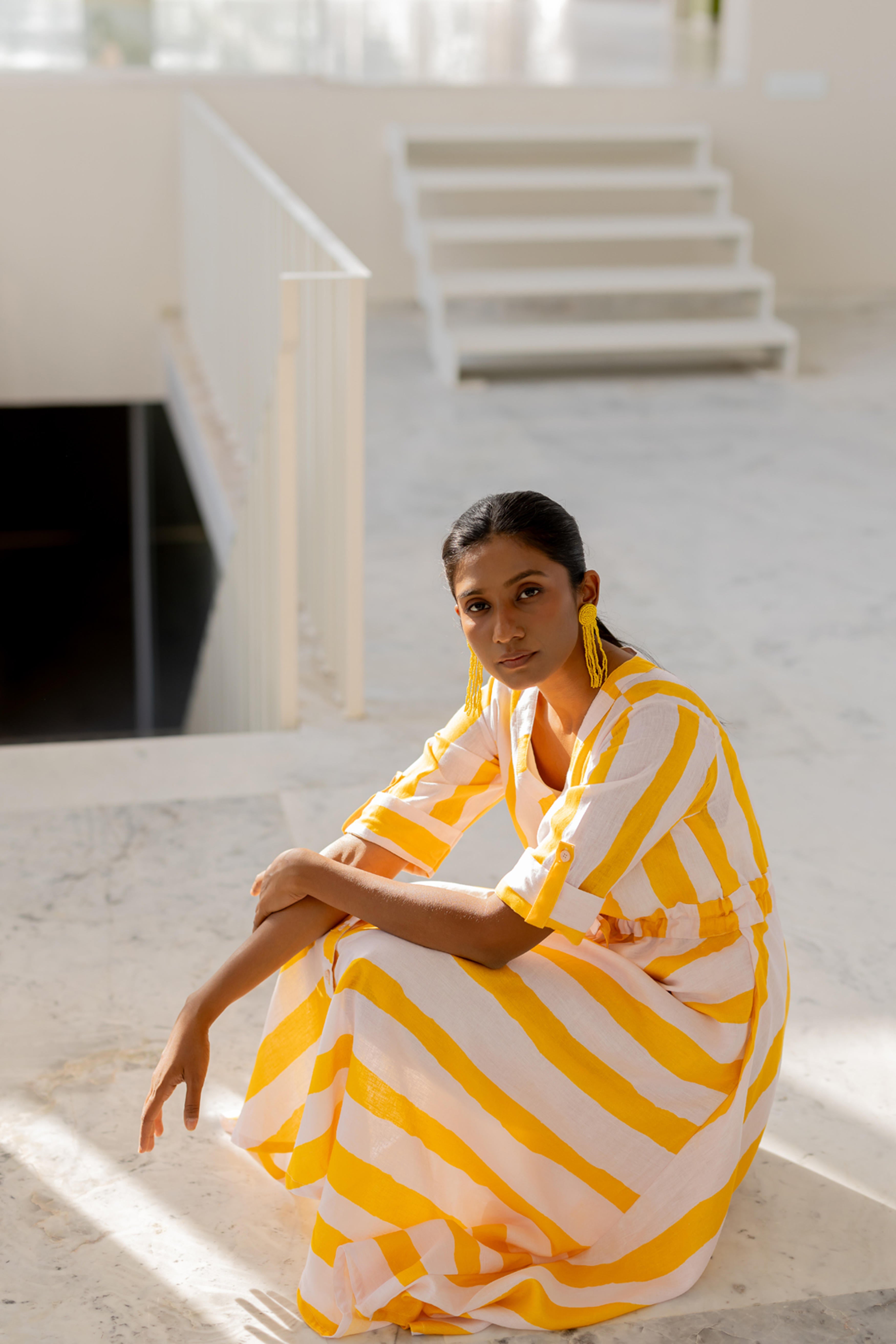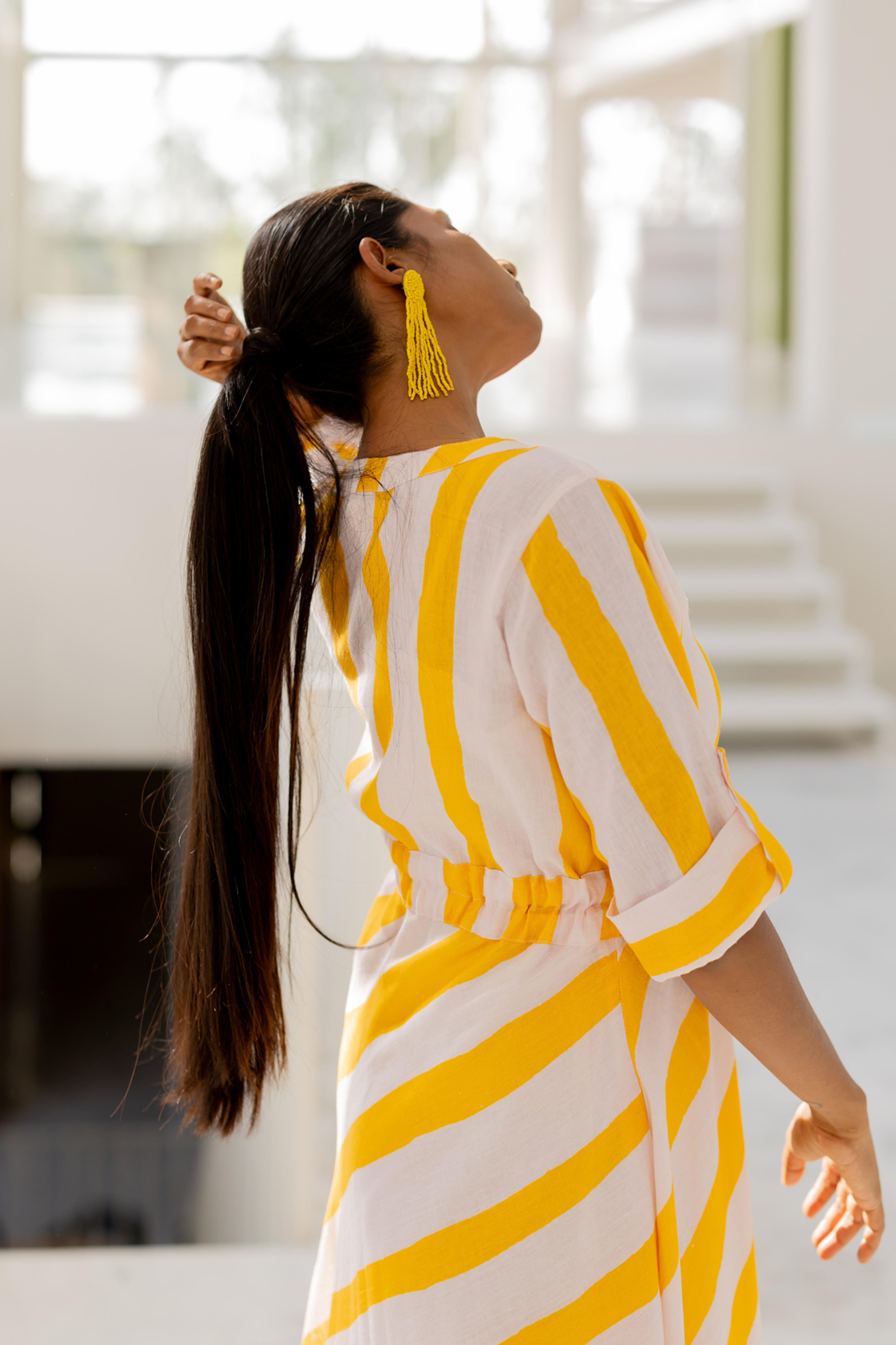 A radiant blend of comfort and elegance. This sunlit midi dress features a sophisticated diagonal stripe pattern in warm mustard yellow and soft beige. The cinched waist with drawcords detail enhances the silhouette, while the button-down front adds a classic touch. Perfect for brunches, vacations, or effortless daywear.