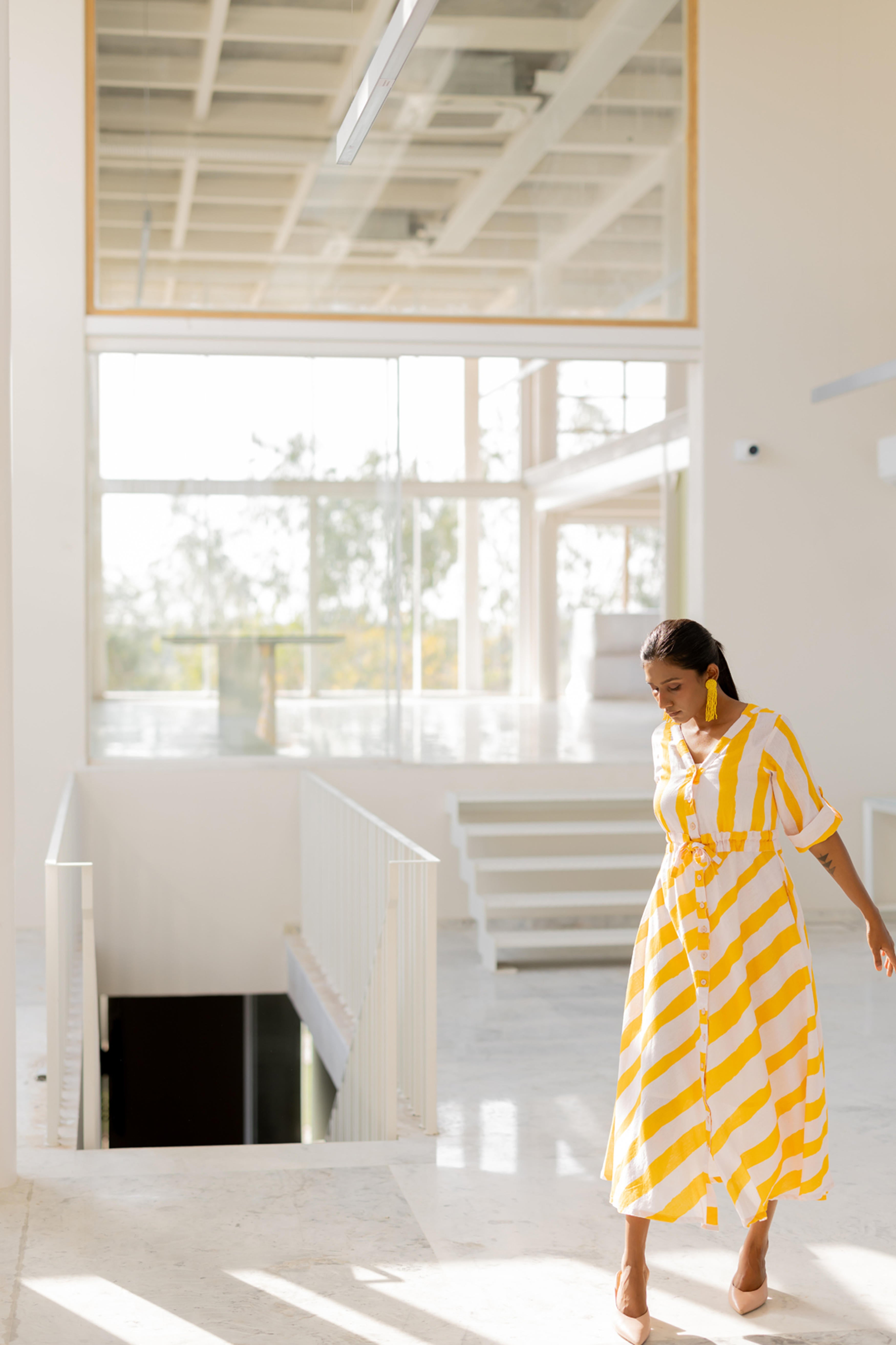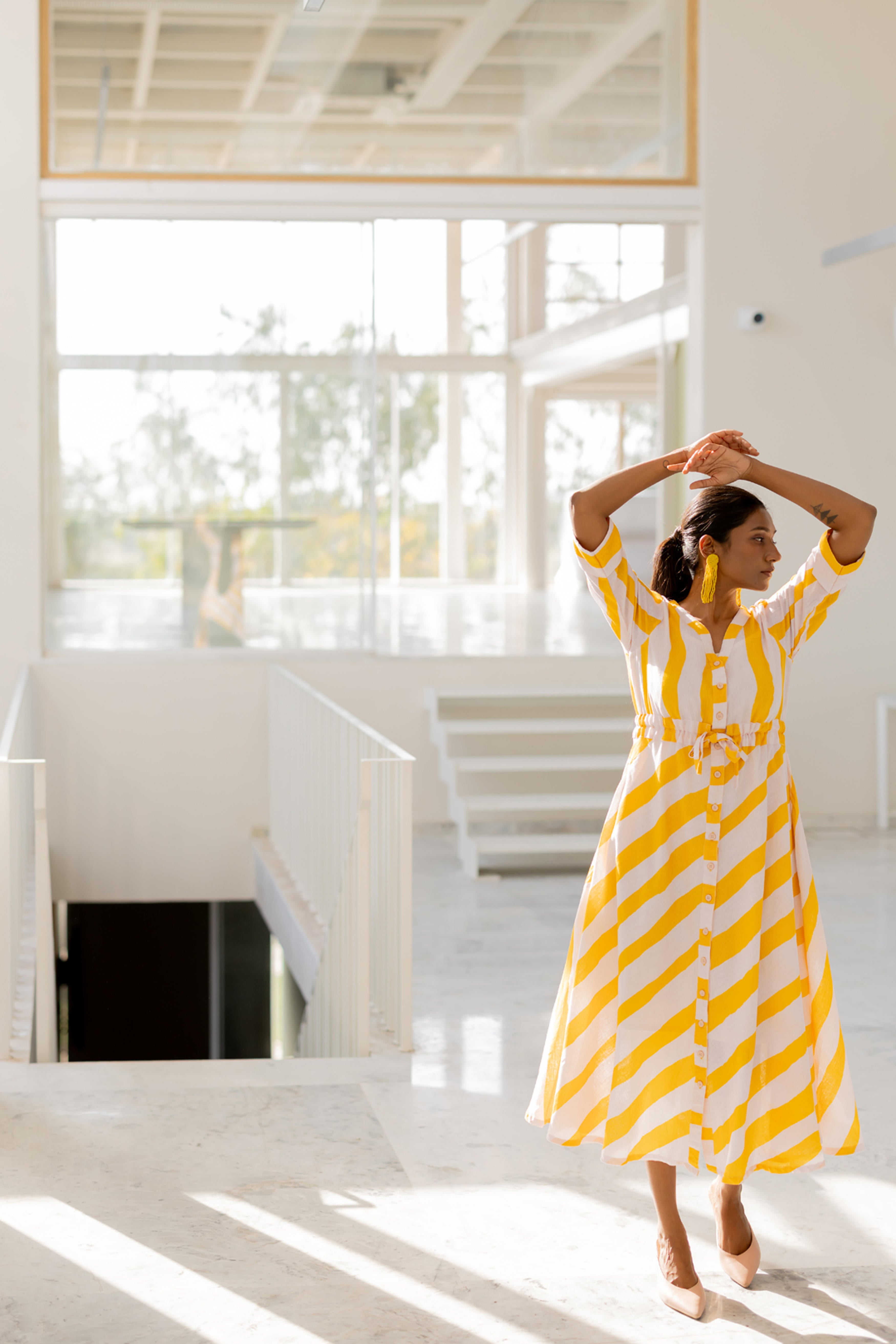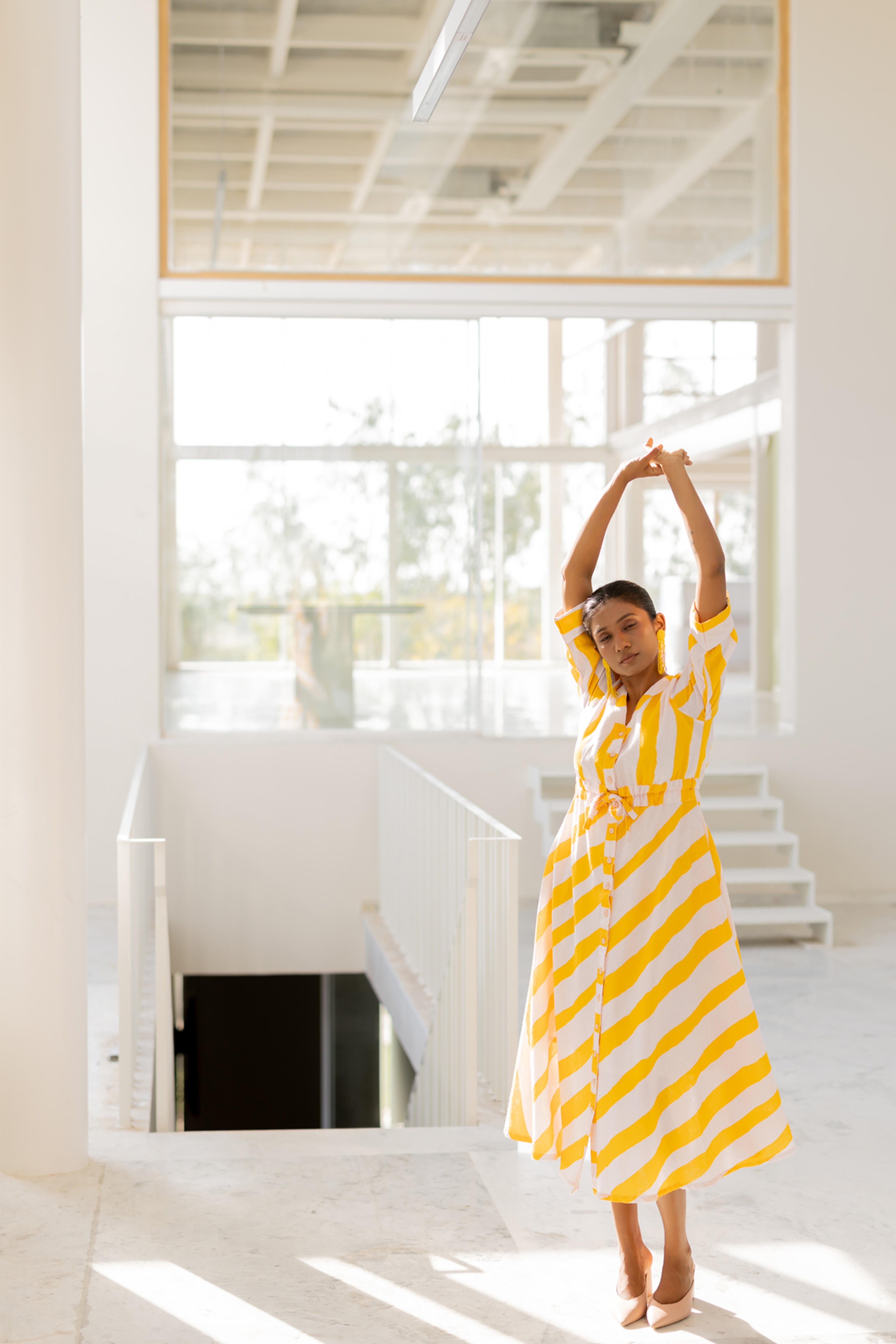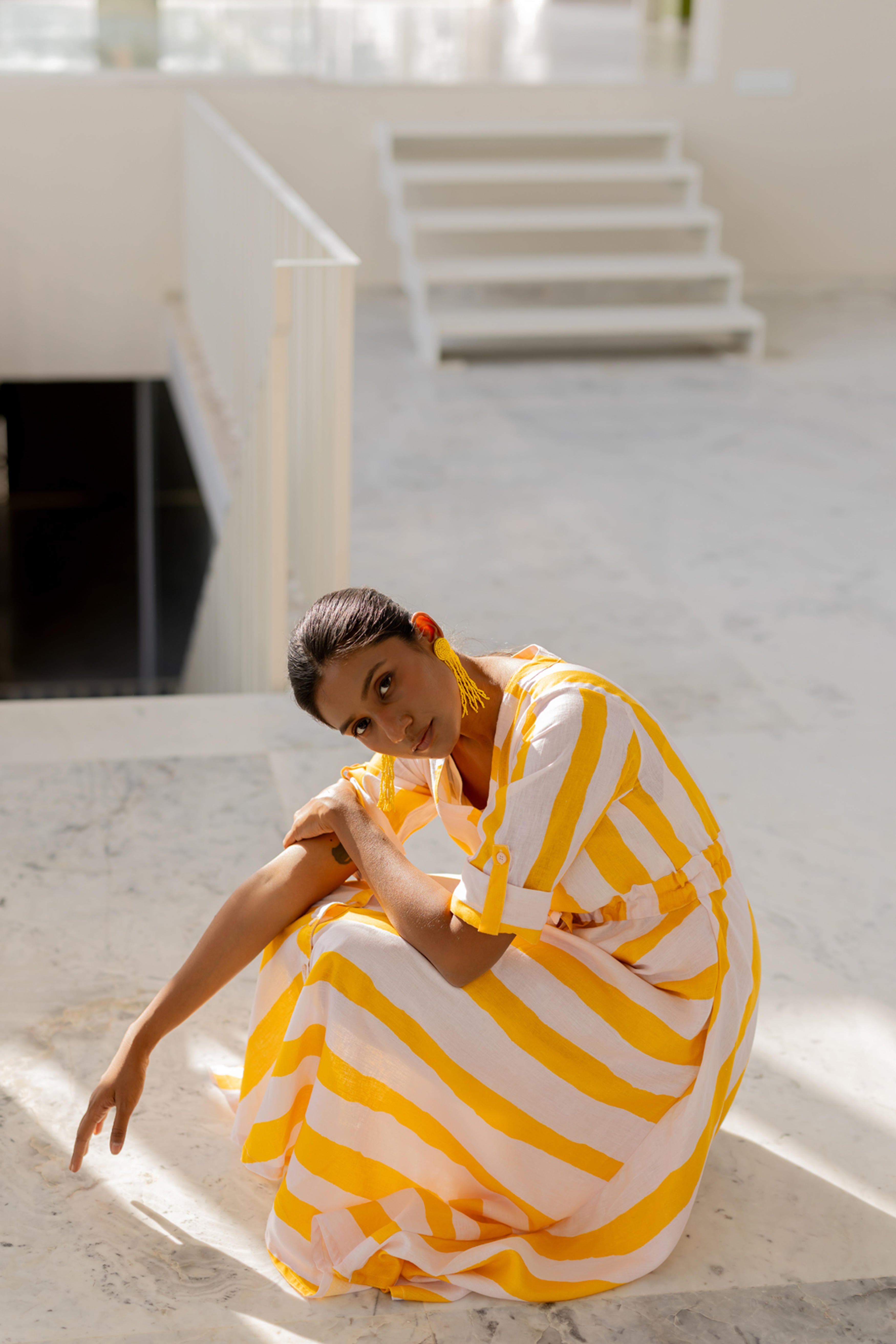 A radiant blend of comfort and elegance. This sunlit midi dress features a sophisticated diagonal stripe pattern in warm mustard yellow and soft beige. The cinched waist with drawcords detail enhances the silhouette, while the button-down front adds a classic touch. Perfect for brunches, vacations, or effortless daywear.