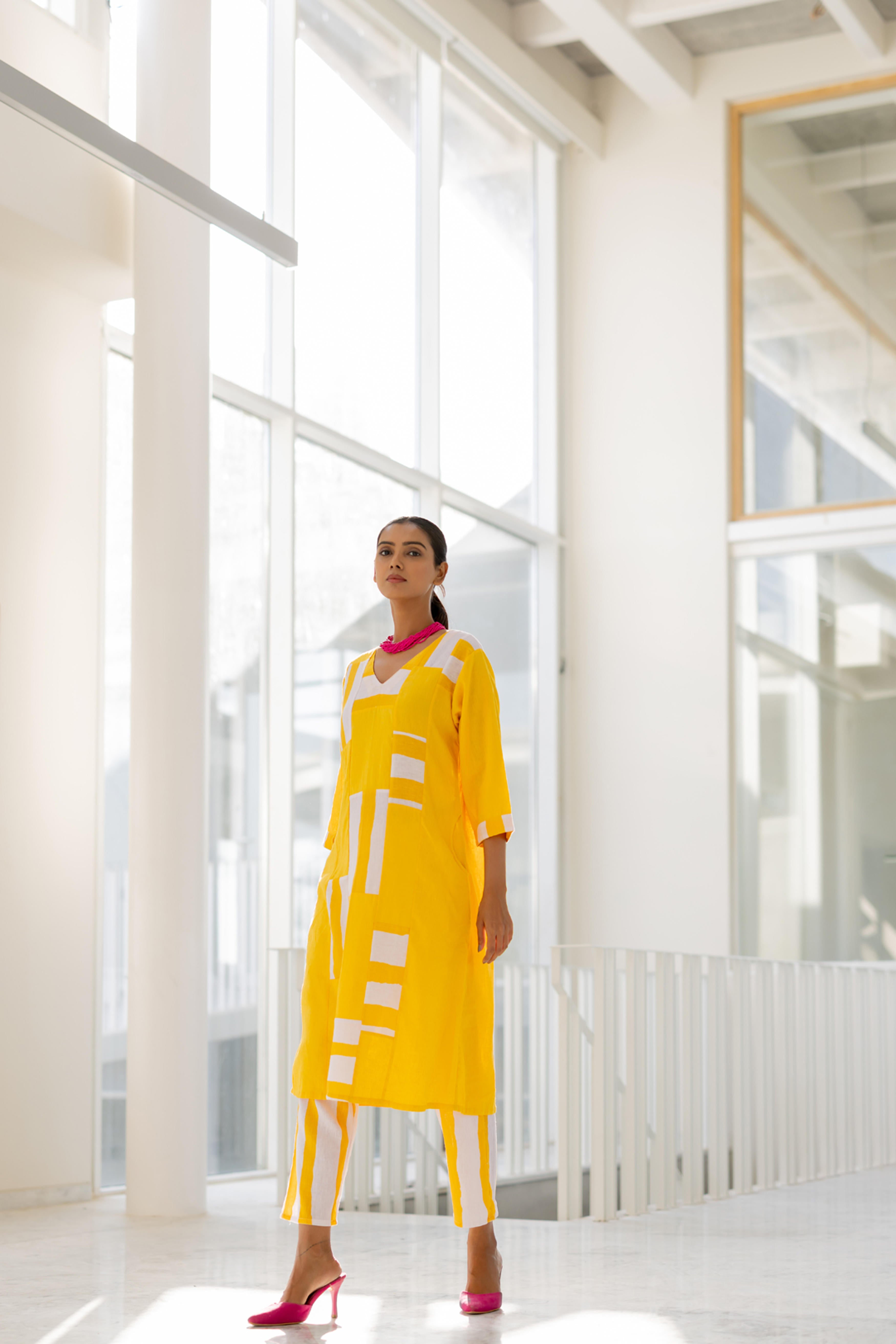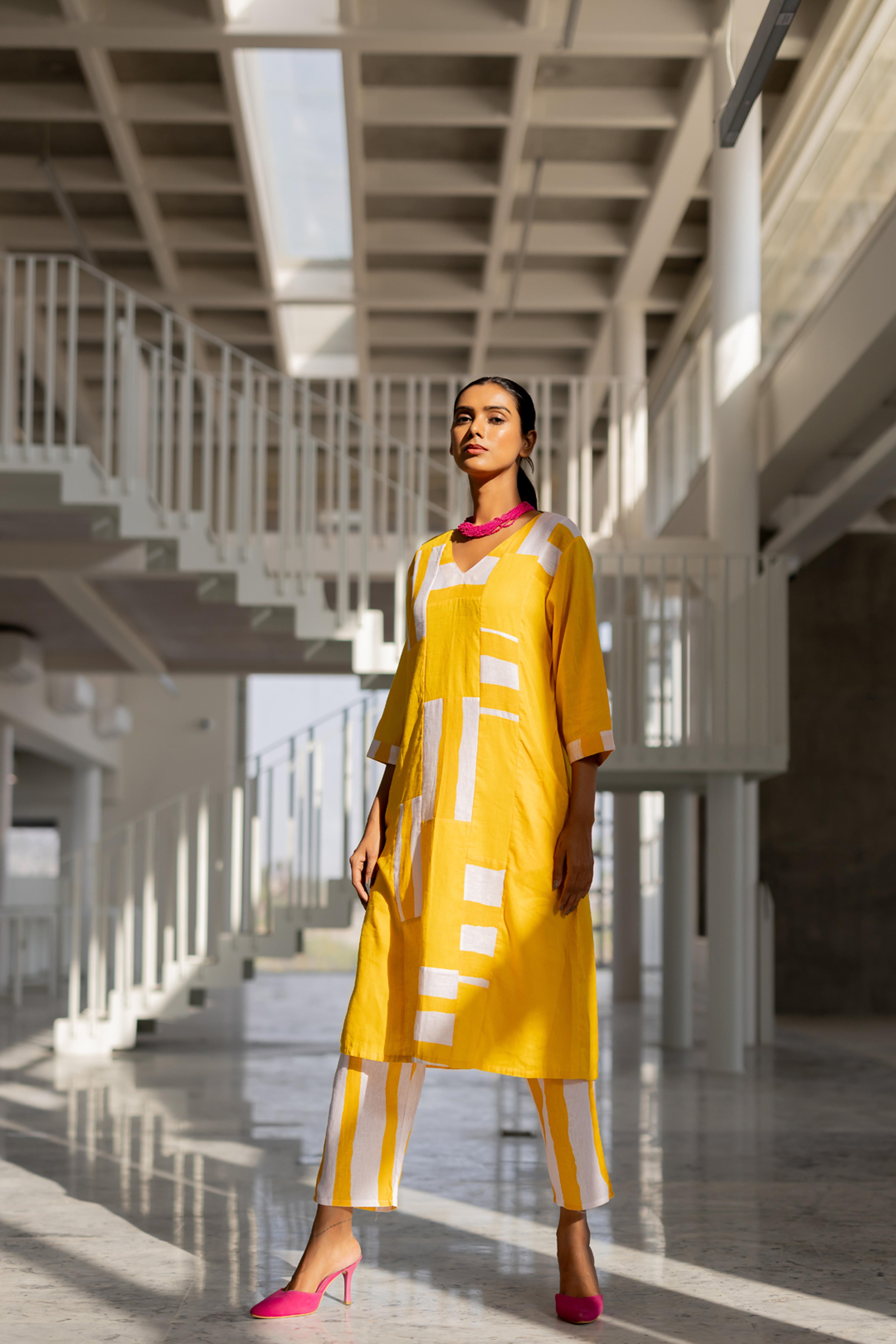 A contemporary take on traditional wear, this sunflower yellow kurta set is a statement piece for the modern woman. The bold, soft pink and yeloow stripes color blocked patches add an artistic touch, while the structured silhouette ensures comfort and elegance. Paired with coordinating straight-fit trousers featuring matching stripes, this ensemble is perfect for work or casual outings.