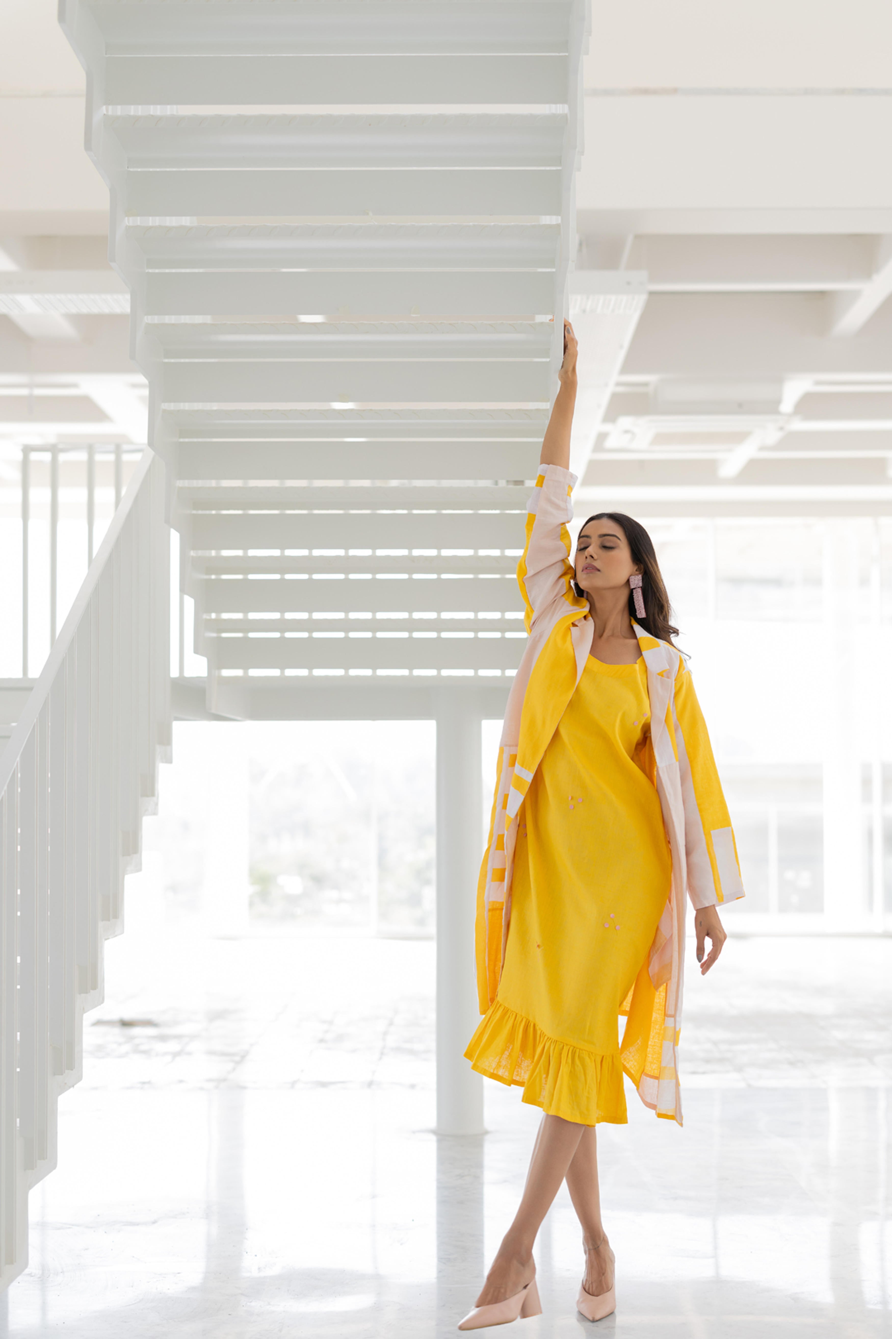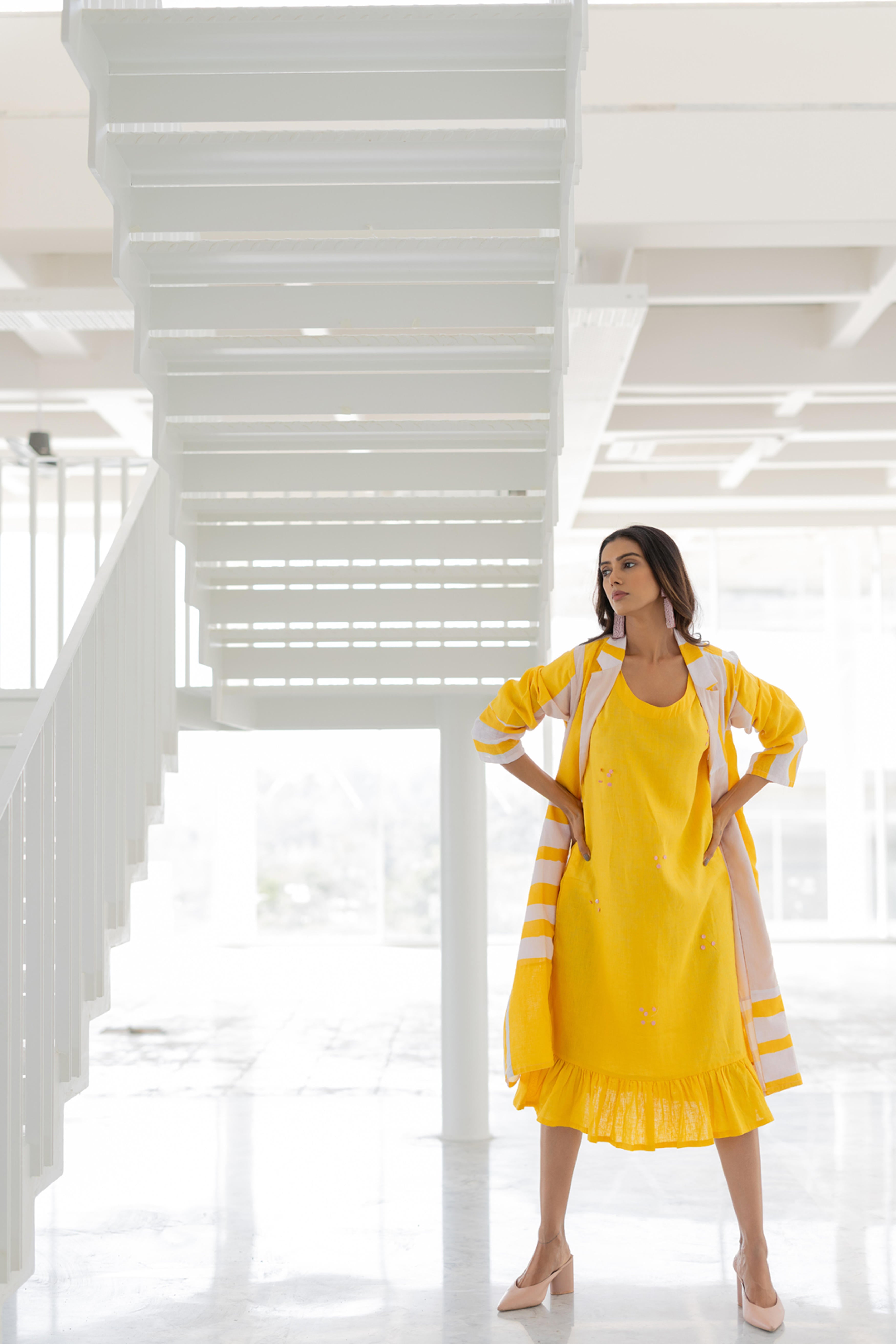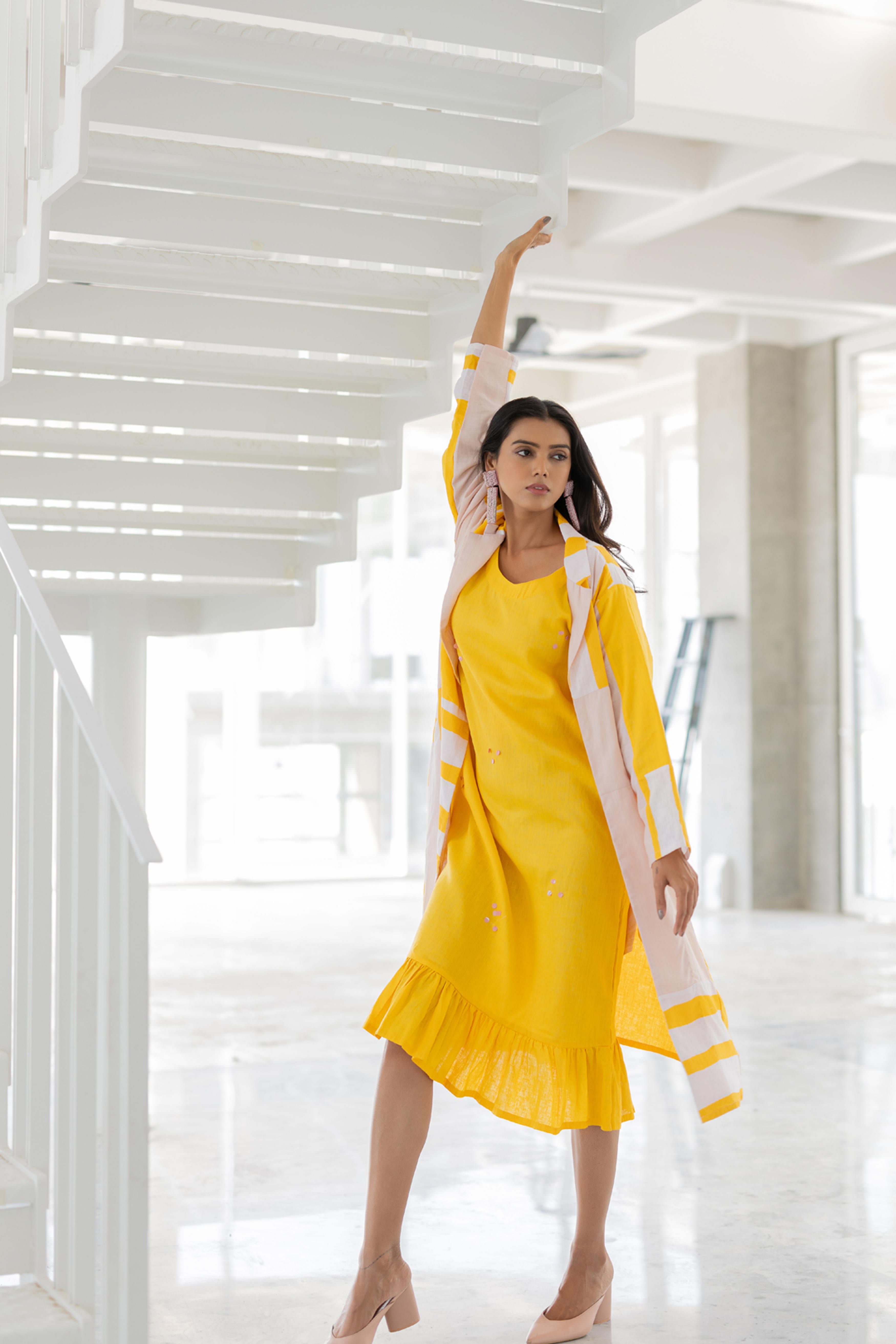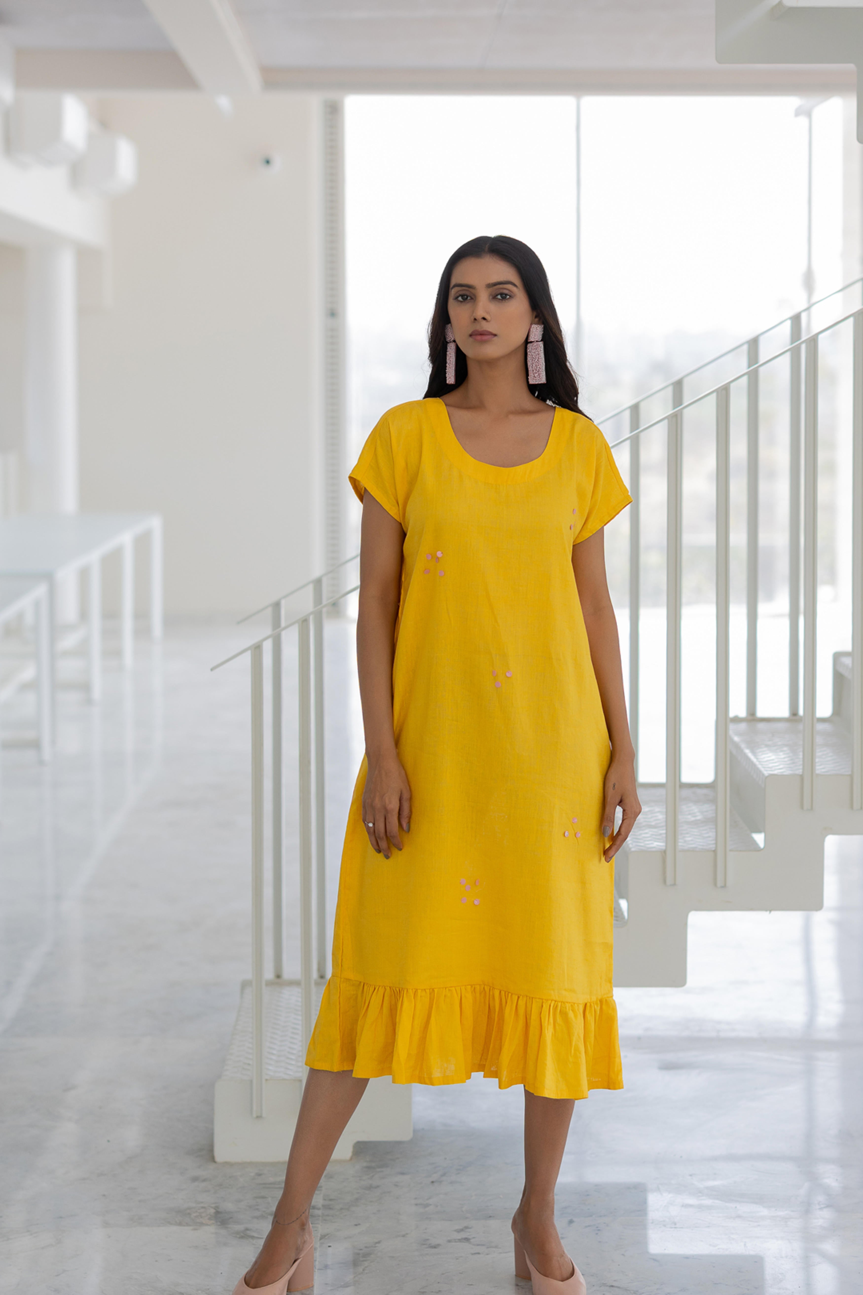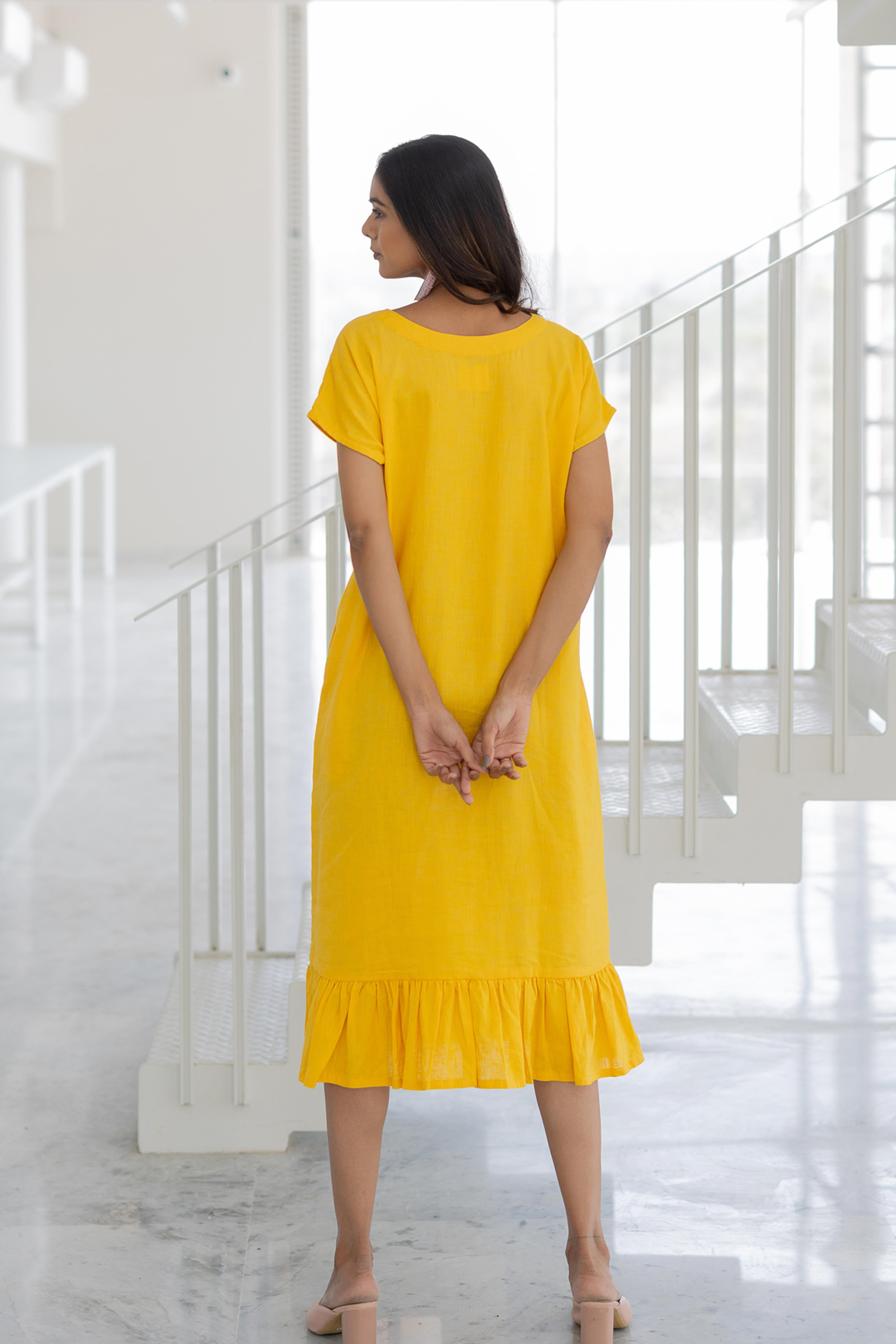 Radiate warmth and elegance in this sunflower yellow dress, crafted from a lightweight linen-viscose blend for breathable, all-day comfort. Soft pink hand embroidery adds a delicate touch, while the ruffle hemline creates a breezy, flowy finish. Designed with a wide scoop neckline and dropped shoulders, this is perfect for casual brunches and summer outings.
