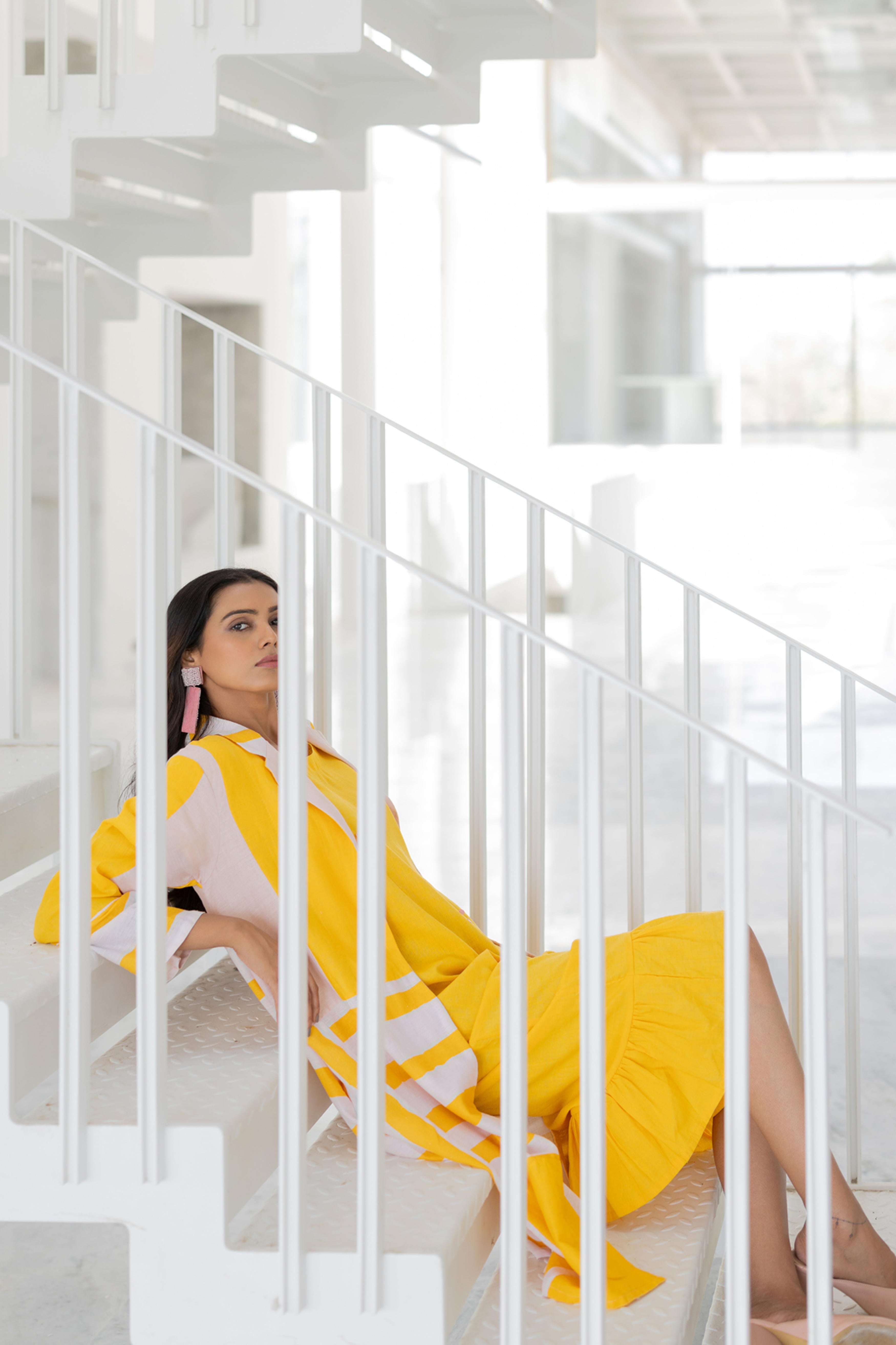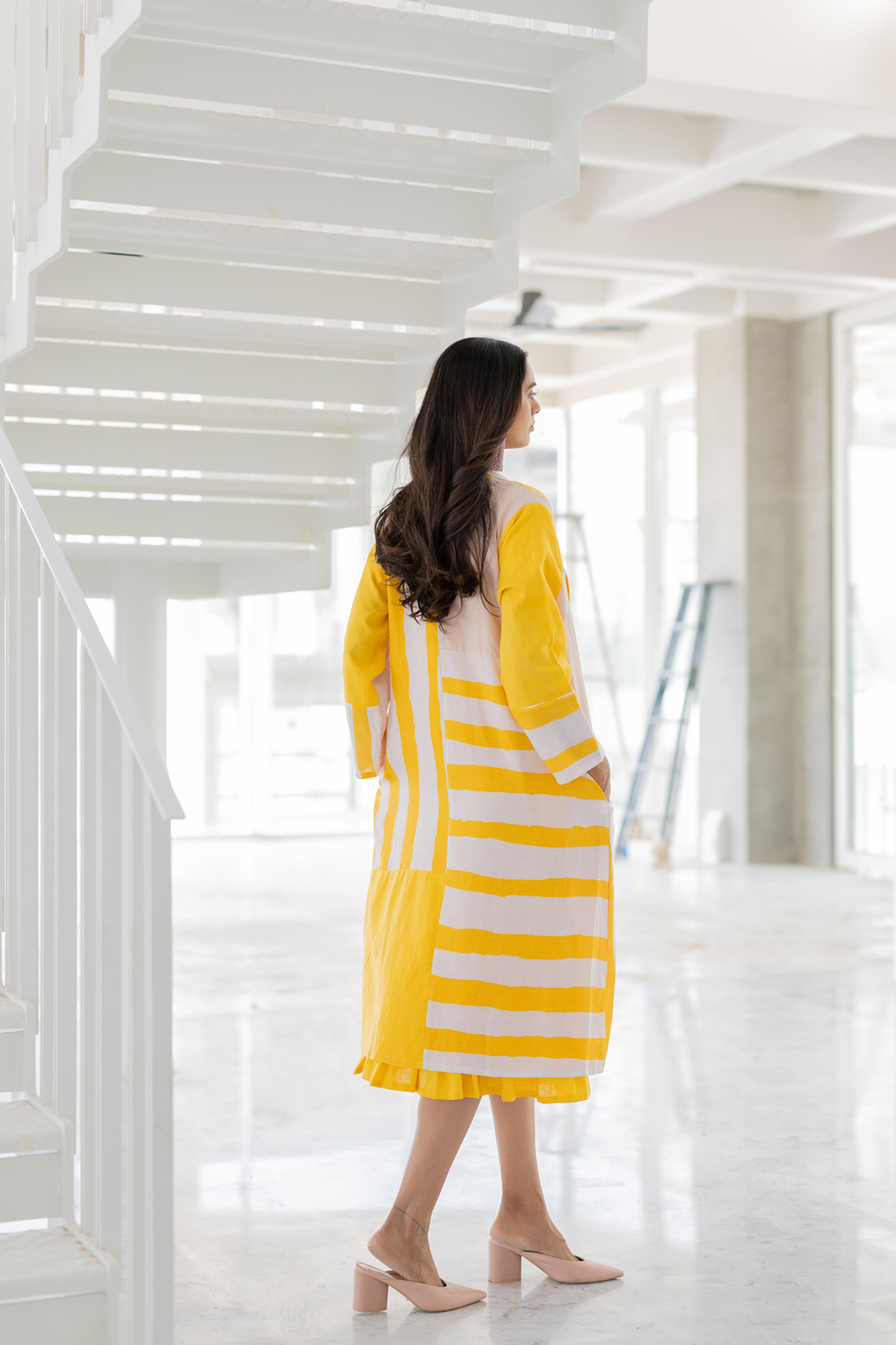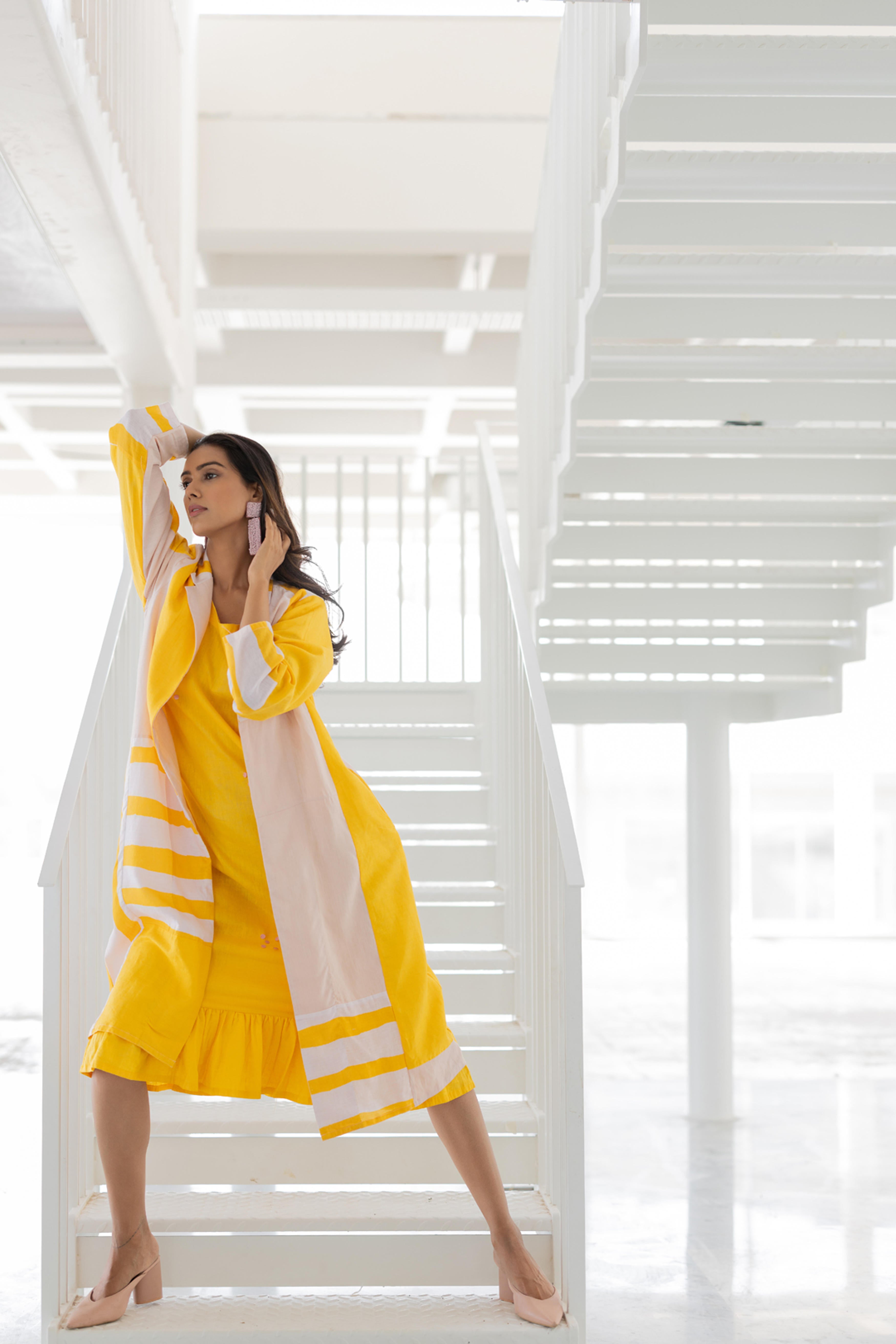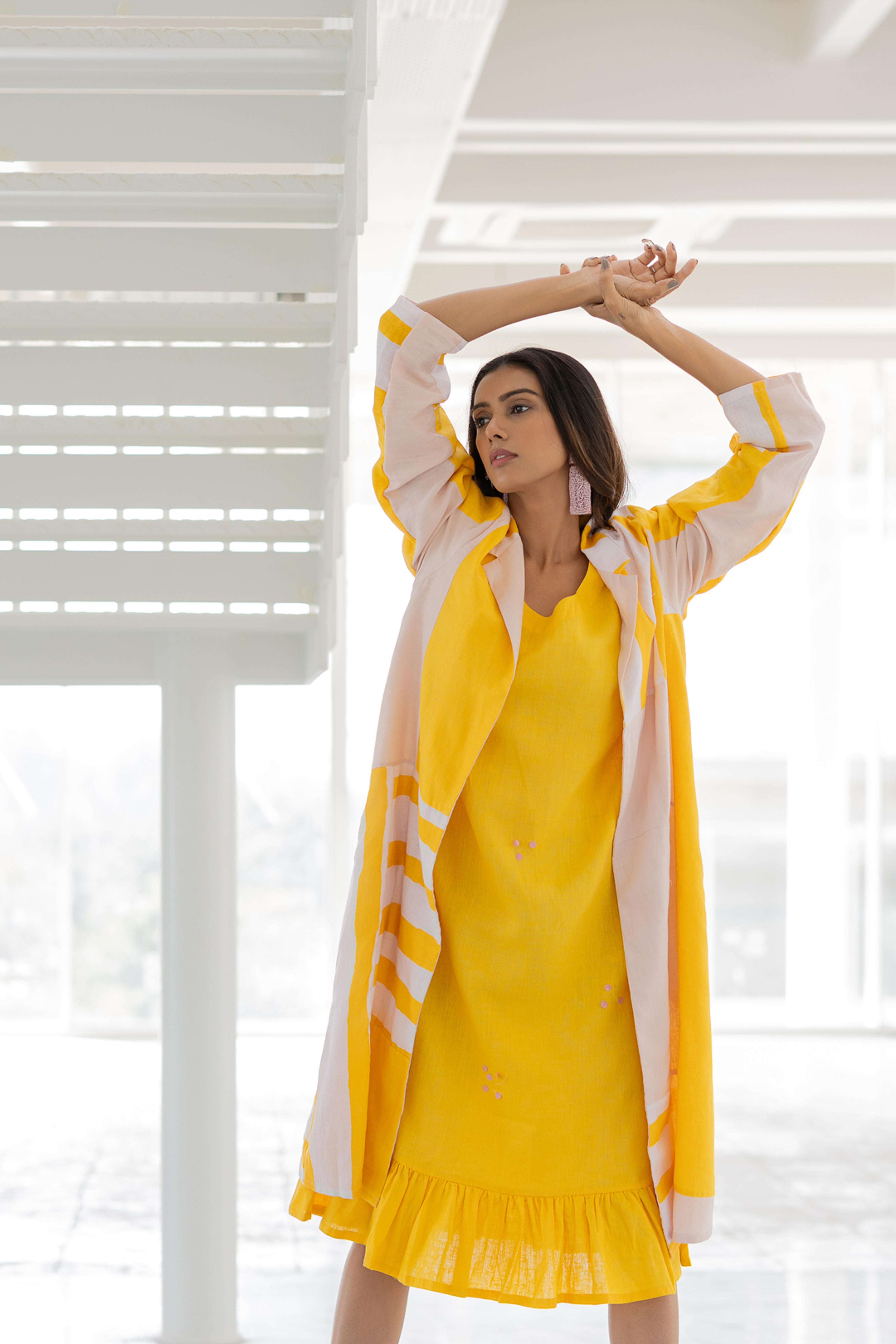 Radiate warmth and elegance in this sunflower yellow dress, crafted from a lightweight linen-viscose blend for breathable, all-day comfort. Soft pink hand embroidery adds a delicate touch, while the ruffle hemline creates a breezy, flowy finish. Designed with a wide scoop neckline and dropped shoulders, this is perfect for casual brunches and summer outings.
