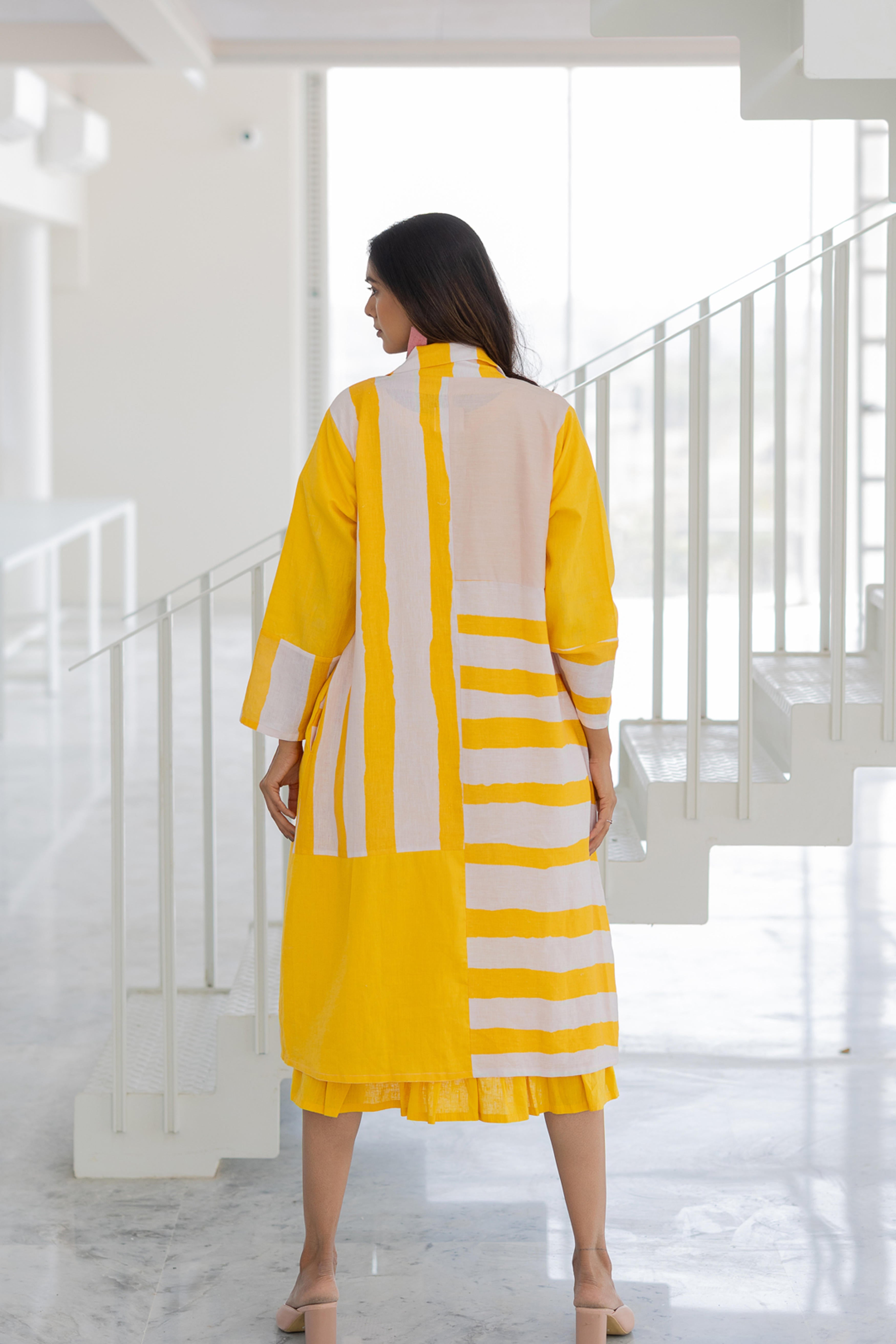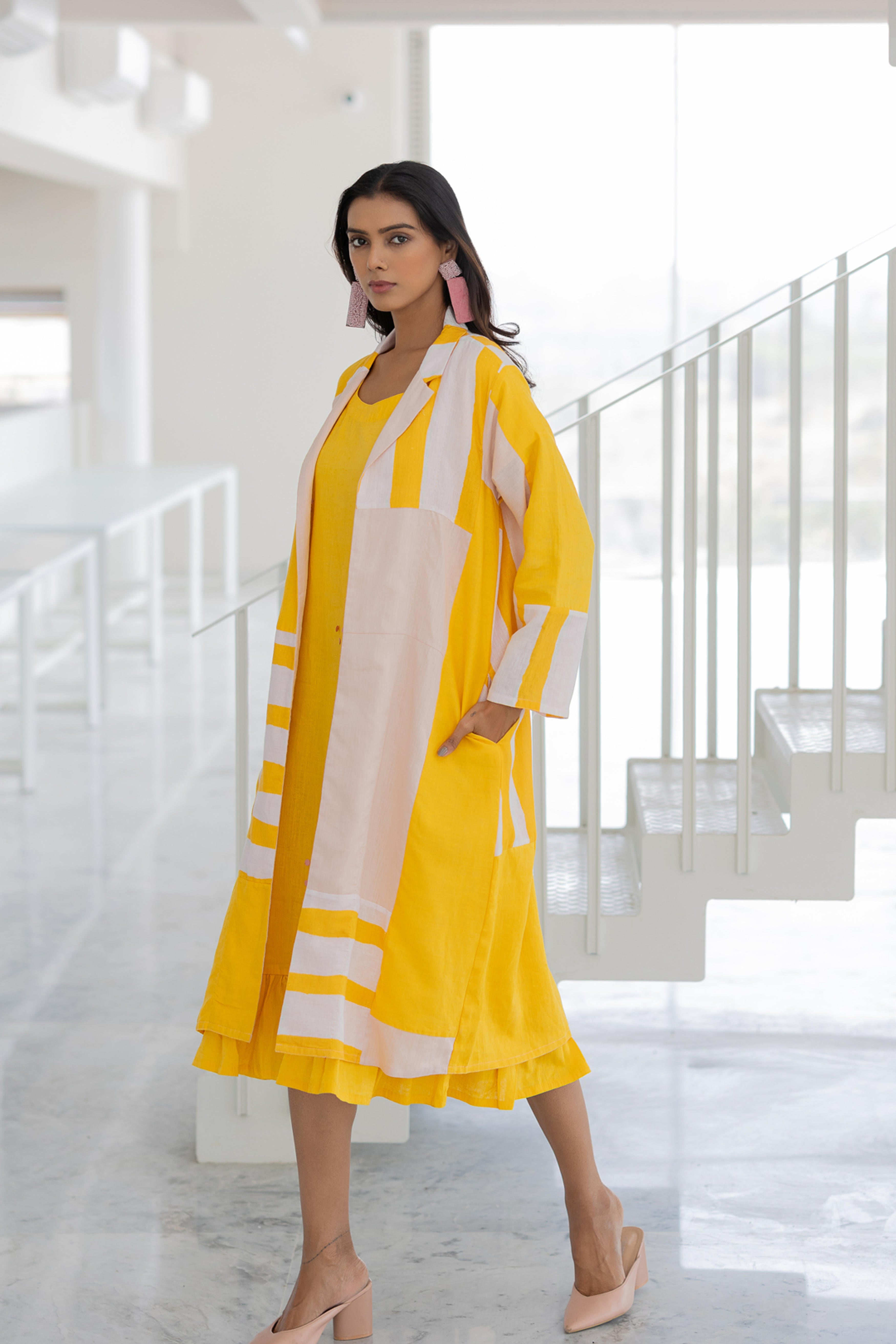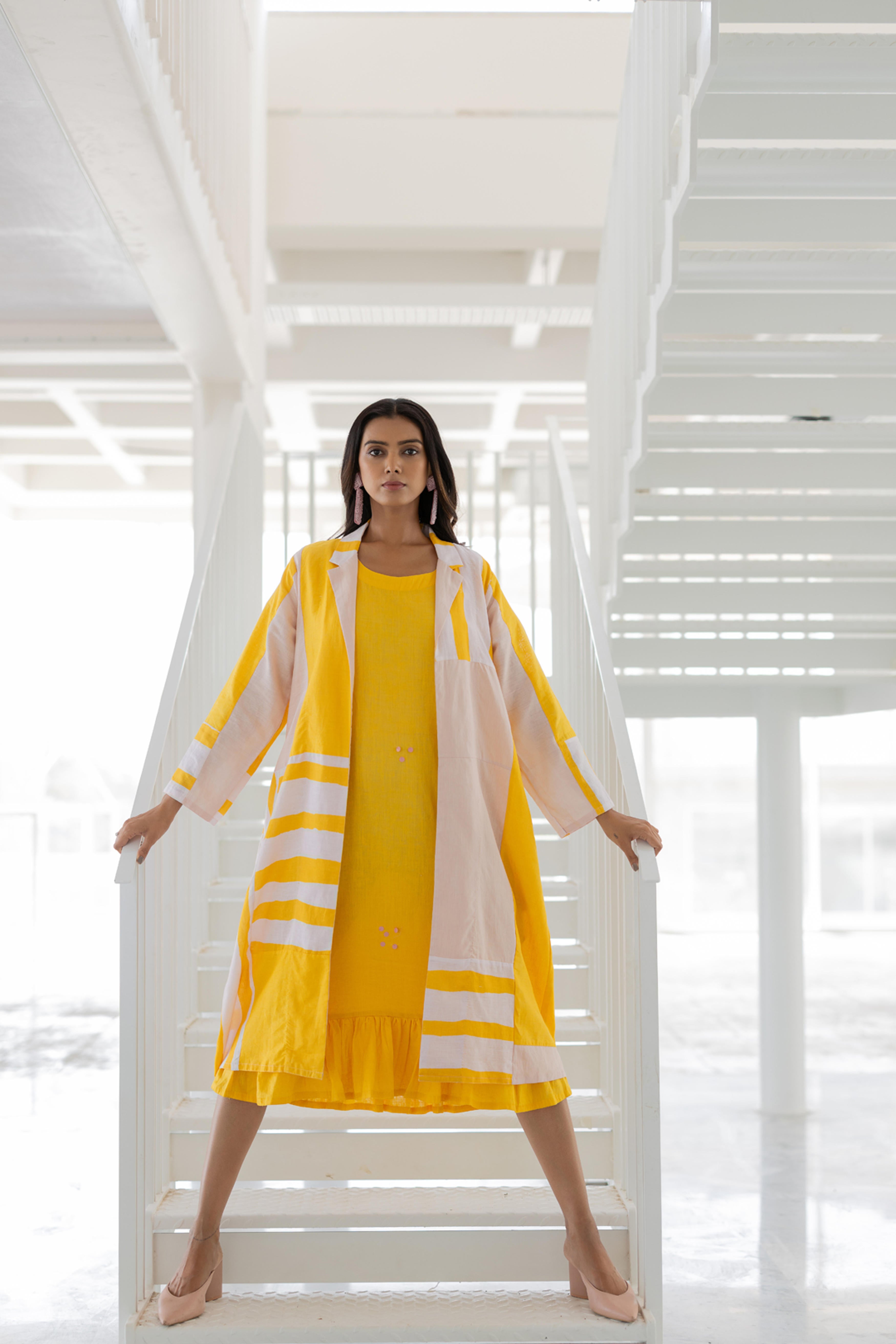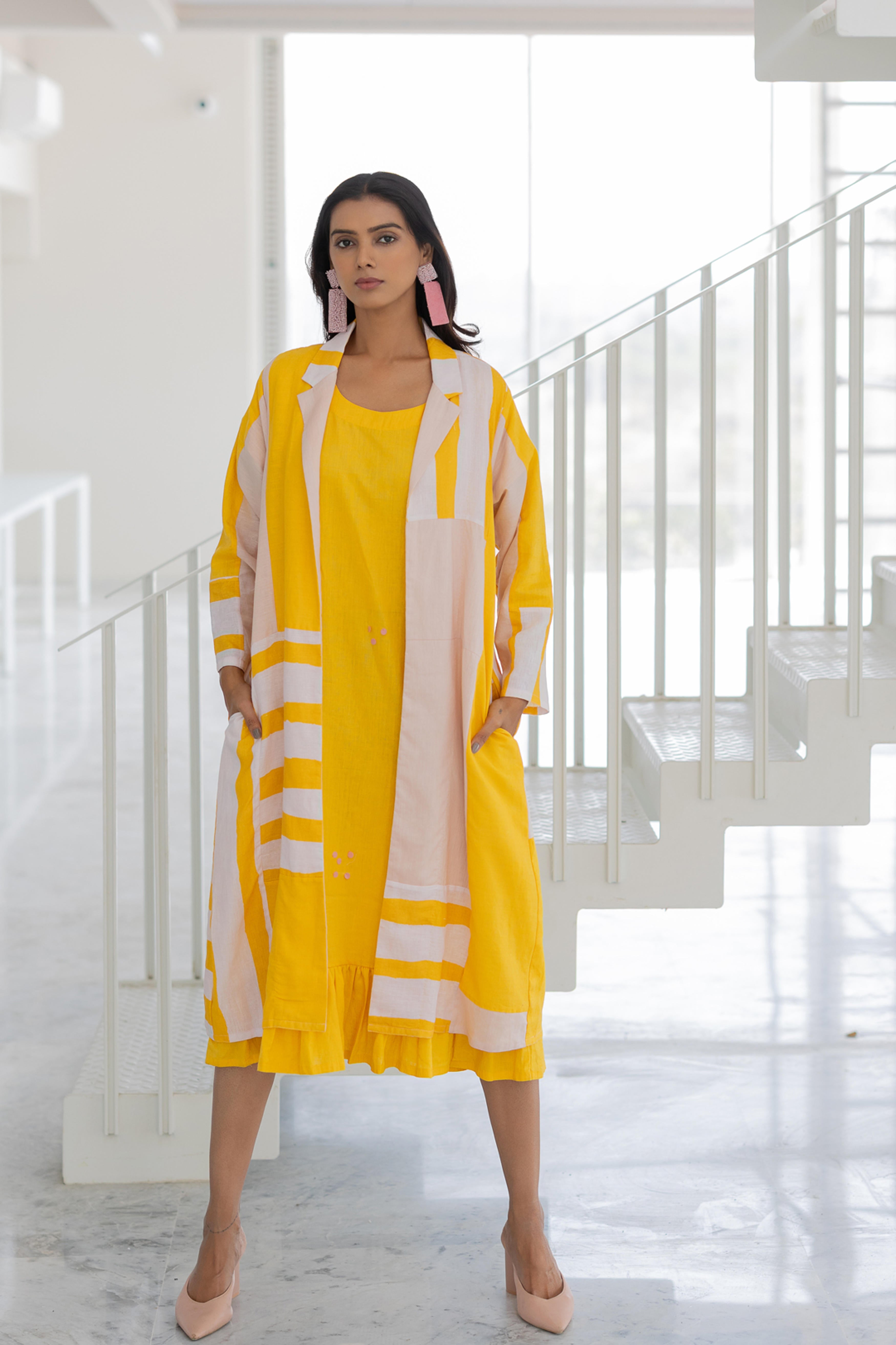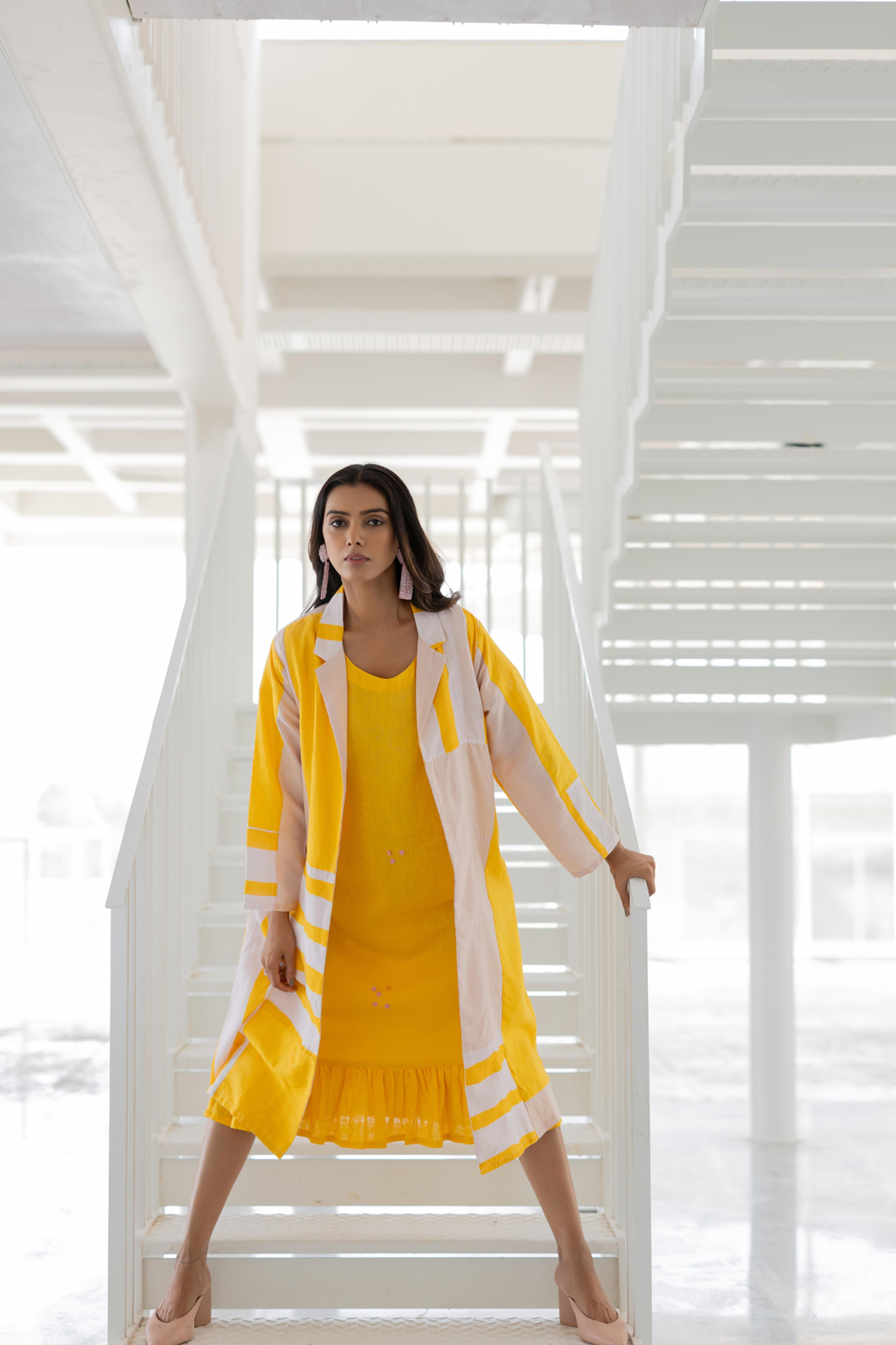 Radiate warmth and elegance in this sunflower yellow dress, crafted from a lightweight linen-viscose blend for breathable, all-day comfort. Soft pink hand embroidery adds a delicate touch, while the ruffle hemline creates a breezy, flowy finish. Designed with a wide scoop neckline and dropped shoulders, this is perfect for casual brunches and summer outings.