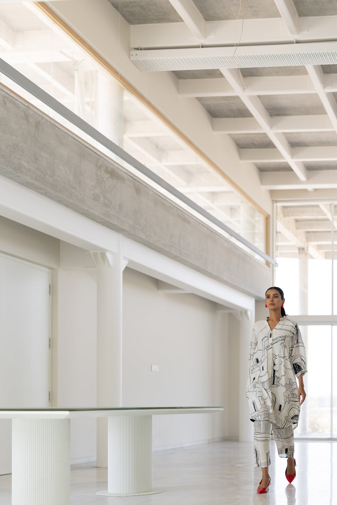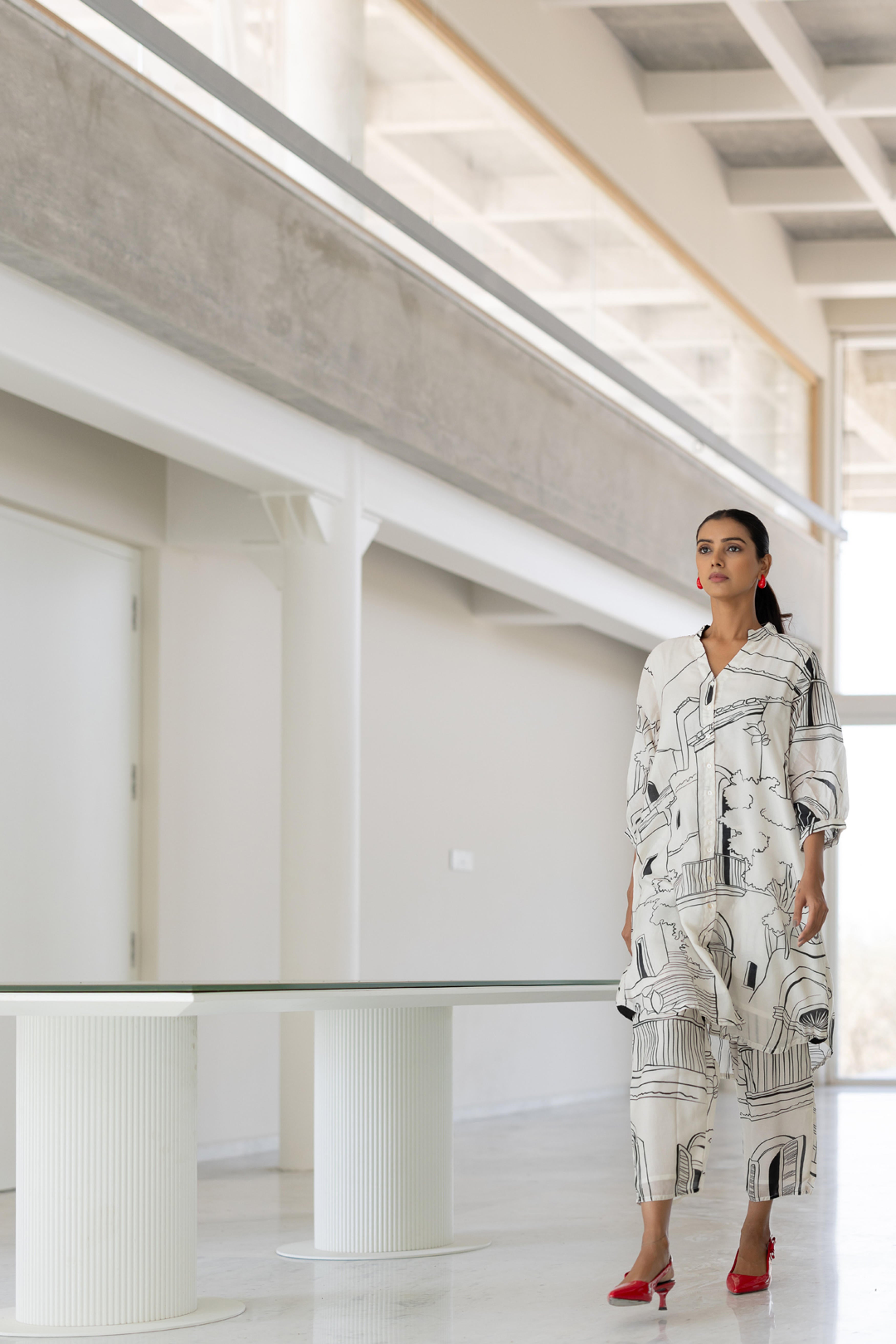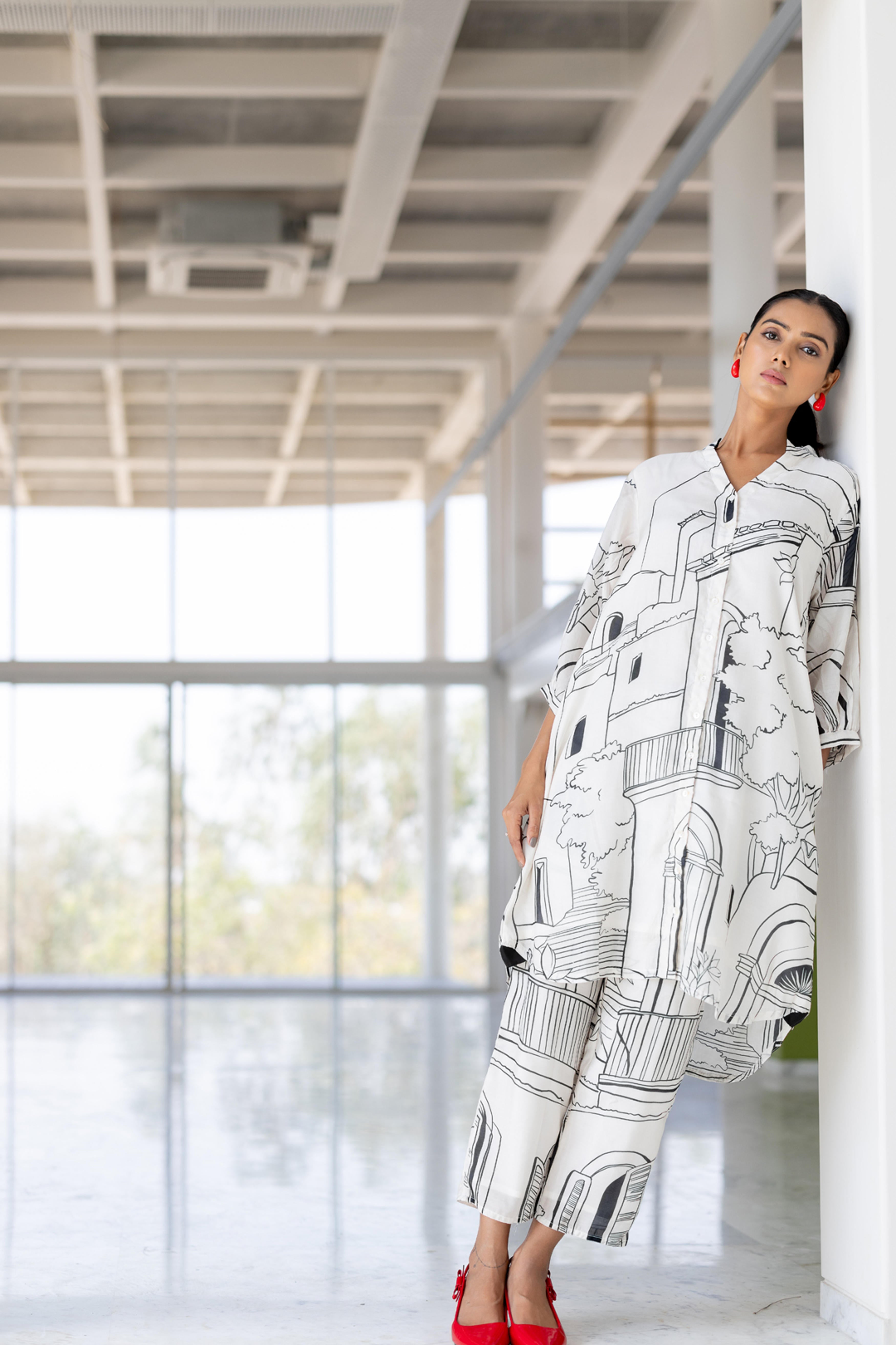 A sophisticated take on artistic fashion, the Mediterranean Lanes Tunic features a hand-drawn architectural print on a relaxed-fit silhouette. The long tunic-style top offers a balance of structure and fluidity, making this ensemble both bold and effortless. The neutral black-and-white palette is perfect for pairing with colored shoes and statement earrings for a refined, modern aesthetic. The top is fully lined with cotton mulmul fabric.