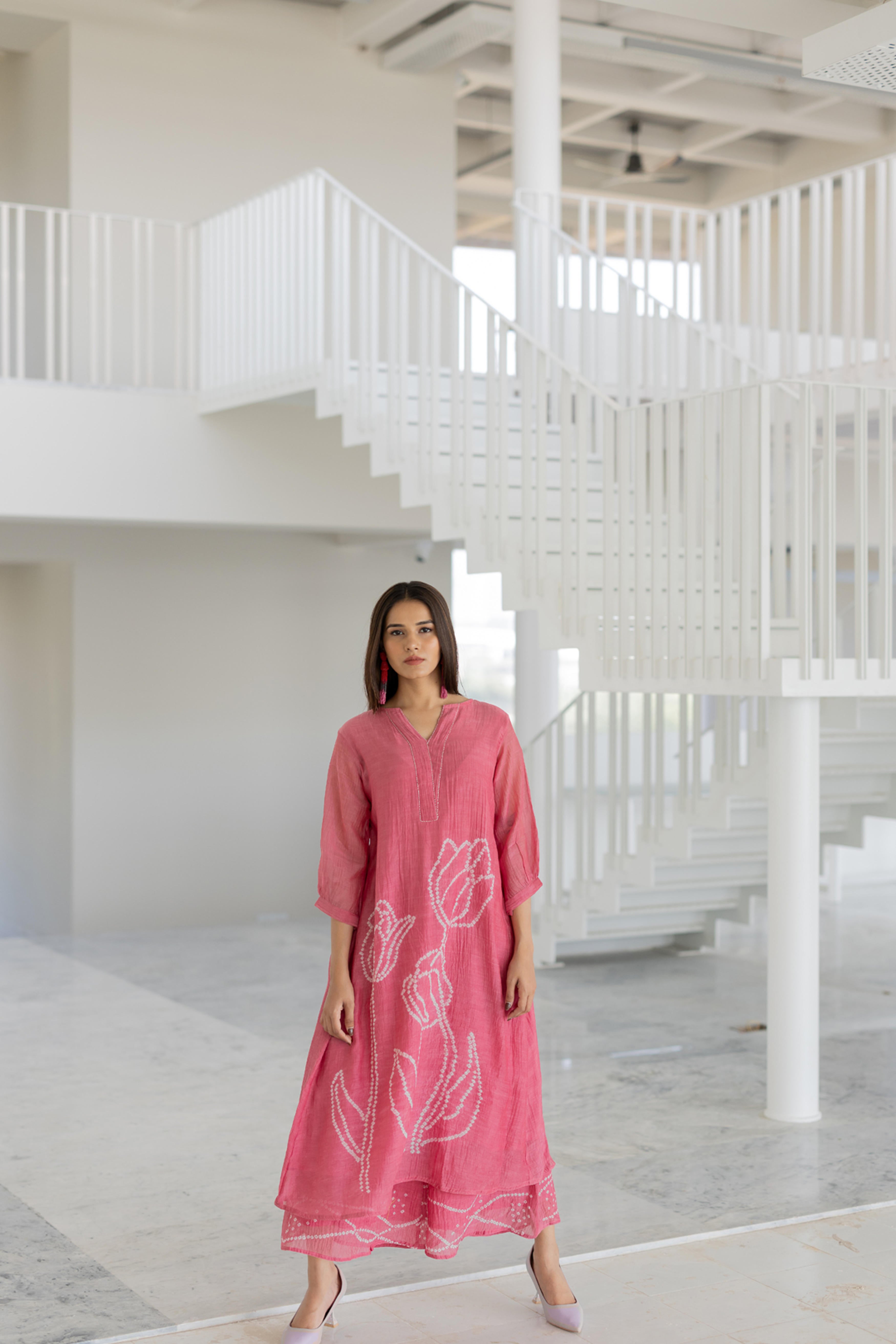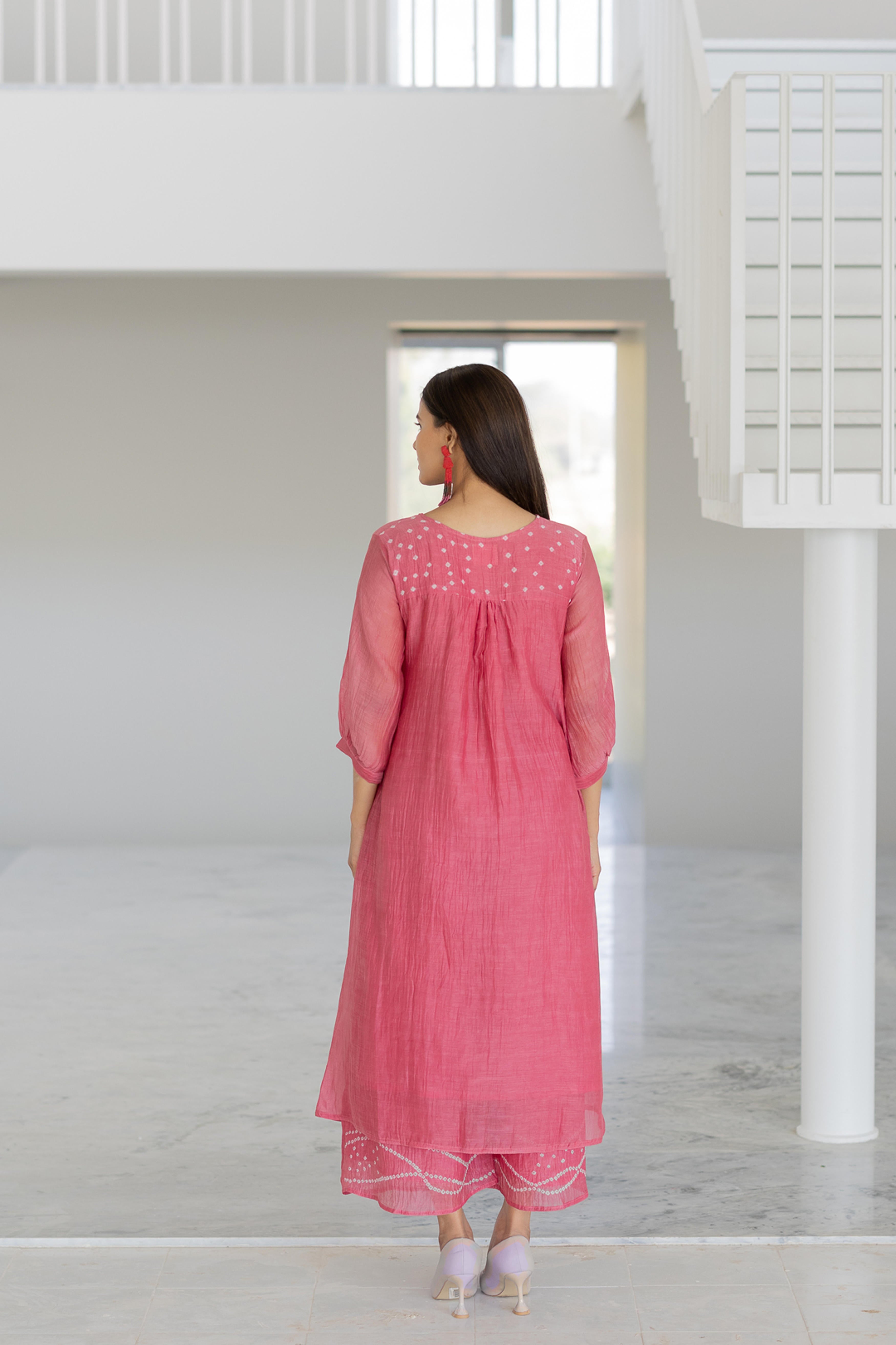 Effortlessly elegant, the Misty Tulips Bandhani Kurta is a perfect blend of comfort and style. The soft, breathable chanderi fabric in a charming rouge pink hue drapes gracefully, making it an ideal choice for casual and semi-formal occasions. The kurta features a delicate bandhani floral design, adding a touch of artistic charm. Perfect for those who appreciate minimalistic elegance with a hint of traditional artistry!