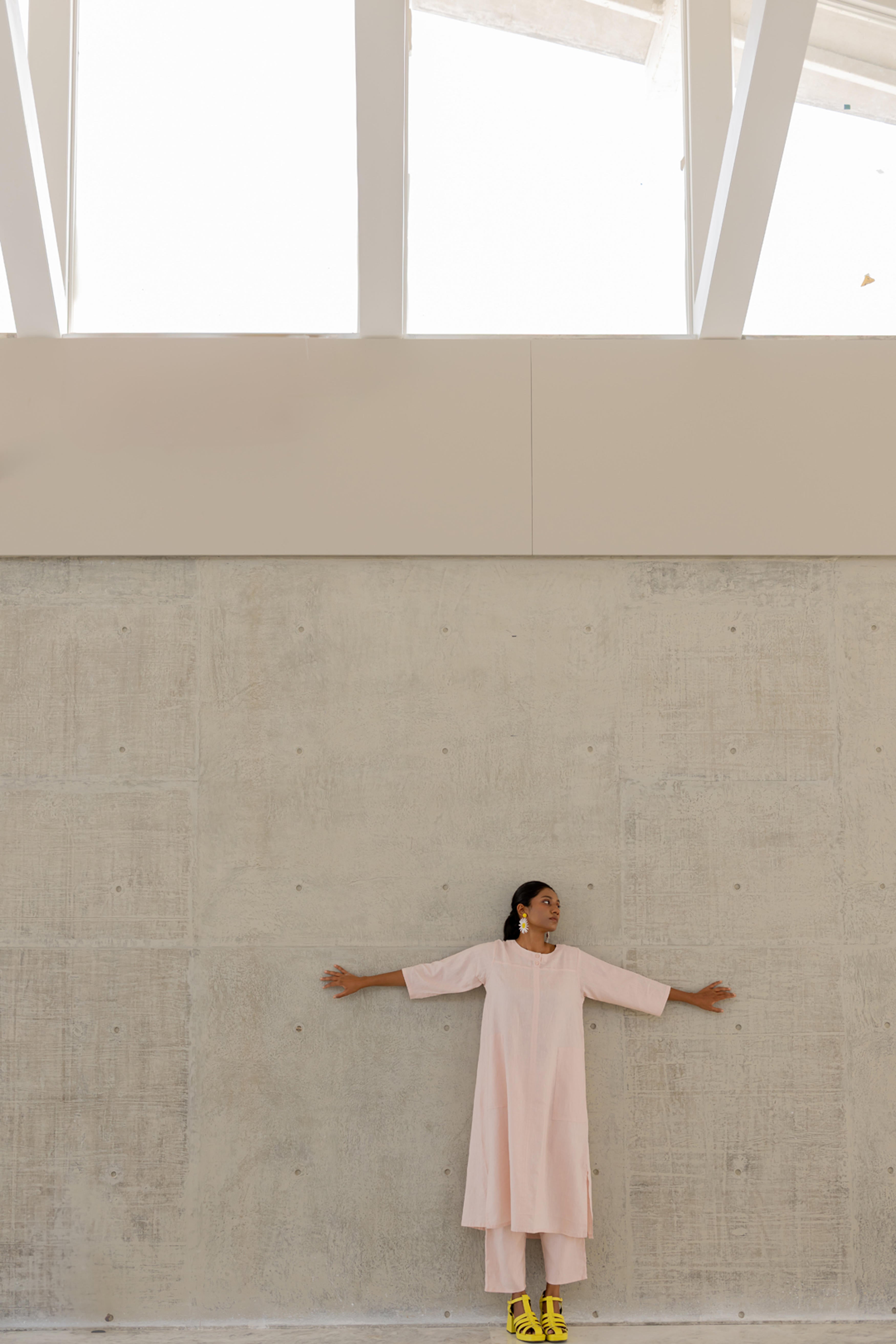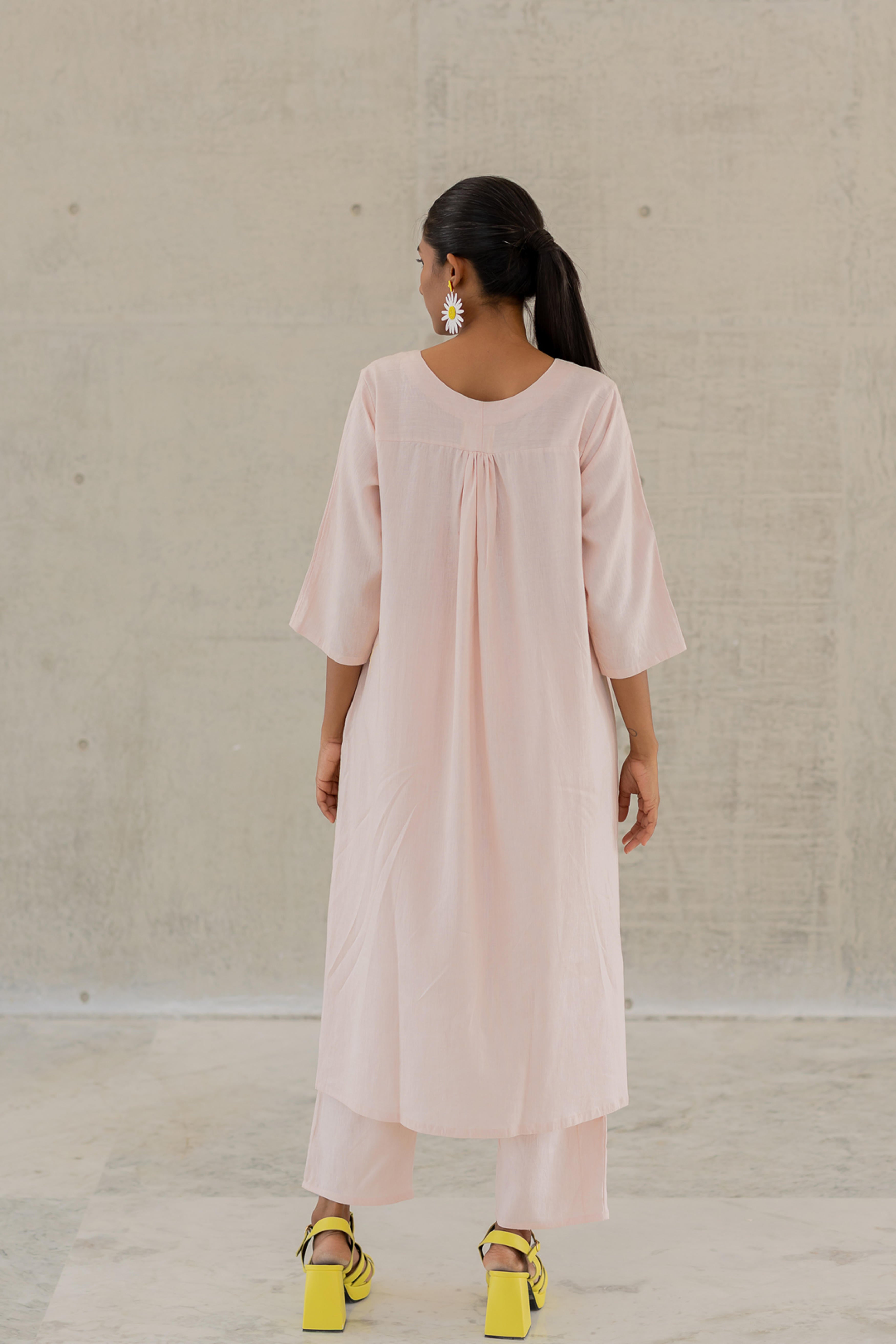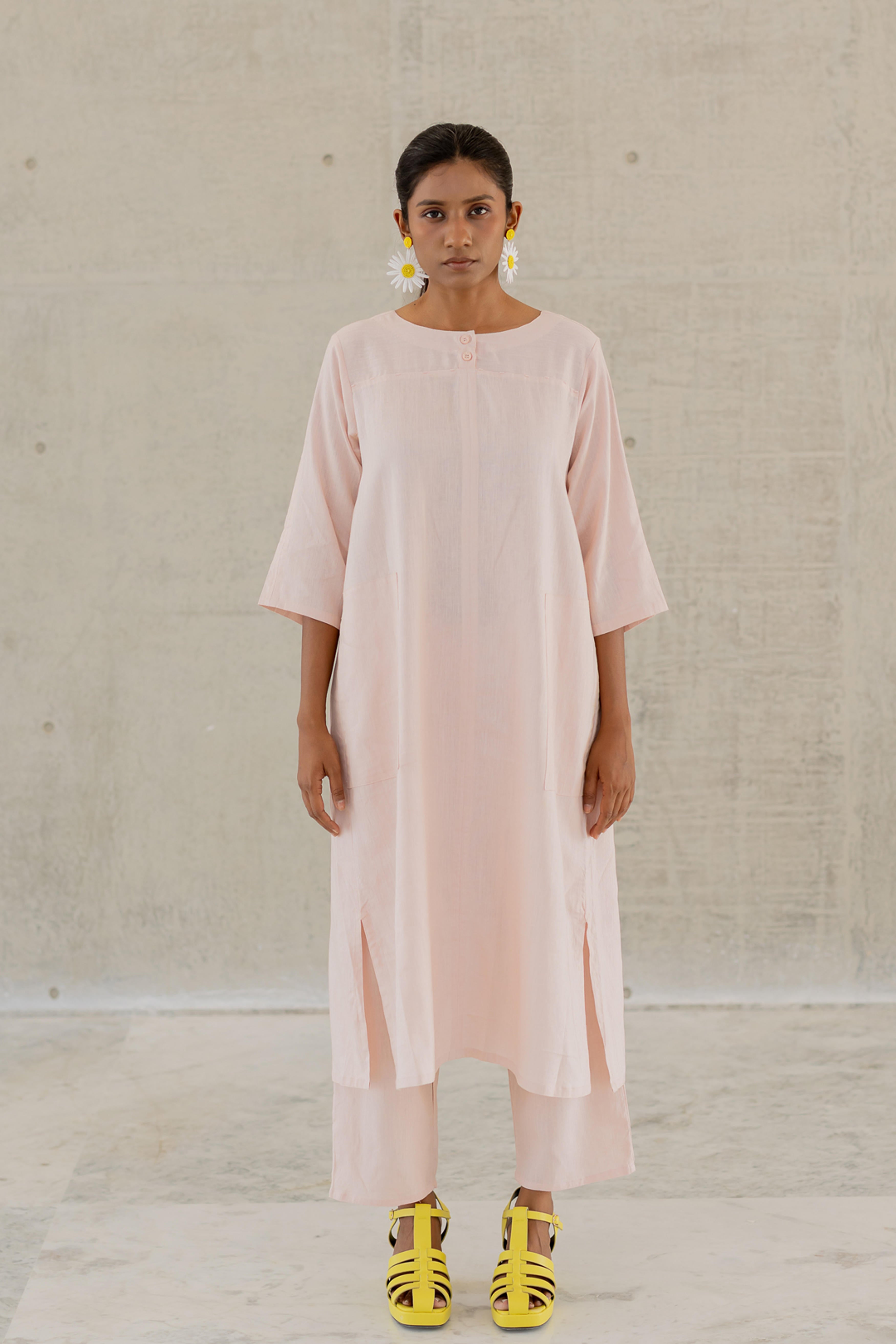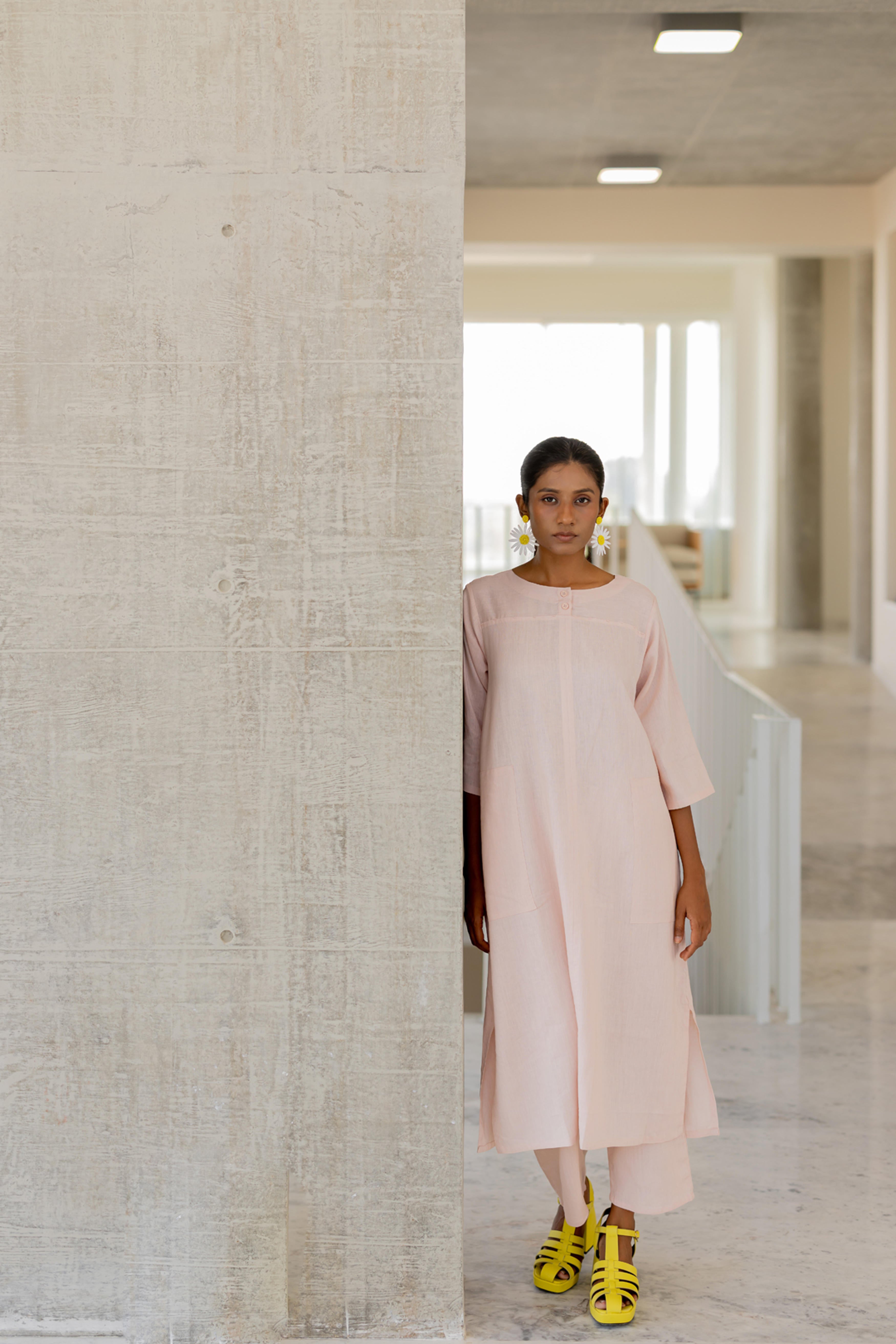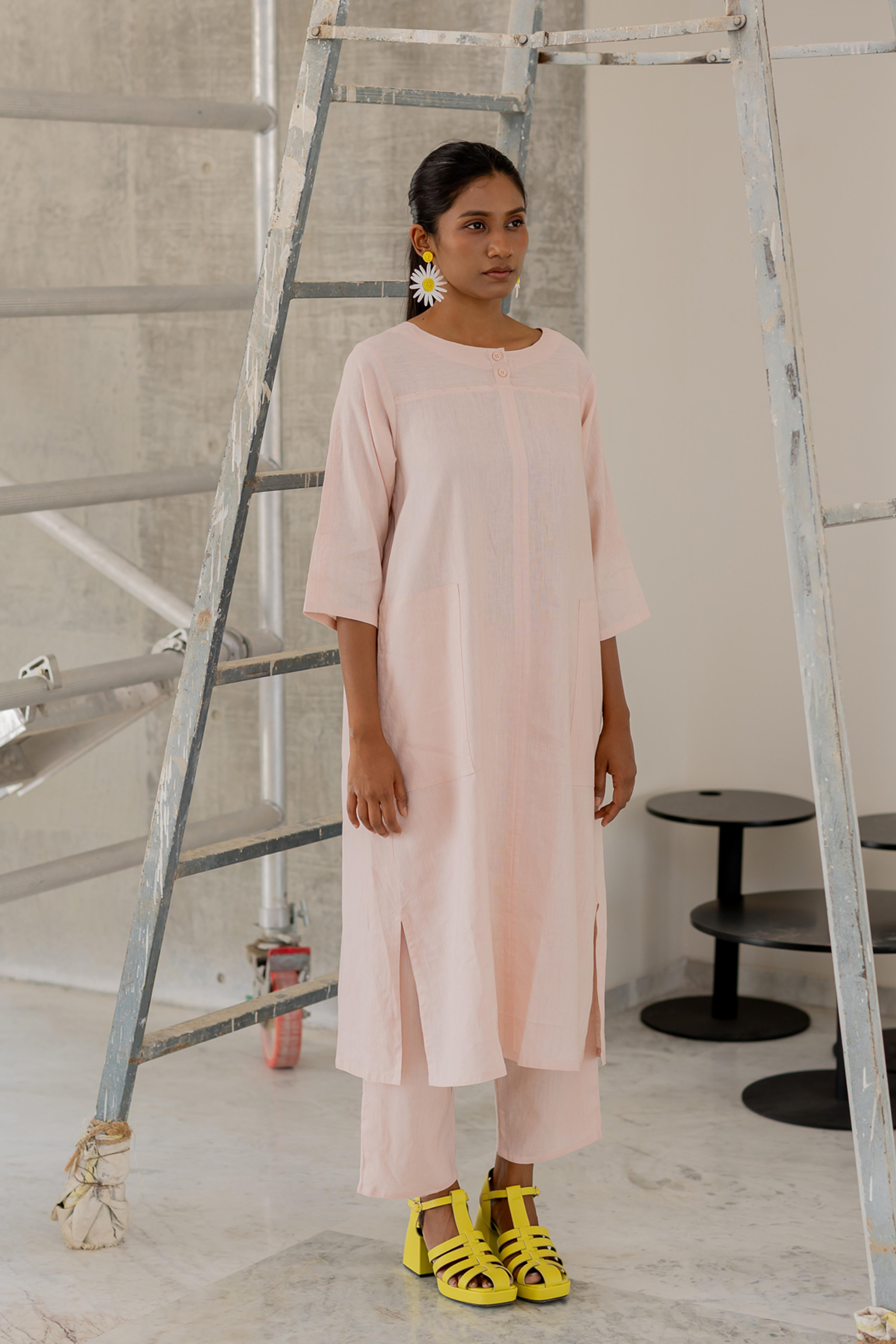 Elevate your wardrobe with the effortlessly chic Oyster Pink Kurta Set. Crafted from breathable linen-viscose fabric, this ensemble features a relaxed-fit kurta with side slits for enhanced comfort and movement. The round neckline is adorned with delicate bead embellishments, adding a touch of elegance. Designed with three-quarter sleeves and functional pockets, this set perfectly balances style and practicality. Paired with matching straight-fit pants, it's an ideal choice for casual outings, workwear, or festive gatherings.