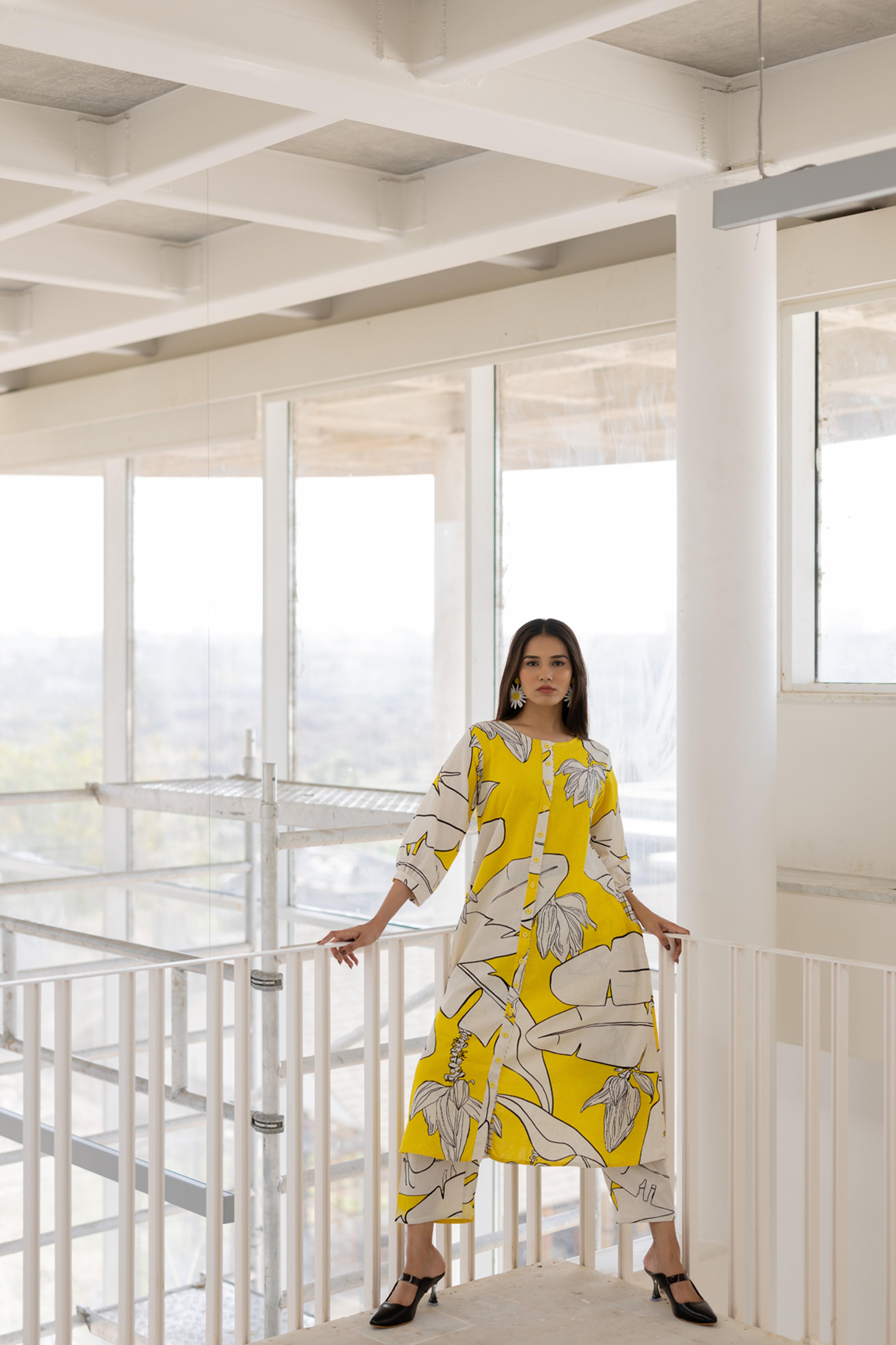 Effortlessly elegant and breezy, this kurta is designed for modern sophistication. Crafted in a soft, breathable cotton-linen blend, it features a vibrant yellow and ivory banana leaf print. The flowy A-line silhouette, button-down front, and side pockets ensure ease of movement, making it perfect for both casual and semi-formal occasions.