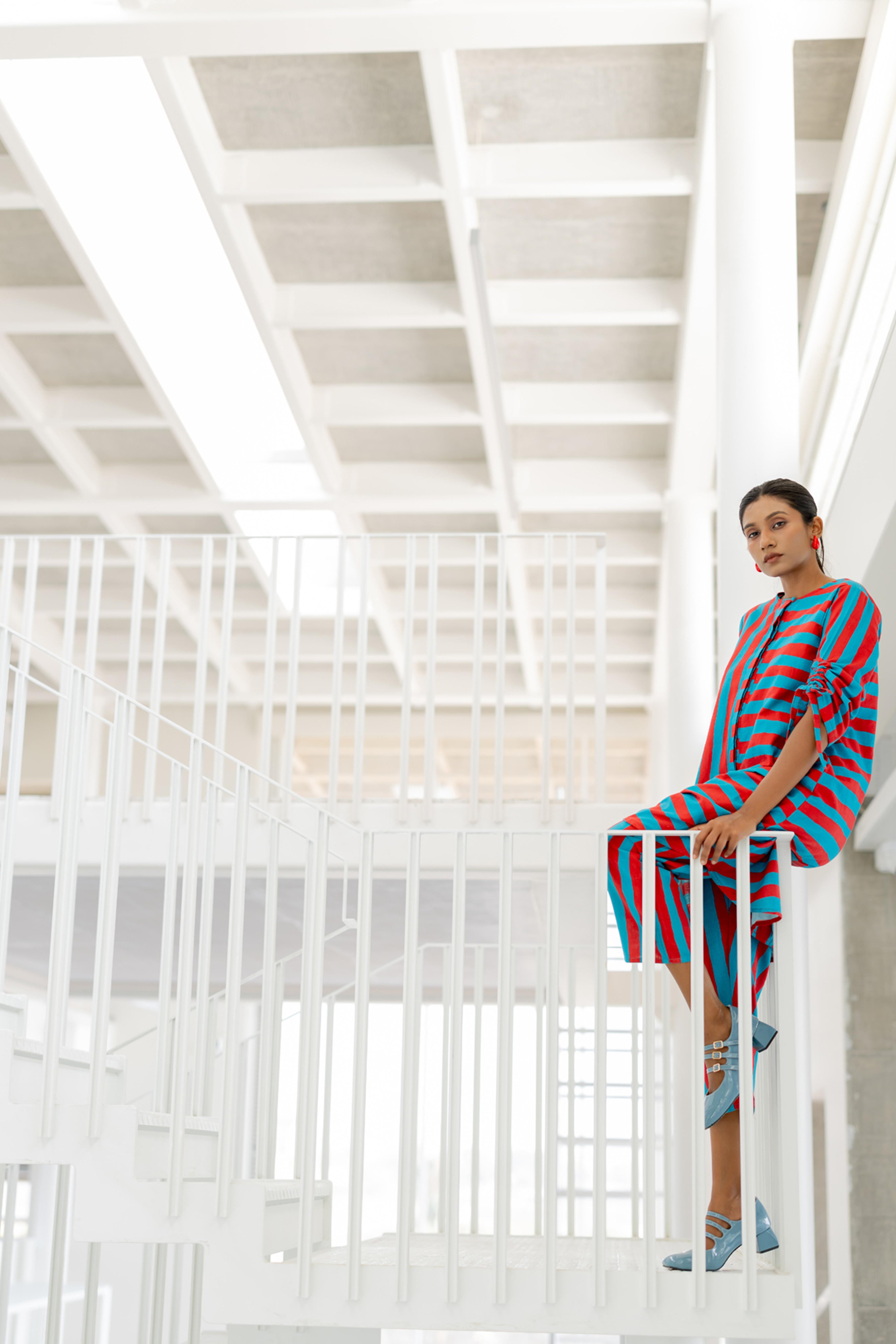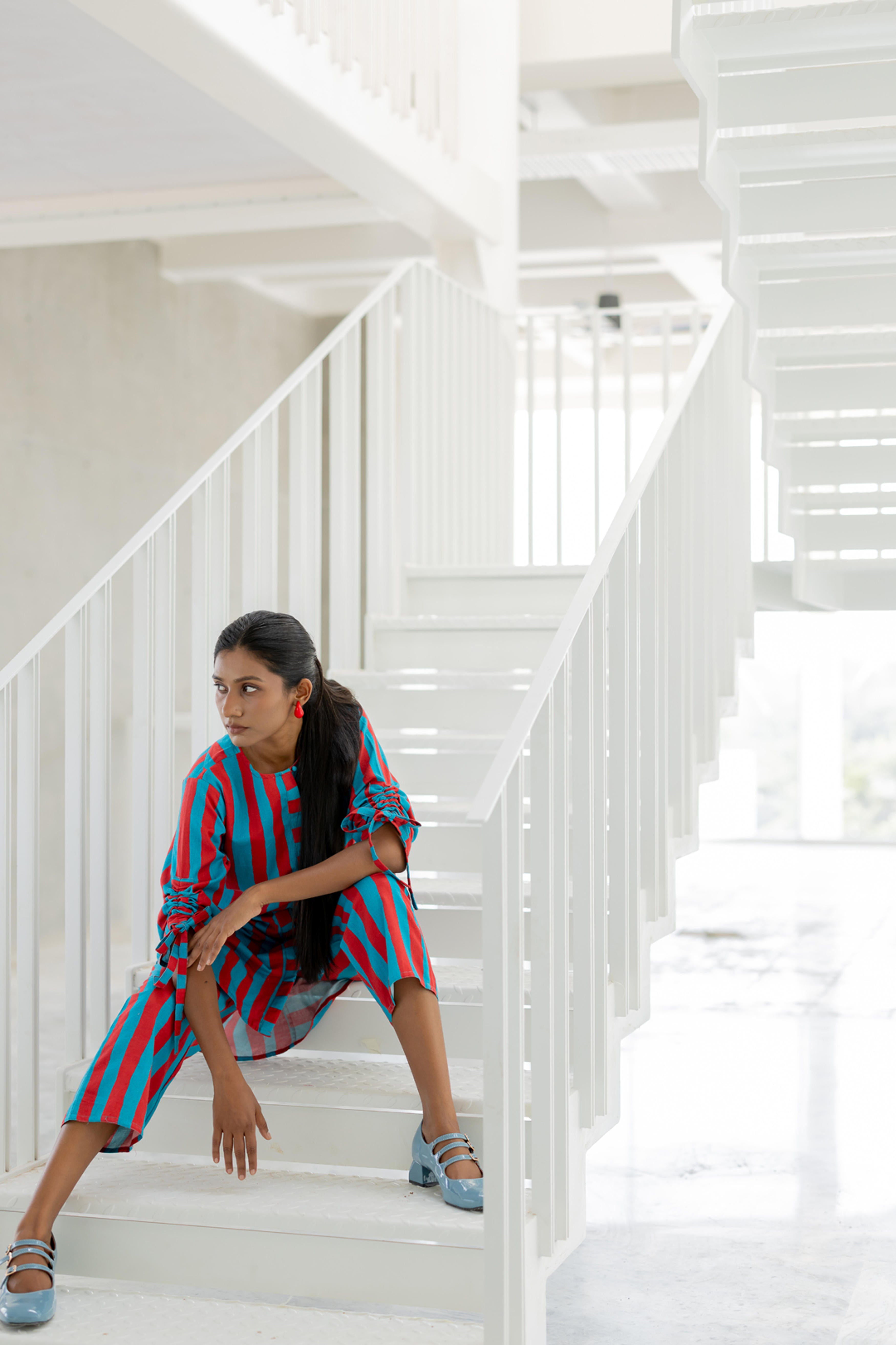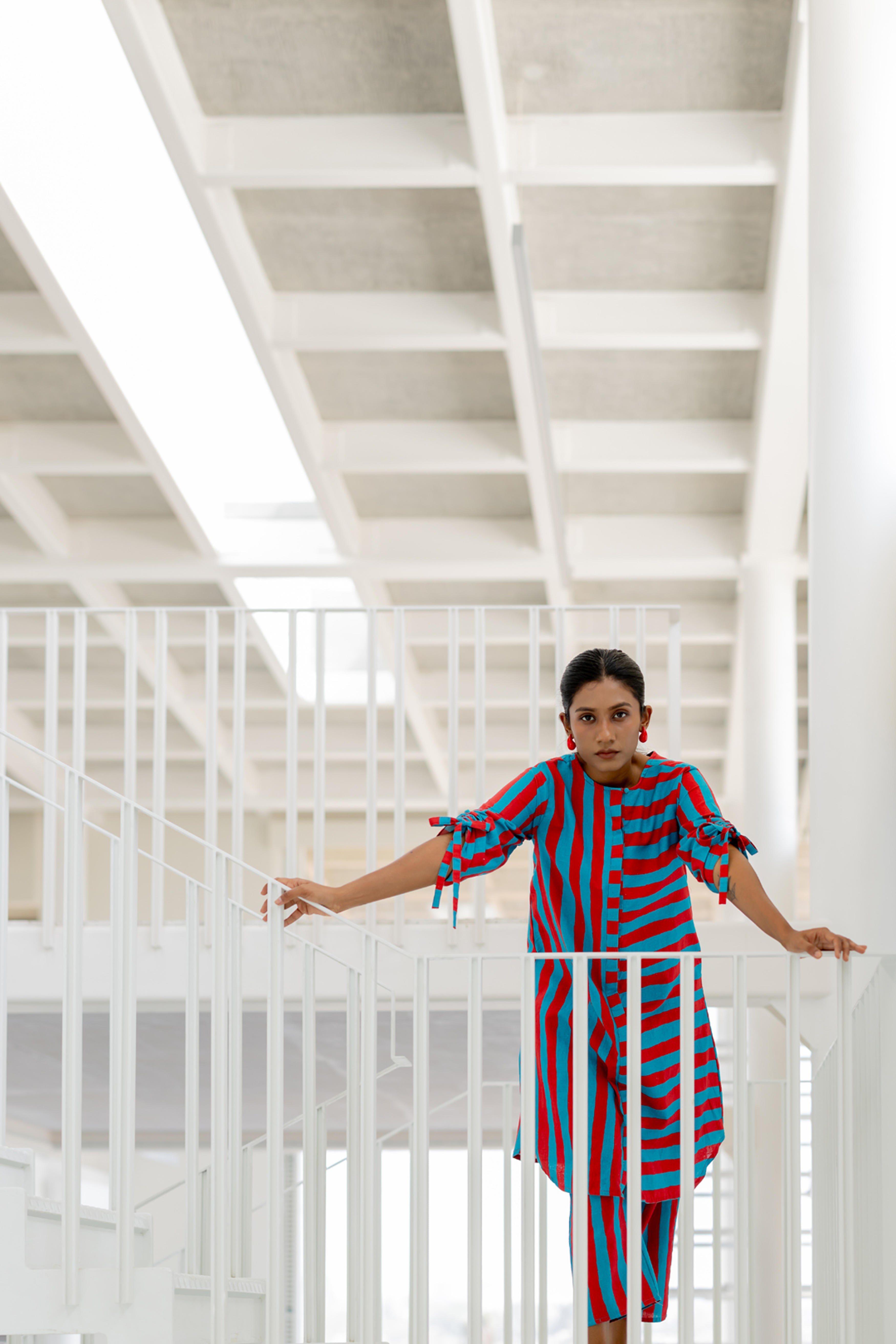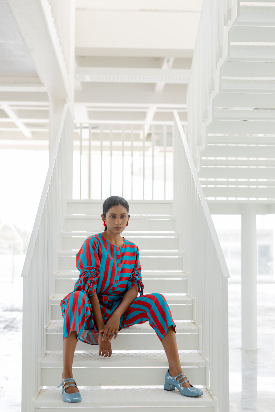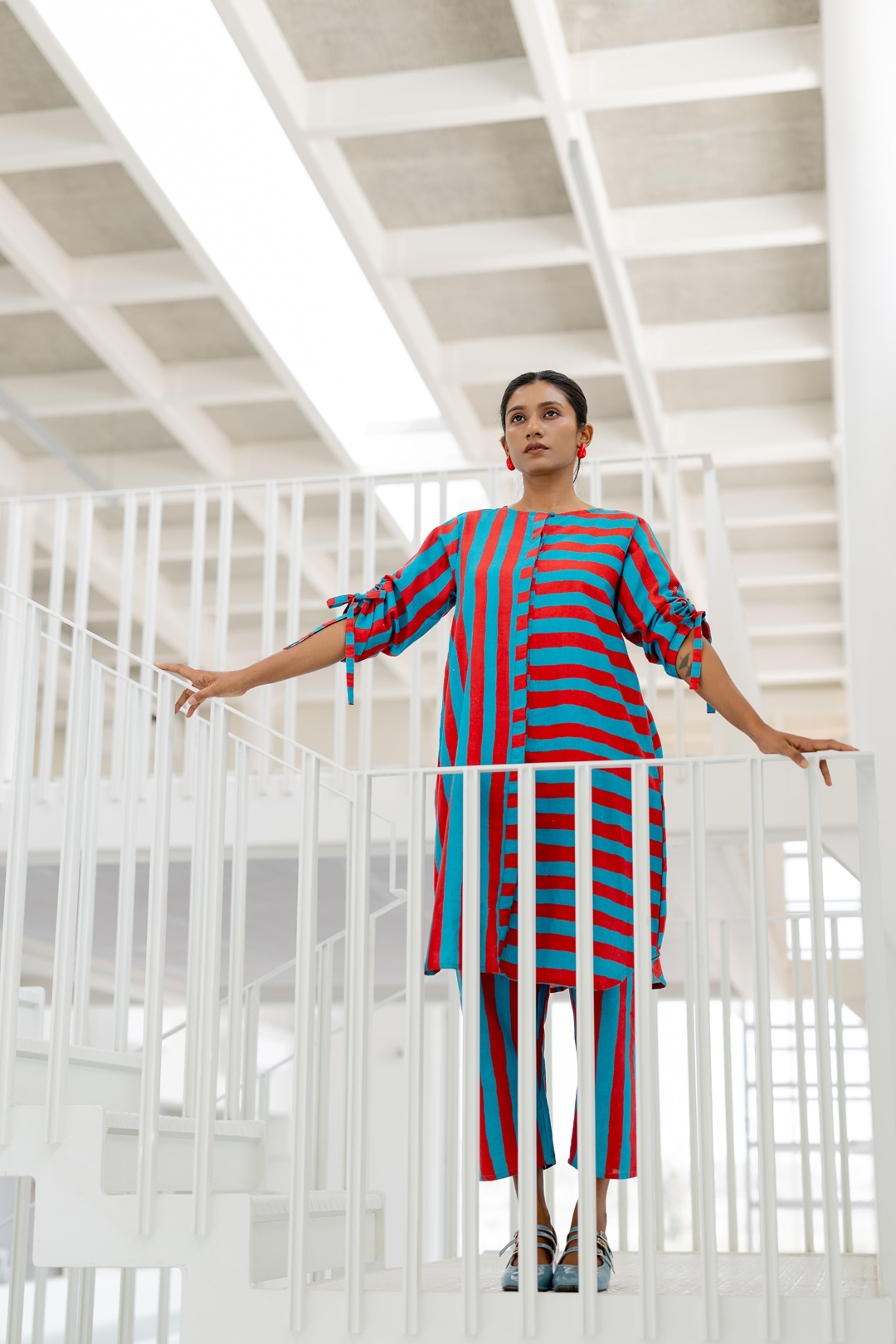 A playful yet sophisticated take on modern fashion, the Poppy and Blue Stripe Co-Ord features a vibrant red and turquoise striped pattern. Designed for versatility and comfort, the top boasts a relaxed fit with ruched drawstring sleeves for adjustable length. The straight-leg pants add effortless elegance, making this set a go-to choice for both casual and statement styling.