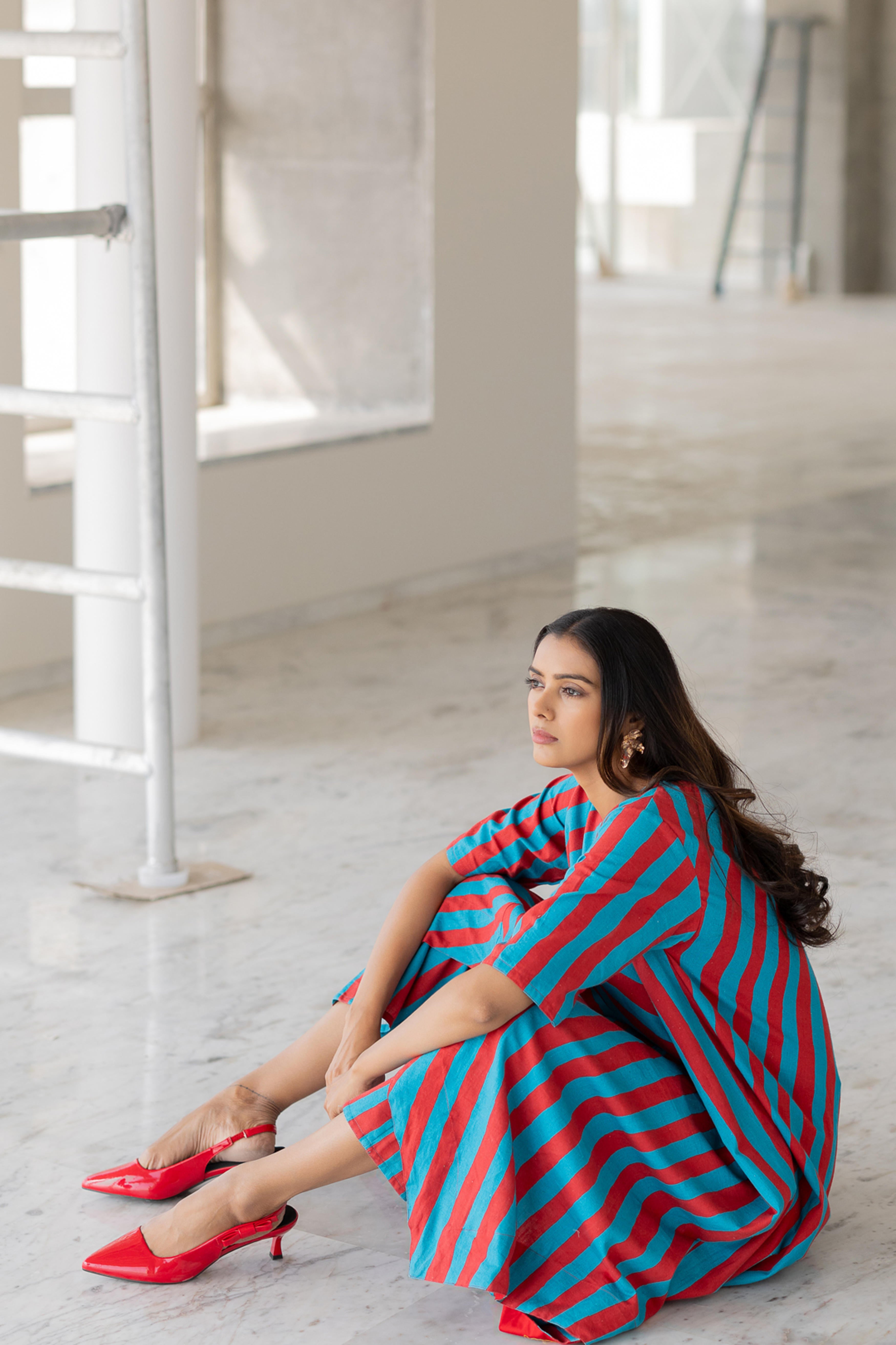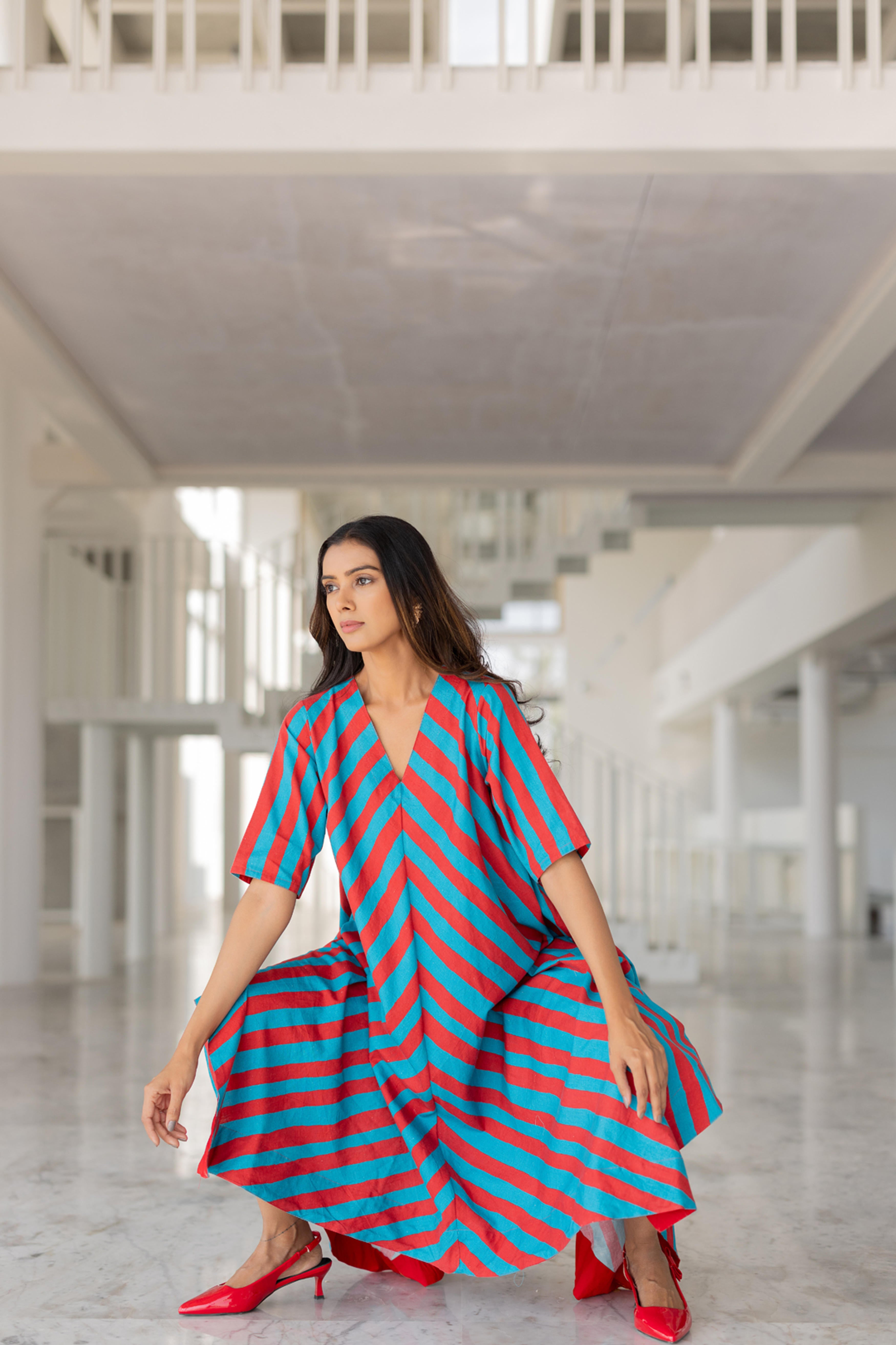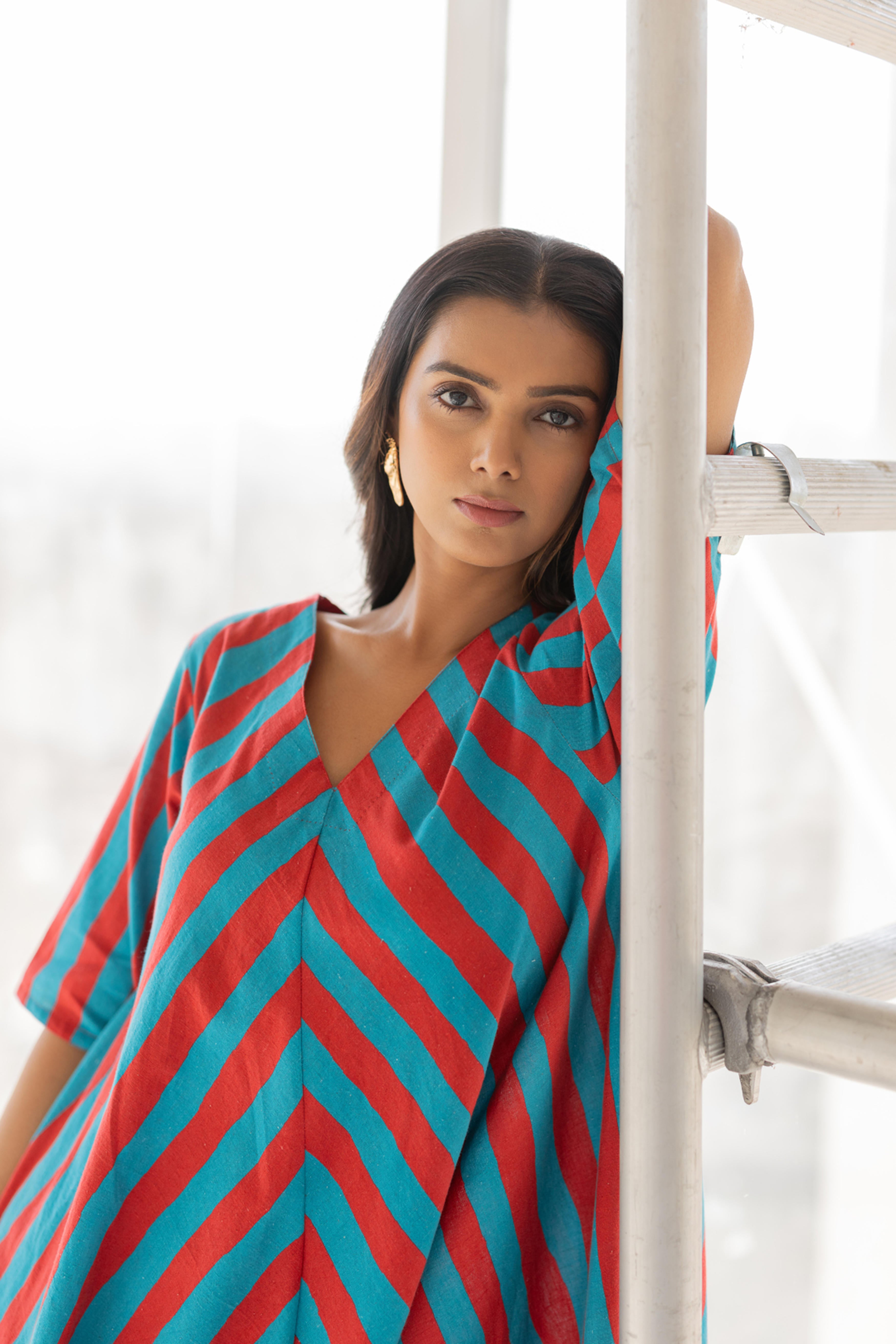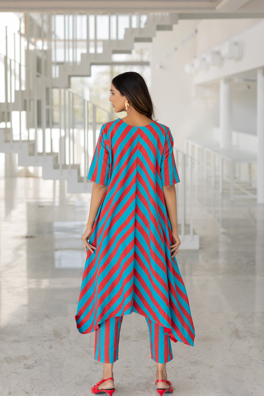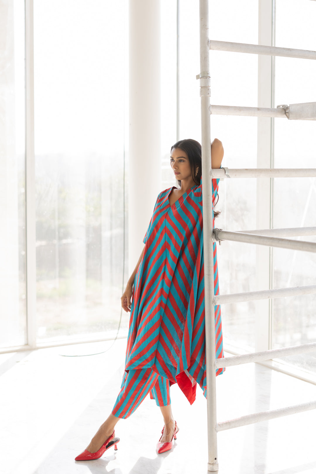 Make a bold statement with the Poppy and Blue Stripe Kurta Set, featuring a striking combination of turquoise and red diagonal stripes. Designed for a contemporary yet effortless look, this V-neck tunic pairs seamlessly with matching straight-leg pants. The fluid silhouette offers both comfort and sophistication, making it a must-have for any fashion-forward wardrobe.