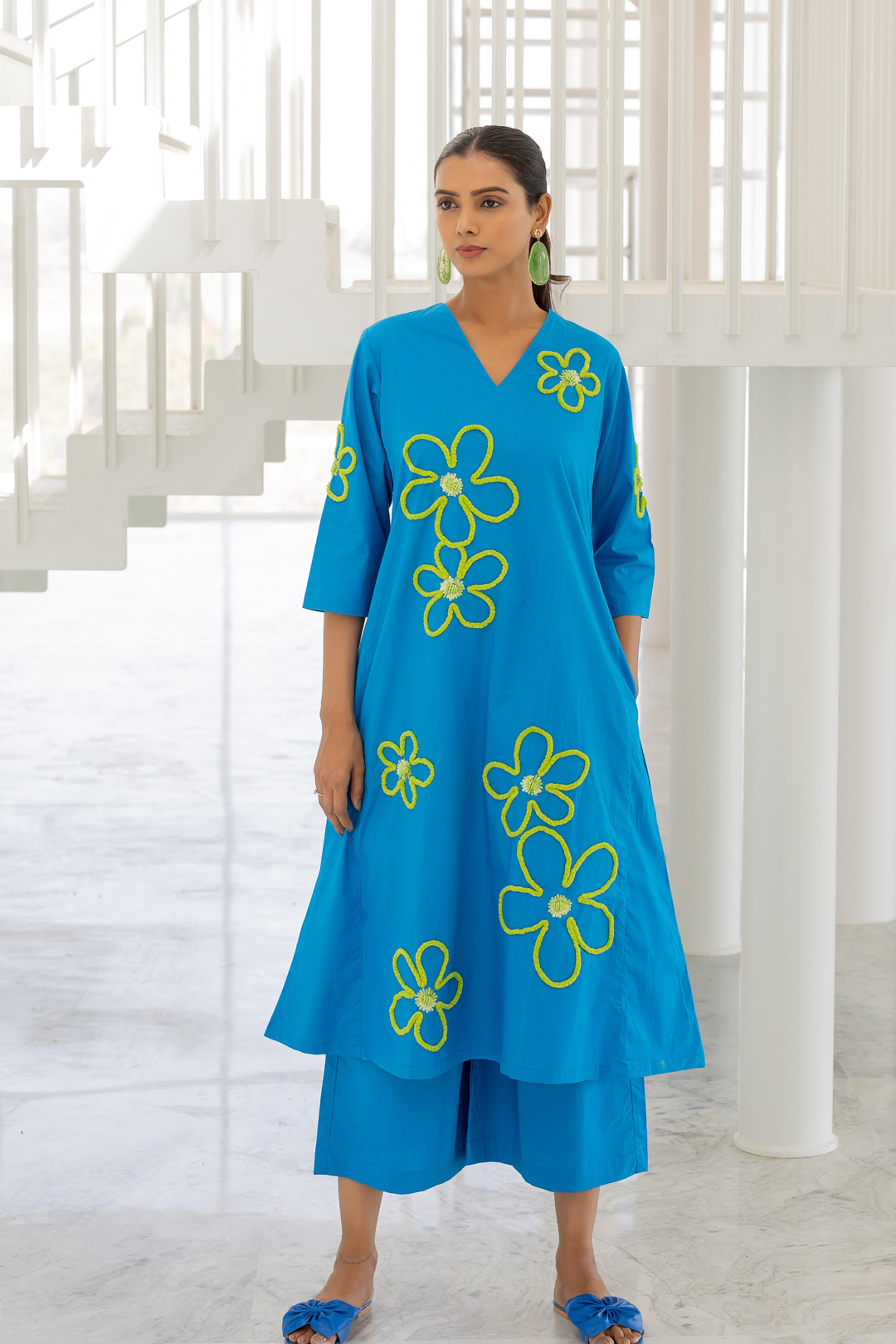 A fusion of bold color and intricate embroidery, the Seafoam Floral Embroidery Kurta is a statement piece that blends comfort with artistry. The relaxed, flowy silhouette offers effortless movement, while the bright green floral embroidery, done using cording technique, adds a touch of elegance. Crafted from breathable cotton, this kurta is perfect for warm-weather outings or casual brunches
