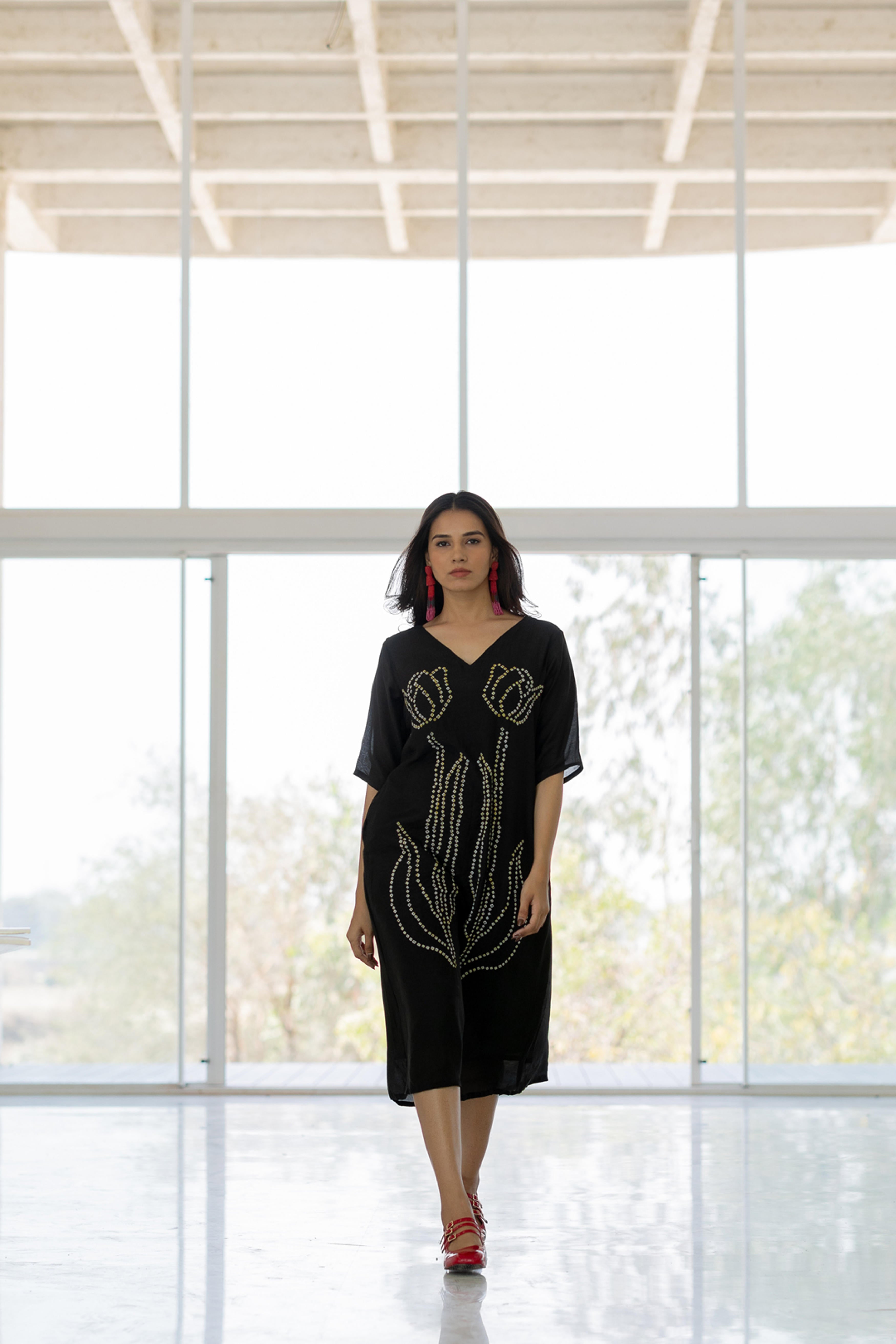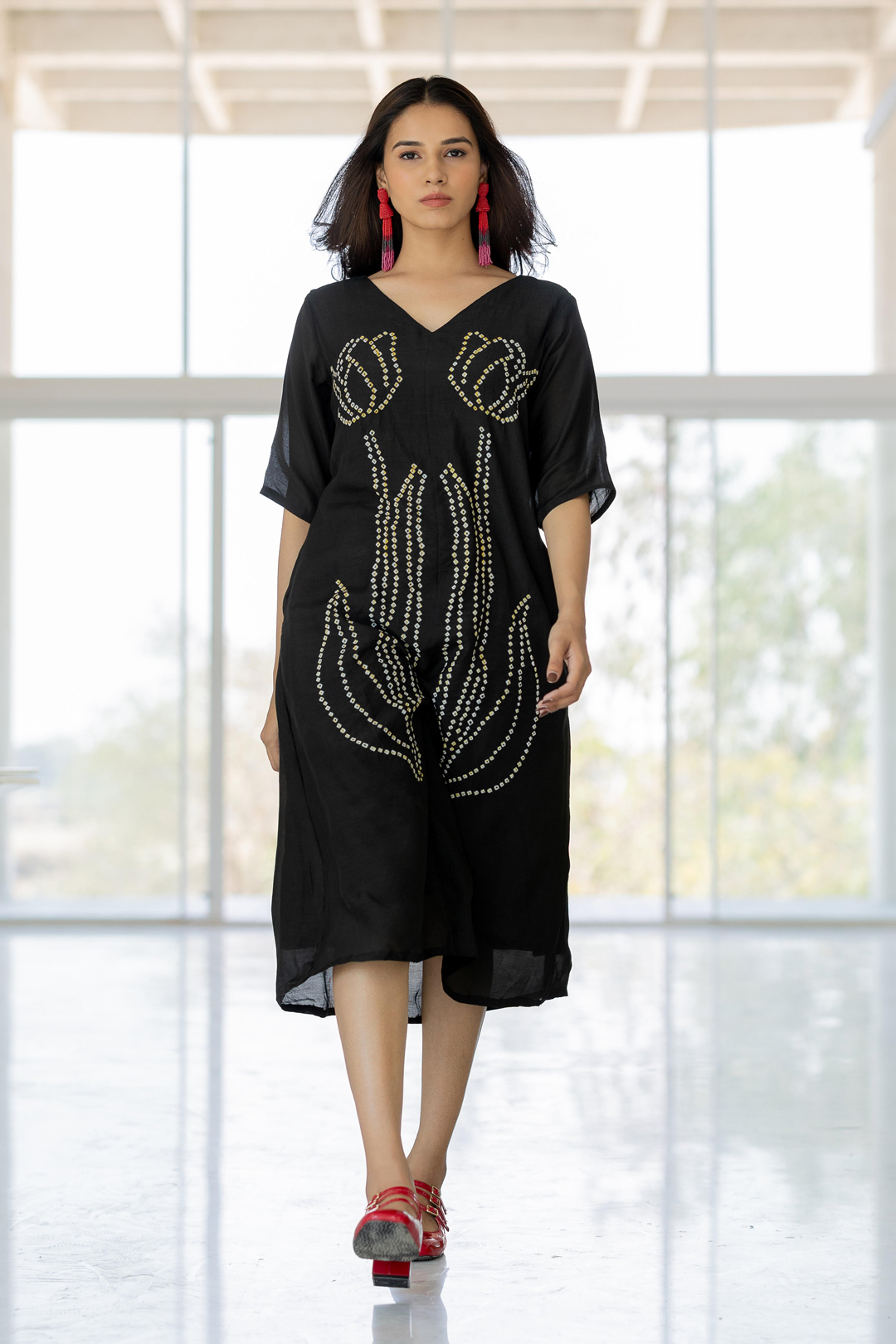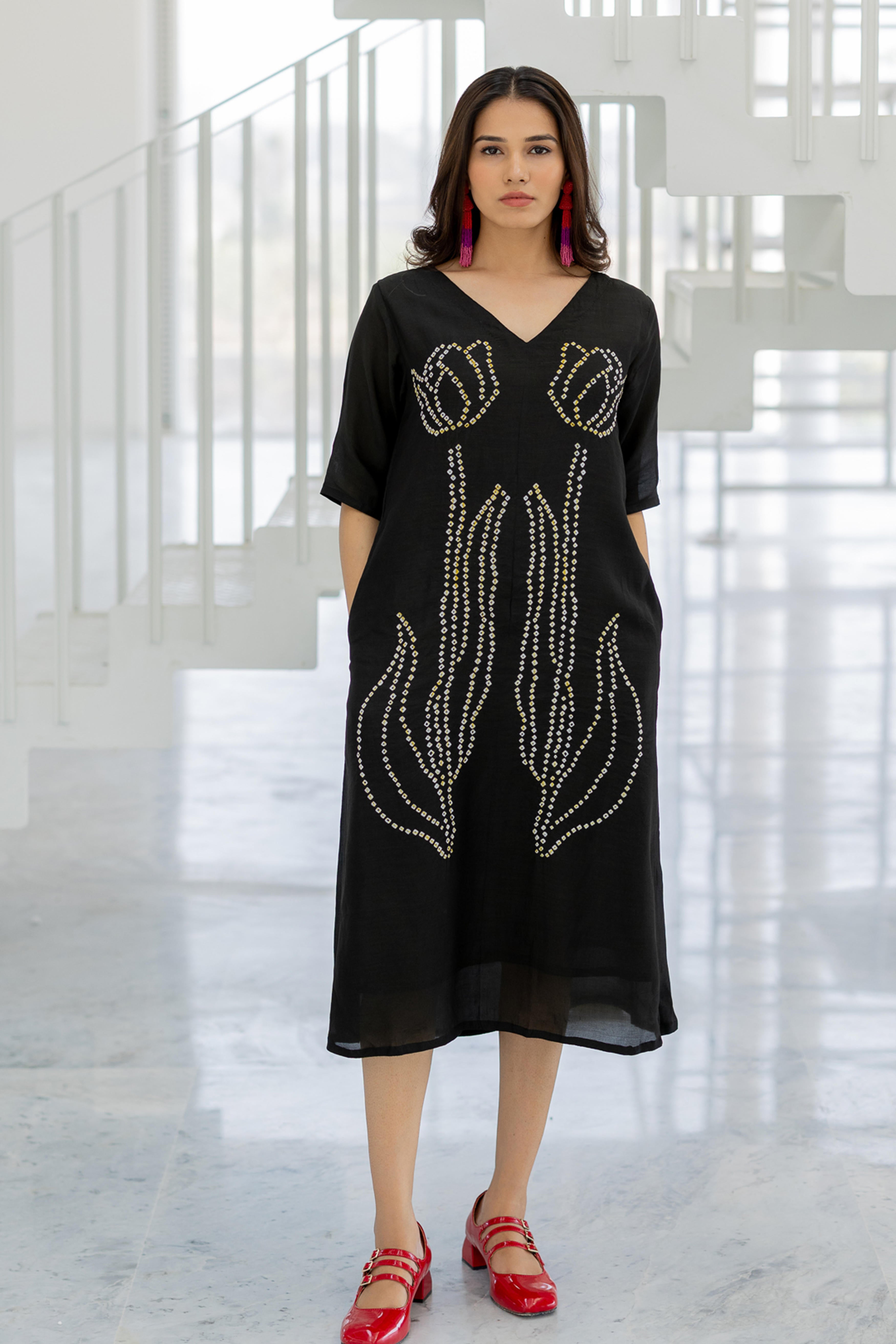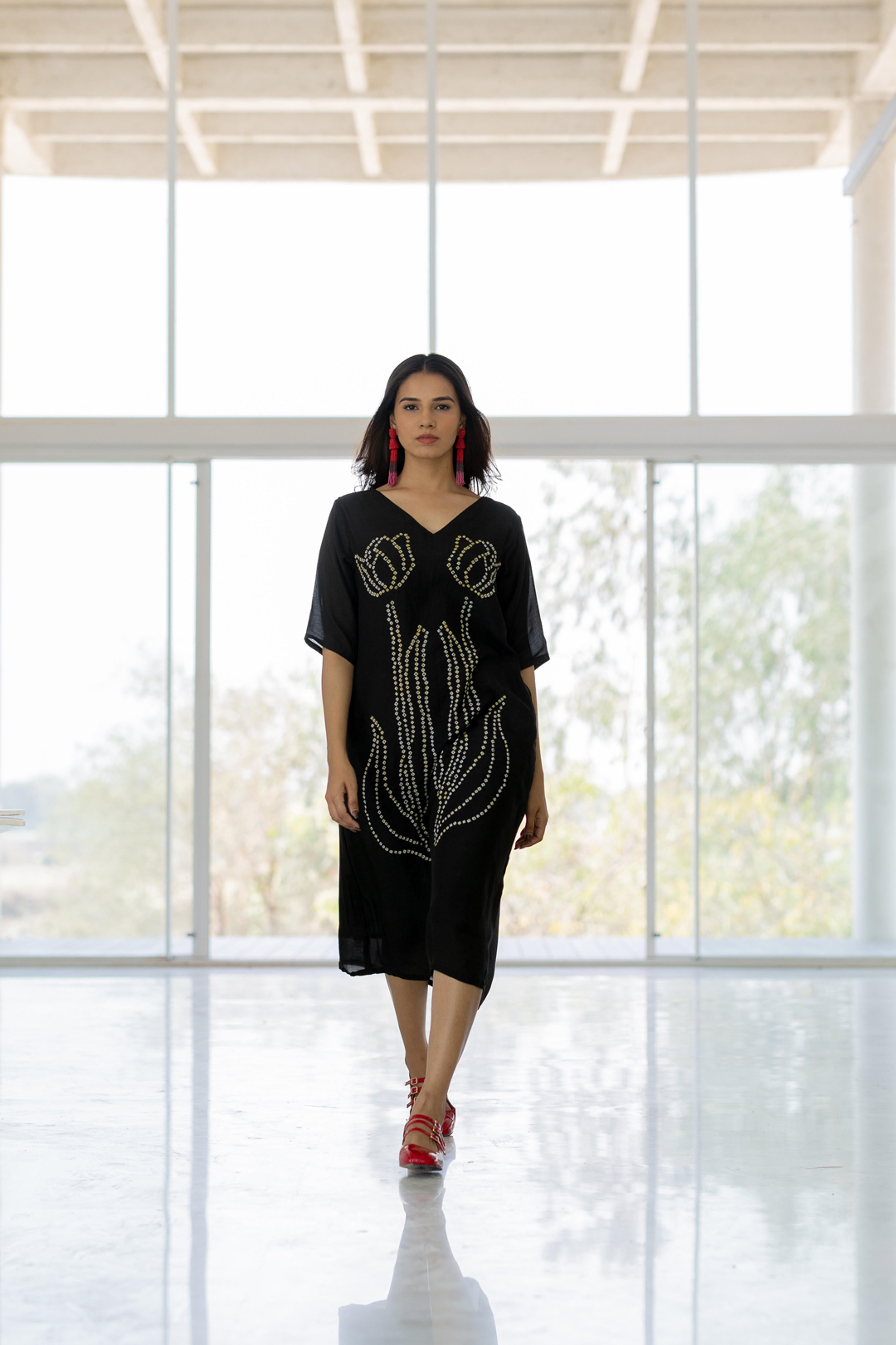 Embrace elegance with the Shadow Tulips Dress, a contemporary fusion of fluidity and intricate artistry. This black midi-length dress features a striking bandhani floral design, reminiscent of blooming tulips, crafted with delicate precision. The relaxed fit and breezy silhouette make it a versatile statement piece, perfect for effortless sophistication.