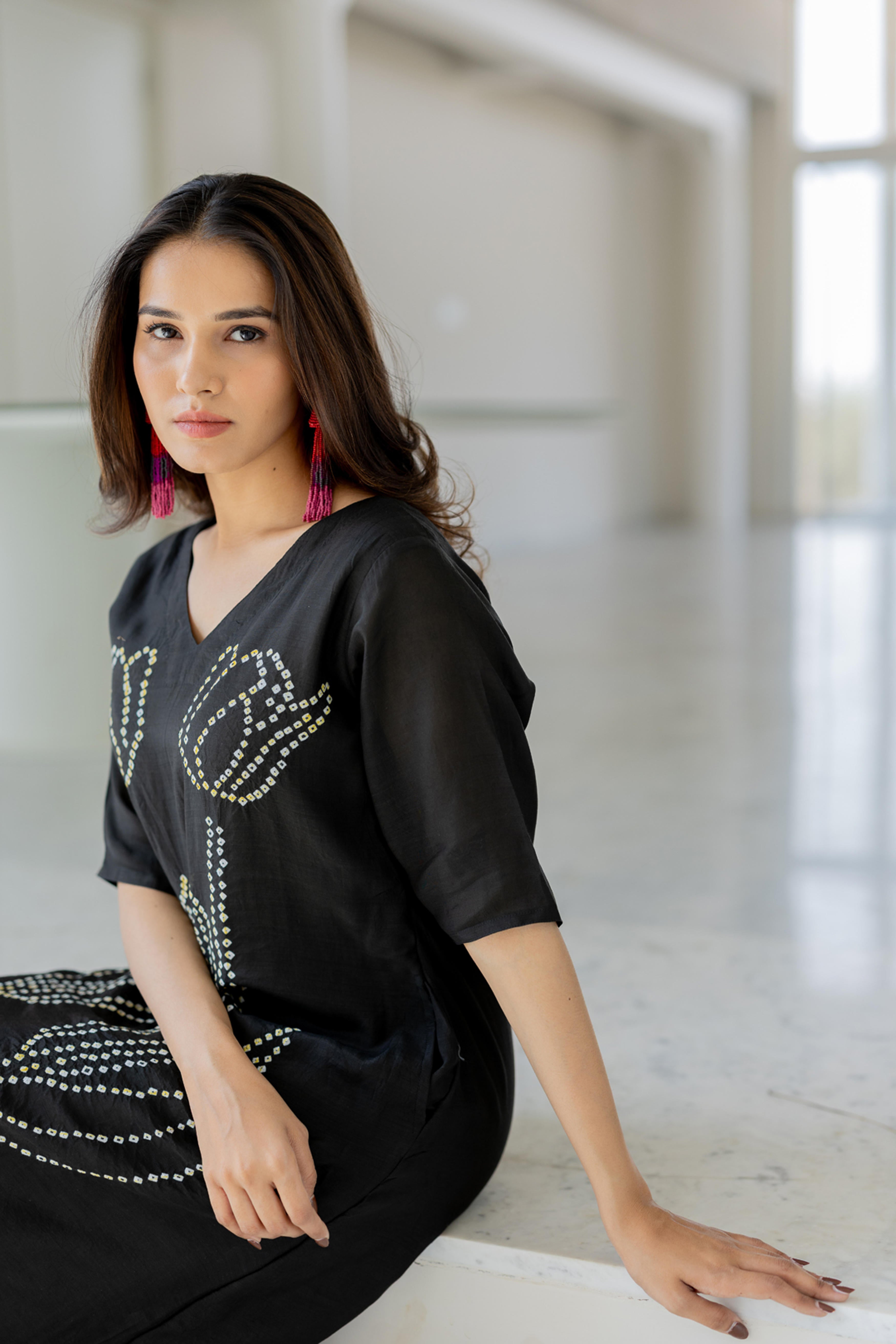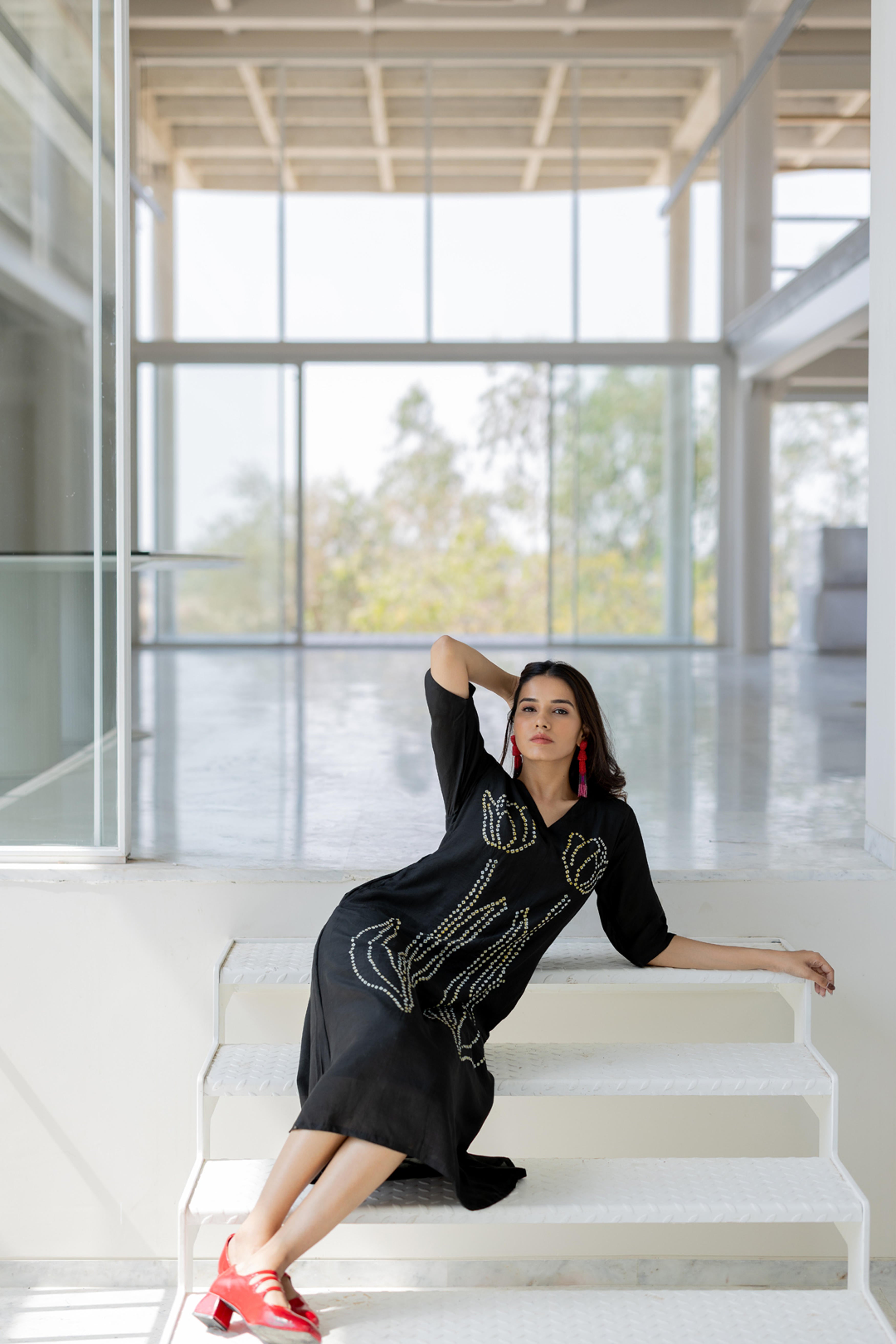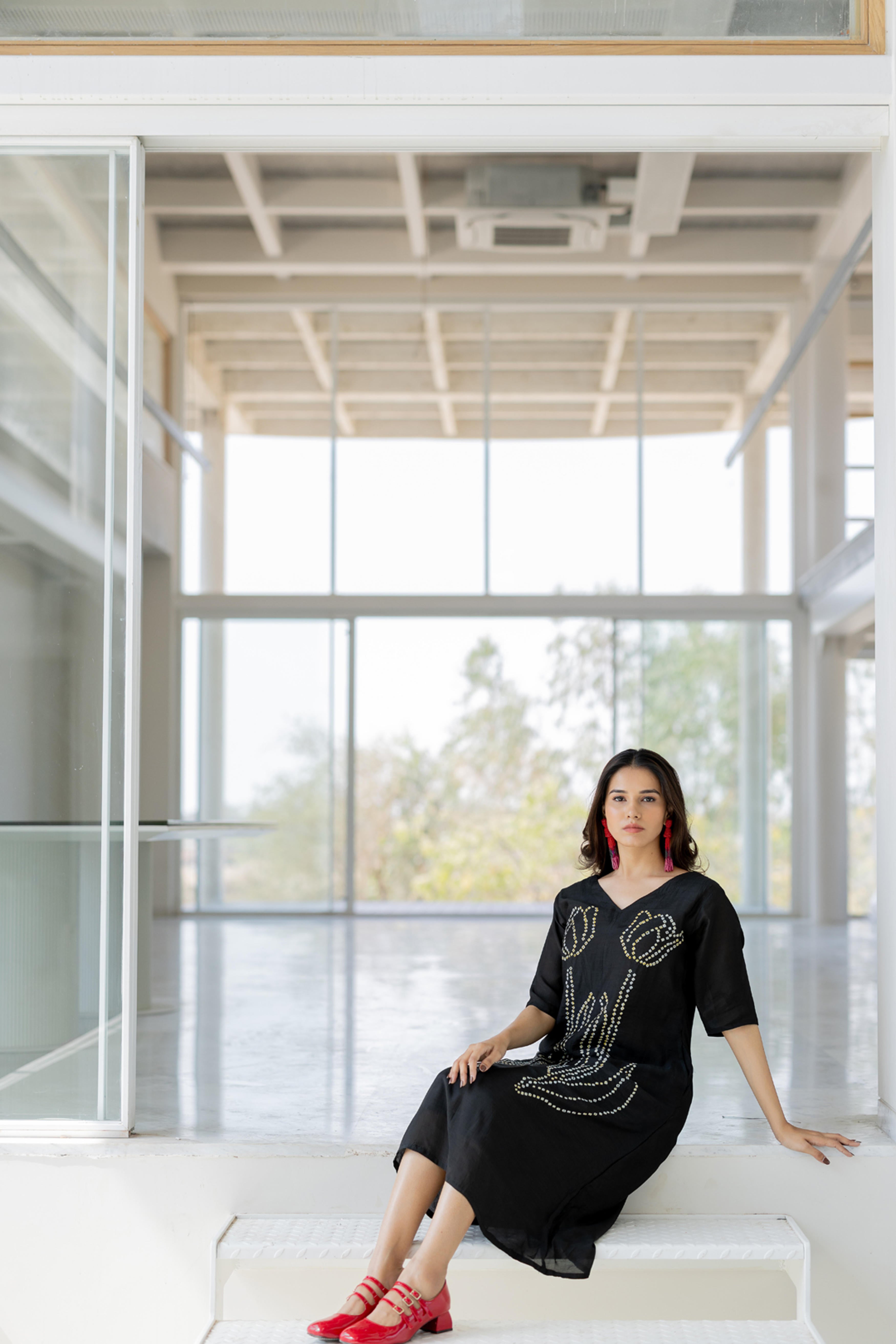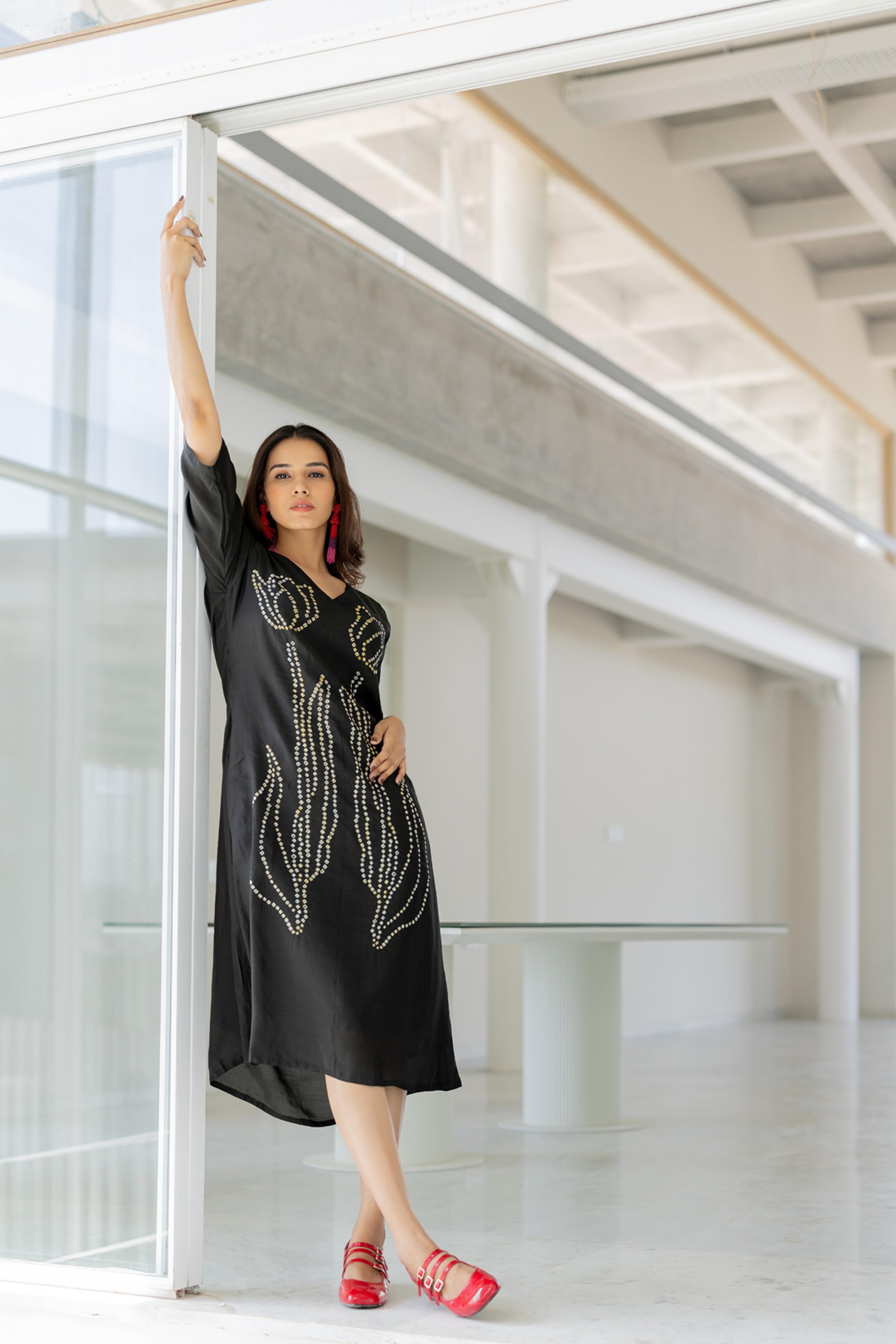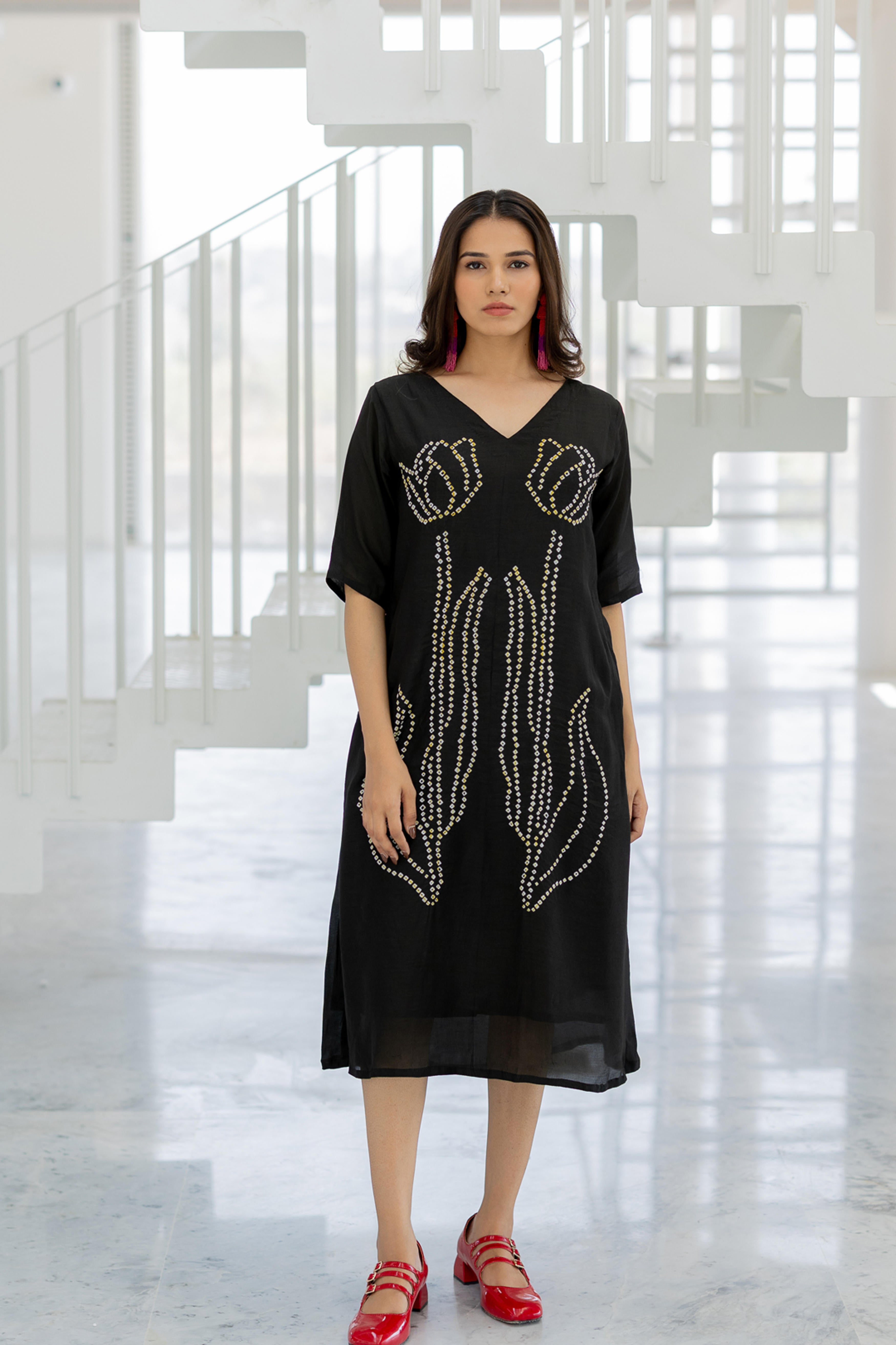 Embrace elegance with the Shadow Tulips Dress, a contemporary fusion of fluidity and intricate artistry. This black midi-length dress features a striking bandhani floral design, reminiscent of blooming tulips, crafted with delicate precision. The relaxed fit and breezy silhouette make it a versatile statement piece, perfect for effortless sophistication.