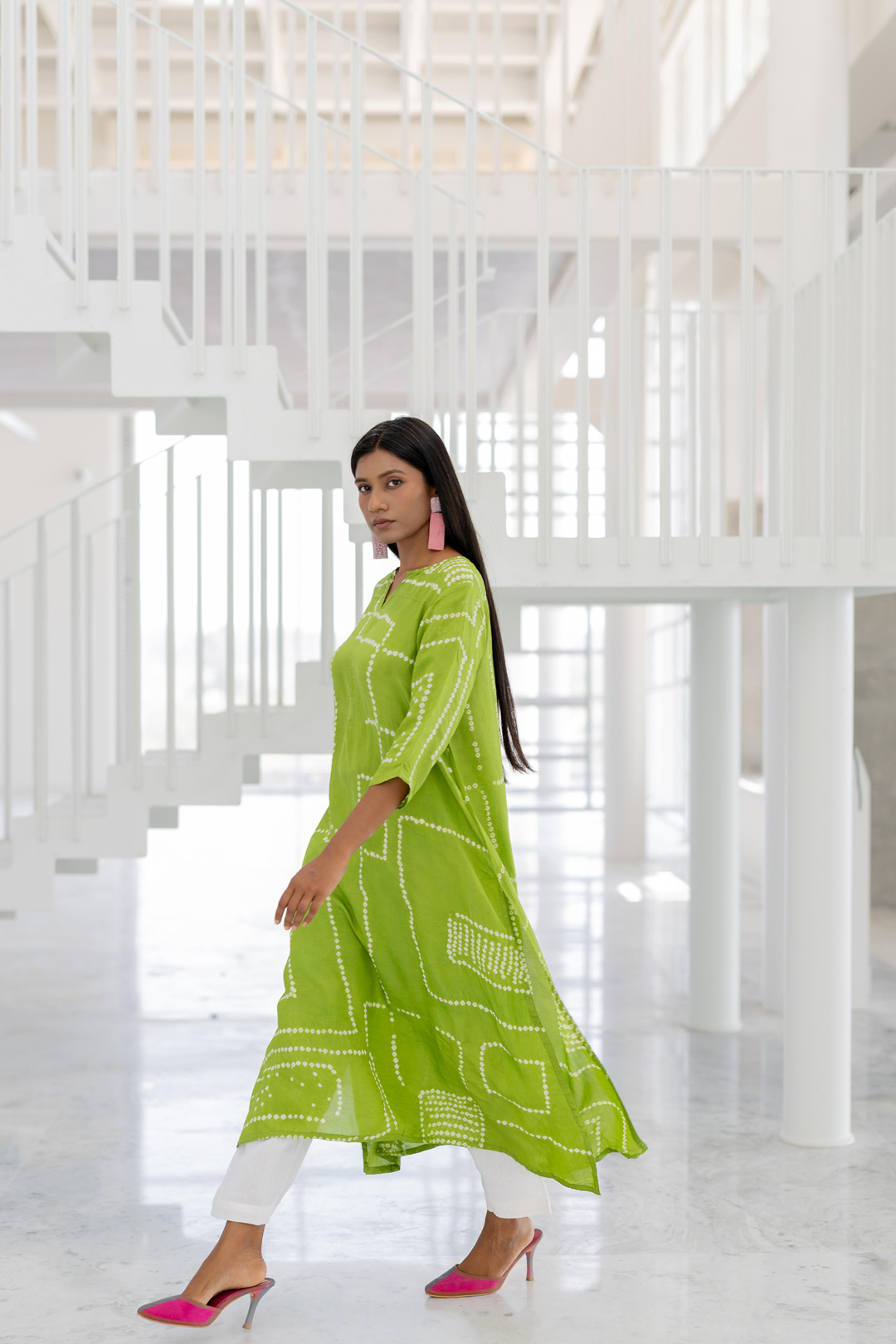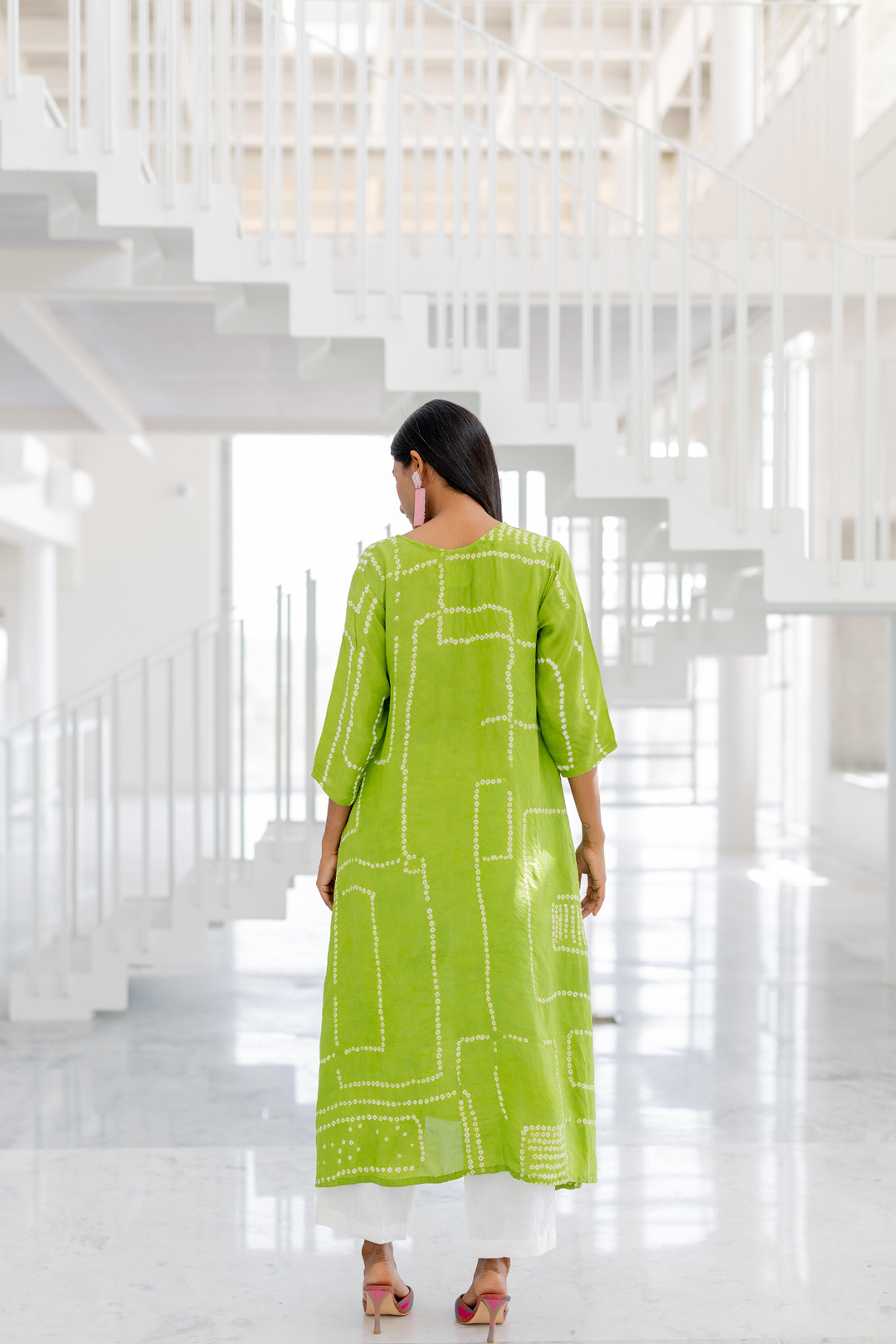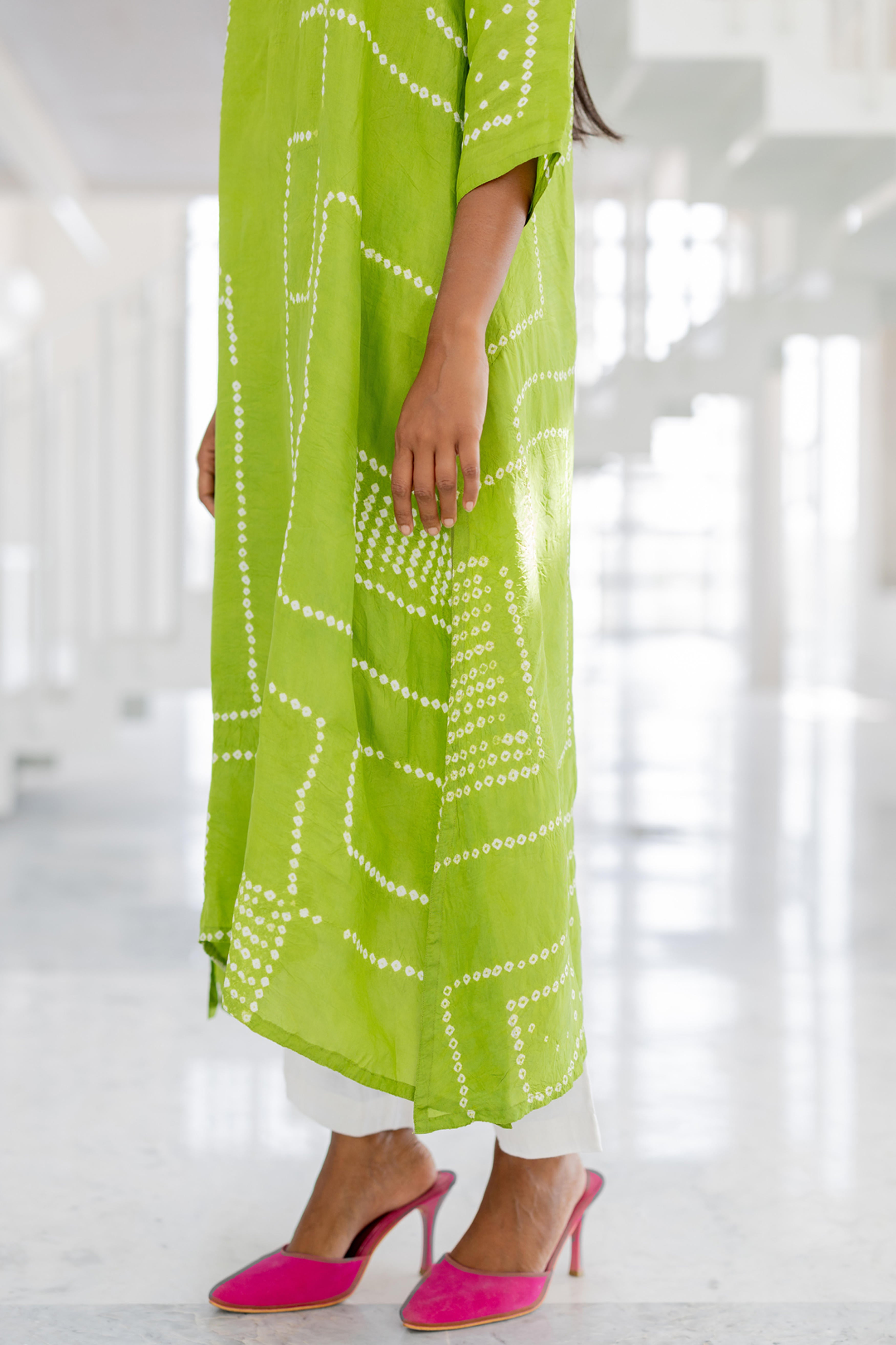 Step into effortless elegance with our Terra Green Bandhej Silk Kurta Set—a blend of comfort, style, and craftsmanship. This breezy kurta features a contemporary bandhani in a geometric pattern in fresh lime green, offering a modern yet artisanal touch. The relaxed silhouette ensures ease of movement, making it an ideal choice for casual outings or gatherings. Paired with white pants in pure linen fabric, this set can work for day time bruches as well as an evening out with family.