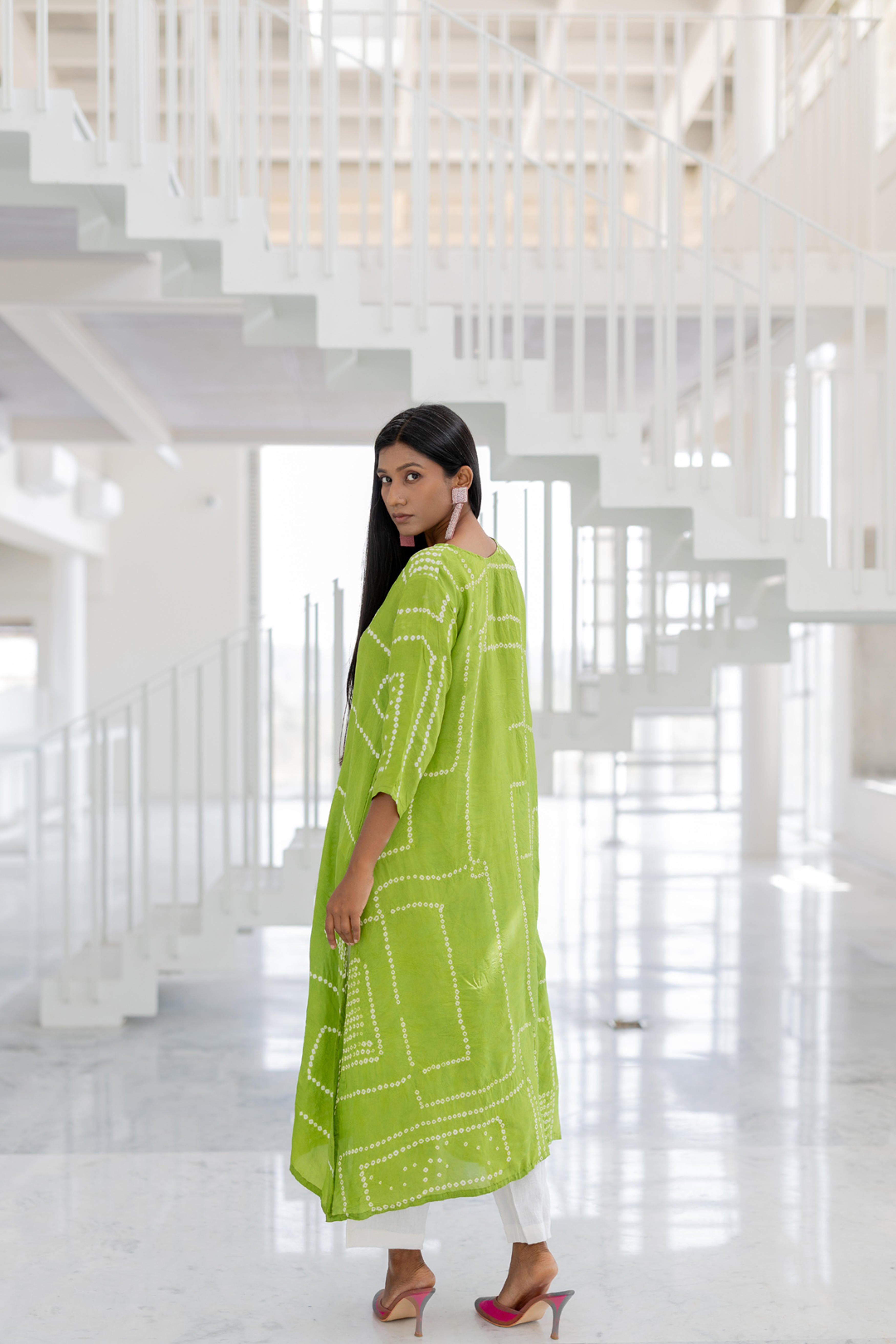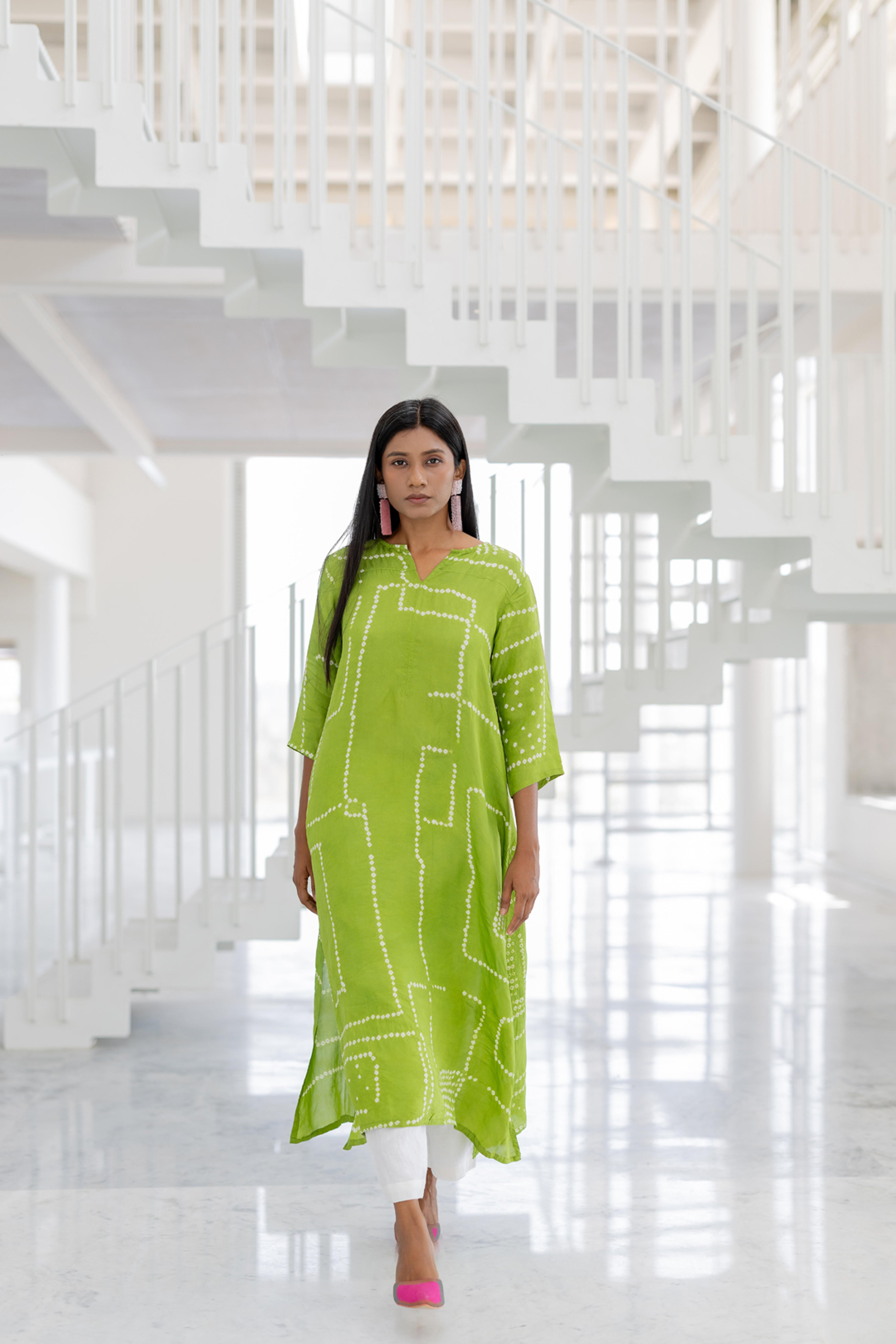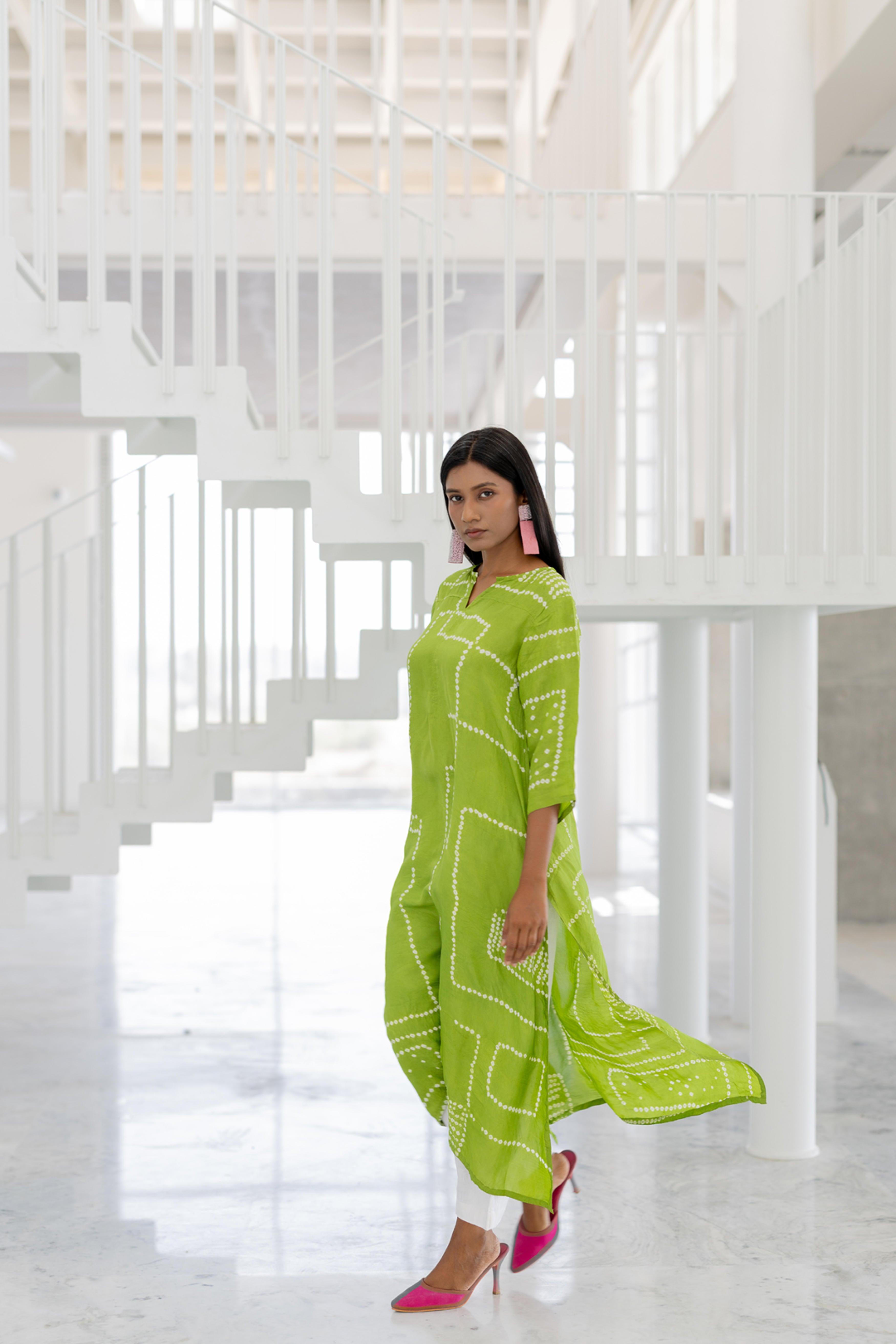 Step into effortless elegance with our Terra Green Bandhej Silk Kurta Set—a blend of comfort, style, and craftsmanship. This breezy kurta features a contemporary bandhani in a geometric pattern in fresh lime green, offering a modern yet artisanal touch. The relaxed silhouette ensures ease of movement, making it an ideal choice for casual outings or gatherings. Paired with white pants in pure linen fabric, this set can work for day time bruches as well as an evening out with family.