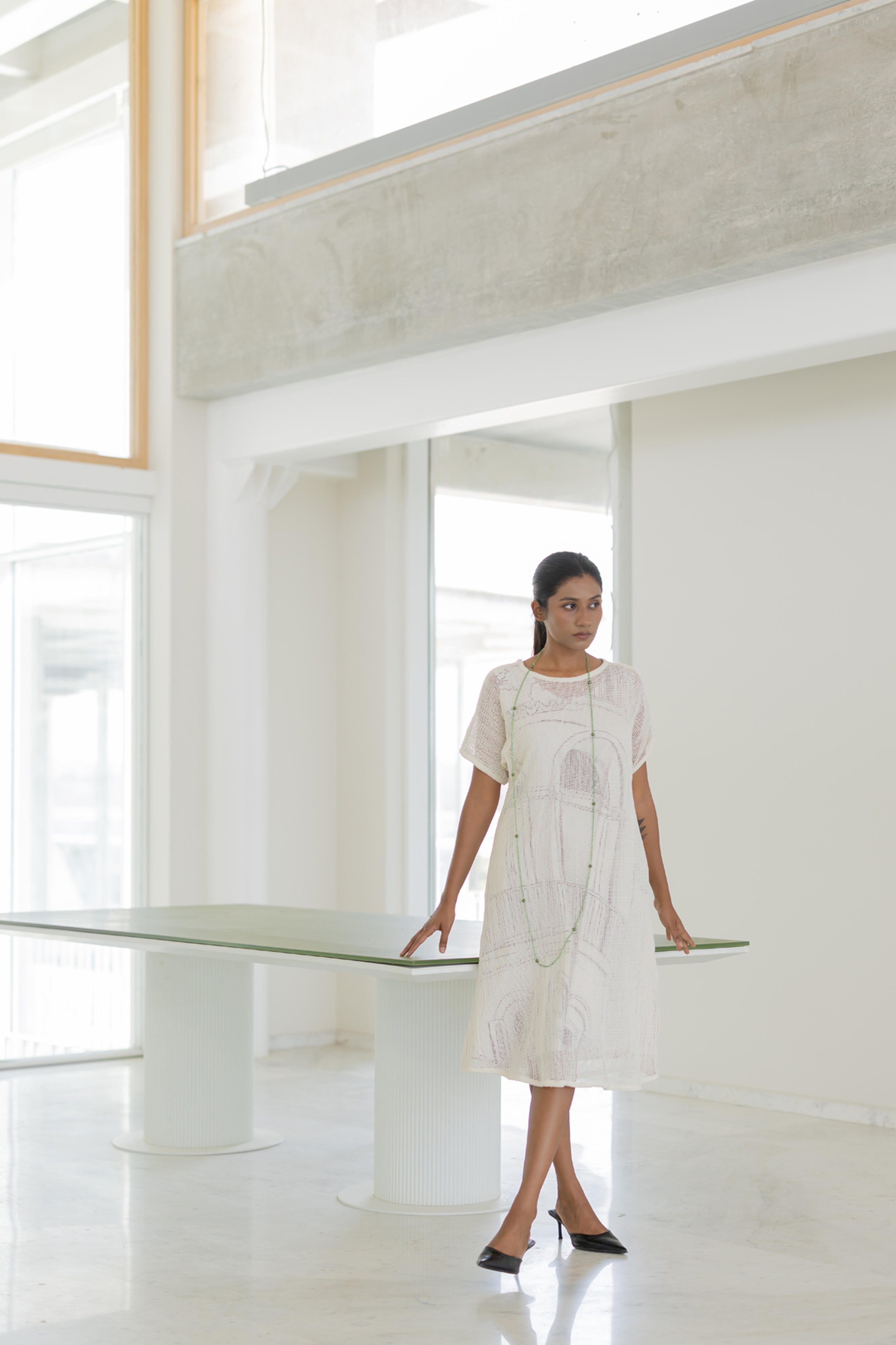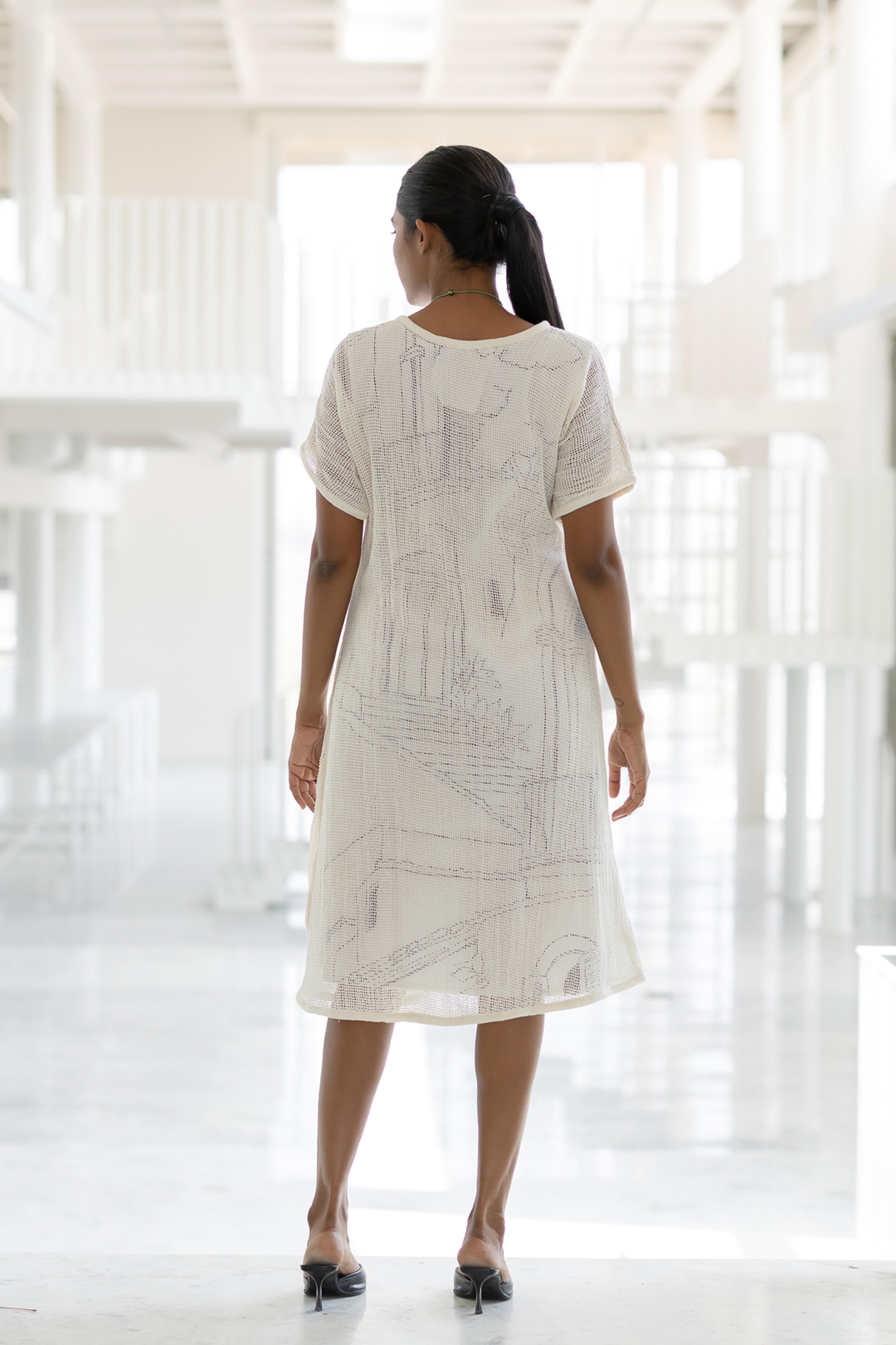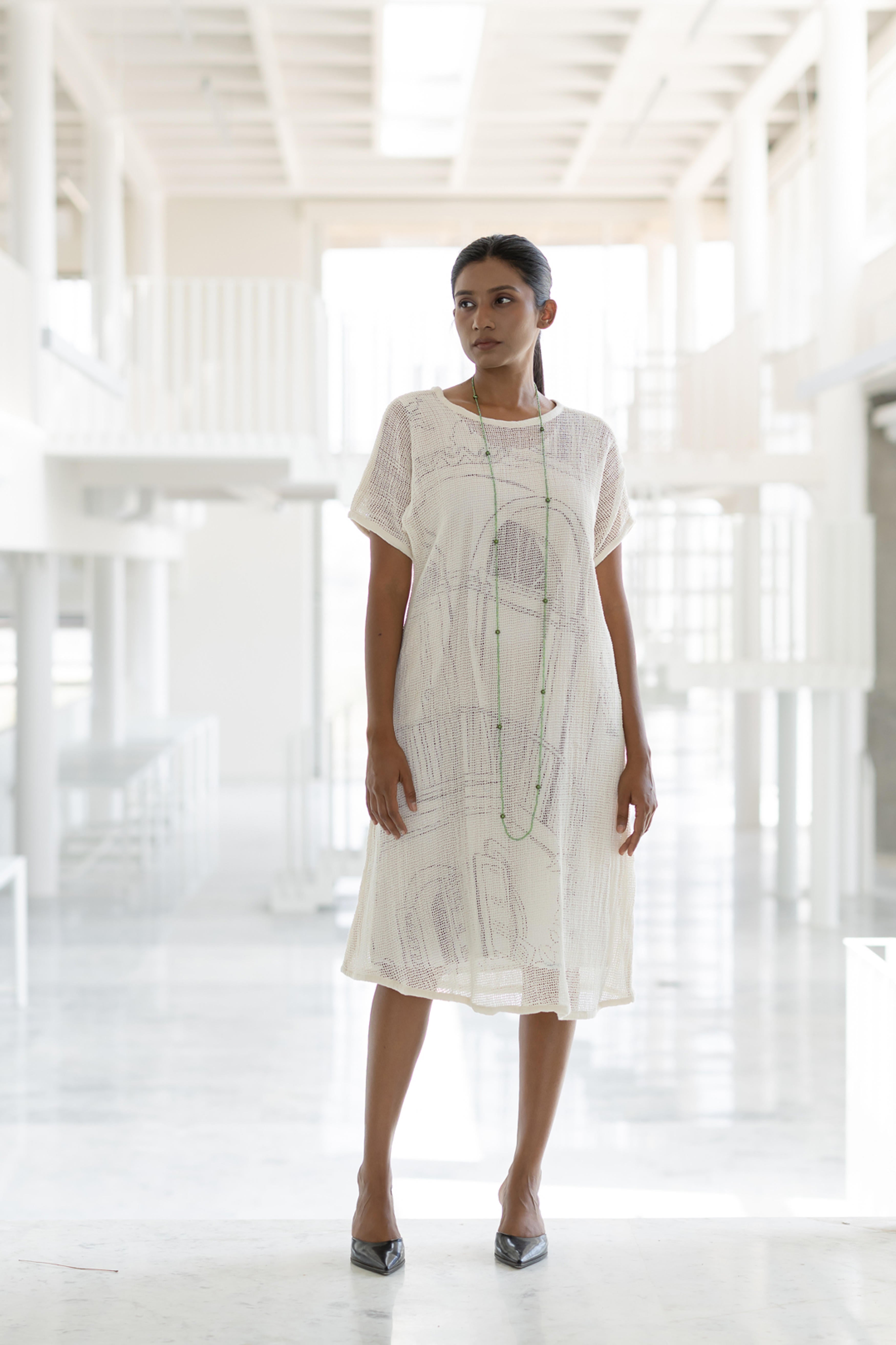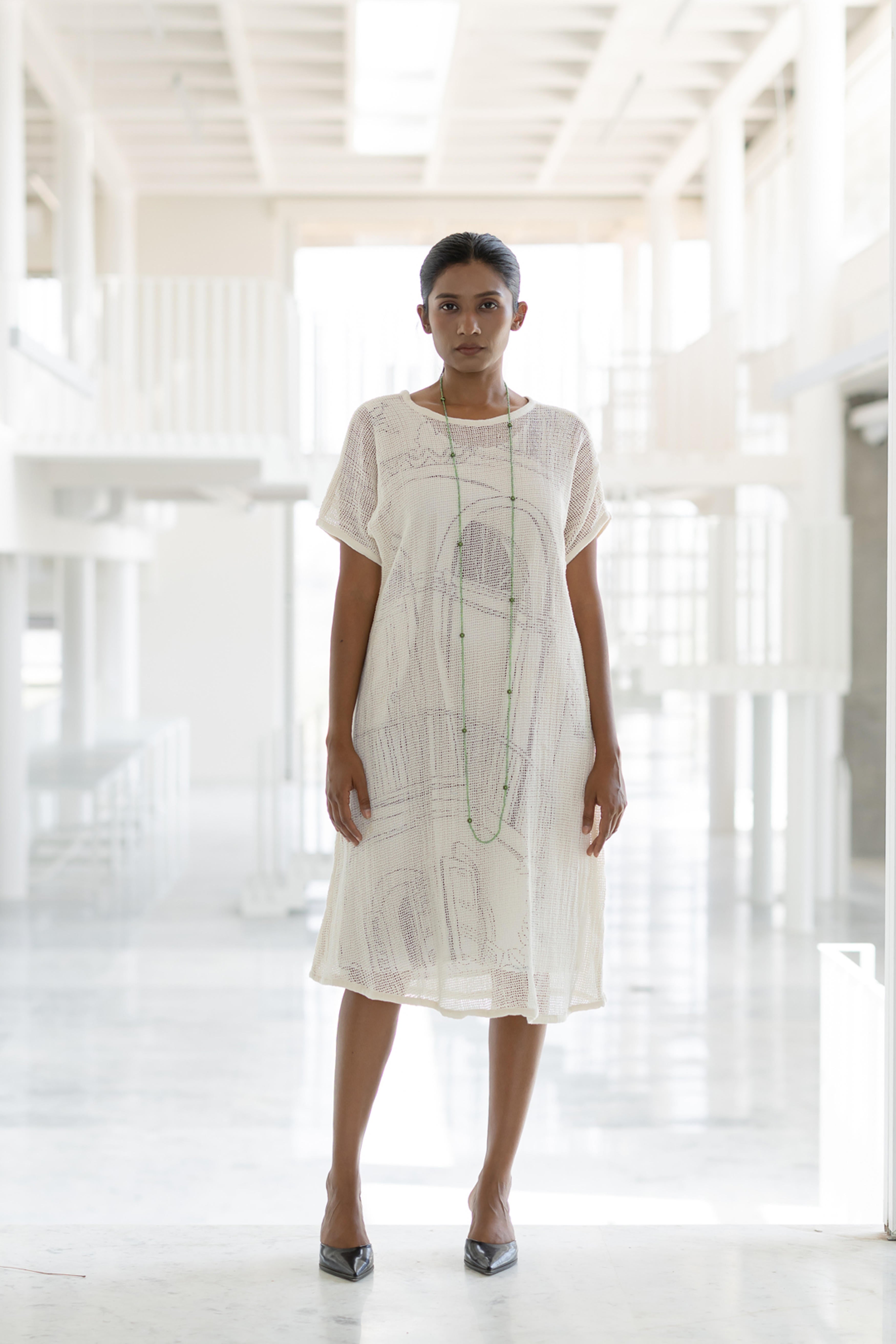 The Vanilla Mesh Dress with Vistas Slip is a statement piece that merges art and apparel. Designed in a lightweight mesh fabric, this dress features a semi-fiited silhouette, accentuated with a slip dress in an architectural print. The relaxed fit and airy texture make it a perfect choice for layering or wearing as a standalone piece for an effortlessly chic look.