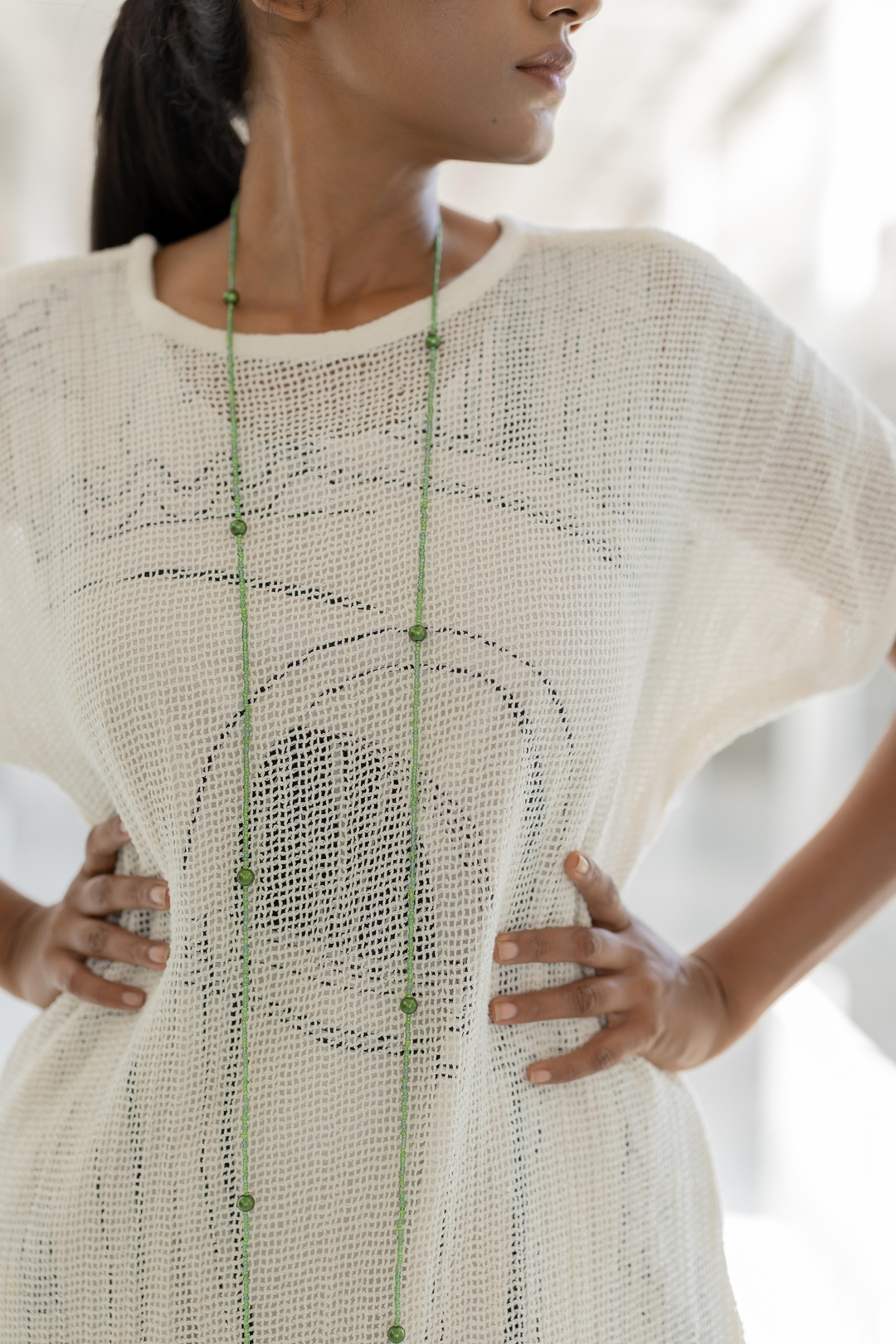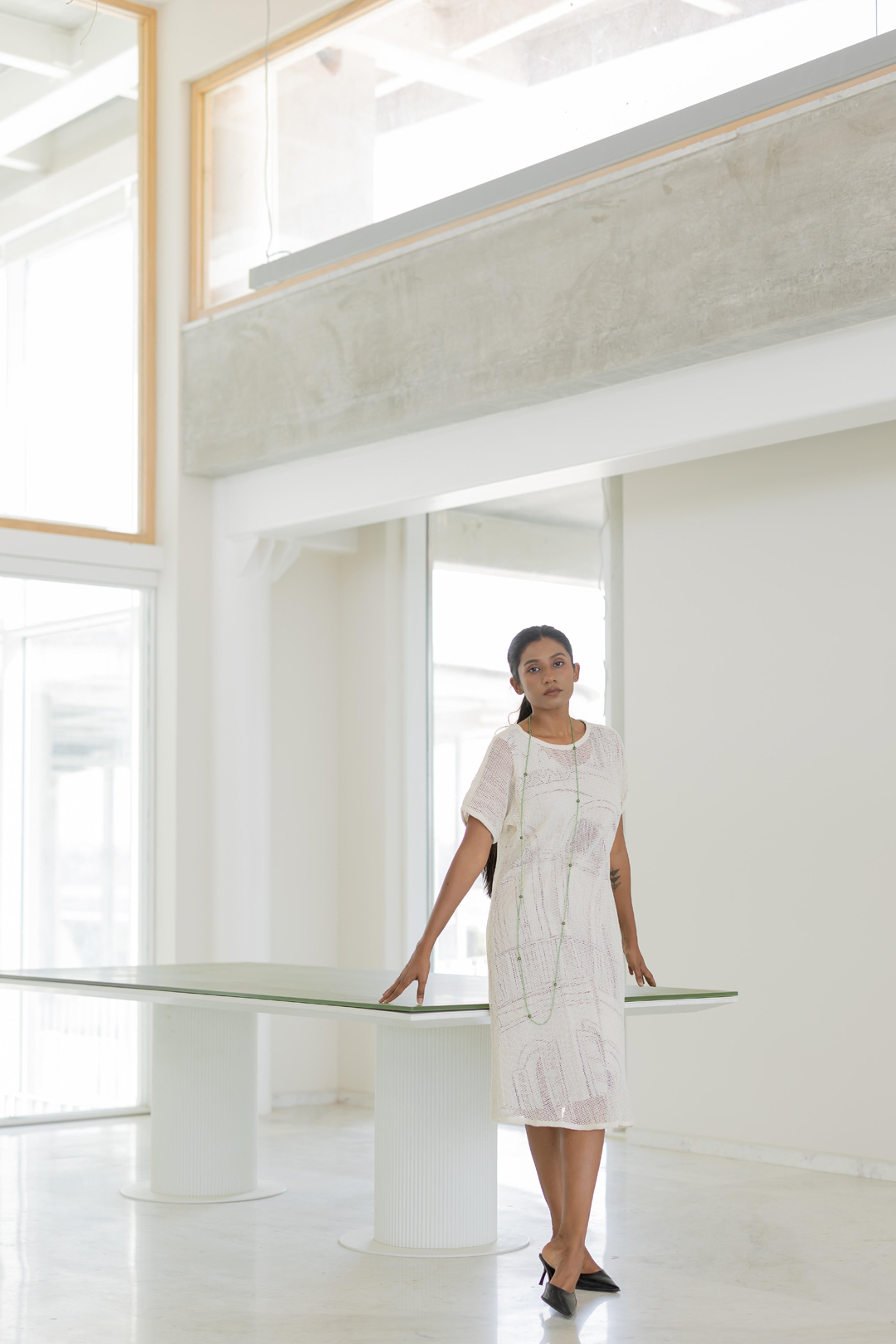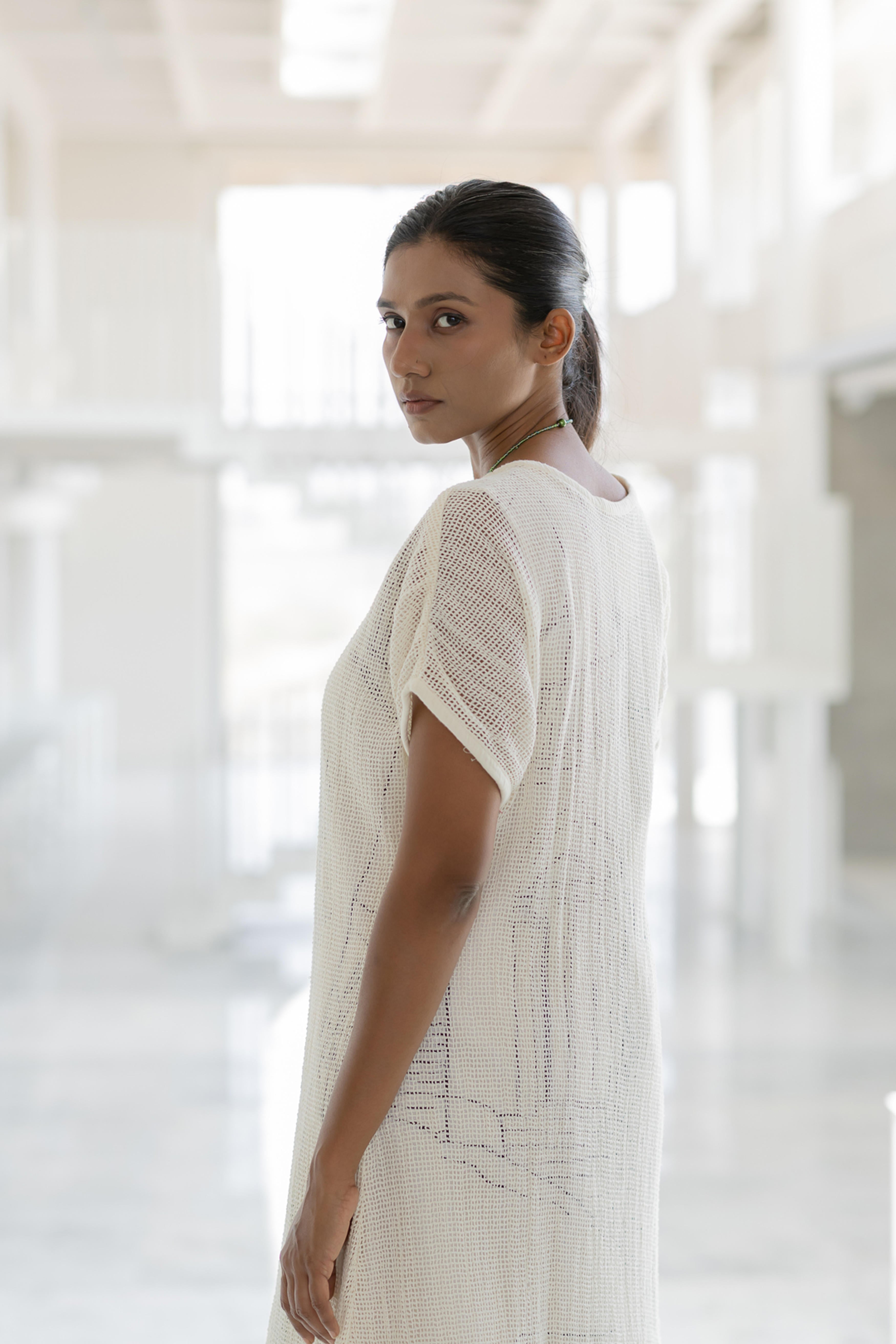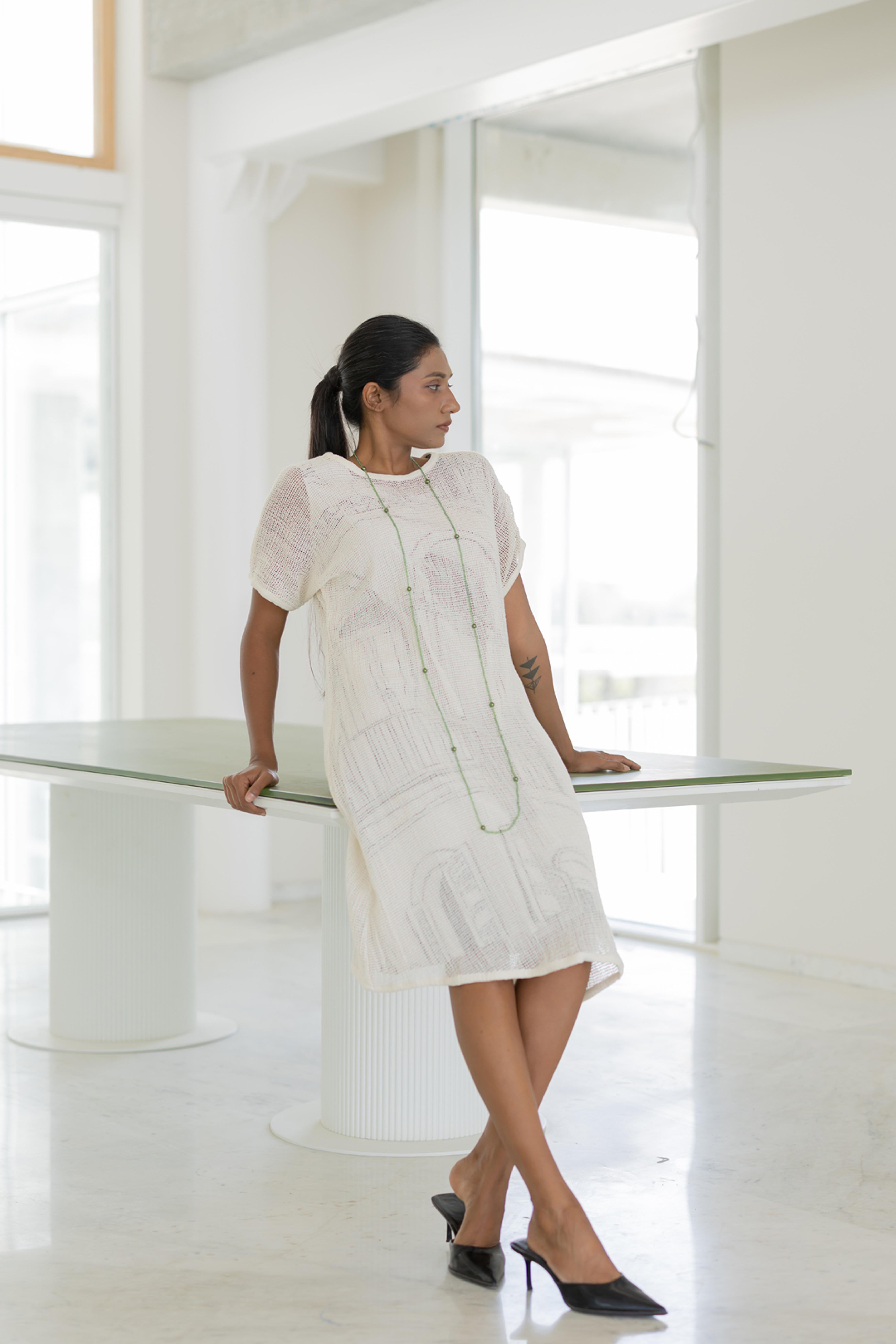 The Vanilla Mesh Dress with Vistas Slip is a statement piece that merges art and apparel. Designed in a lightweight mesh fabric, this dress features a semi-fiited silhouette, accentuated with a slip dress in an architectural print. The relaxed fit and airy texture make it a perfect choice for layering or wearing as a standalone piece for an effortlessly chic look.