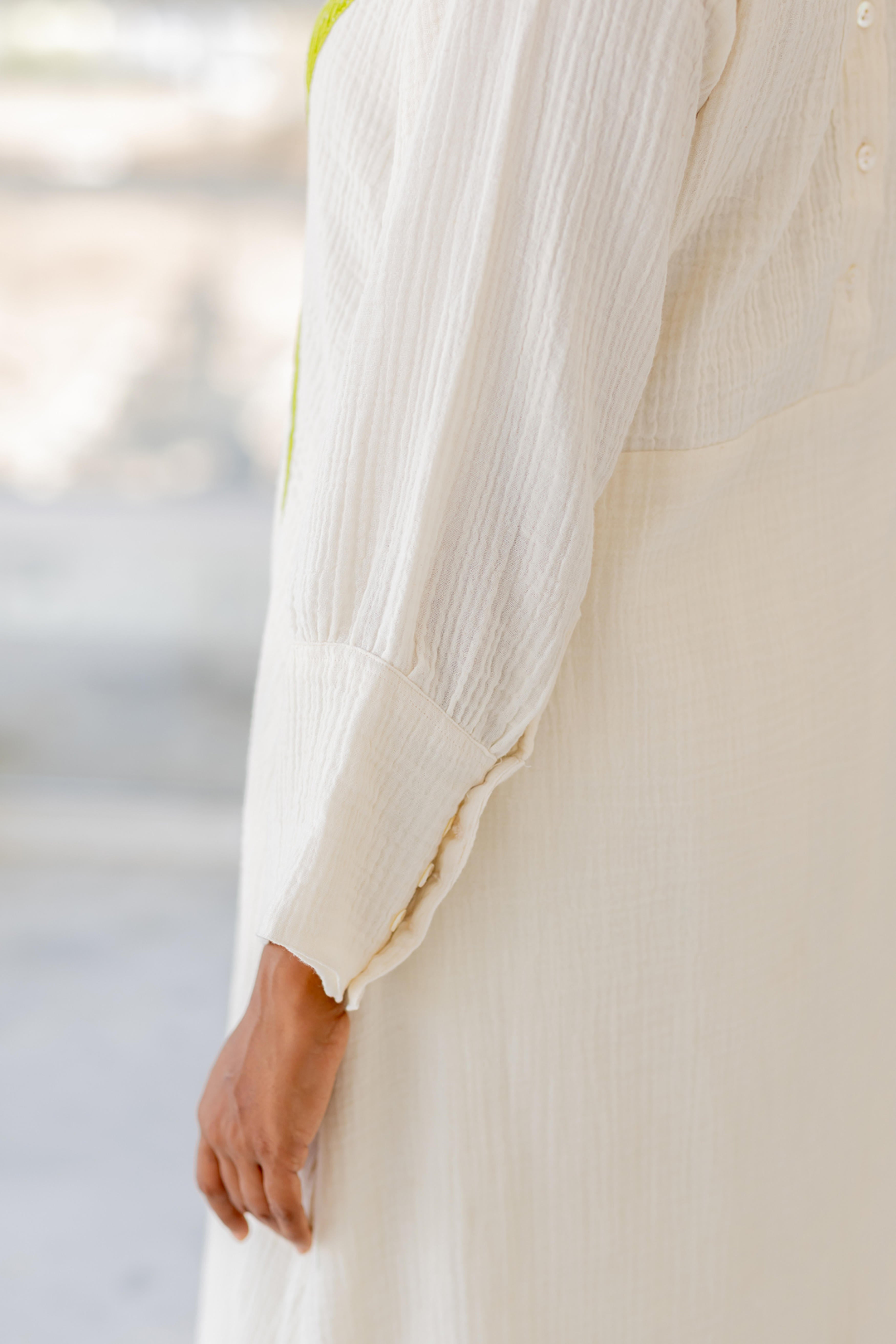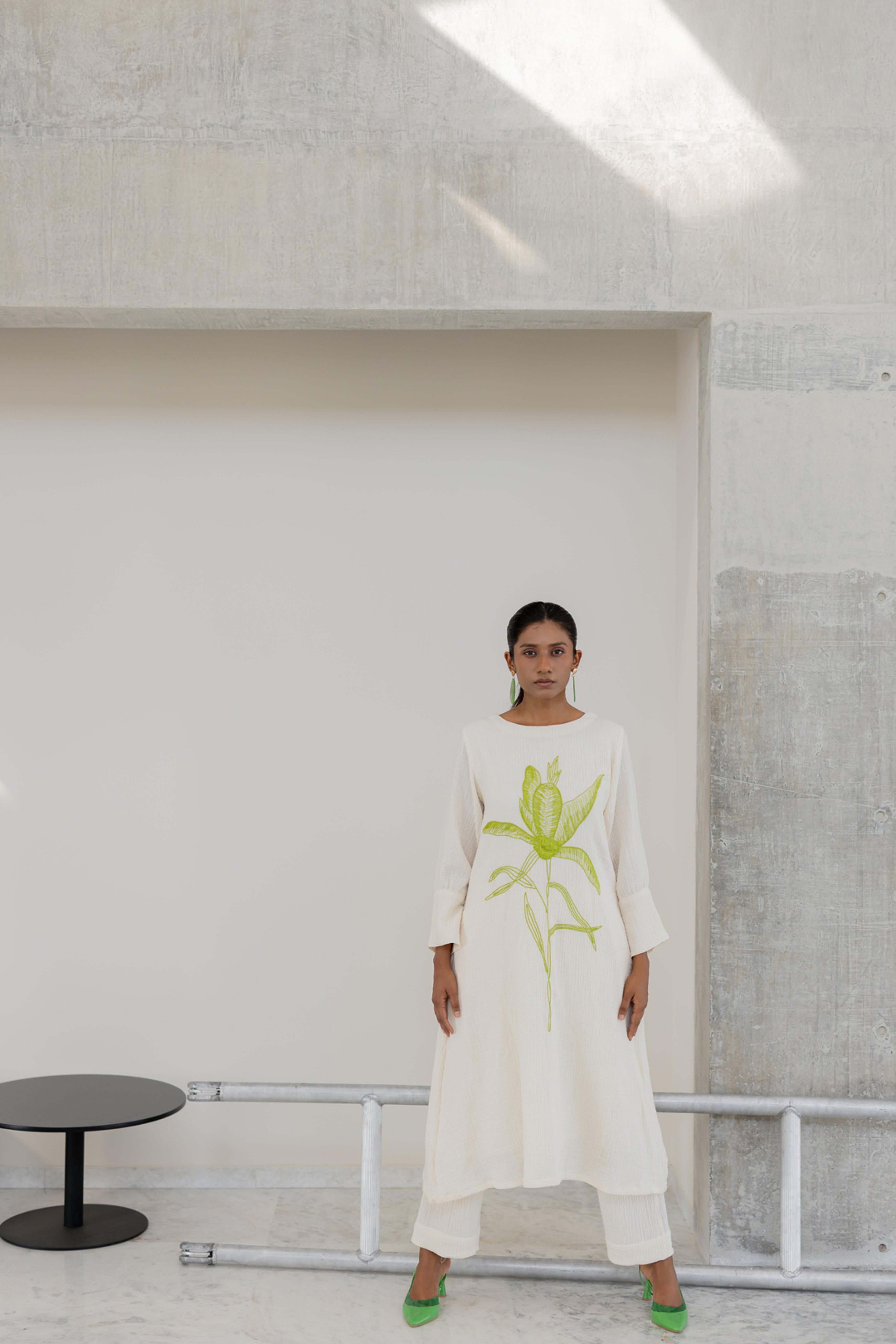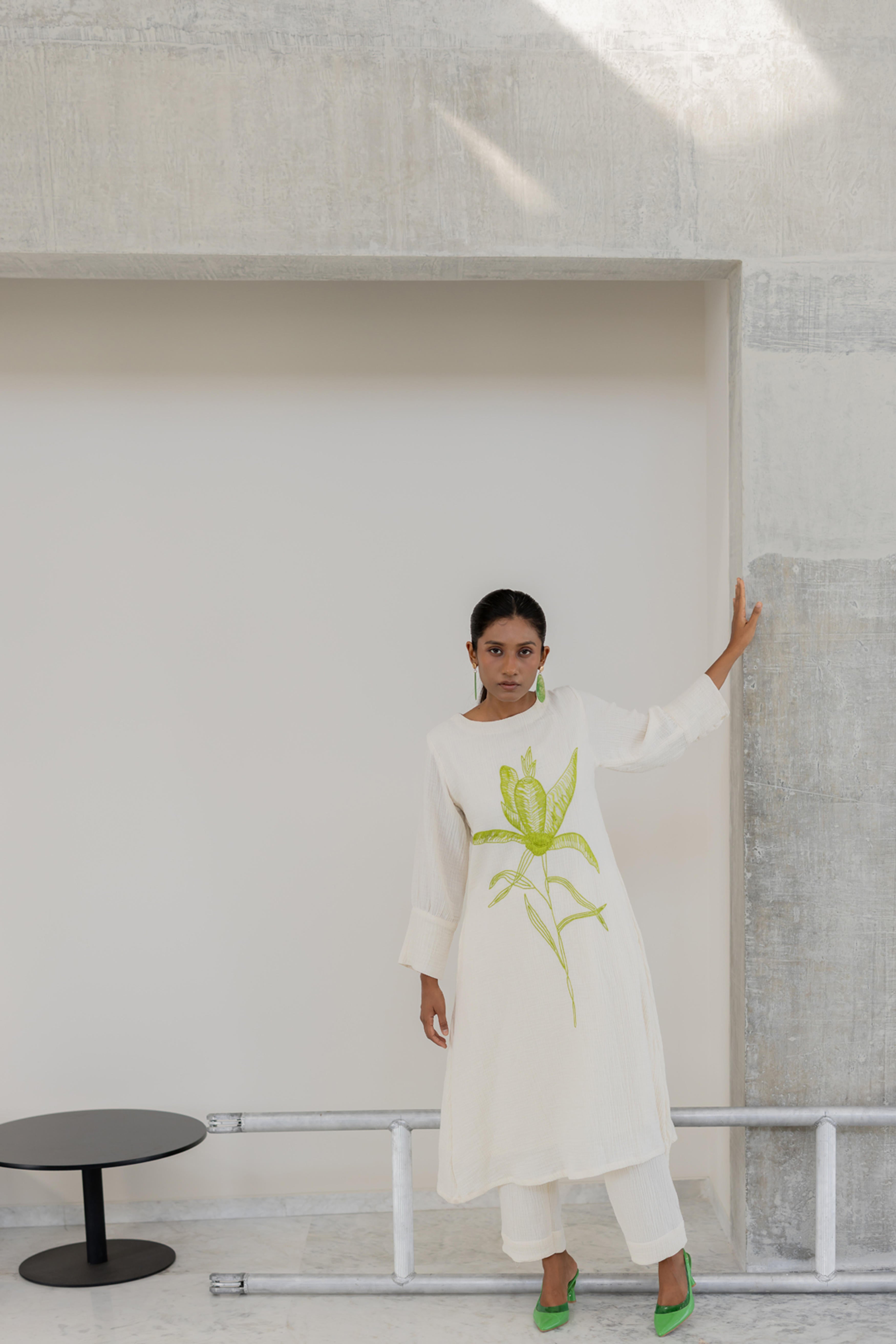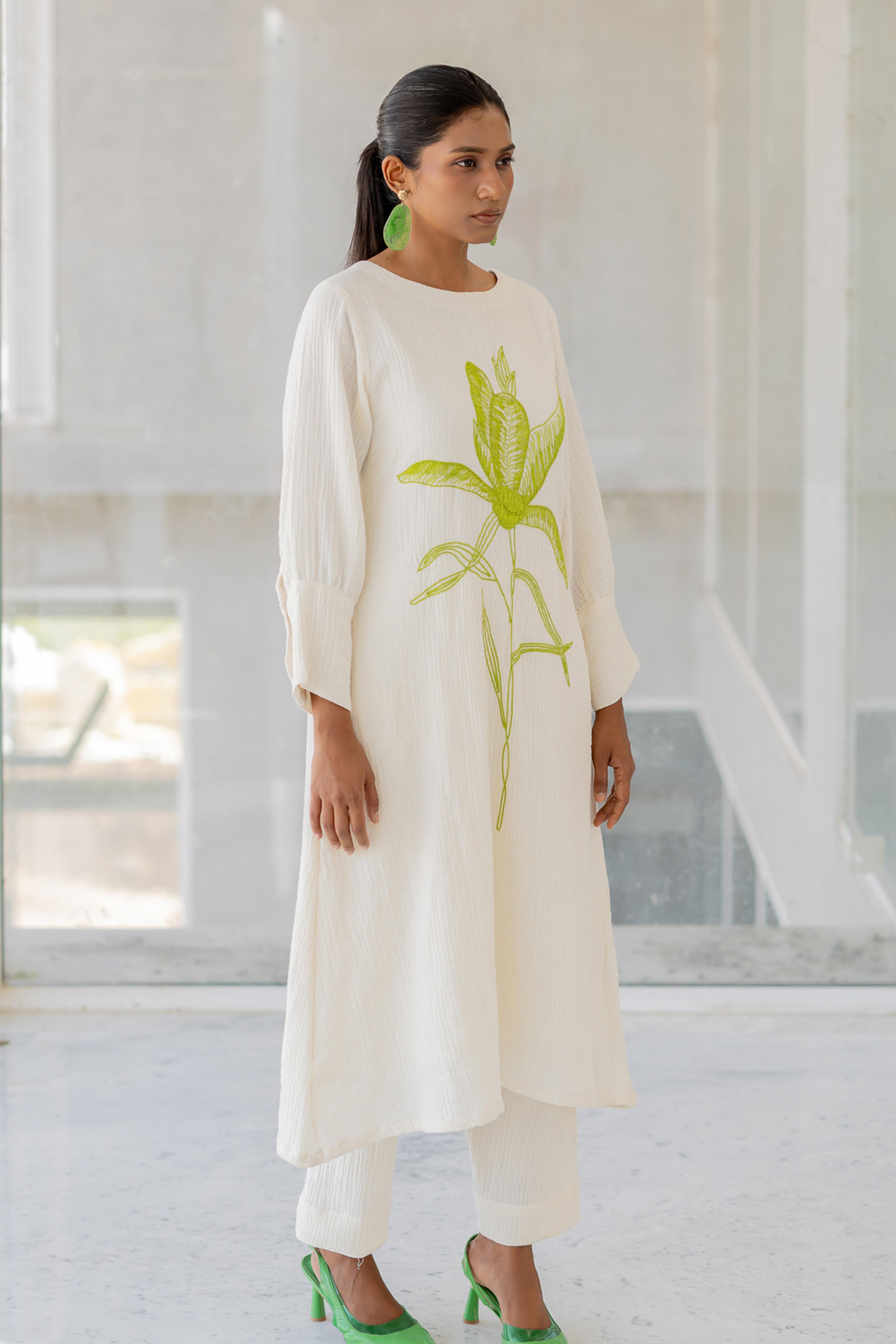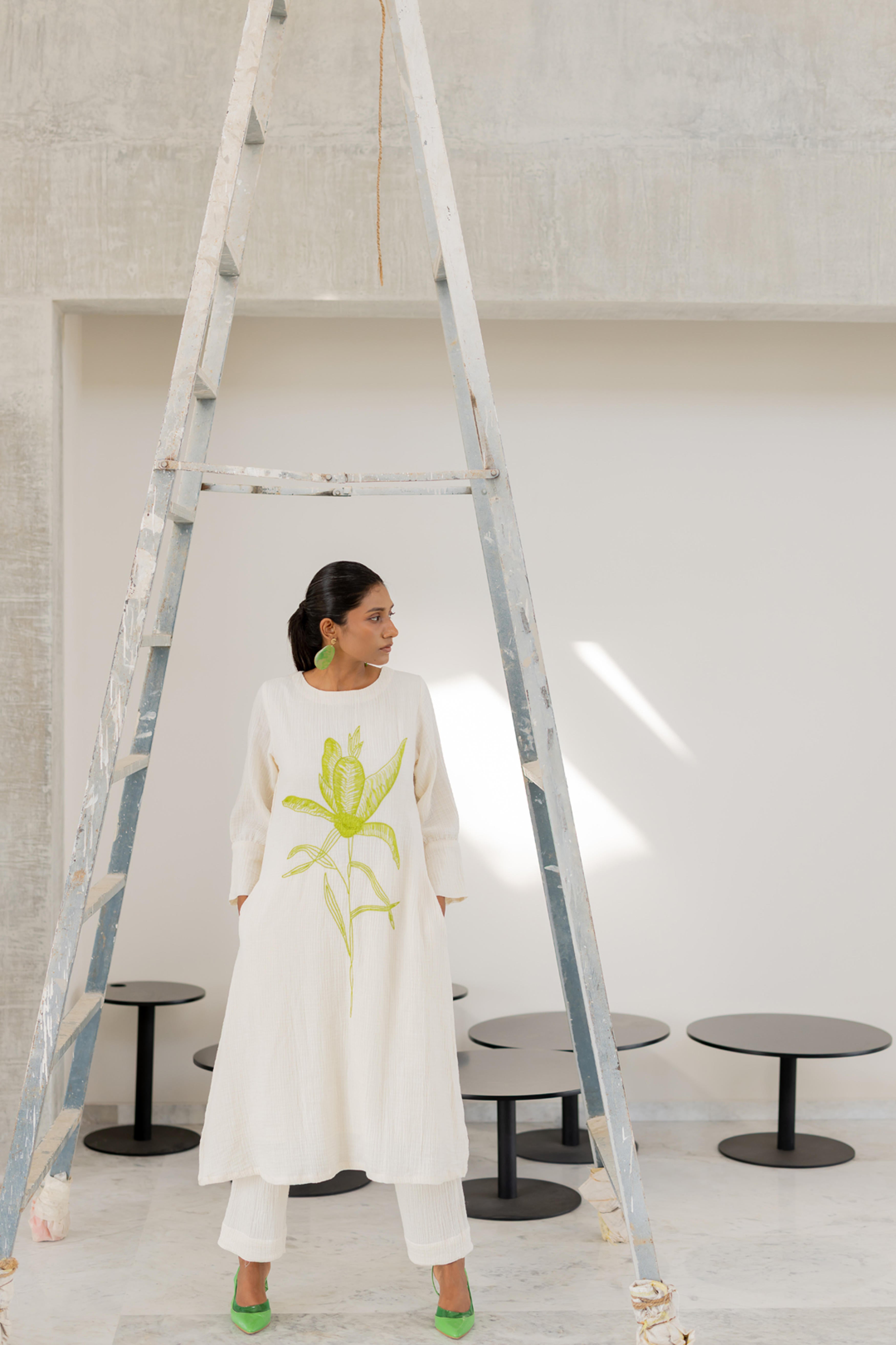Elevate your wardrobe with the Vanilla Mist Embroidered Kurta Set, a timeless blend of minimalism and elegance. Crafted from soft, breathable cotton double-cloth, this off-white kurta exudes effortless grace with its flowy silhouette and delicate green botanical embroidery at the front, inspired by nature’s tranquility. The round neckline and full sleeves add a touch of understated sophistication, while the paired straight-fit cotton pants ensure comfort and versatility. The lightweight texture makes it an ideal choice for casual outings, festive brunches, or summer evenings.