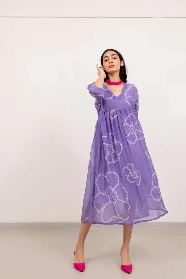 Elevate your boho-chic style with the light purple chanderi dress. This relaxed, flowy dress features a traditional hand-dyed bandhani technique in a soft purple, creating a subtle yet striking effect. The dress is designed with a flattering V-neckline and short, wide sleeves, ensuring both comfort and elegance. The empire waistline gives way to a voluminous midi-length skirt that moves beautifully with every step. Perfect for casual daytime outings or a laid-back evening with friends, this dress combines effortless style with an artistic touch Dress length - 48"Inner length - 38"