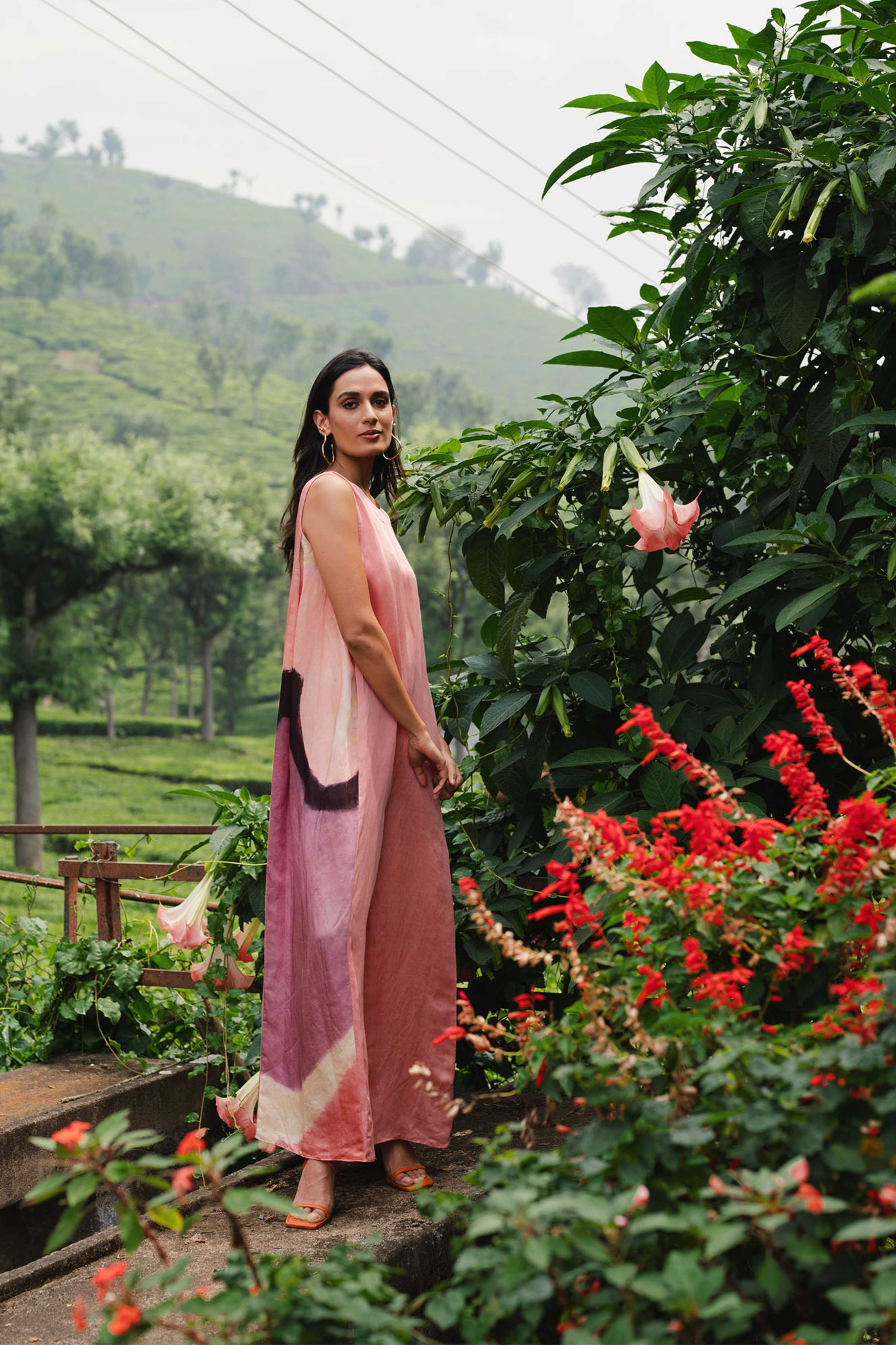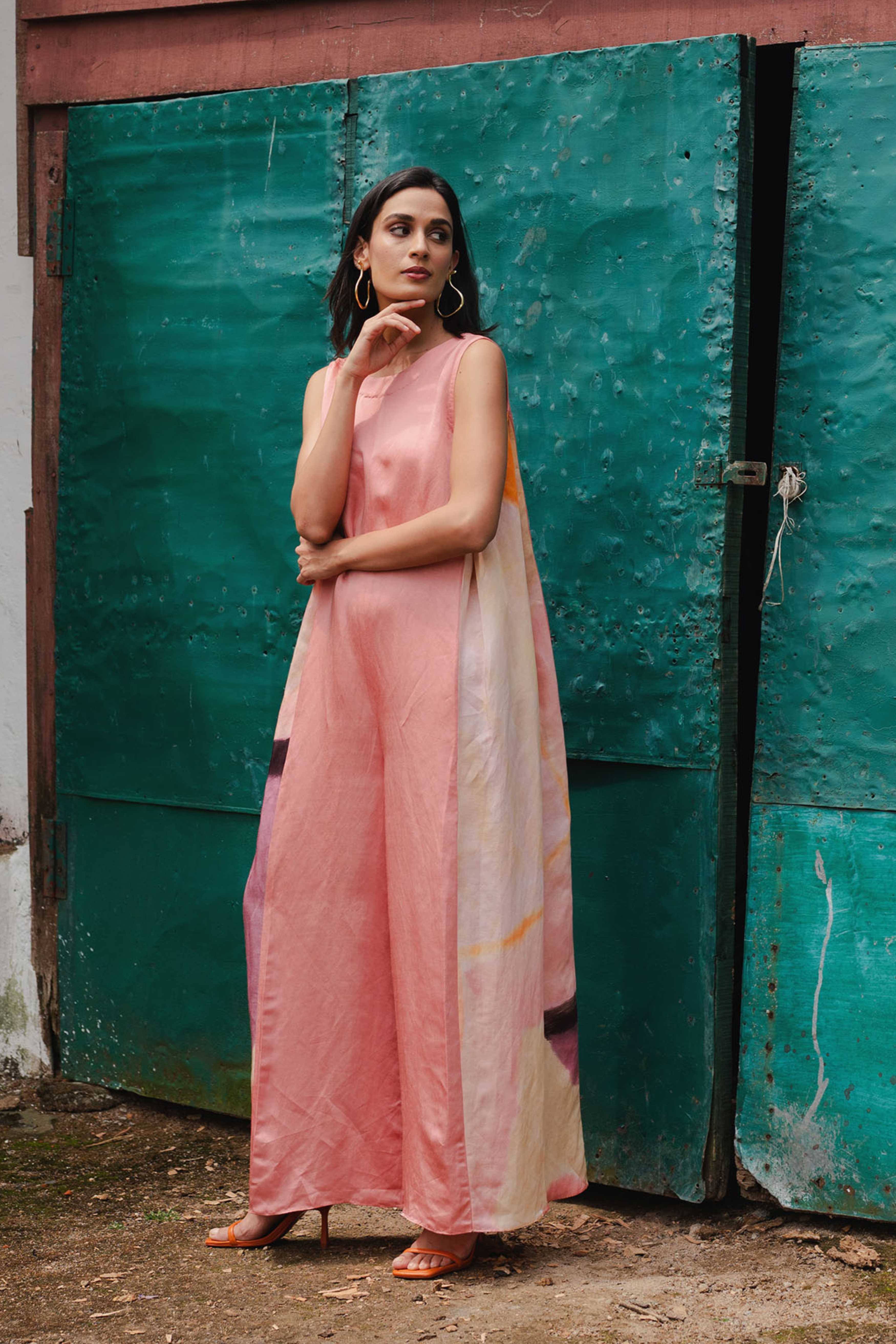 A playful take on the classic jumpsuit. Designed with a V-neckline and relaxed fit, it features printed side panels and a bold, colorful front panel that adds character. Made in breathable viscose linen satin for all-day comfort and easy wear.
