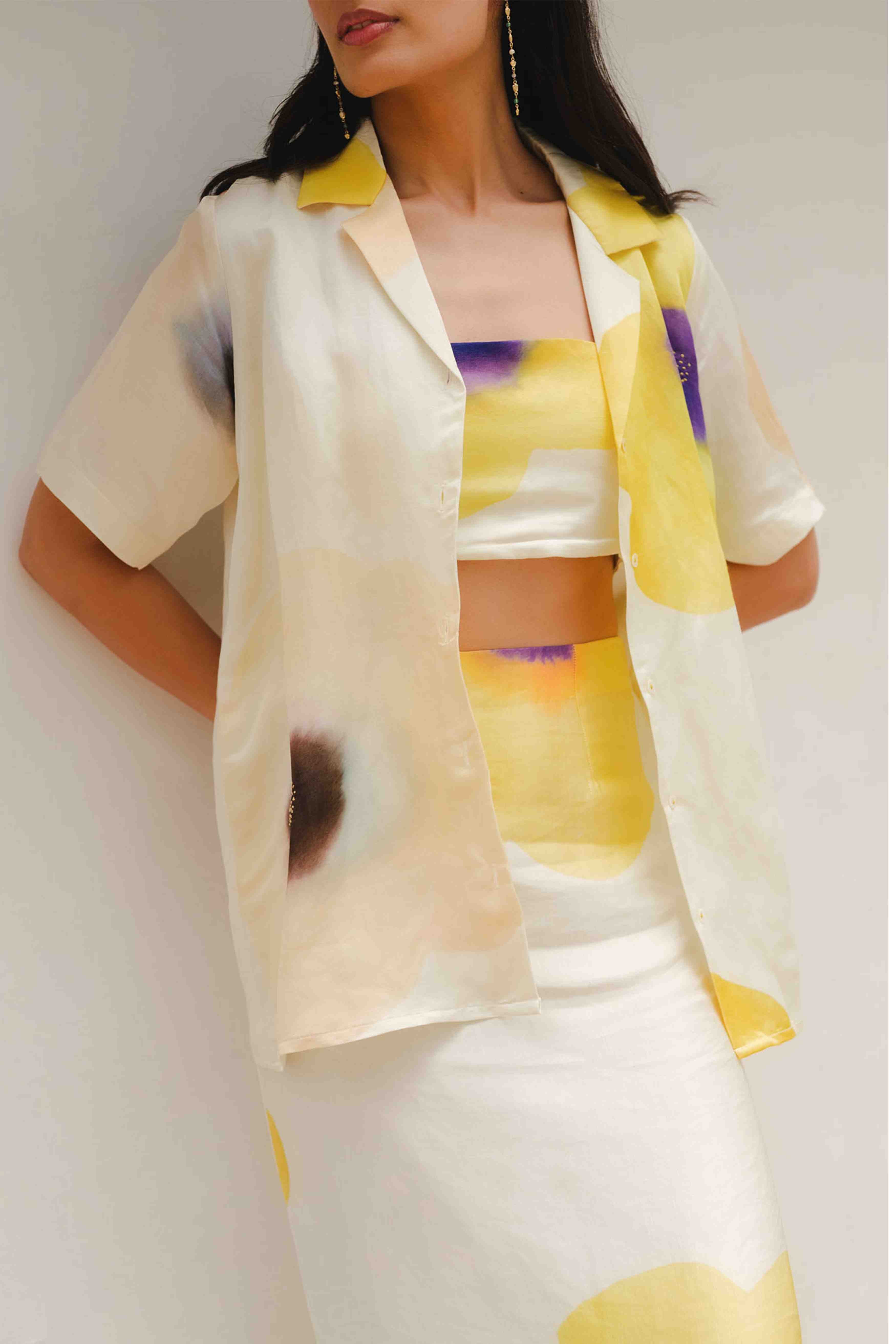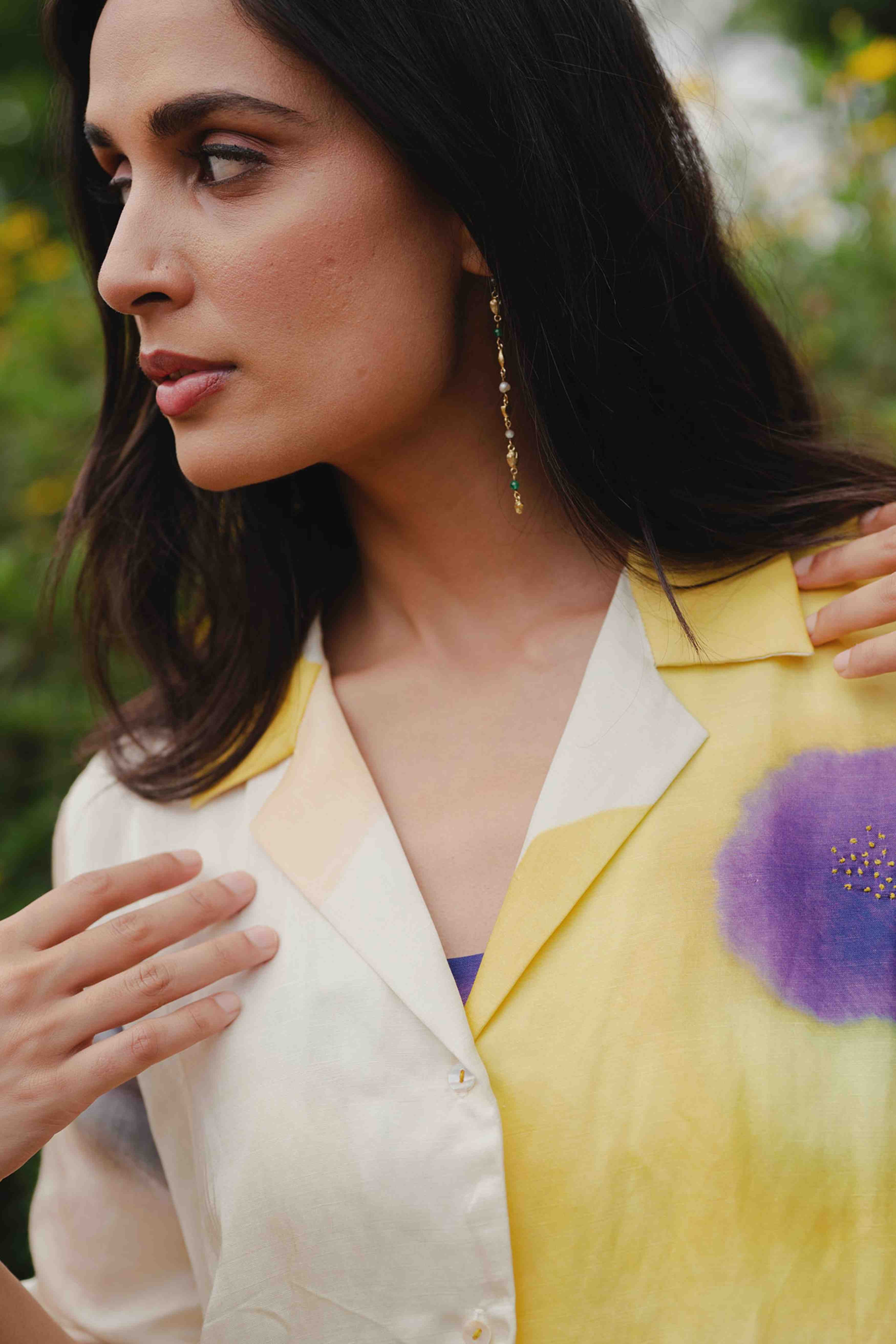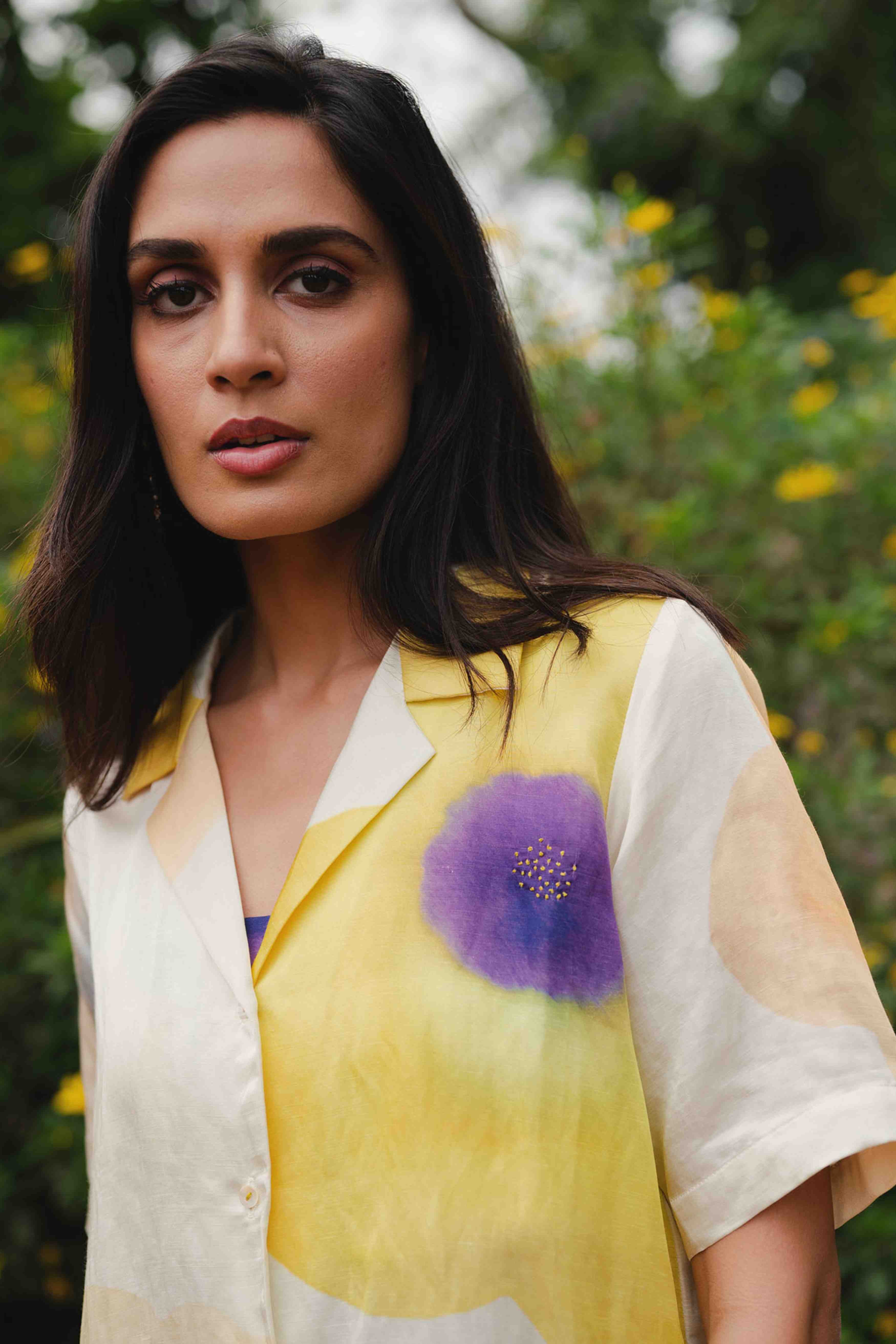 An open, relaxed-fit shirt featuring a bold, oversized floral print. Designed with a laid-back collar, delicate button details, and intricate French knot embroidery accenting the florals, it layers effortlessly over co-ords or separates. Crafted from a breathable linen-viscose blend for all-day comfort and ease.