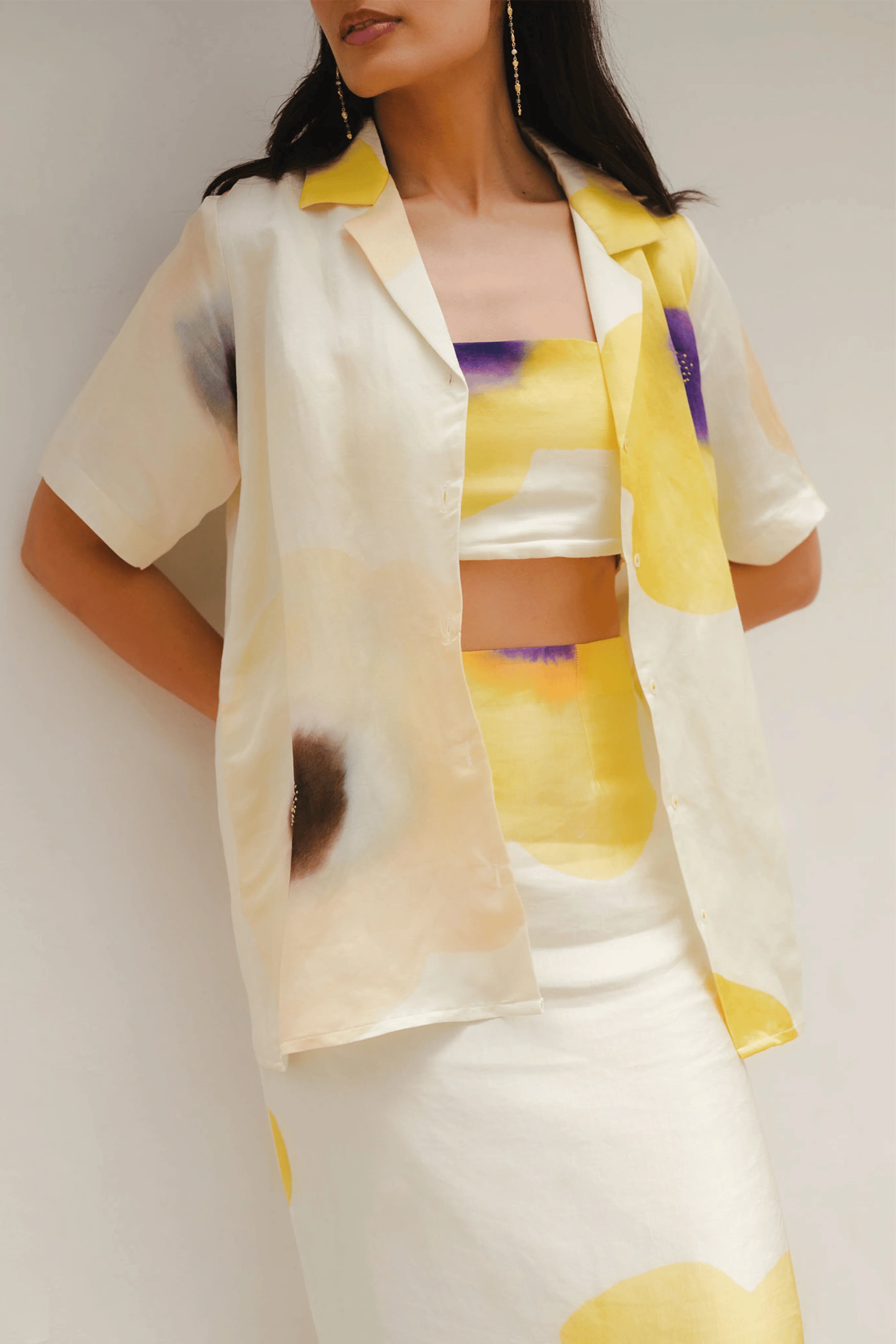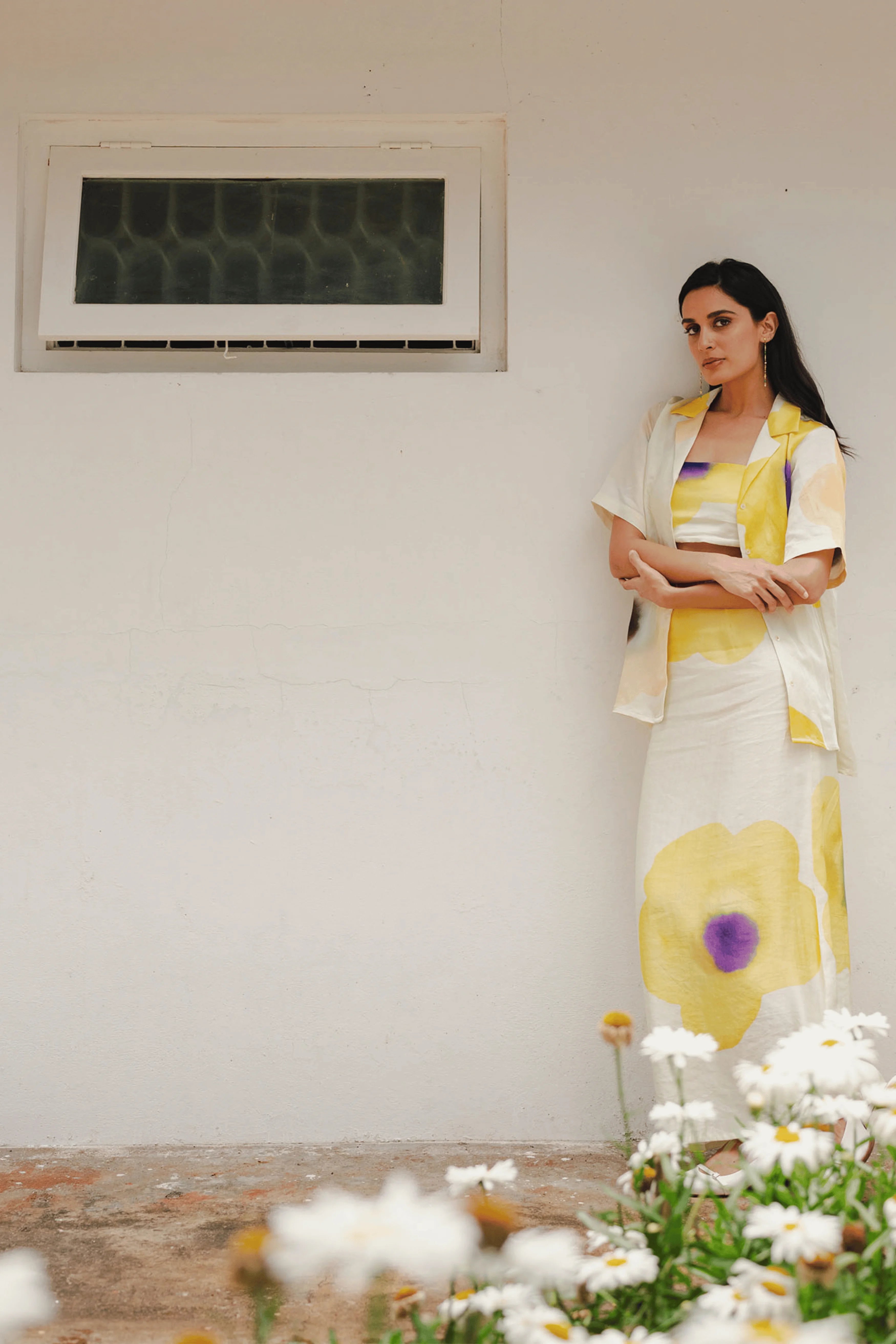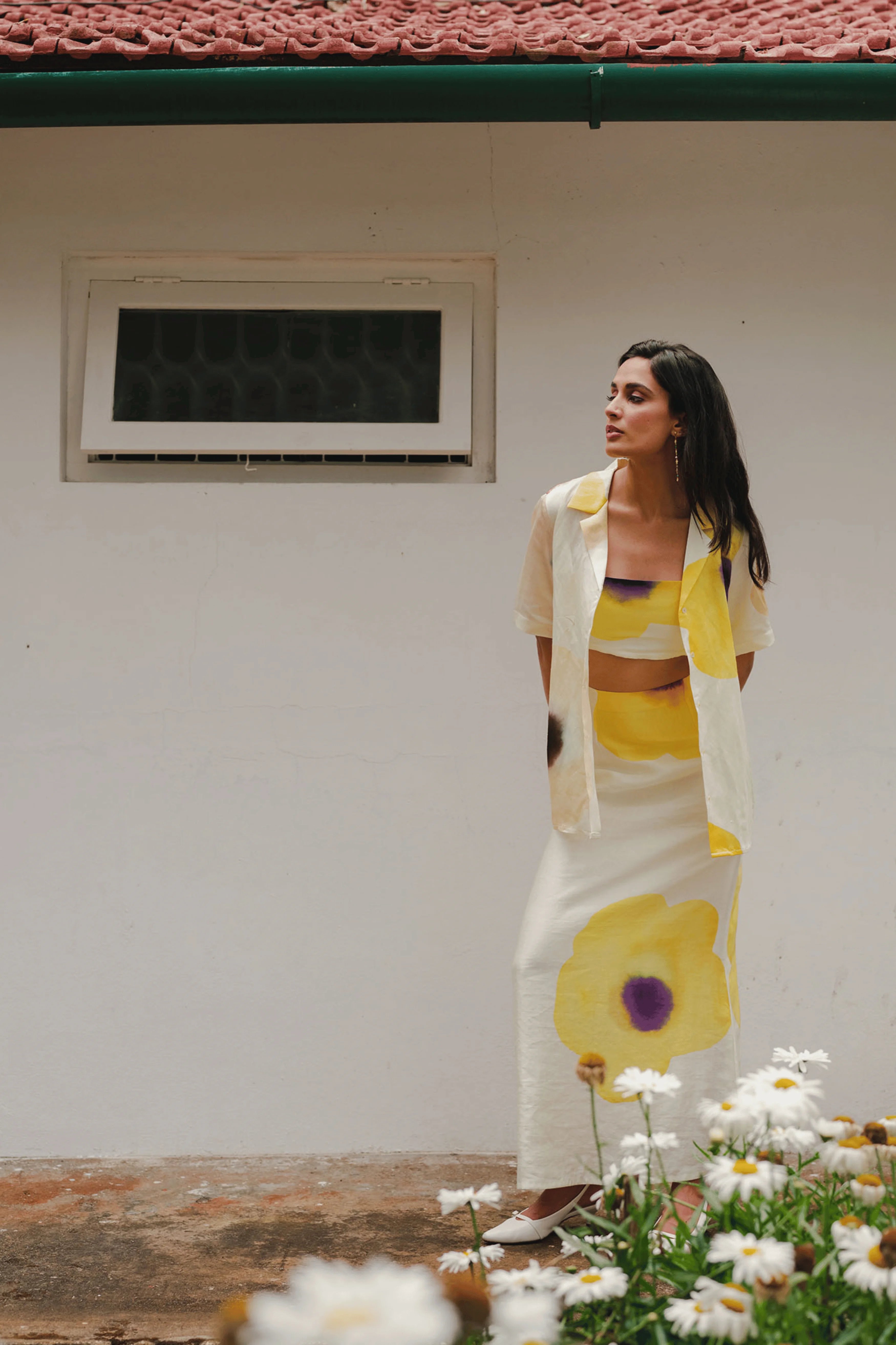 A striking two-piece set featuring a straight-cut midi skirt with a back slit, paired with a matching bralette. Crafted from a breathable linen-viscose blend, both pieces are adorned with a bold, oversized floral print-designed to make a statement while staying effortlessly easy and wearable.