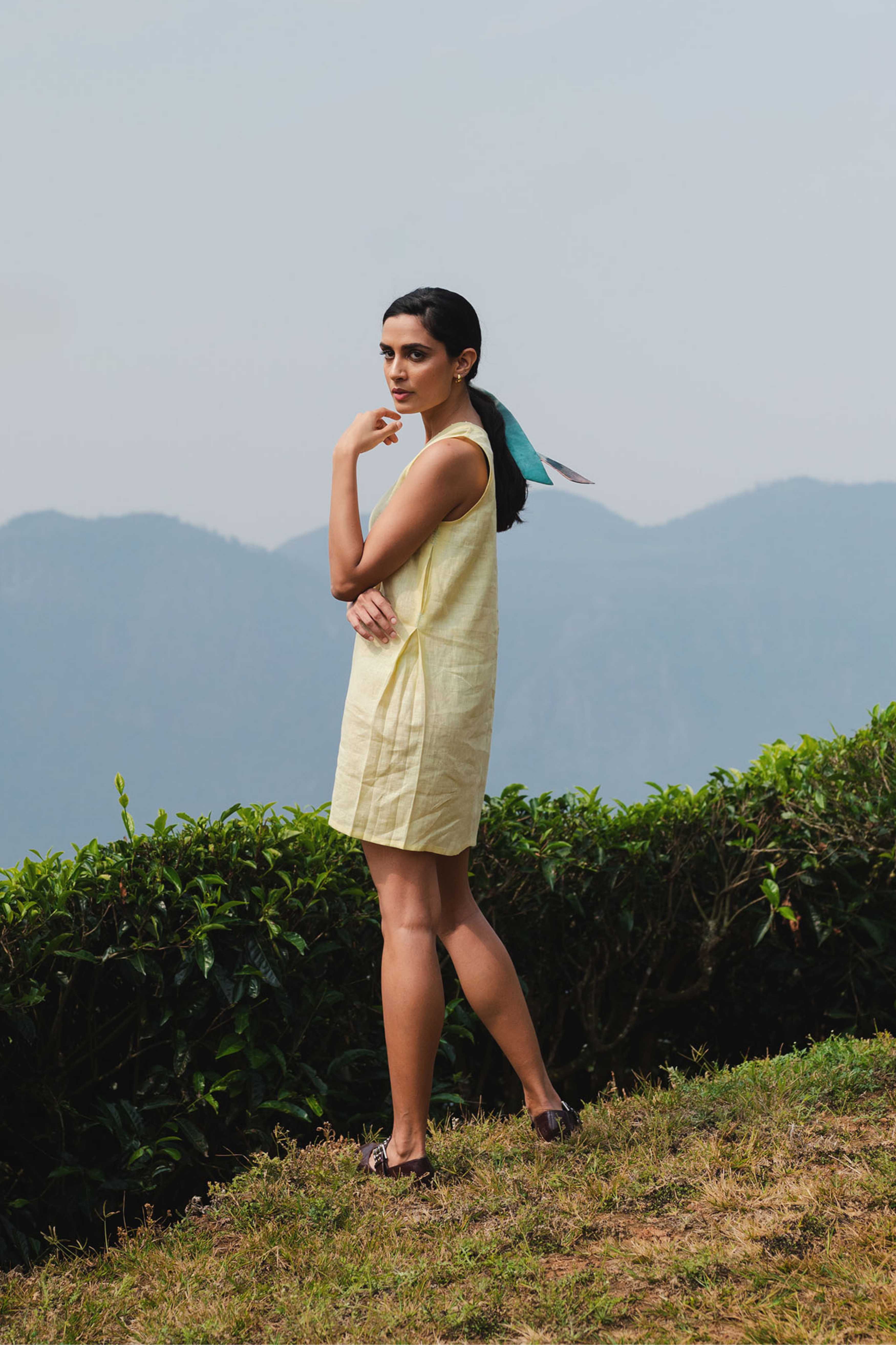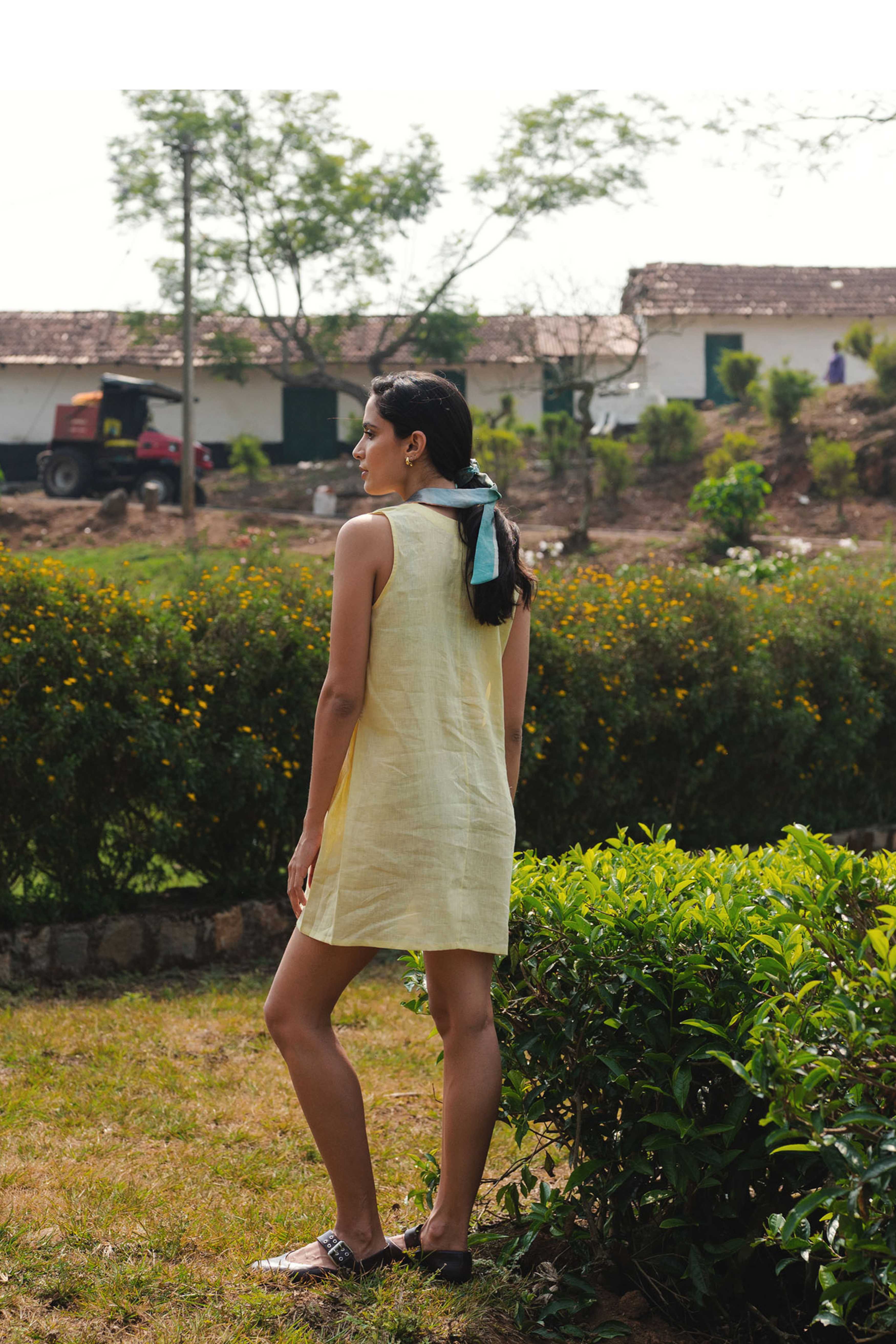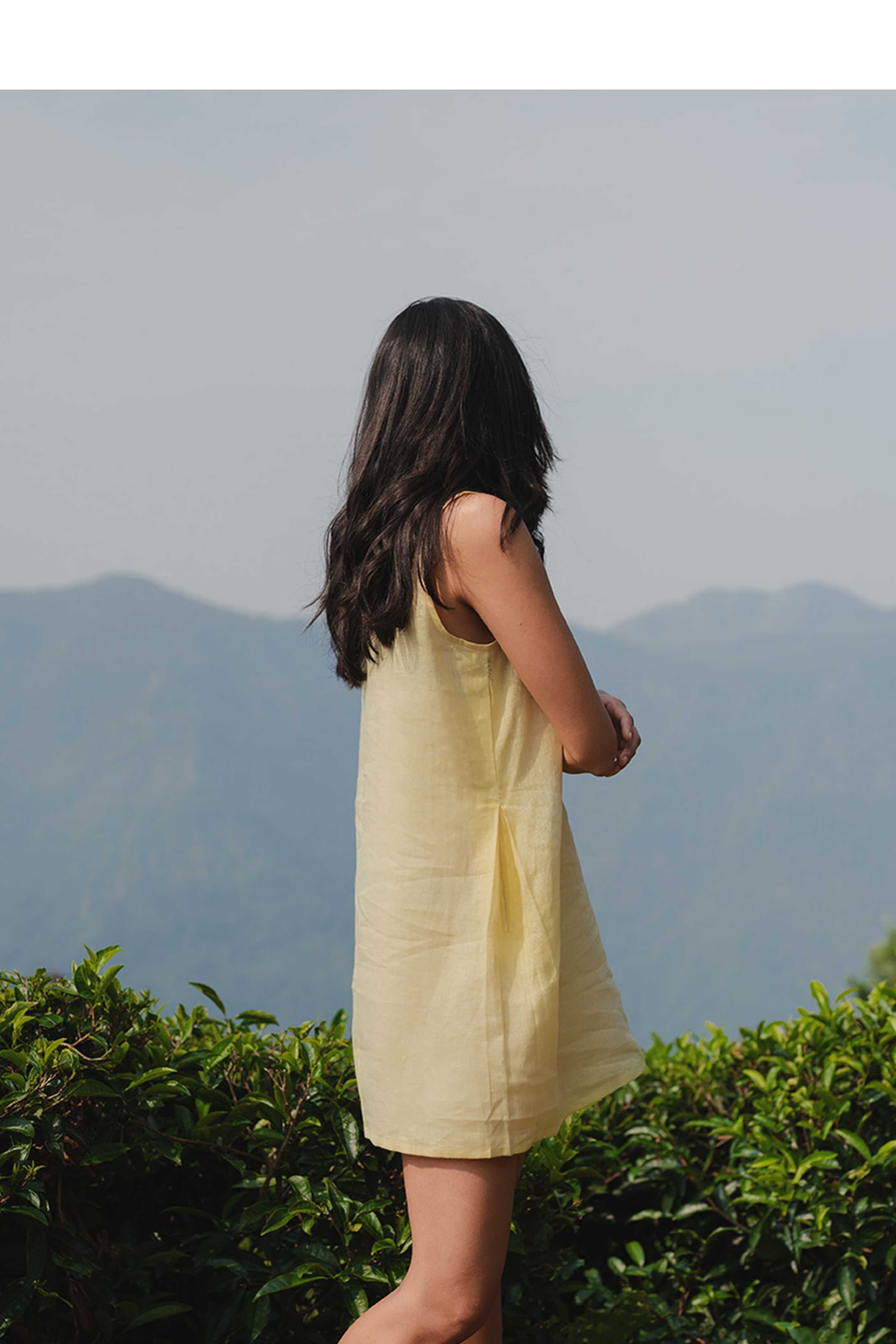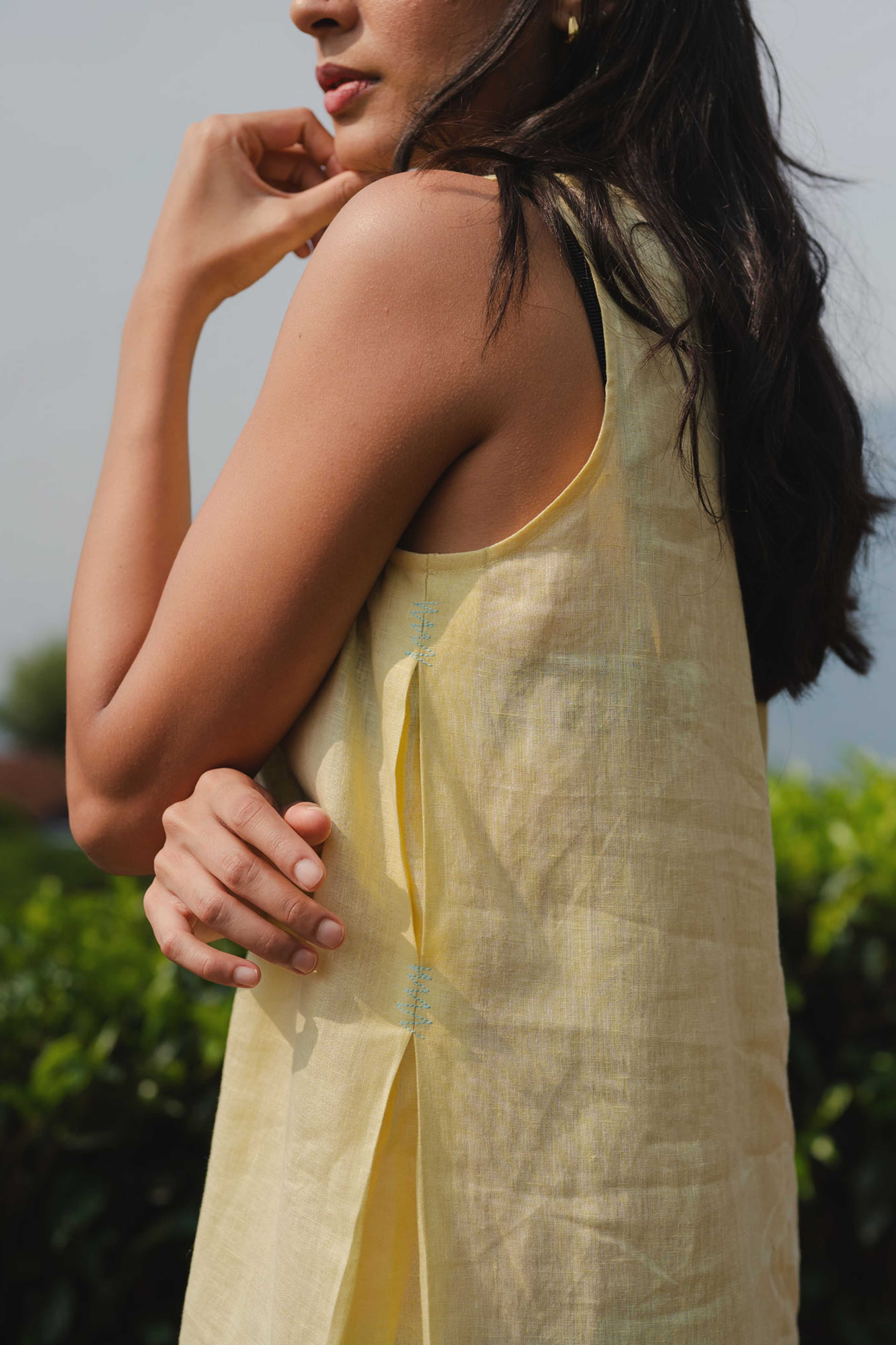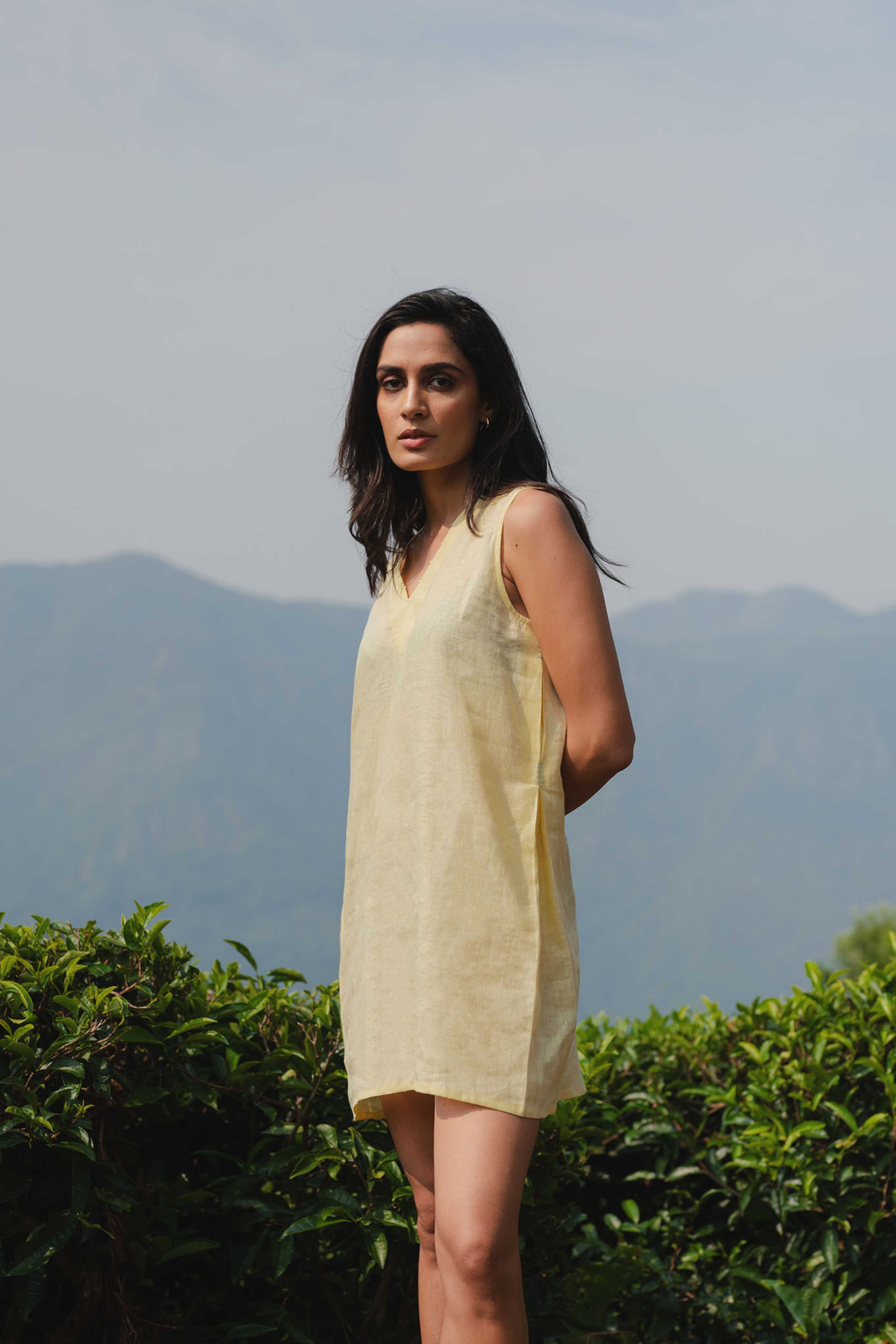 Crafted from airy linen in a refreshing butter yellow, this sleeveless shift dress offers a relaxed, fuss-free silhouette with a subtle V-neckline for effortless ease. A timeless staple for everyday wear.