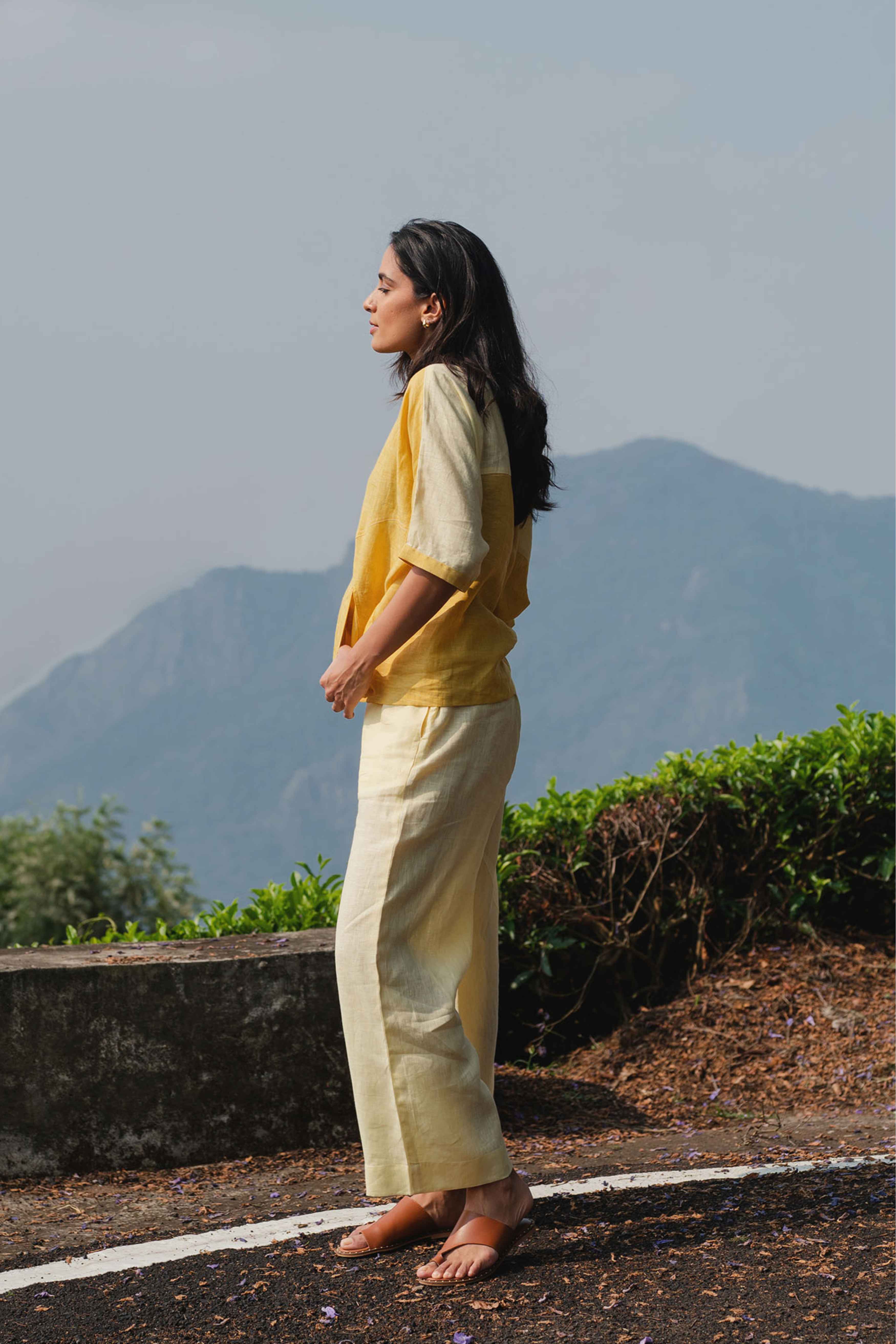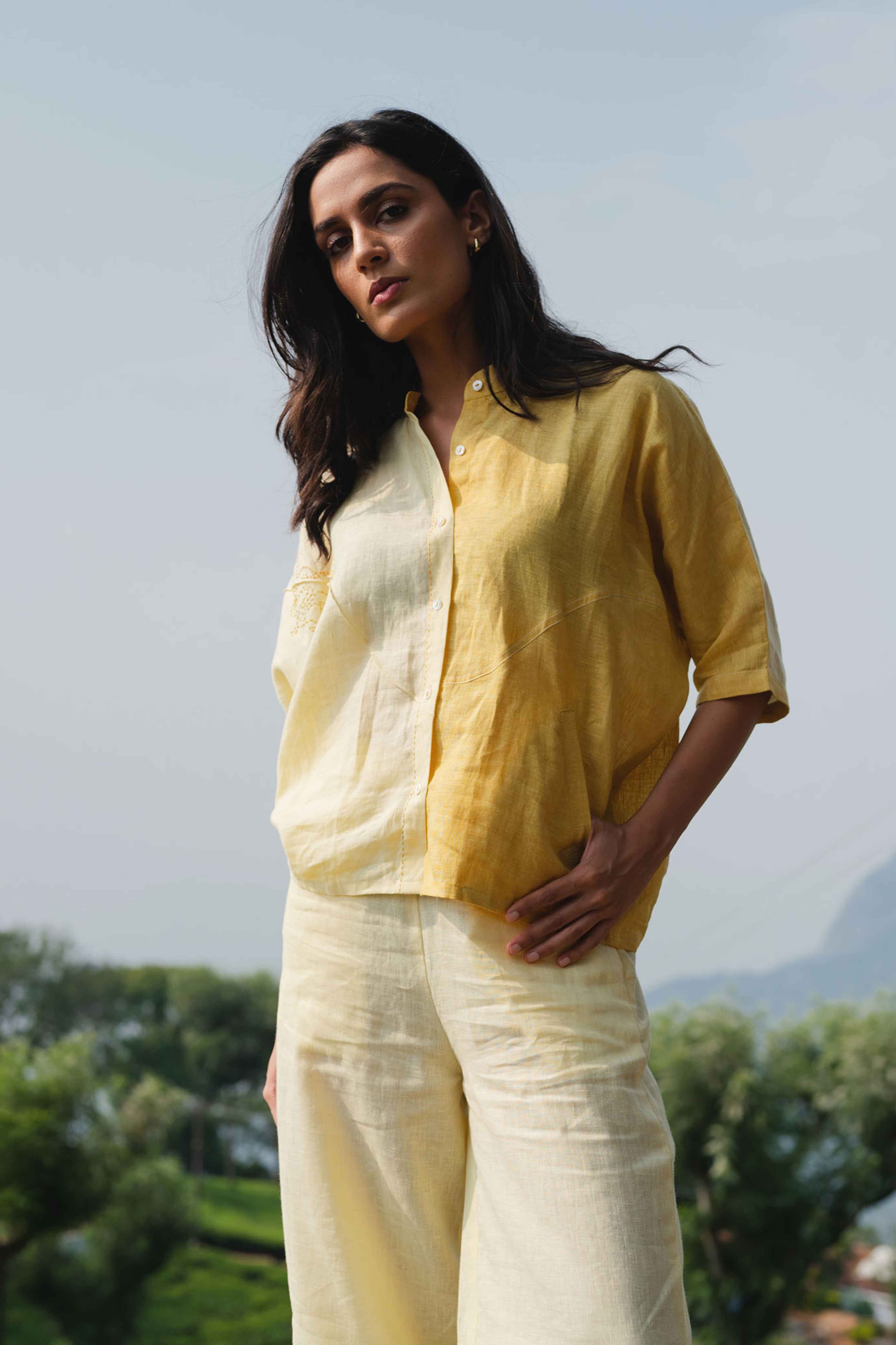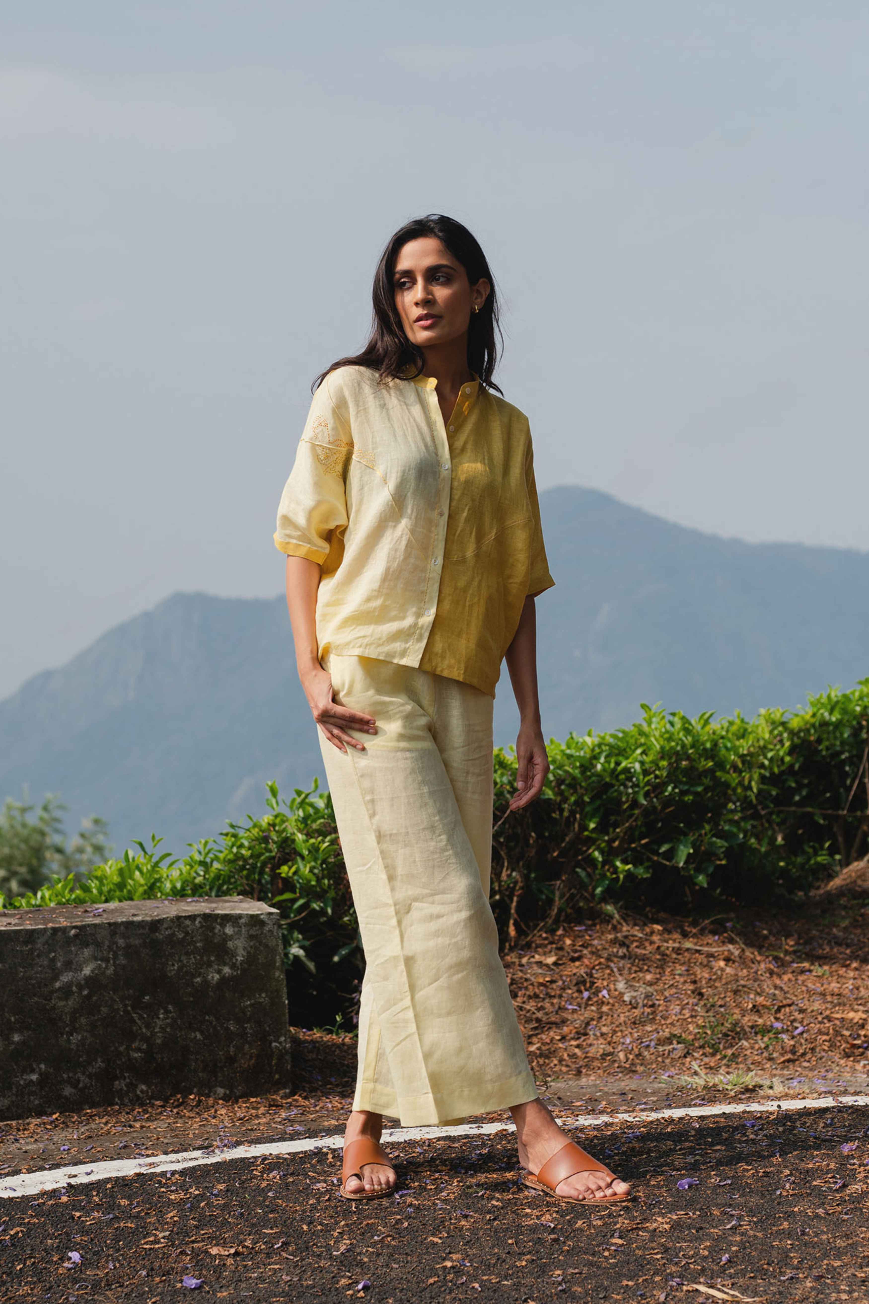 A dual-tone co-ord set crafted from 100% pure linen for breathable comfort. The shirt features a relaxed, boxy silhouette with intricate embroidery on one side, paired with straight-cut pants in a soft butter yellow hue.