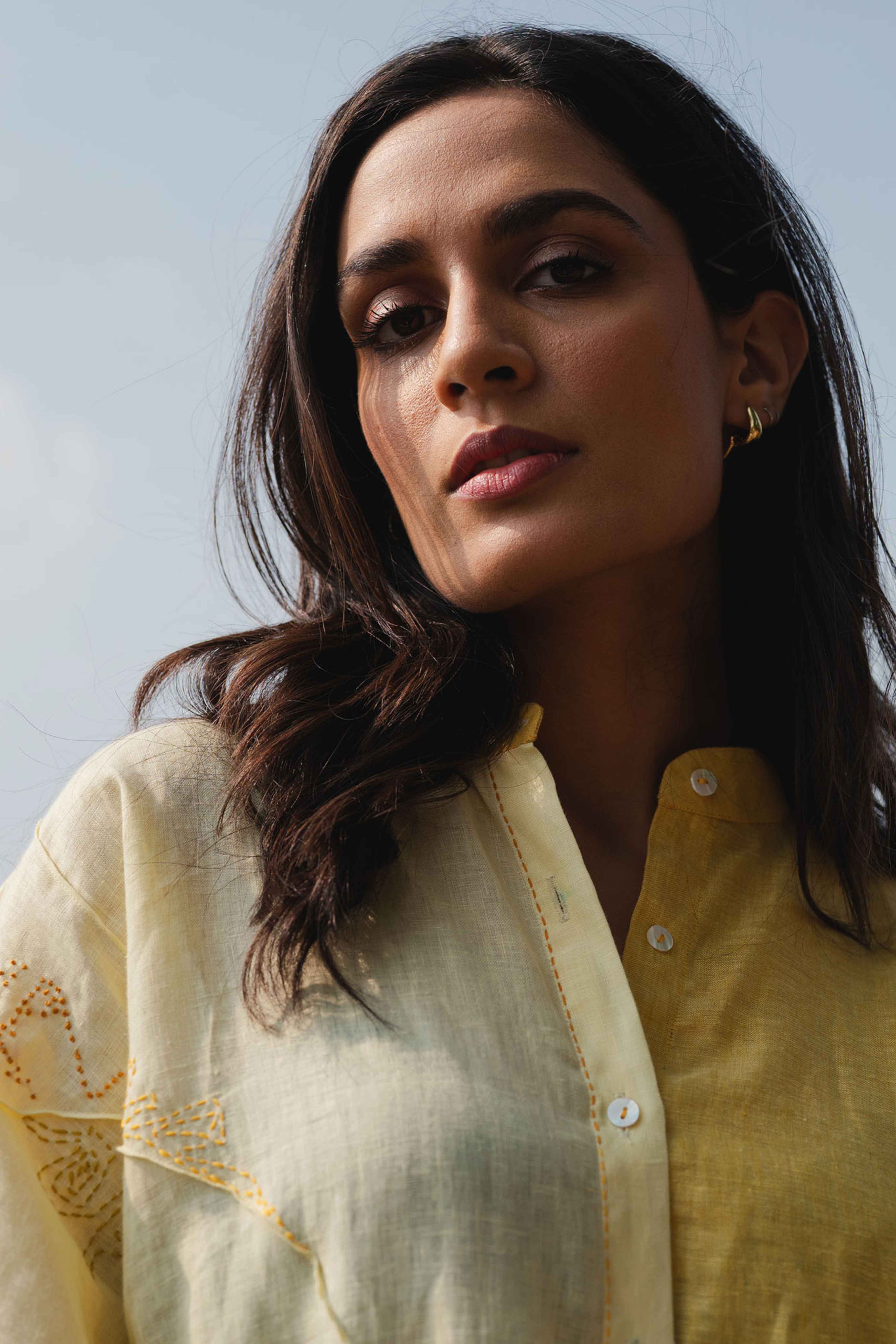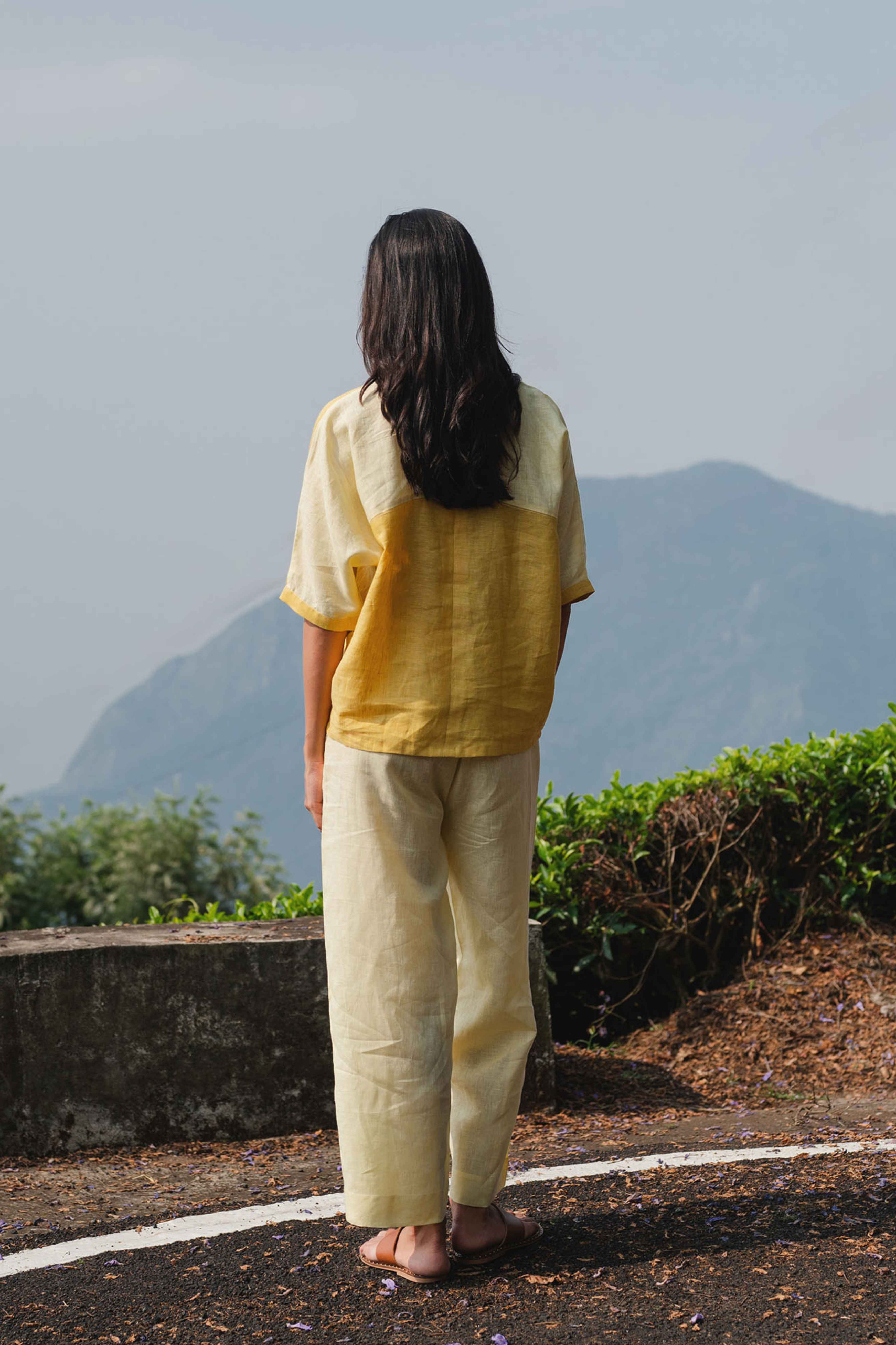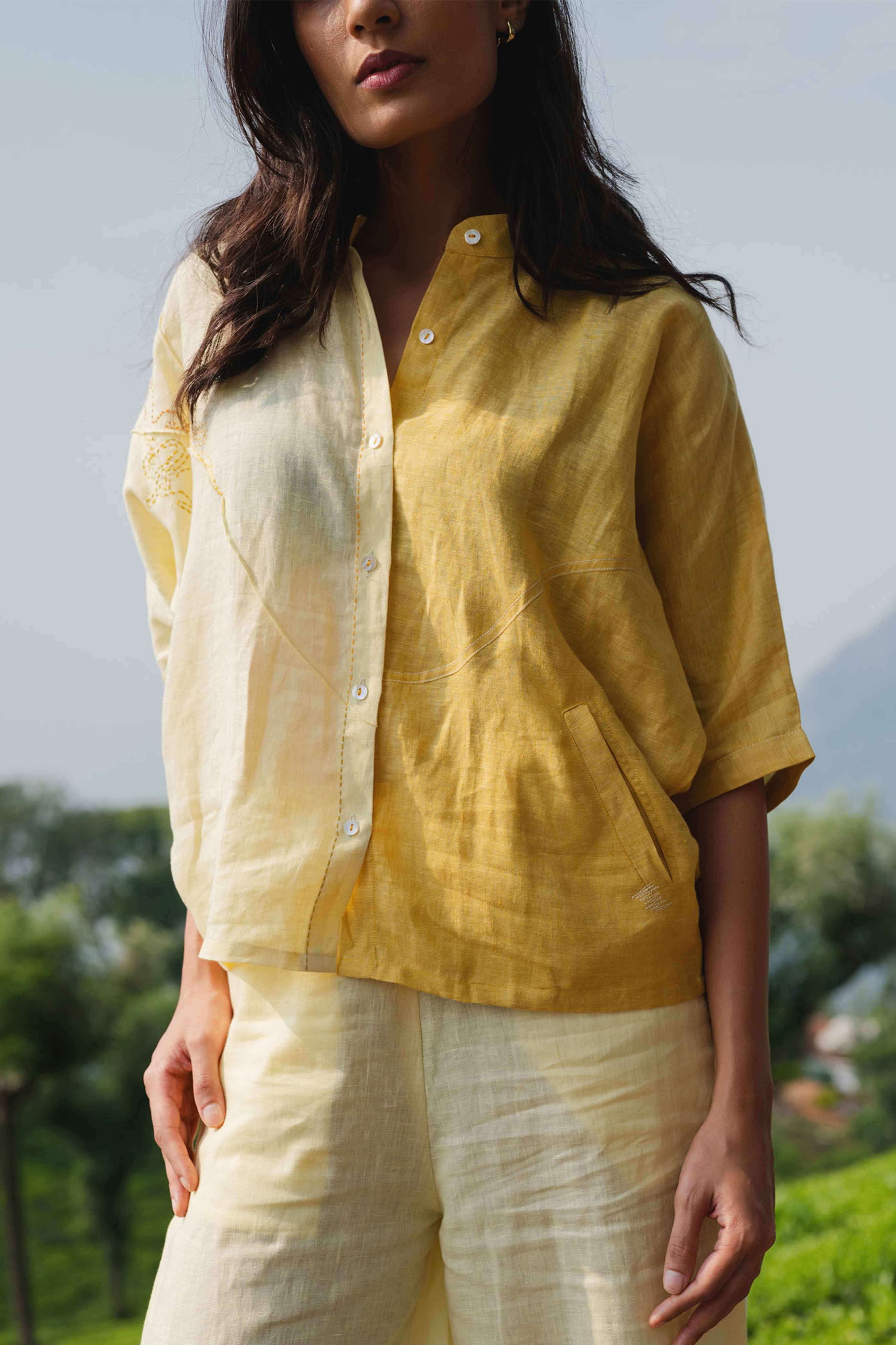 A dual-tone co-ord set crafted from 100% pure linen for breathable comfort. The shirt features a relaxed, boxy silhouette with intricate embroidery on one side, paired with straight-cut pants in a soft butter yellow hue.
