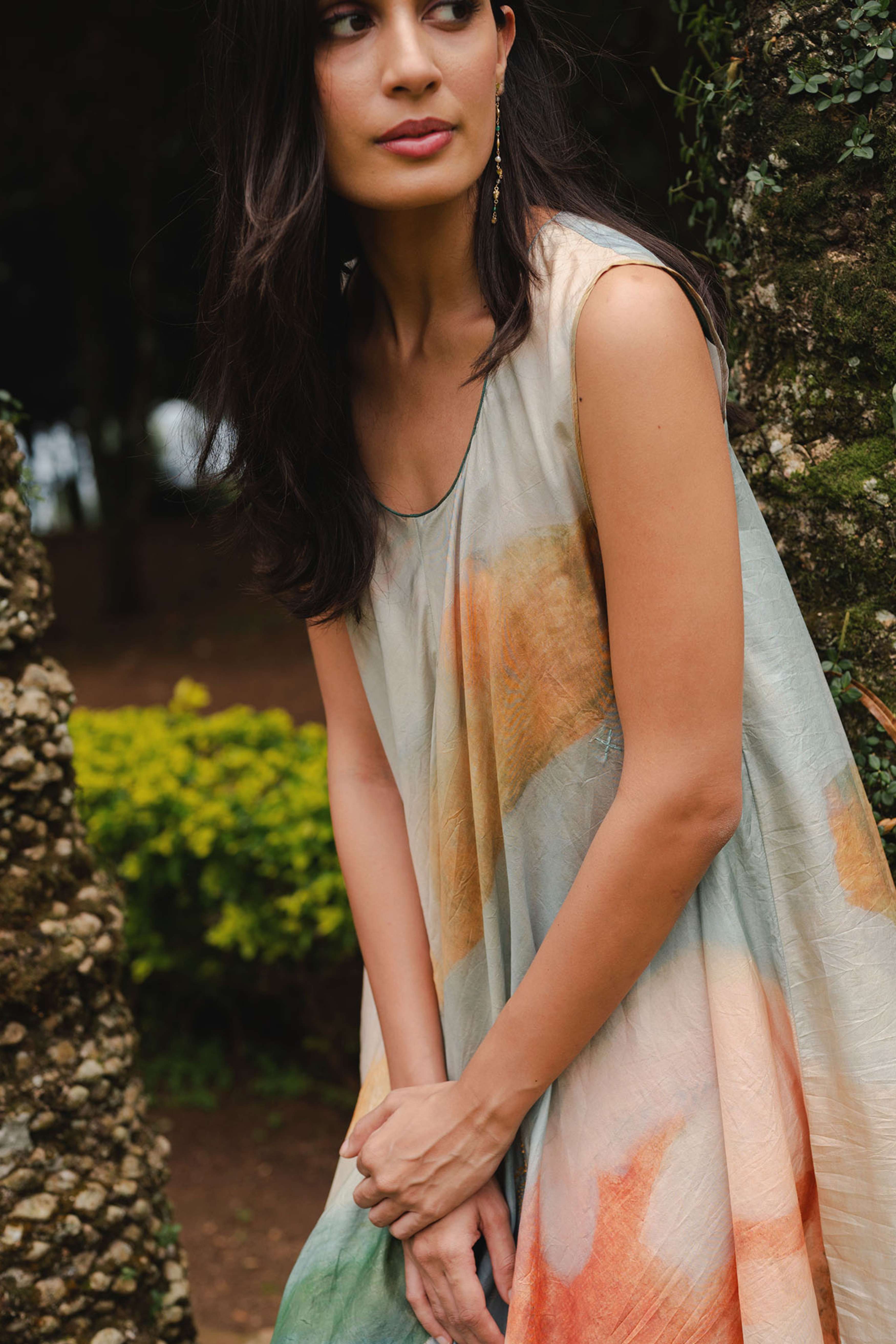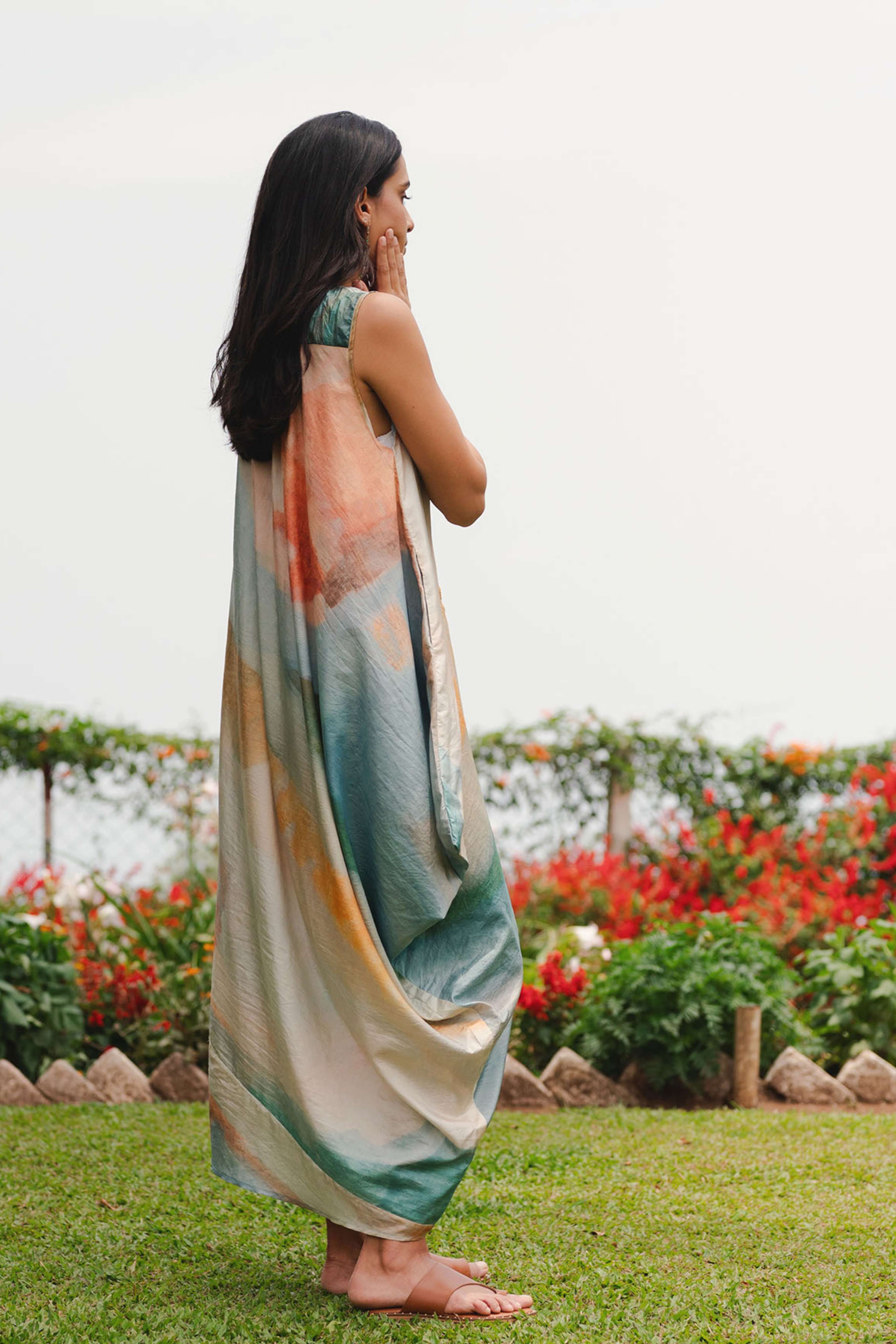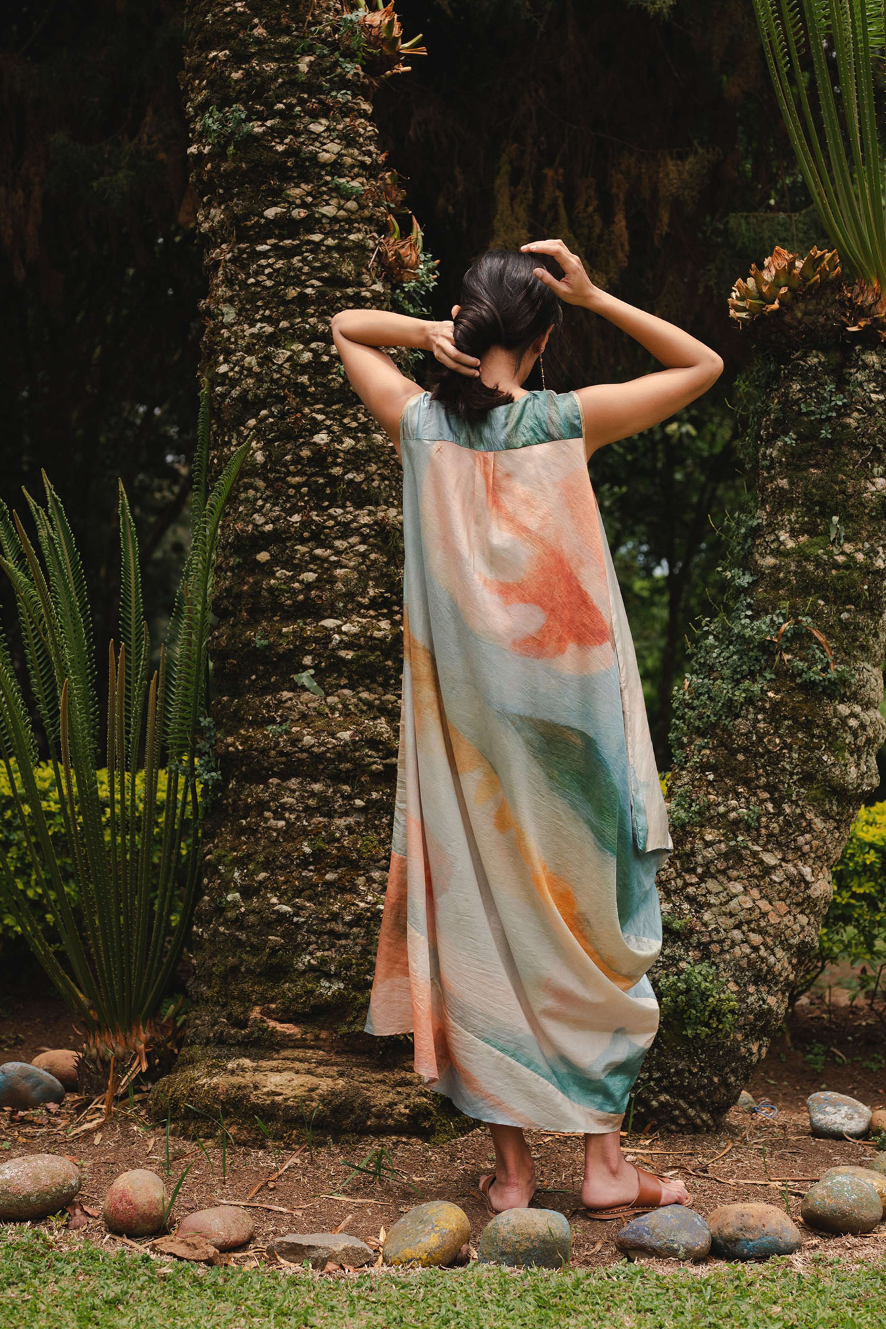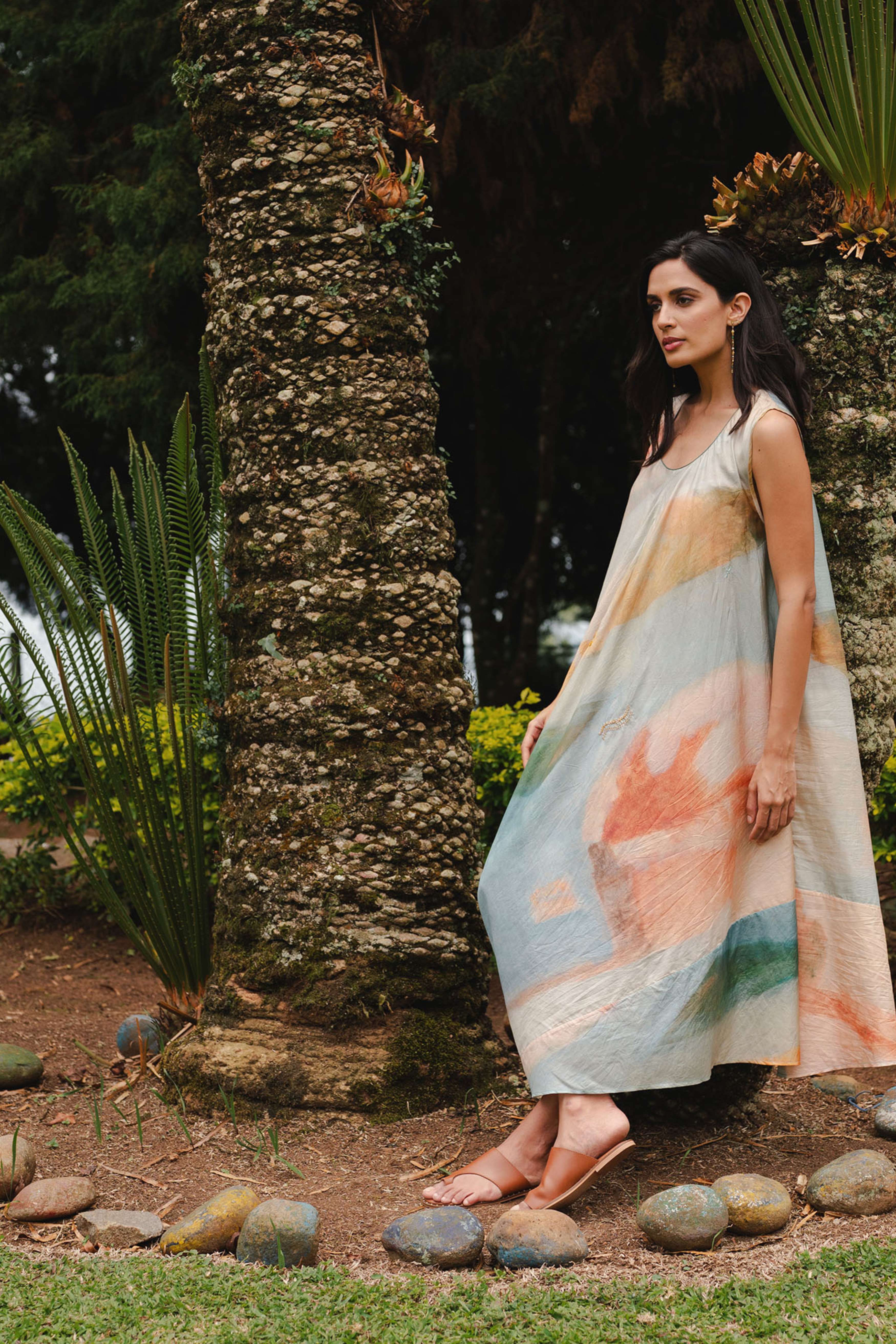 A free-flowing maxi silhouette crafted in pure silk, this A-line dress features hidden pleats along the front, creating a flattering narrow fit at the top that gently flares into an easy, relaxed hem. Finished with elegant bell sleeves and delicate tie-up details at the cuffs, it’s designed for effortless movement and subtle drama.