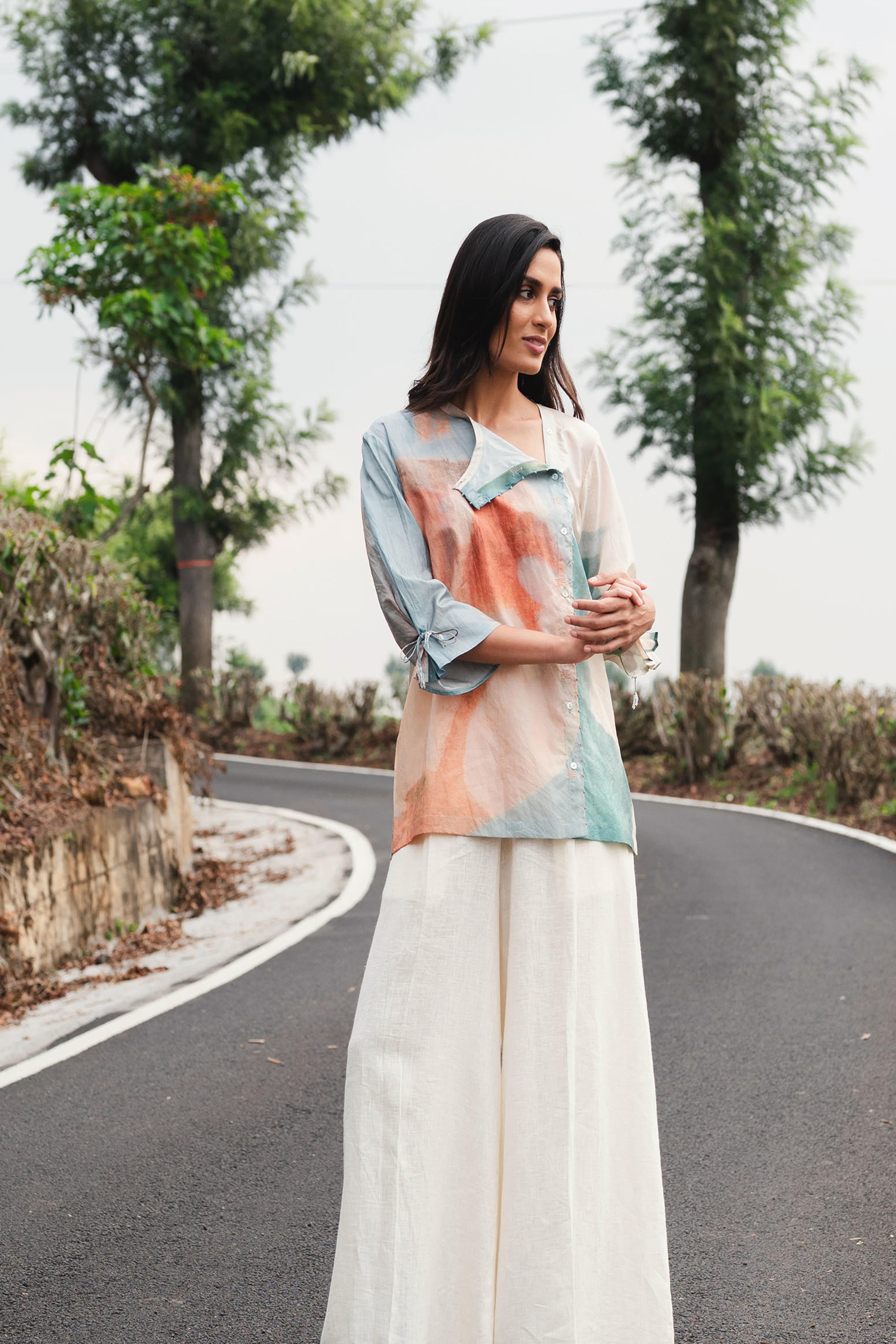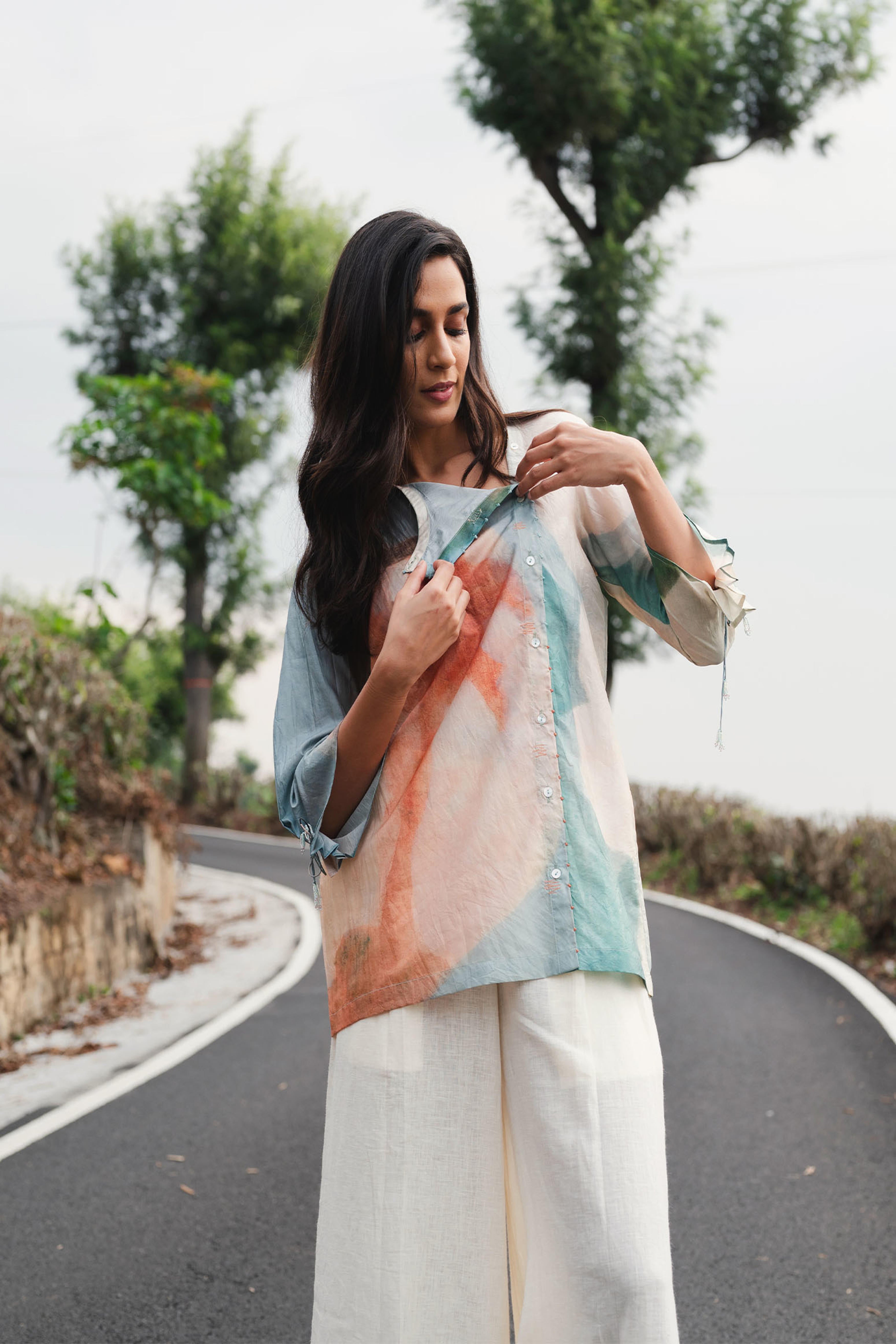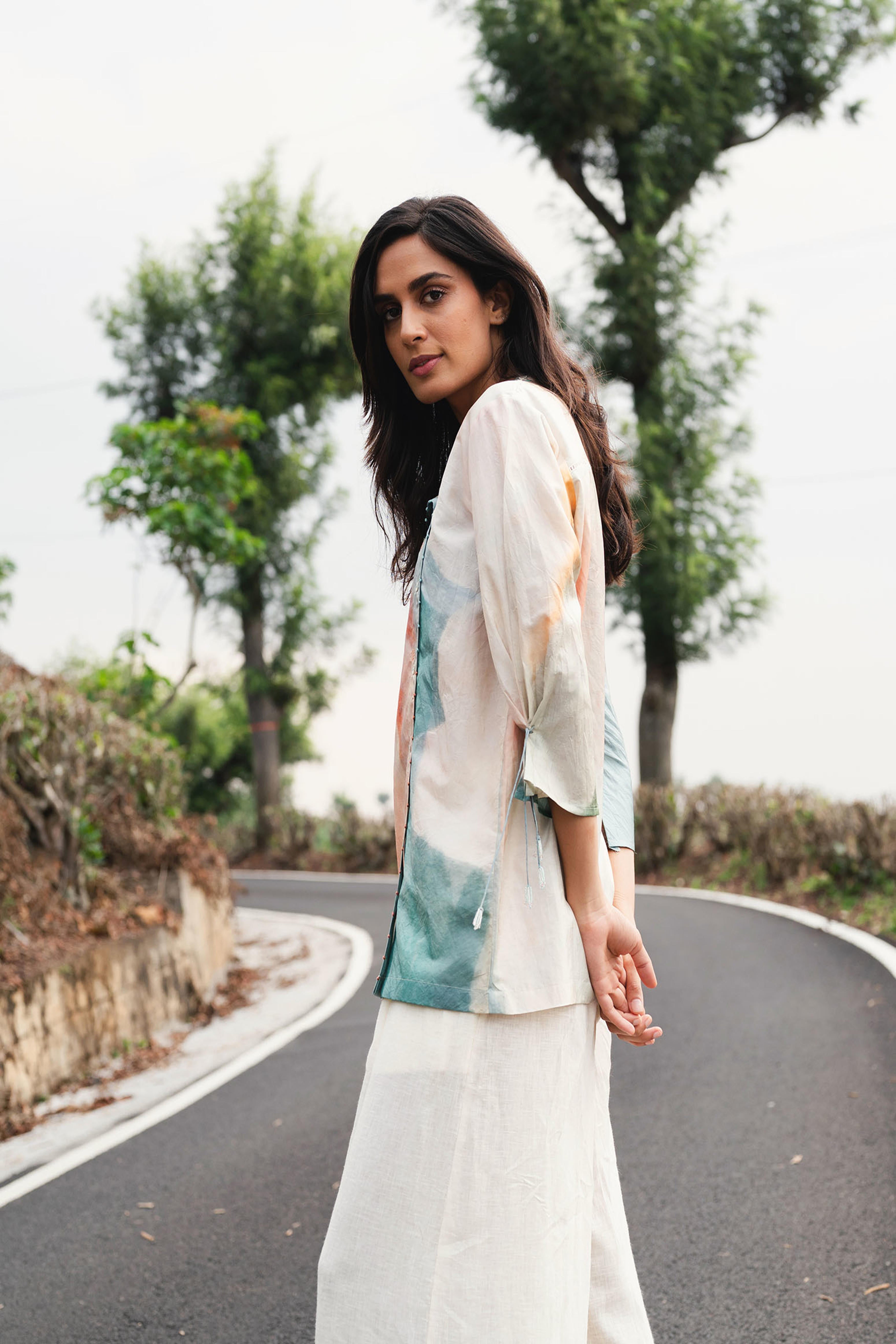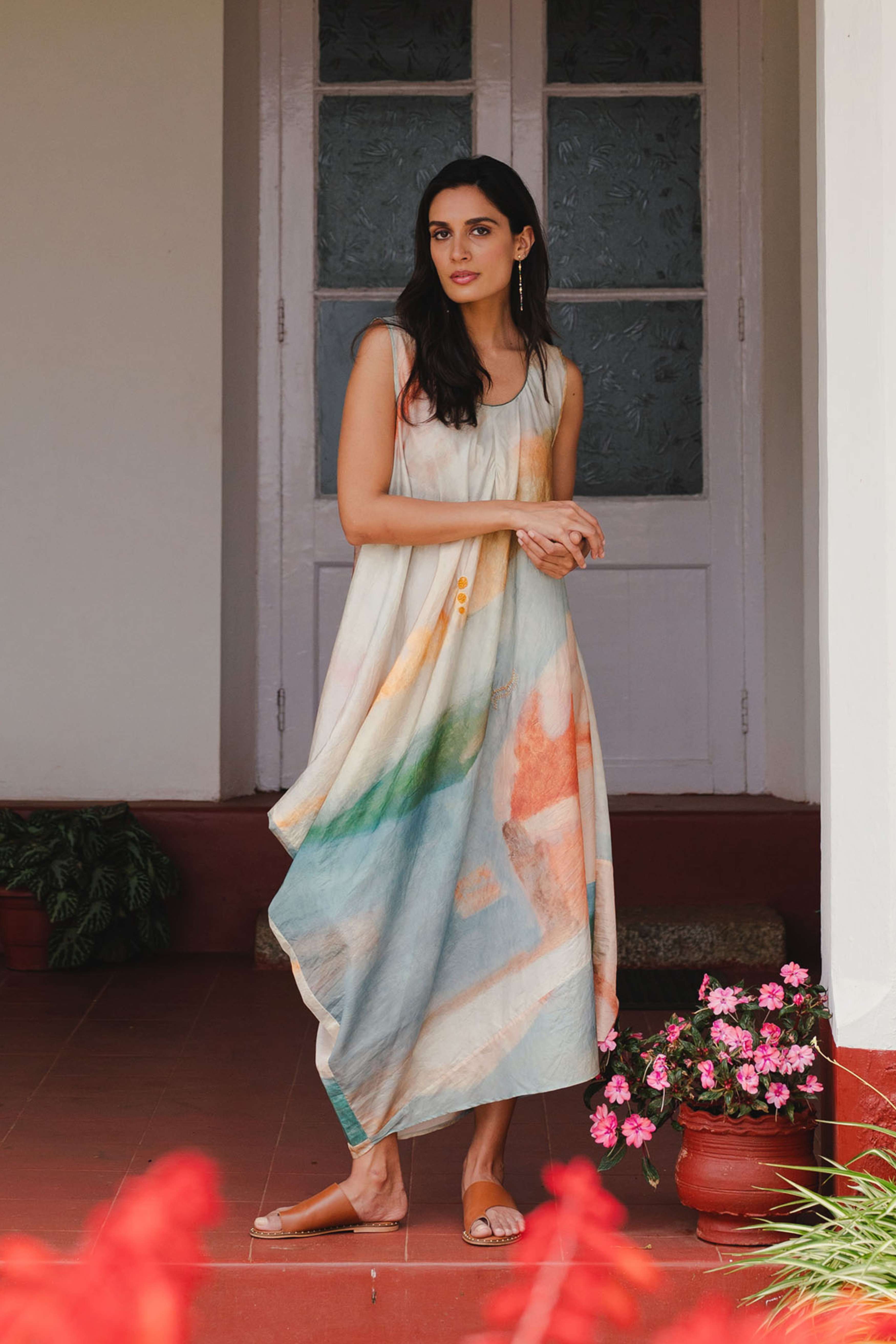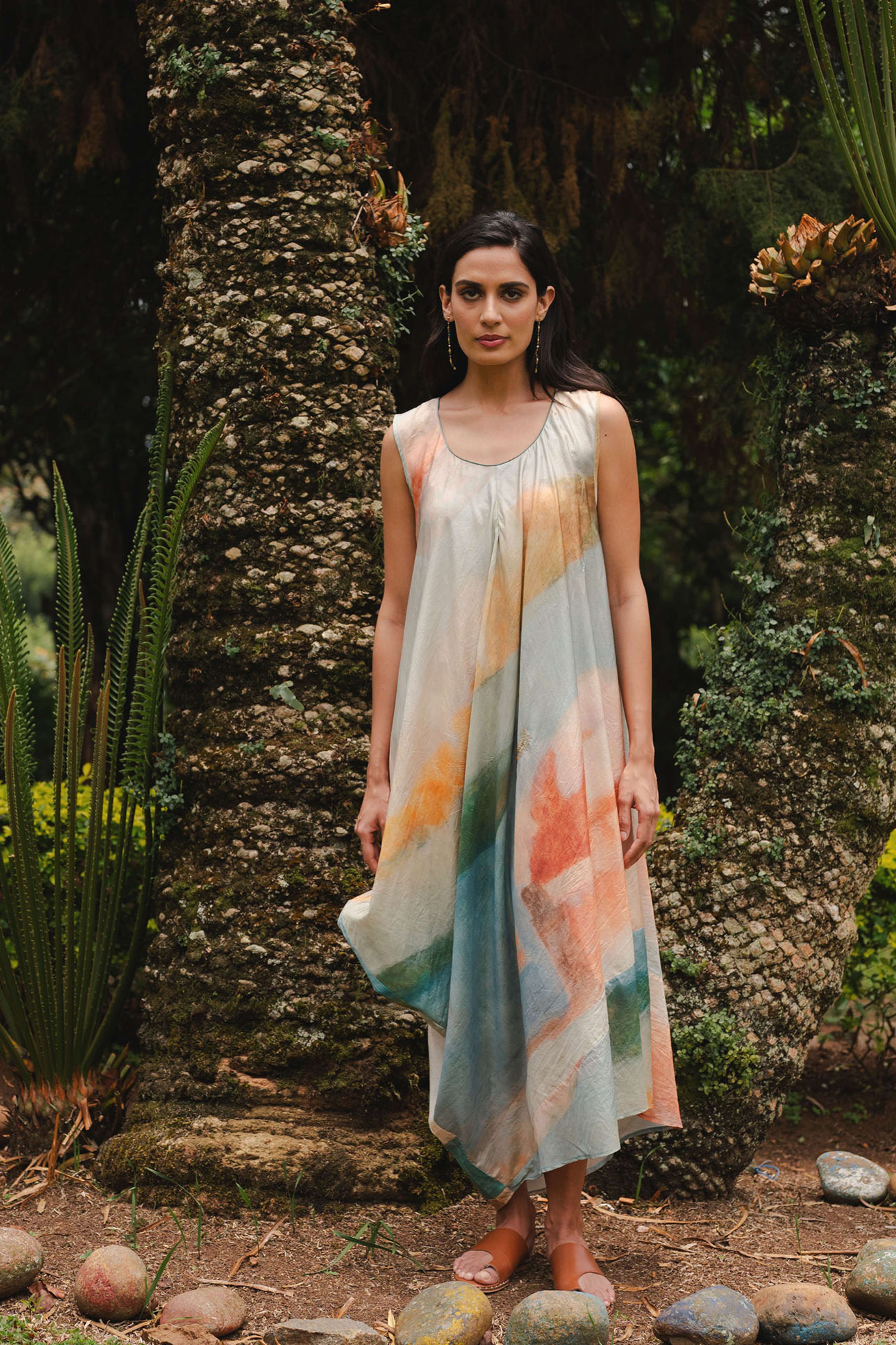 A free-flowing maxi silhouette crafted in pure silk, this A-line dress features hidden pleats along the front, creating a flattering narrow fit at the top that gently flares into an easy, relaxed hem. Finished with elegant bell sleeves and delicate tie-up details at the cuffs, it’s designed for effortless movement and subtle drama.