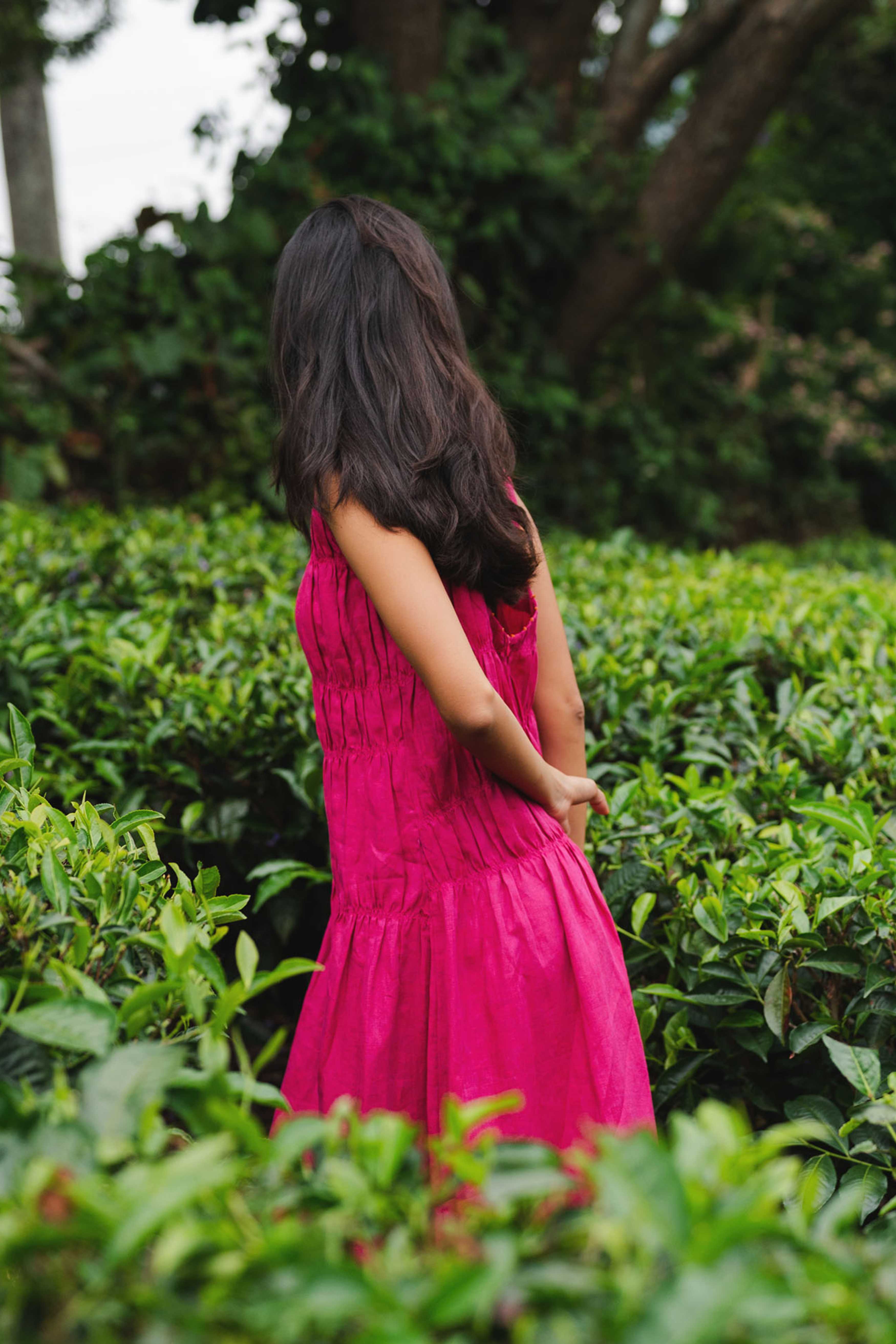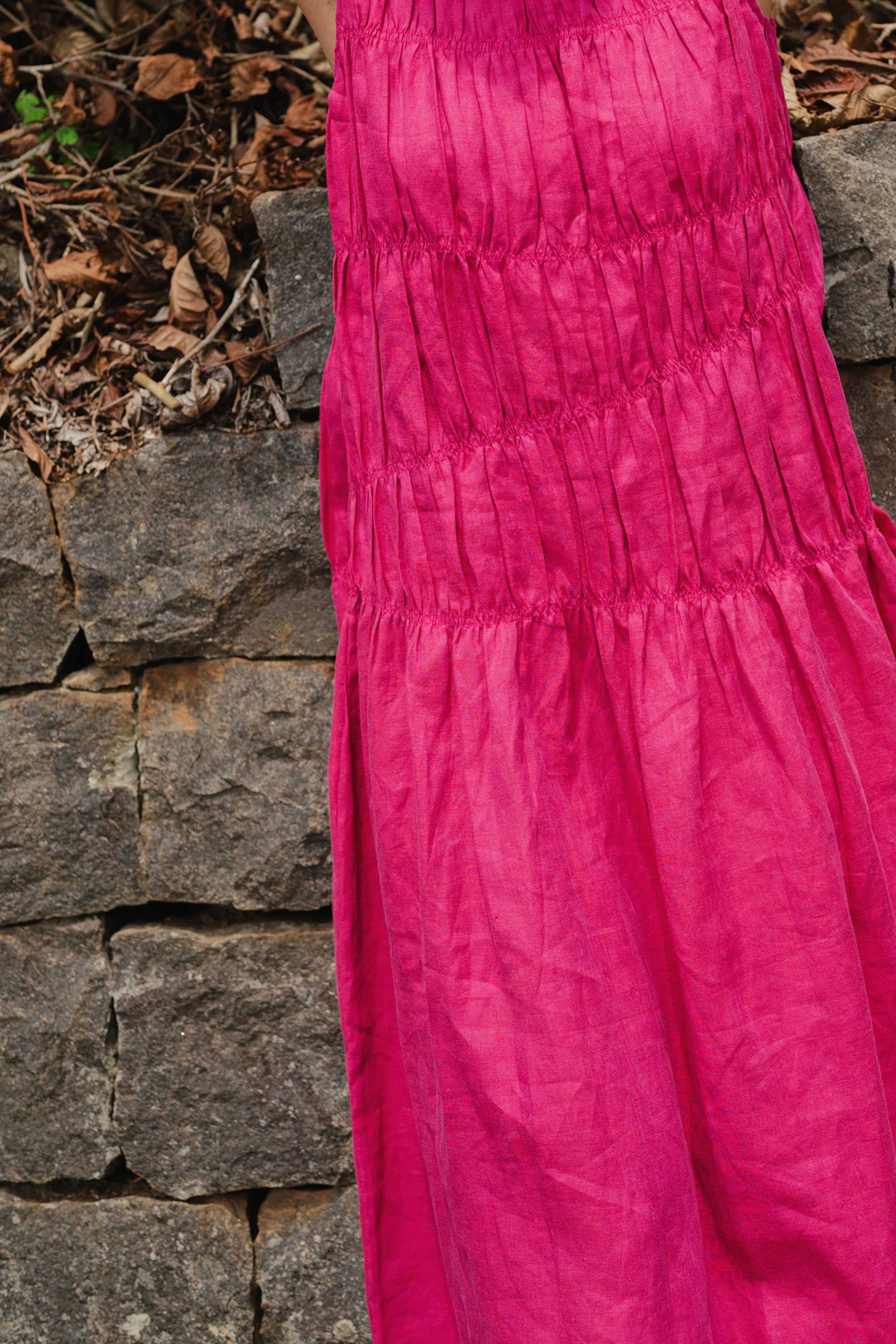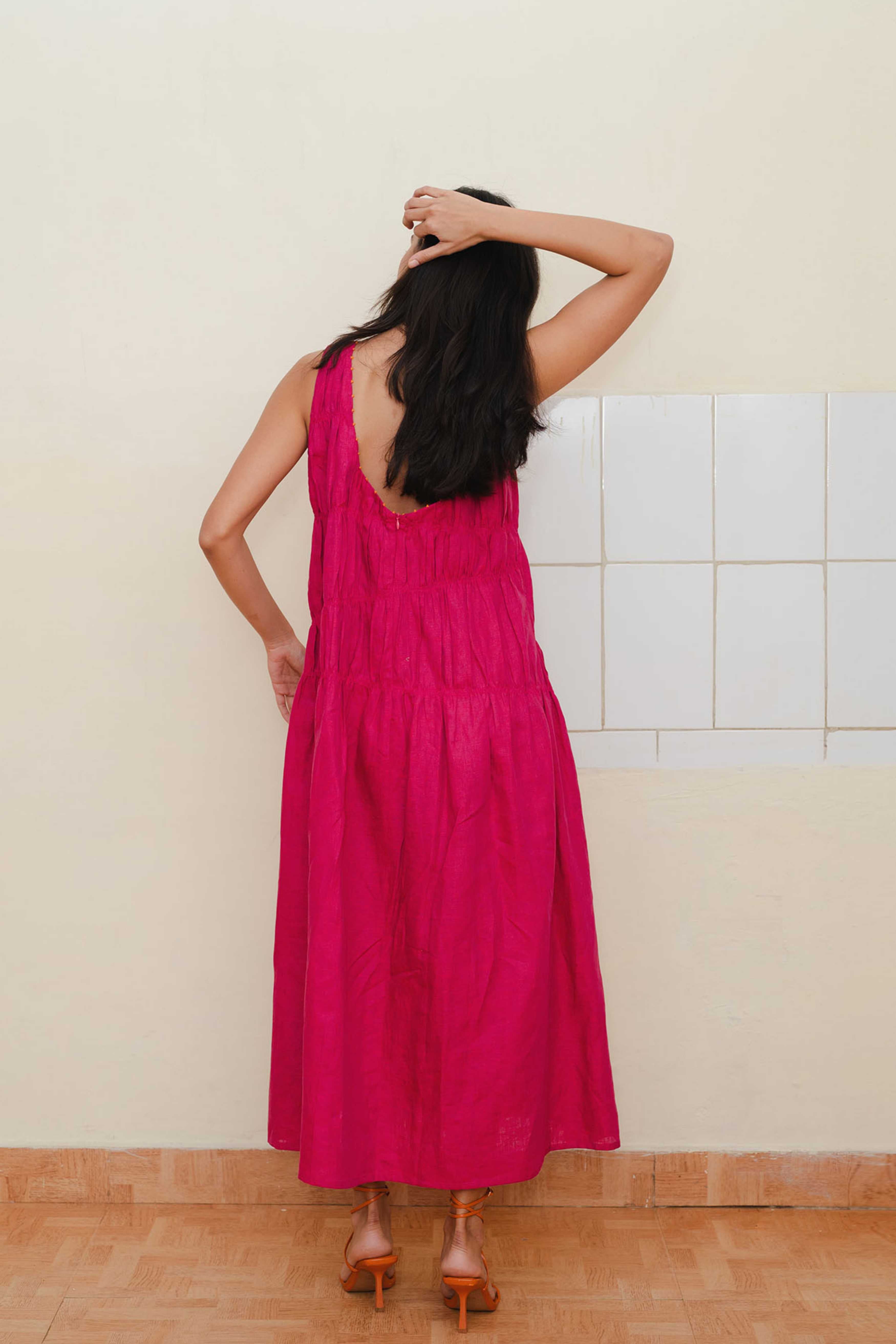 A perfect summer dress crafted in 100% linen, featuring smocking along the bodice and a free-flowing skirt that hits mid-length. In a soft, solid pink, this sleeveless dress is designed with a deep round back and a concealed back zip opening for a clean, modern finish.