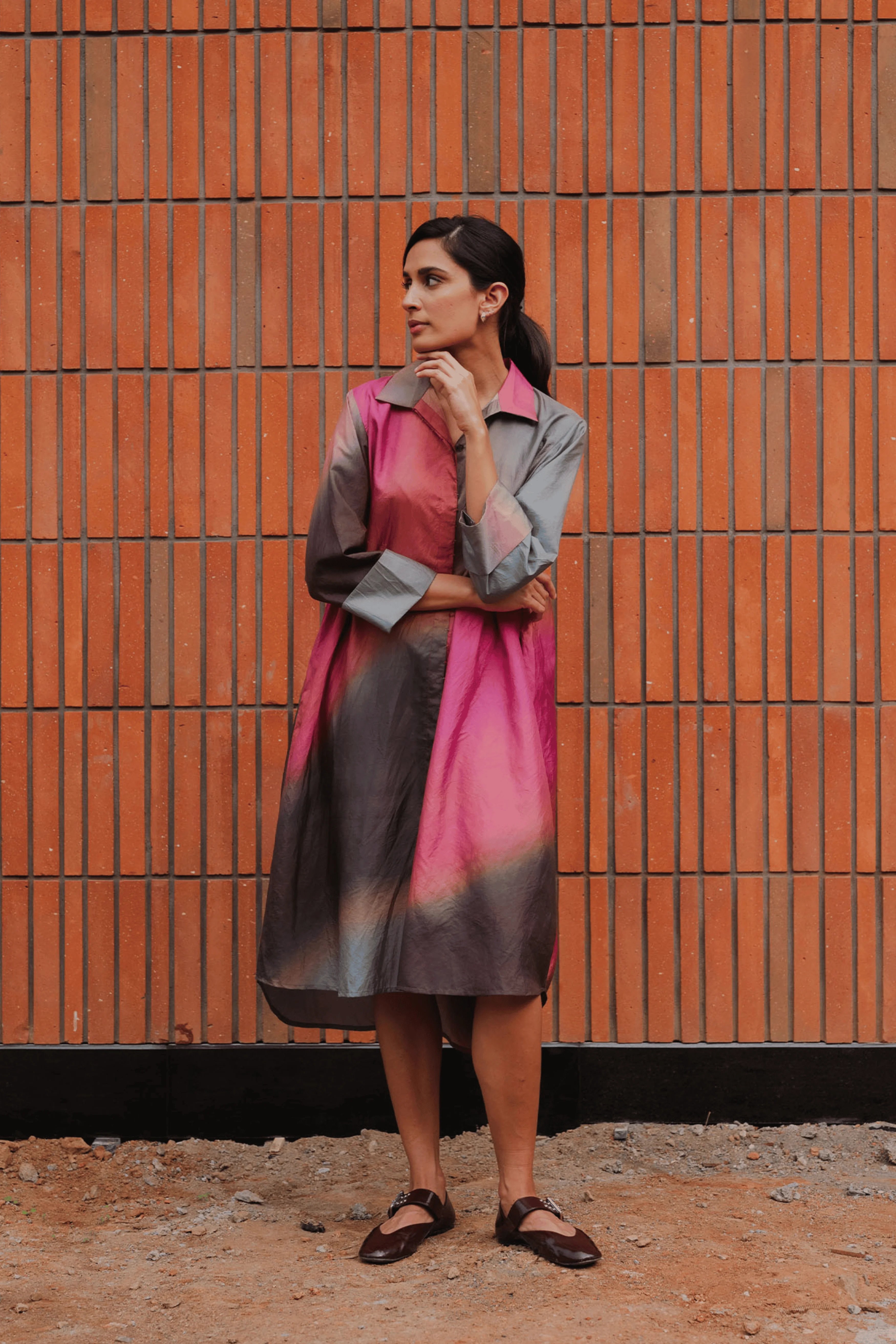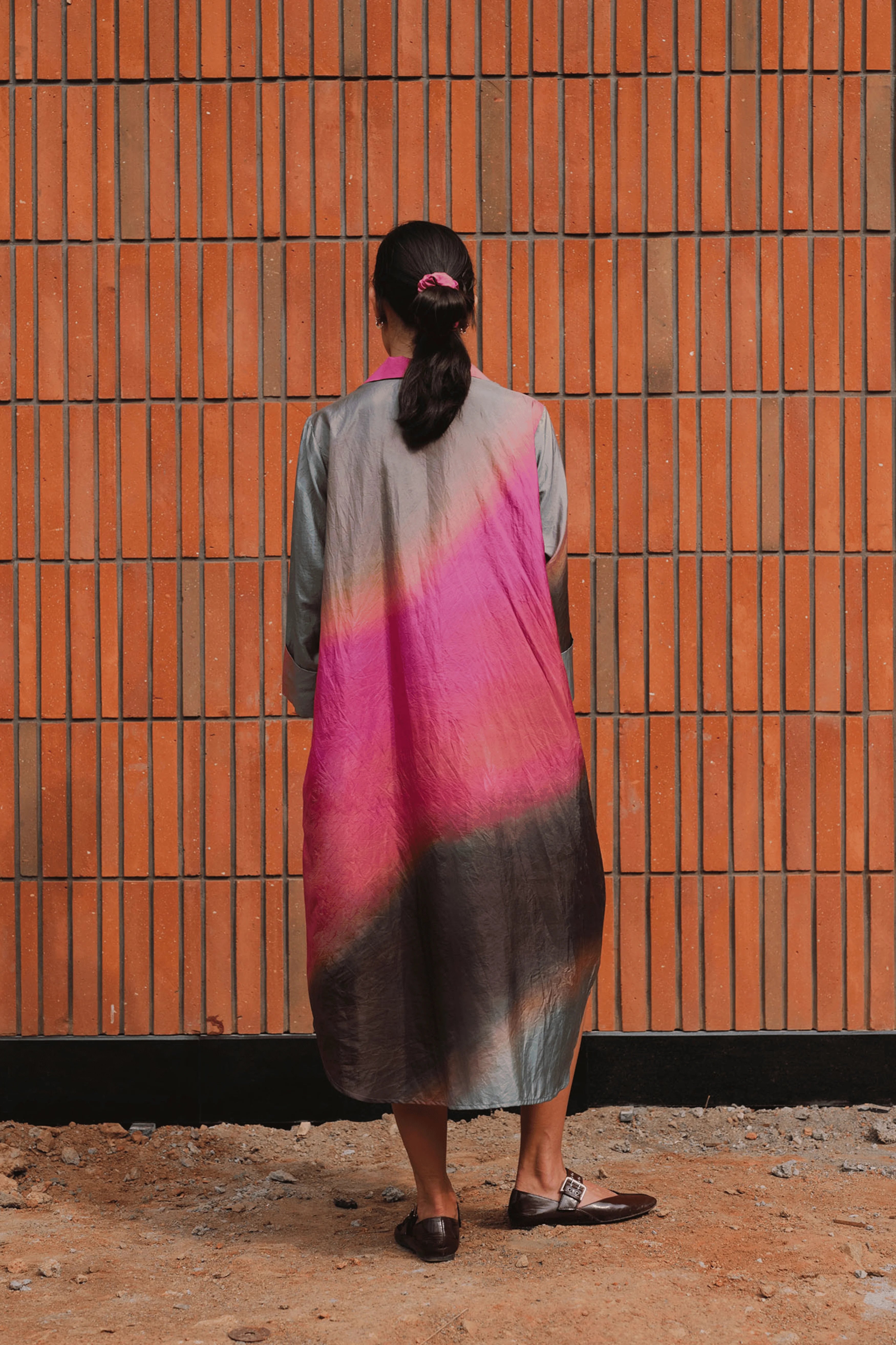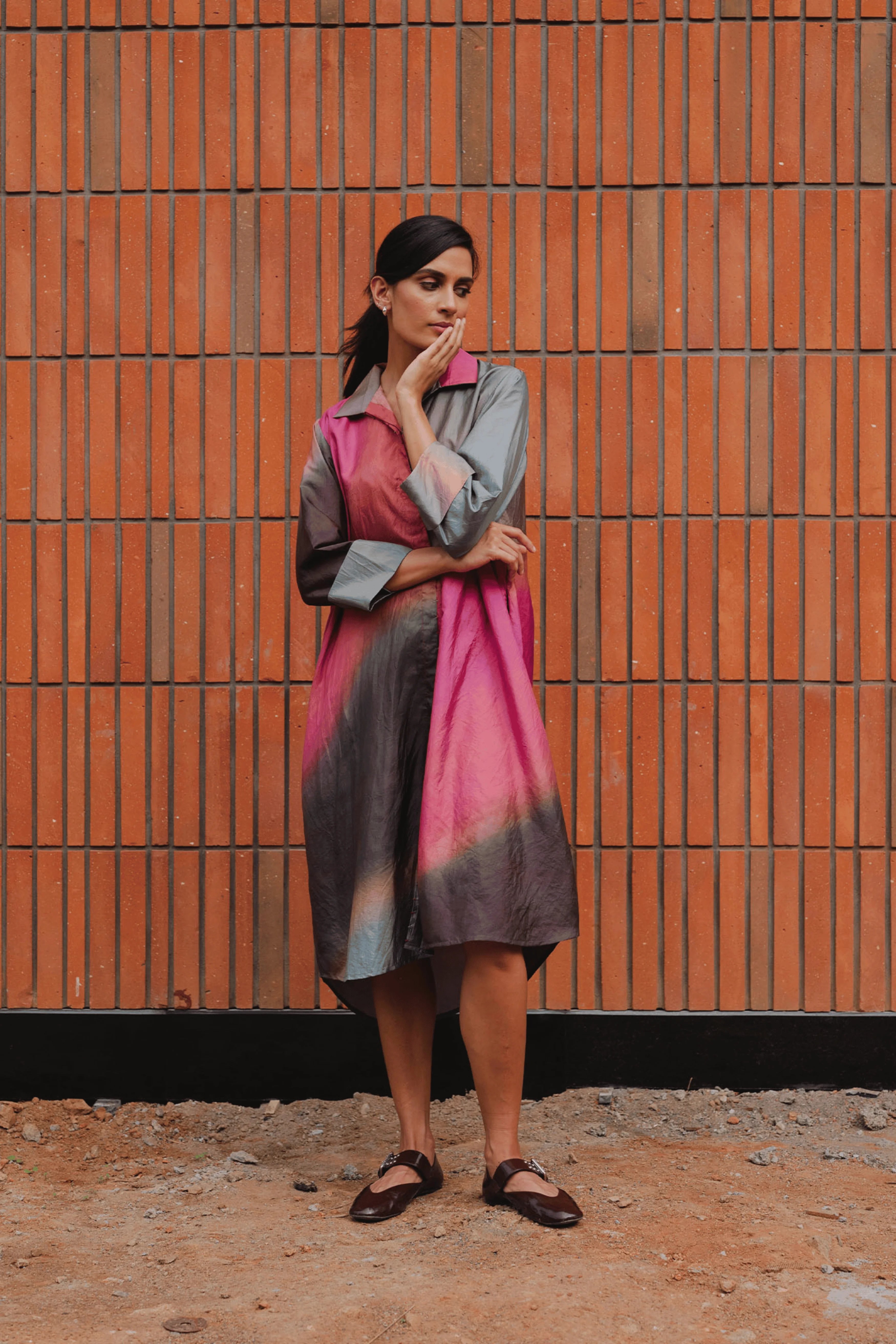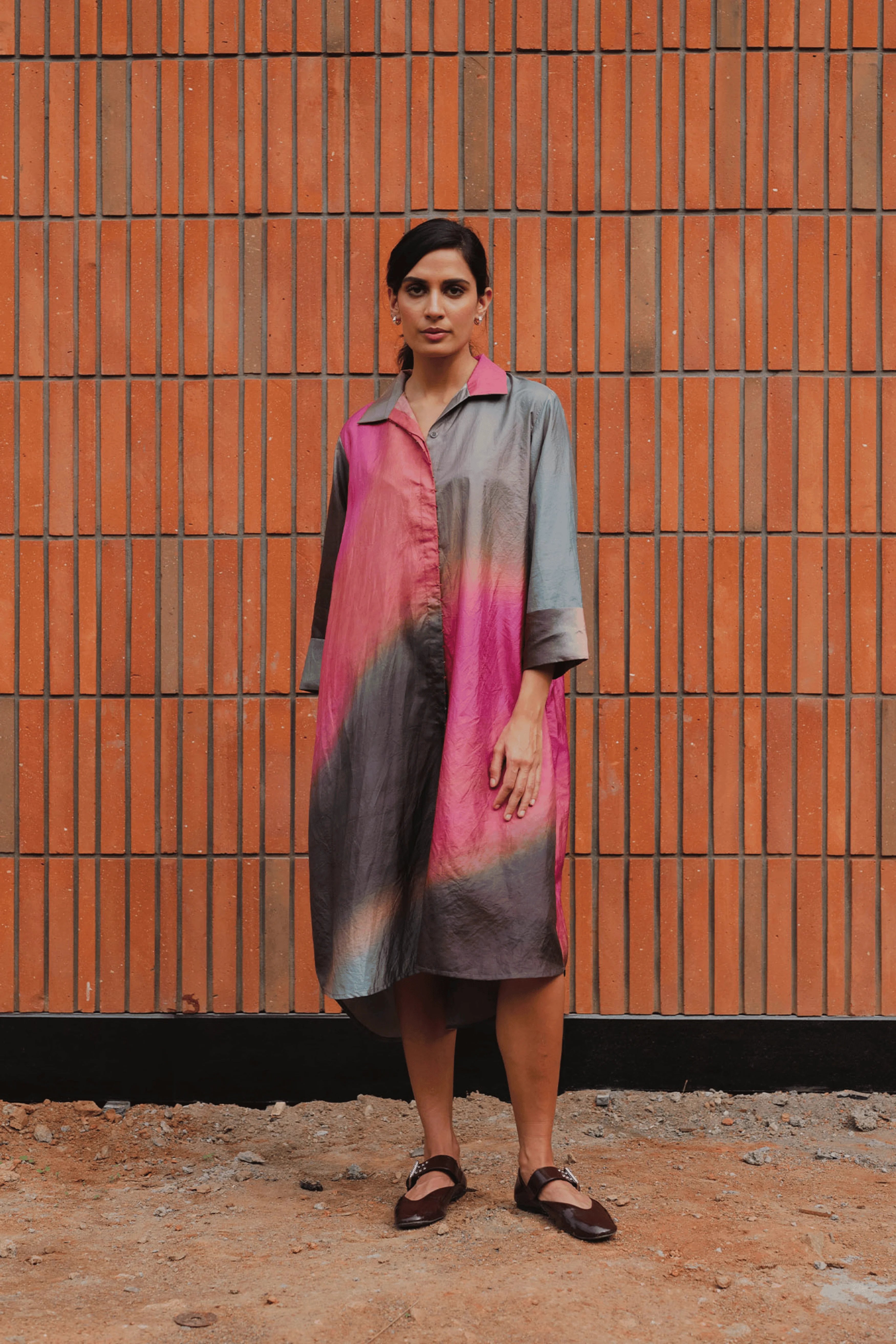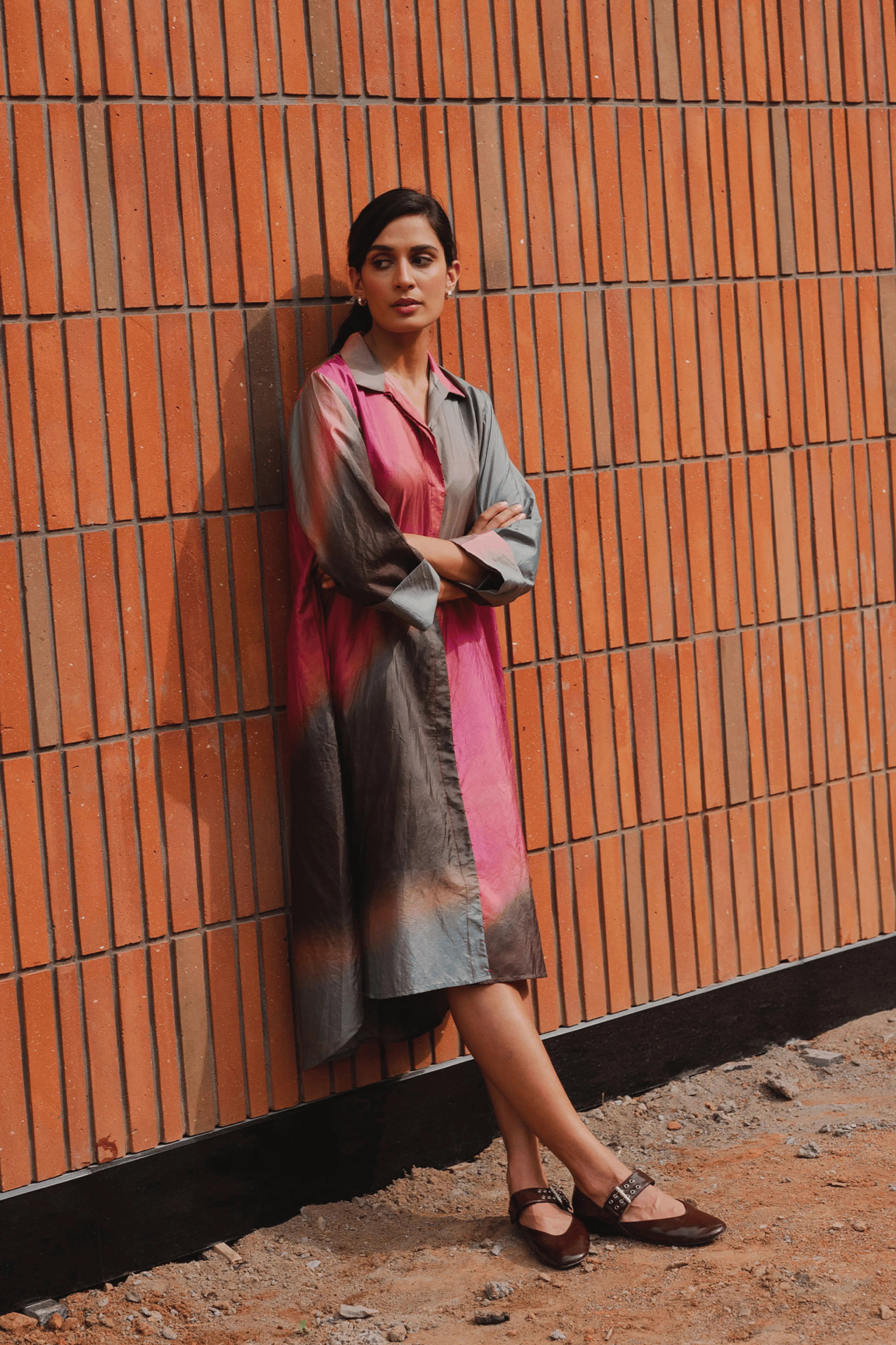 Crafted from pure silk, this airy shirt dress exudes quiet confidence. It features a collared neckline, concealed button placket, and a subtle high-low hem. The dramatic ombré palette flows through deep charcoal, ember pink, forest green, and touches of clay red, blending boldness with ease.
