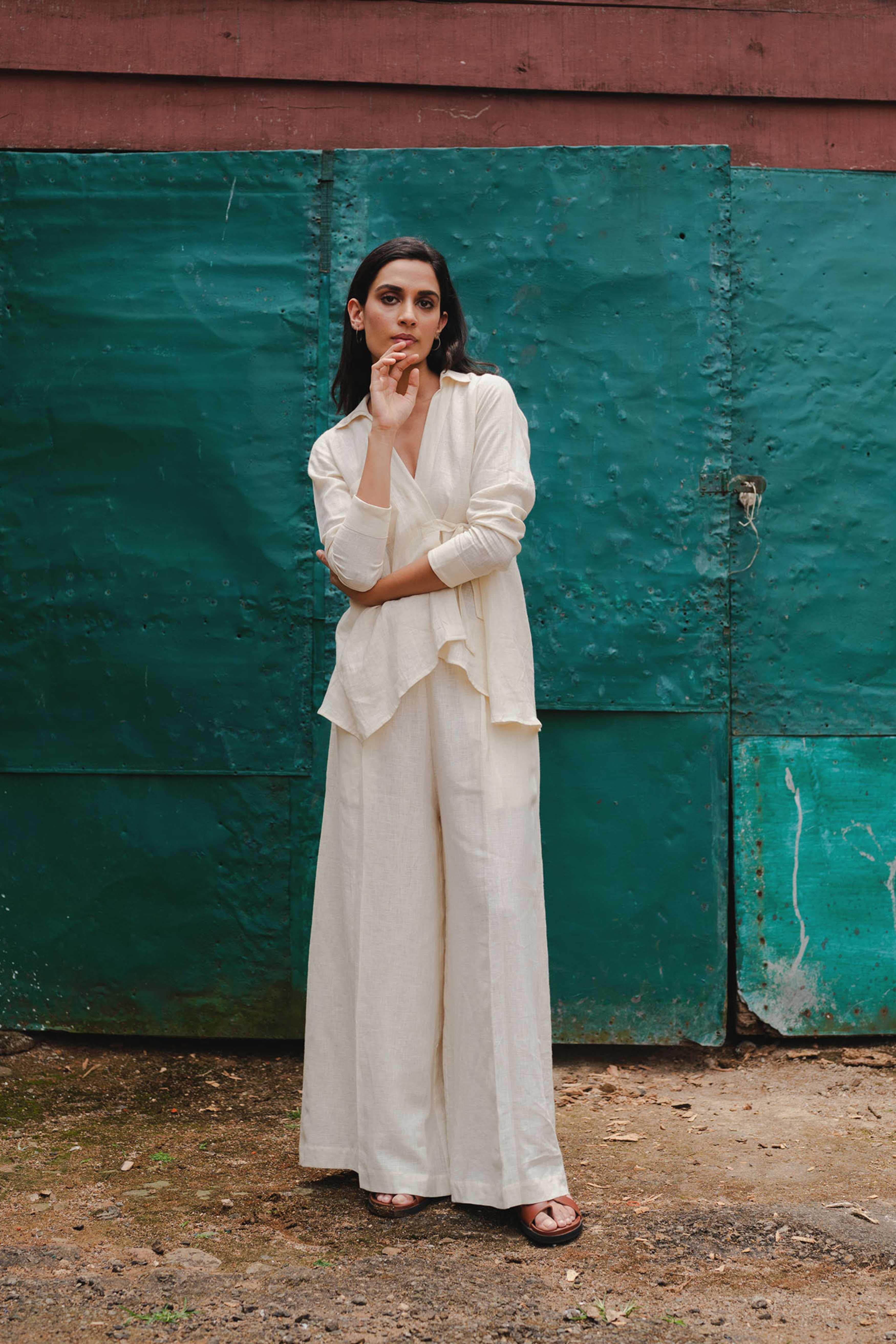 A relaxed, minimal tie-around shirt crafted from pure cream linen. Featuring side triangle panels that gather softly at the waist, it’s finished with embroidered pockets for a delicate touch of detail—an effortless blend of structure and ease.