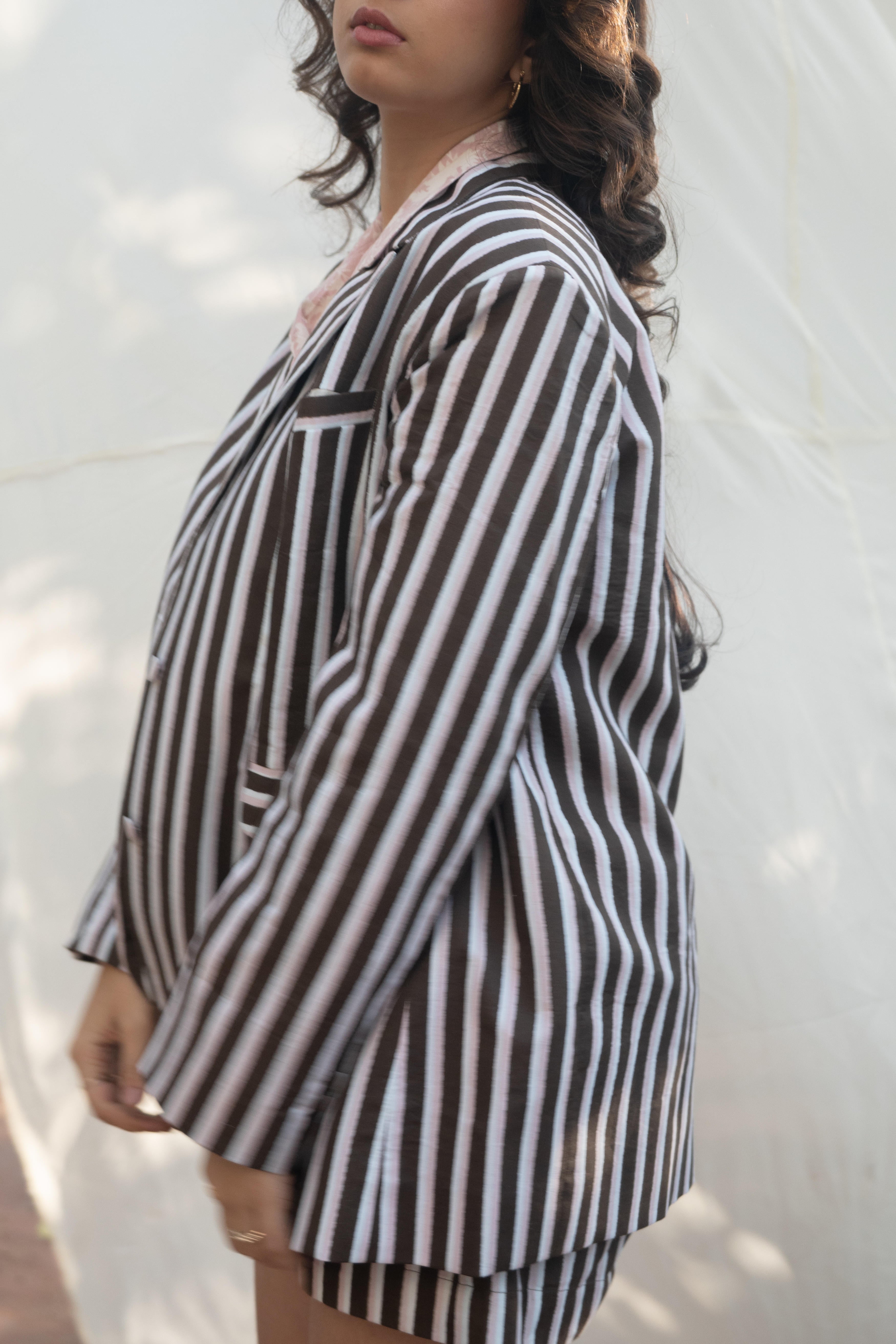 Eira Double-Buttoned Blazer — structured in cut, yet easy in presence. Designed in a longline silhouette with sharp lapels and a neat double-button front, it creates a clean vertical line while allowing generous ease through the body. Thoughtfully lined with soft cotton mul, it feels breathable and gentle against the skin, making it effortless to layer over co-ord trousers, denim, or even a slip dress. The result is a graphic, confident edge that still moves with quiet ease. Graphic and grounded, the Eira Pants bring rhythm into the wardrobe through clean, uninterrupted stripes. Cut in a wide-leg silhouette that falls straight from the hip, they offer gentle looseness for structure without stiffness. Soft pleats at the front add ease and comfort, letting the pants move fluidly through the day. Thoughtfully lined with breathable cotton mul, they hold their crisp lines from daylight into after-dark, keeping their shape while allowing effortless movement with every step.