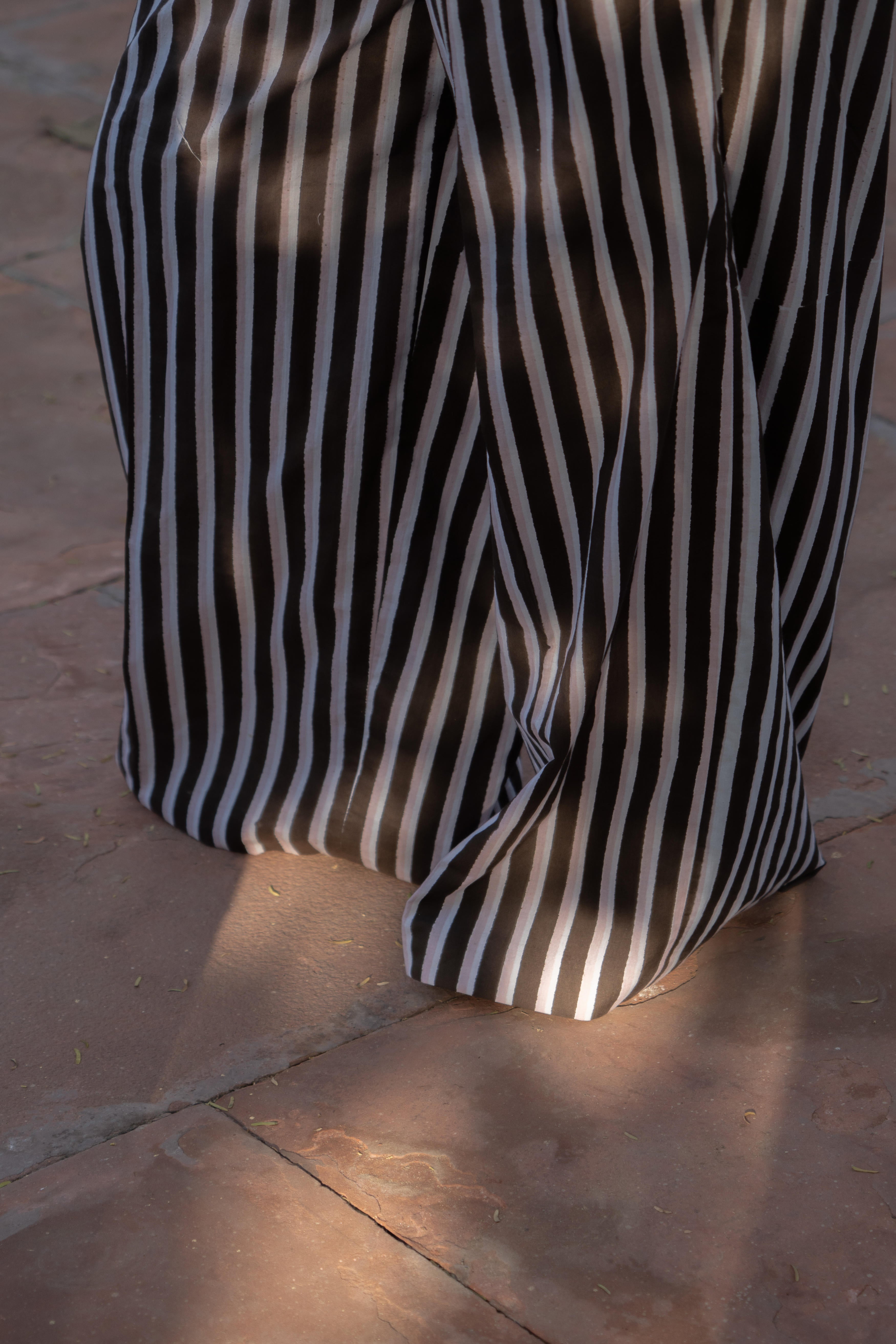 Eira Double-Buttoned Blazer — structured in cut, yet easy in presence. Designed in a longline silhouette with sharp lapels and a neat double-button front, it creates a clean vertical line while allowing generous ease through the body. Thoughtfully lined with soft cotton mul, it feels breathable and gentle against the skin, making it effortless to layer over co-ord trousers, denim, or even a slip dress. The result is a graphic, confident edge that still moves with quiet ease. Graphic and grounded, the Eira Pants bring rhythm into the wardrobe through clean, uninterrupted stripes. Cut in a wide-leg silhouette that falls straight from the hip, they offer gentle looseness for structure without stiffness. Soft pleats at the front add ease and comfort, letting the pants move fluidly through the day. Thoughtfully lined with breathable cotton mul, they hold their crisp lines from daylight into after-dark, keeping their shape while allowing effortless movement with every step.