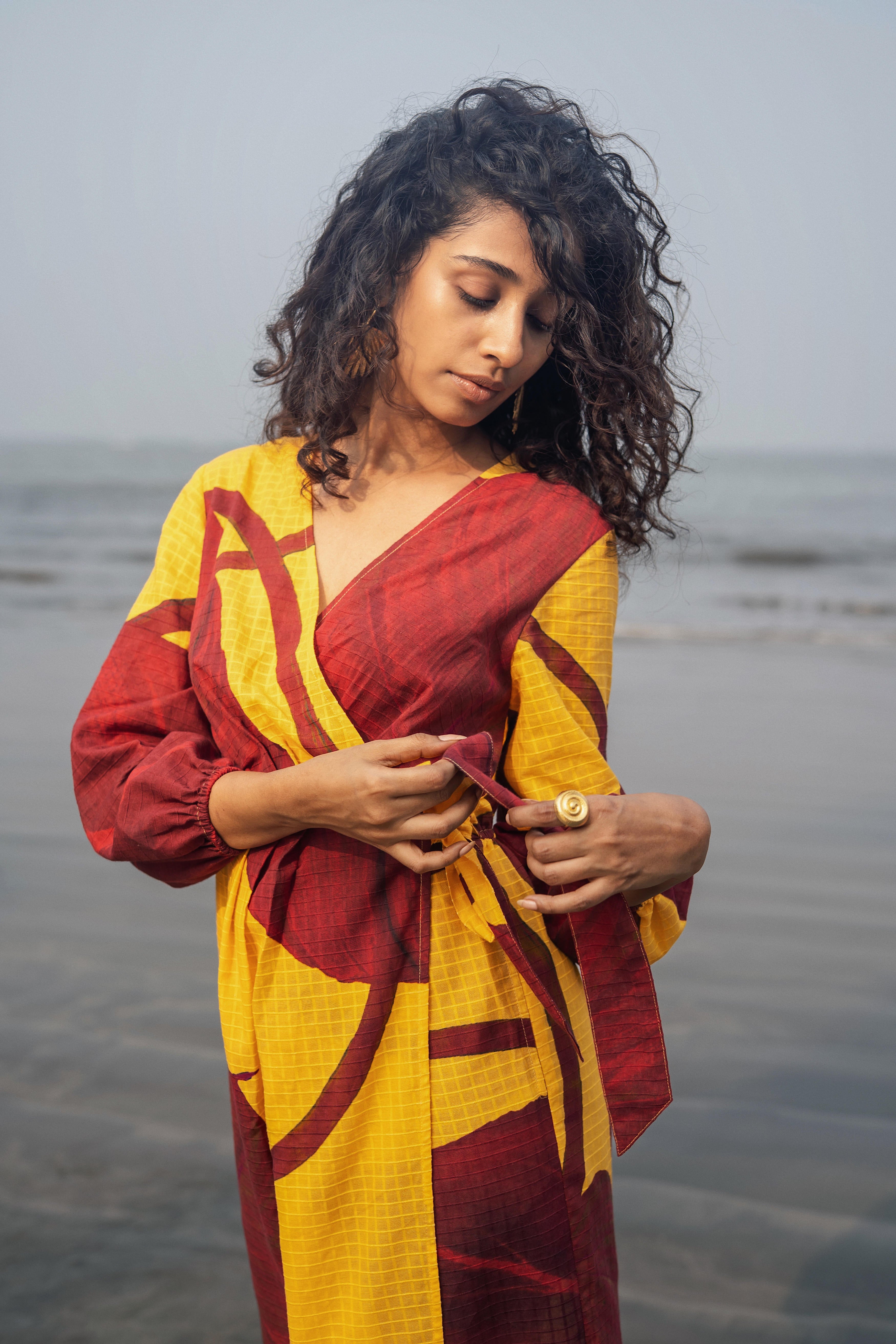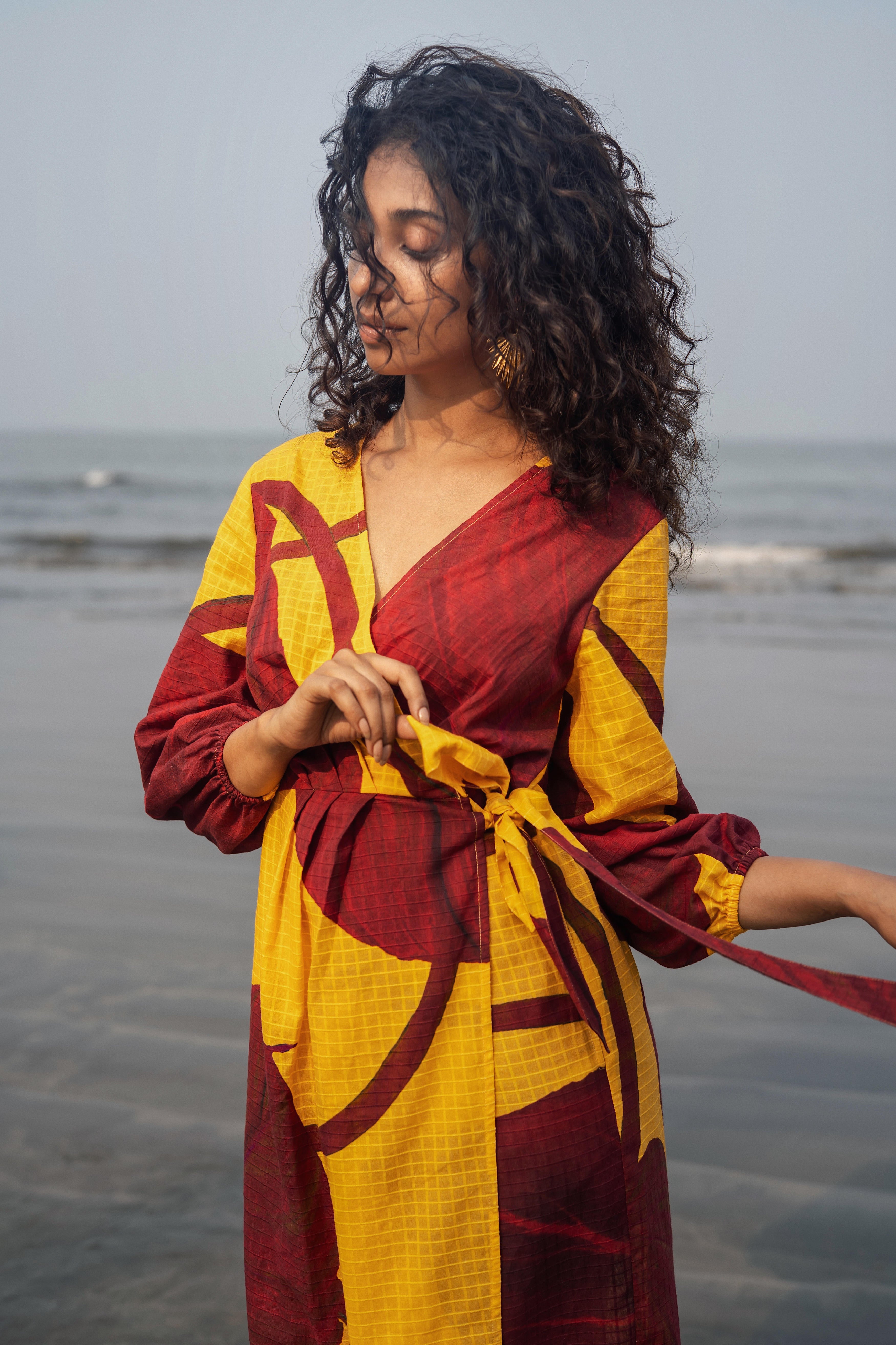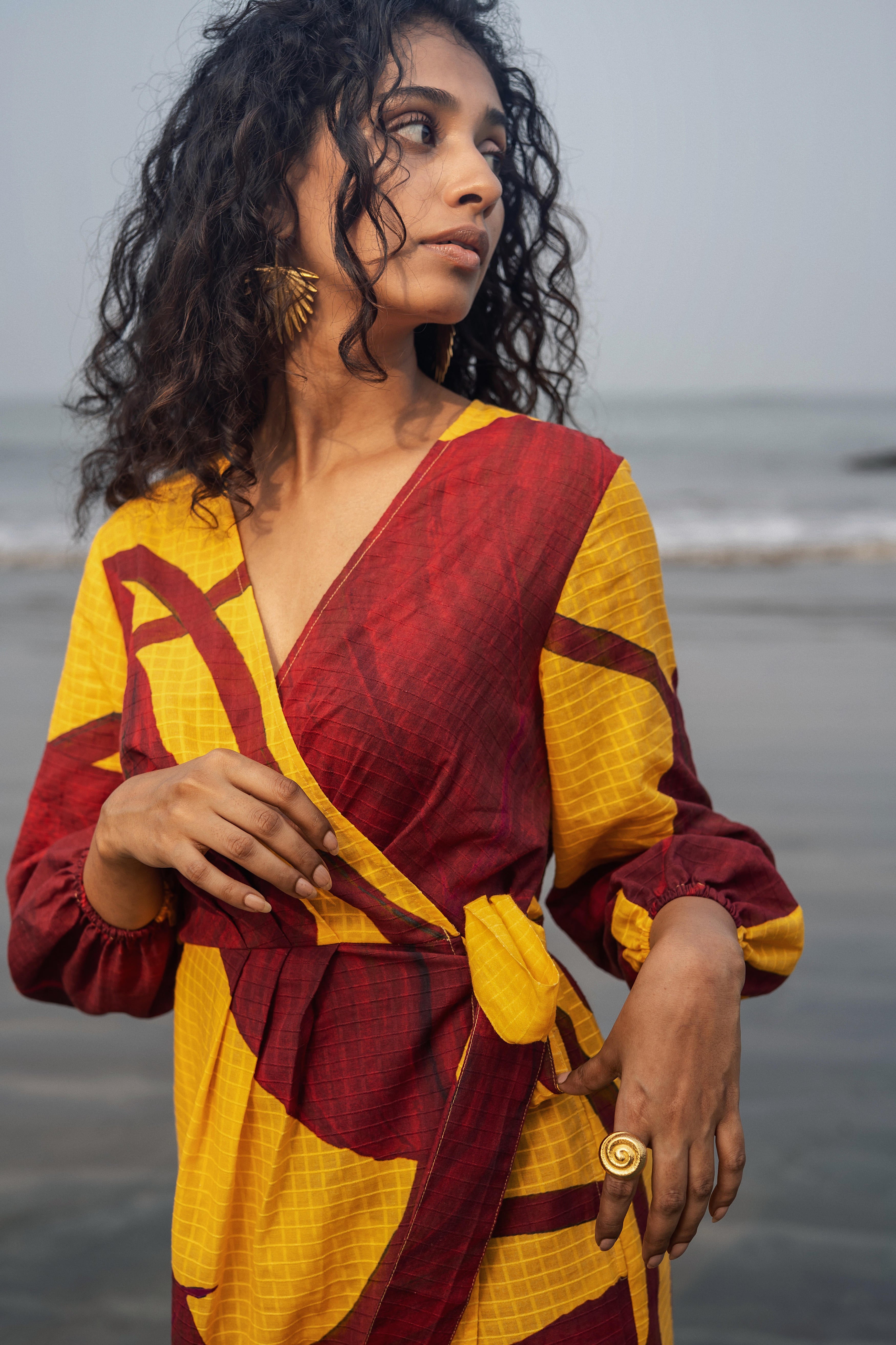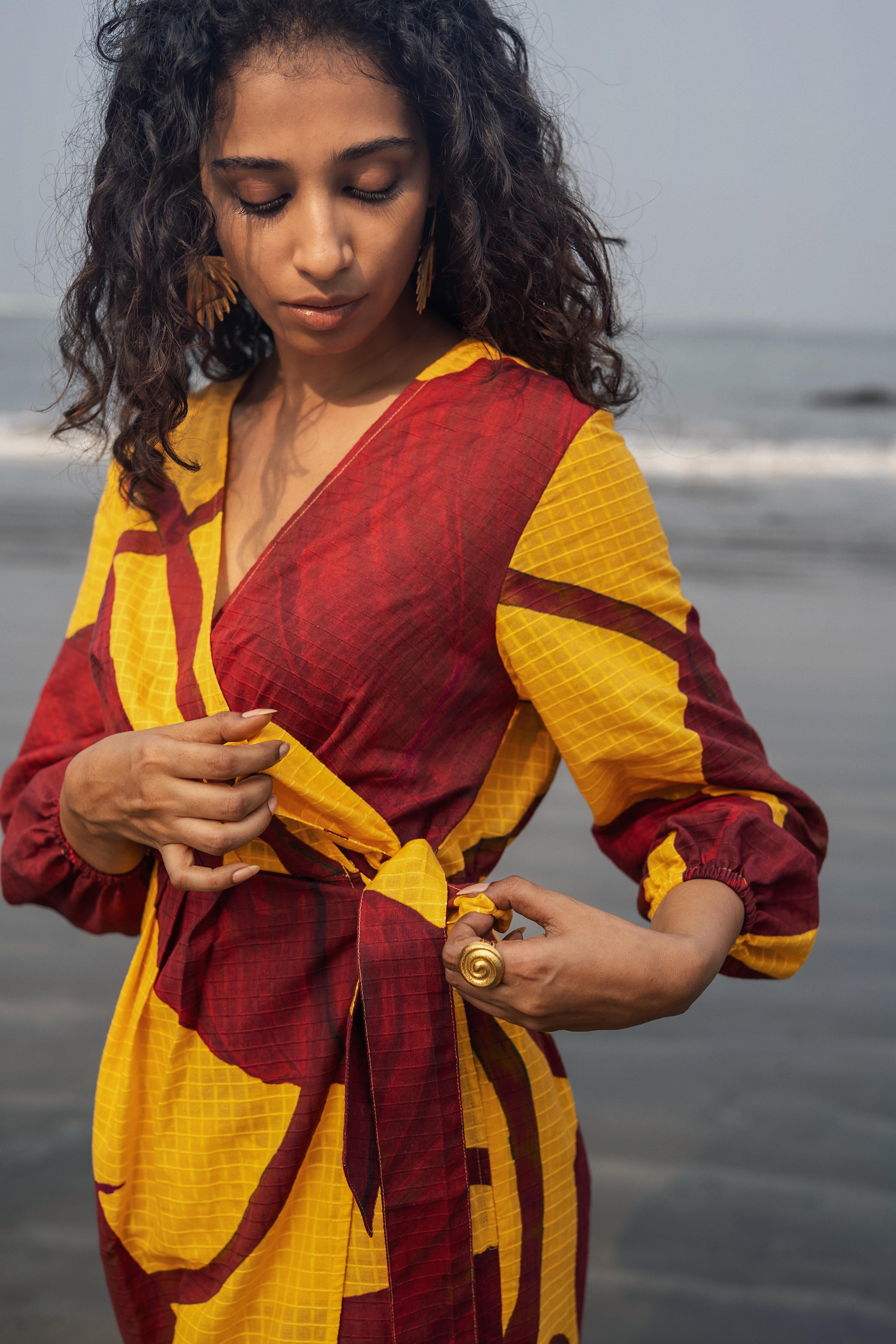 The Eka wrap dress is made from our Cotton chequard slub fabric with paan print. It has a pleat detailing at the waist and elasticated at the back.