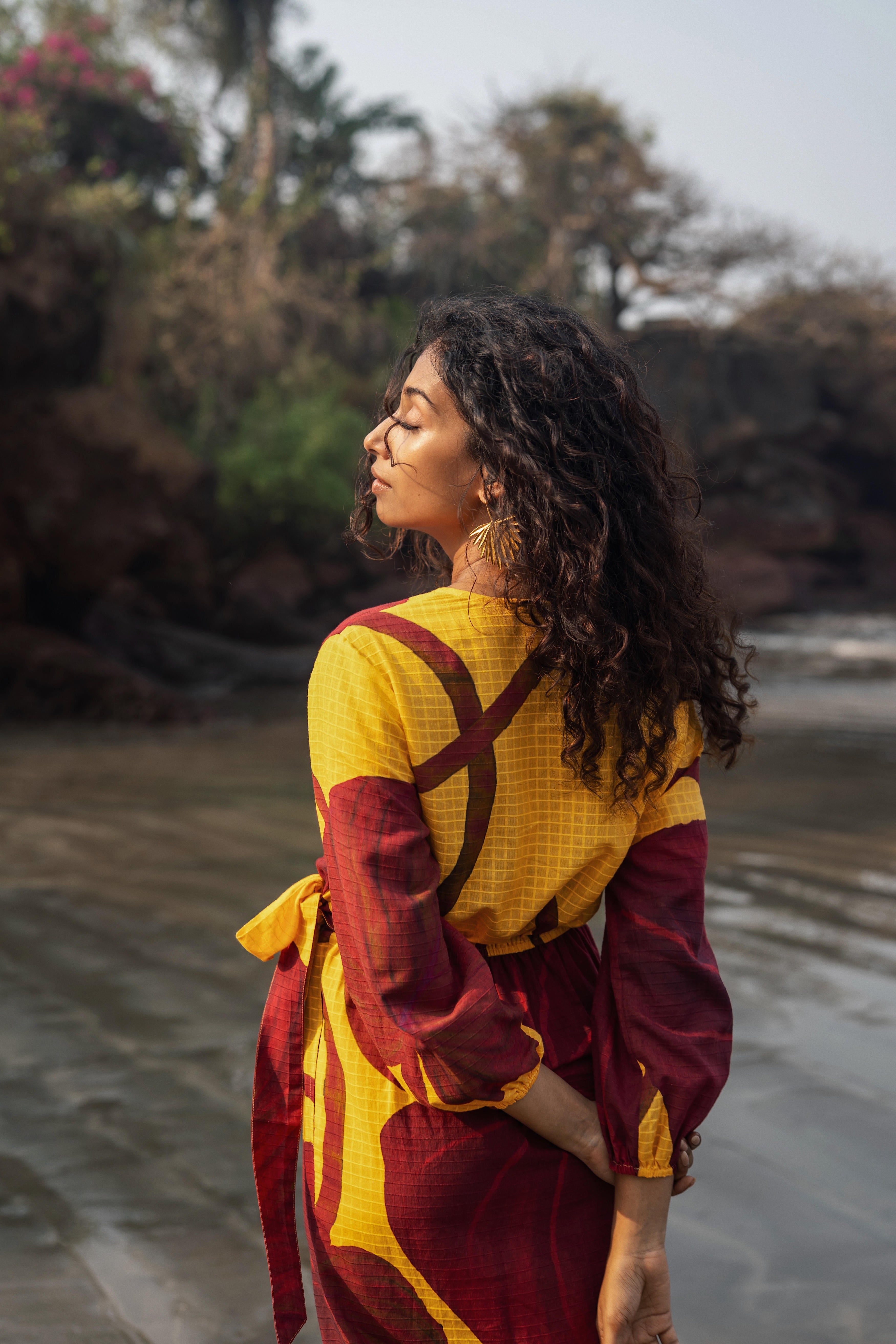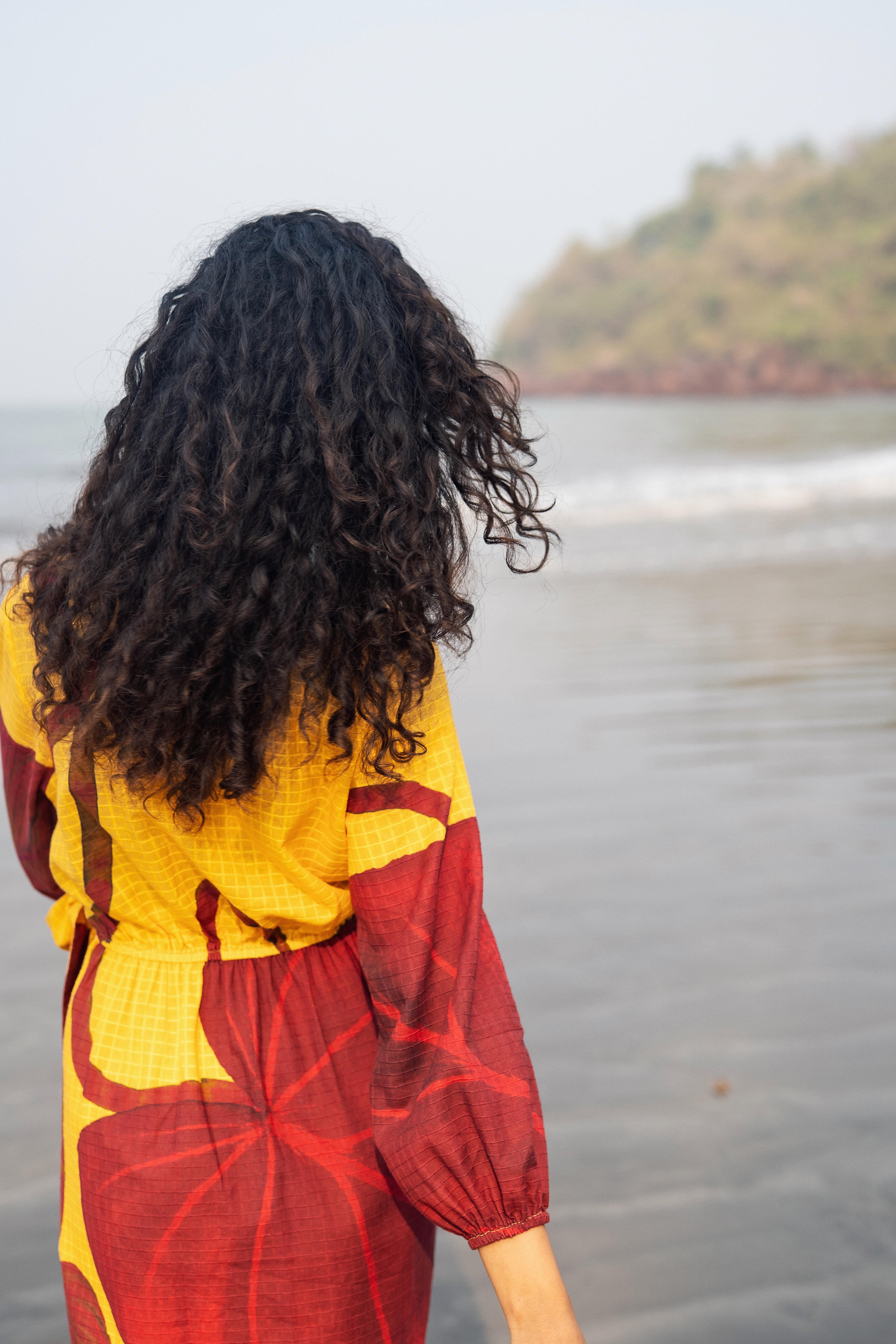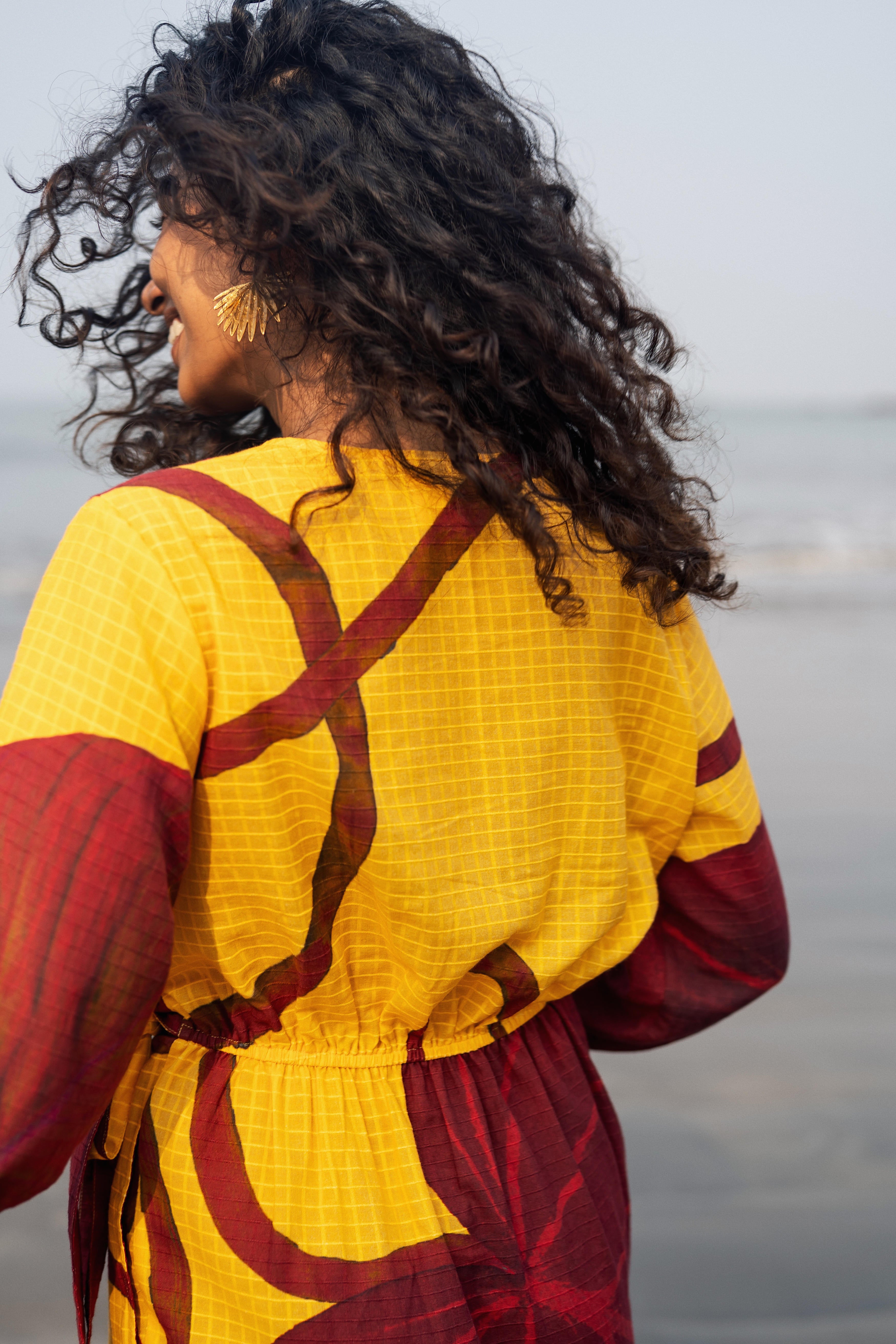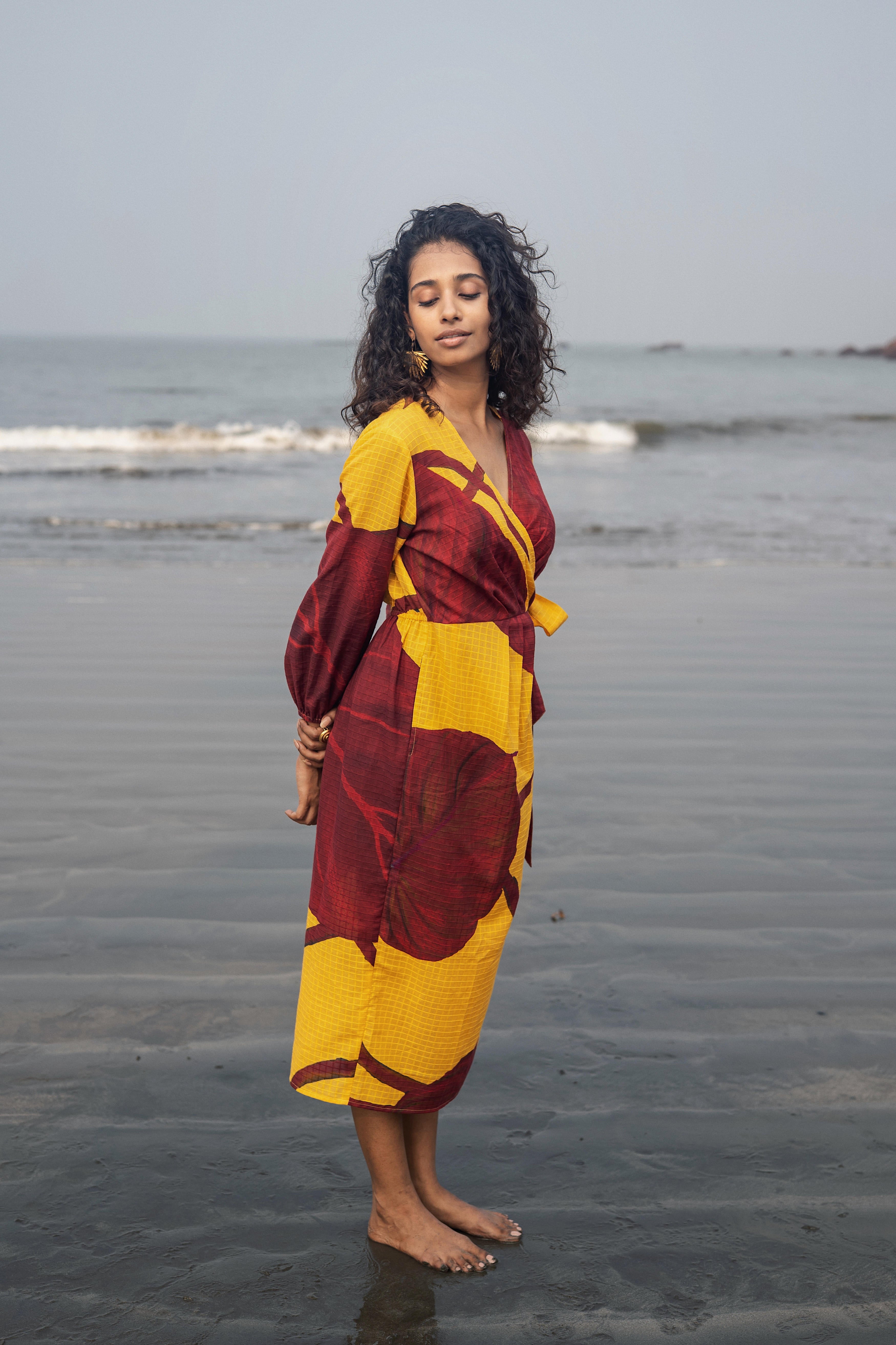 The Eka wrap dress is made from our Cotton chequard slub fabric with paan print. It has a pleat detailing at the waist and elasticated at the back.