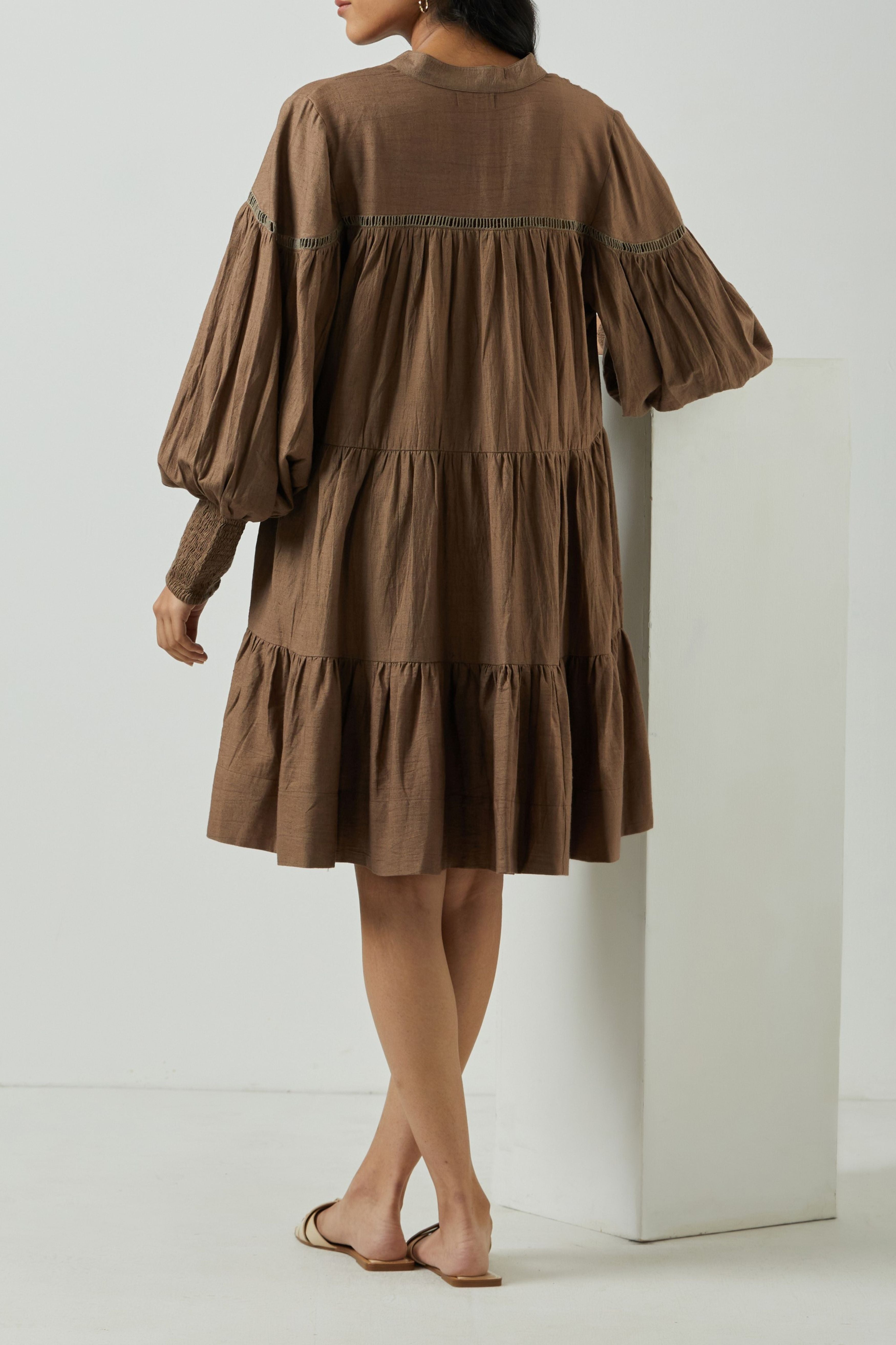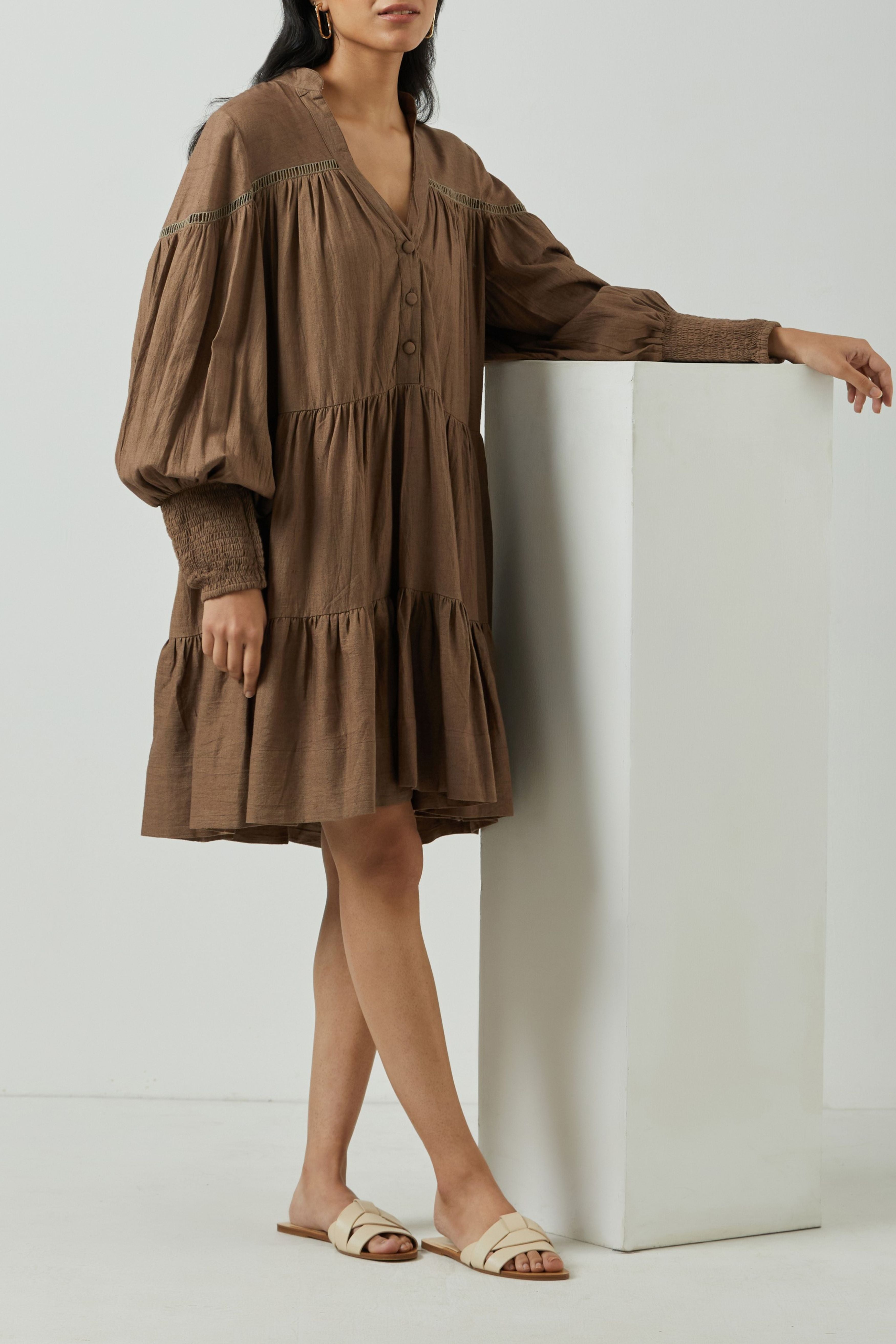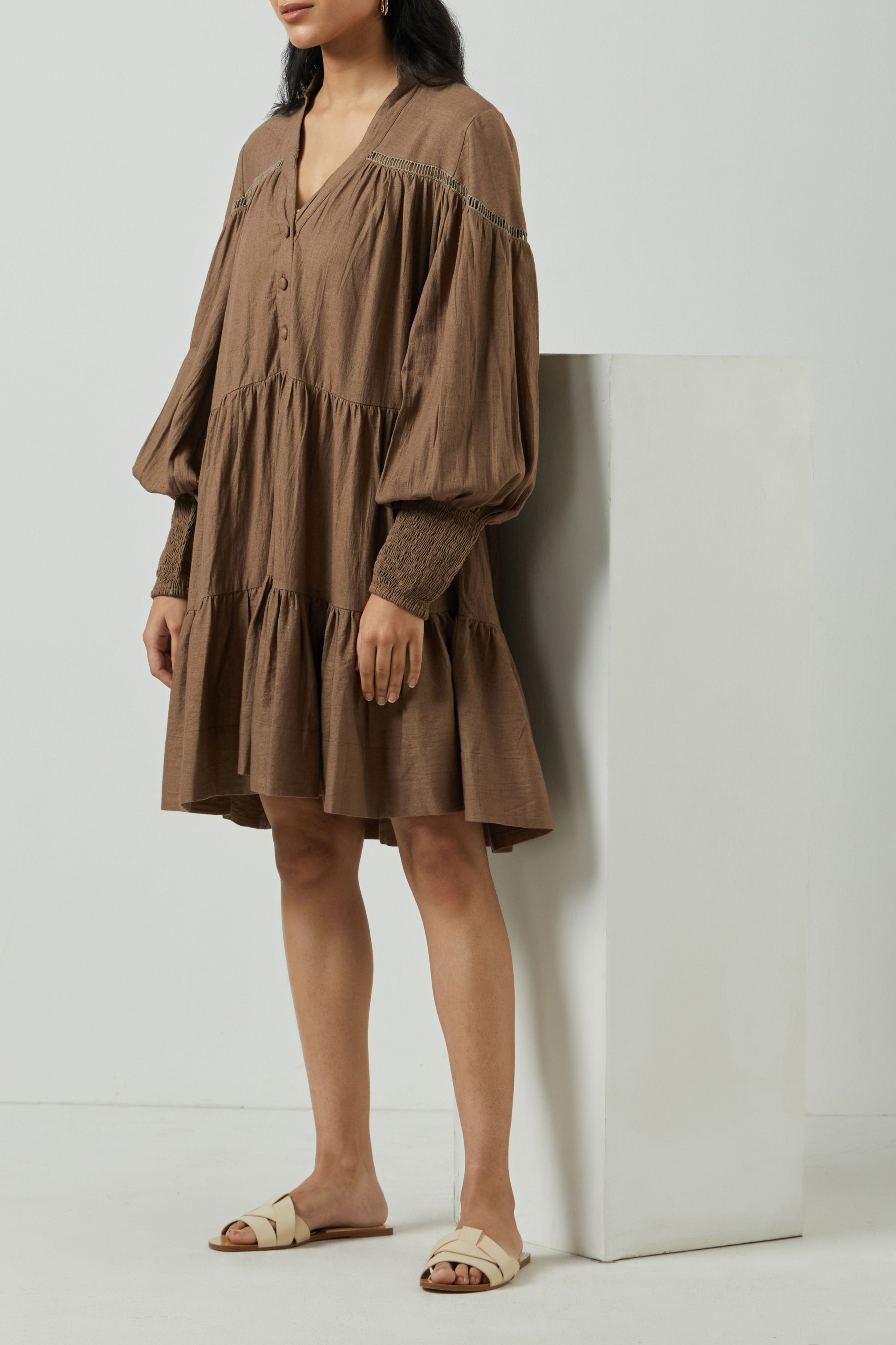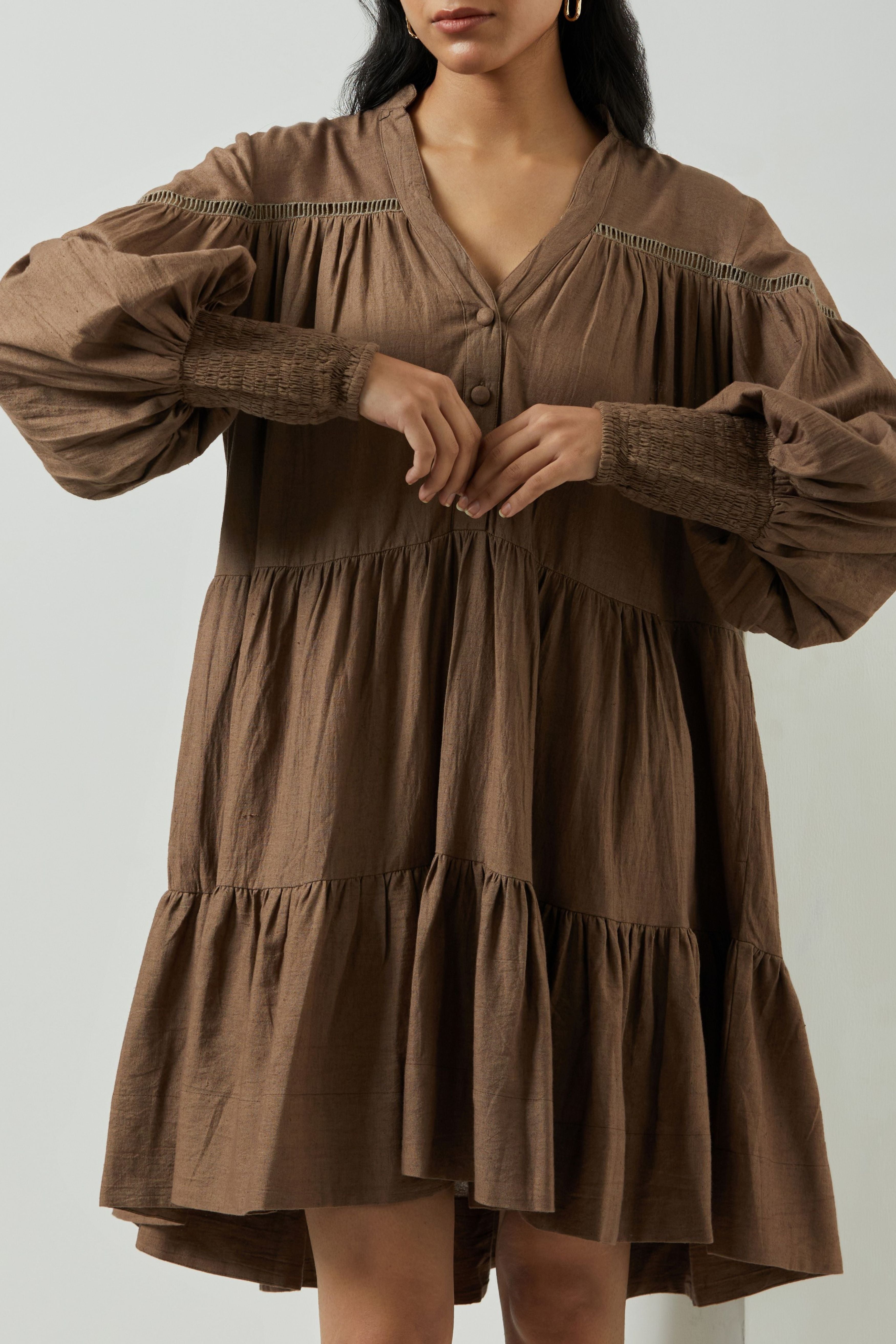 This neutral chocolate go-to voluminous and tiered dress with gathers, intricate lace detailing on the yoke and ruching on sleeve cuffs . This dress flatters any body type and gives enough breathable space to flow freely. This dress is comfort lifestyle inspired , perfect for all seasons. - Front opening with gathered tiers and ruching detailing on sleeve cuffs - Free size with lace detailing all over front and back yoke - Oversized flowy fit - Model is wearing size S - This is a textile fabric. The subtle imperfections in the weave, texture and colors are a natural outcome of handcrafted textiles and not a defect.