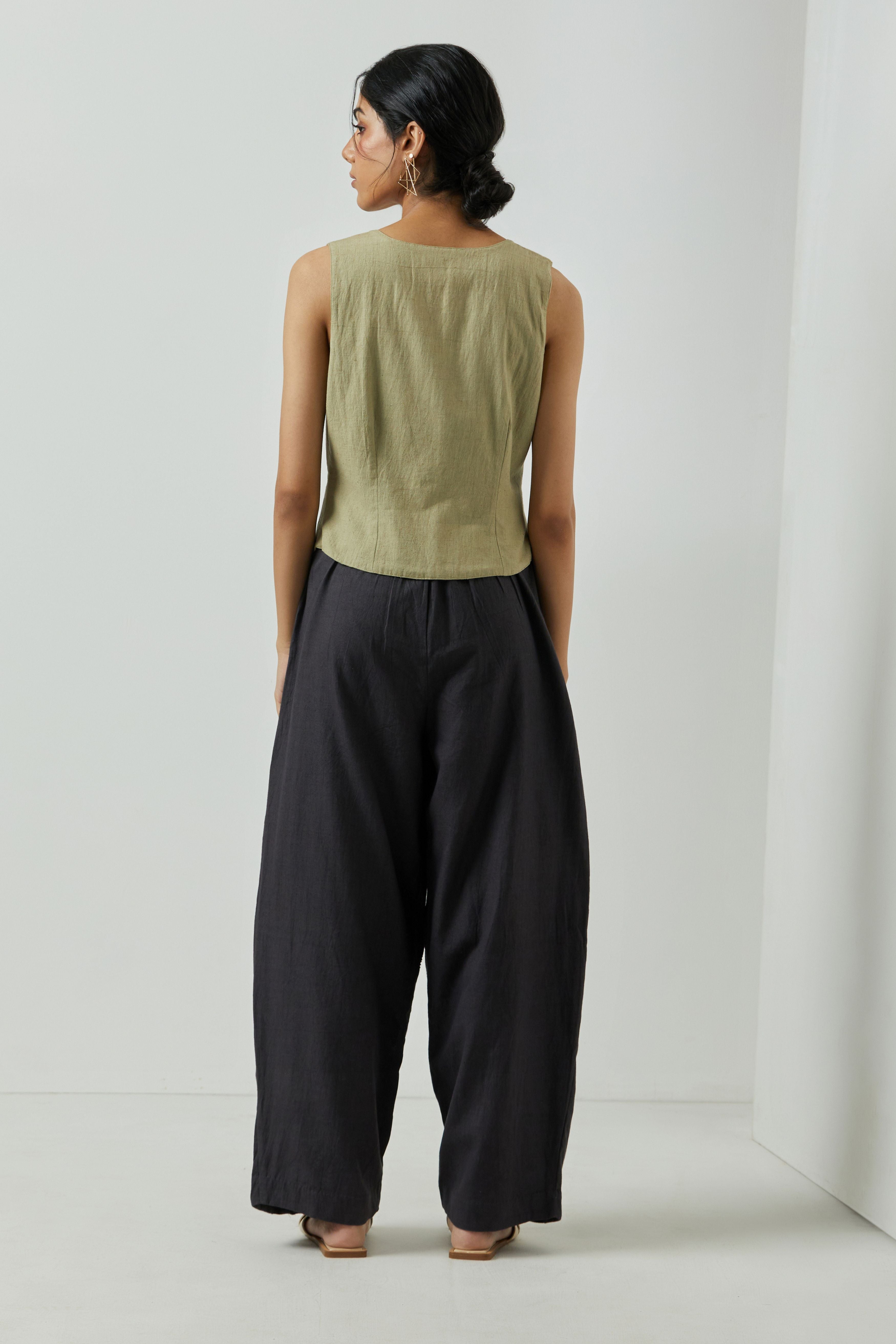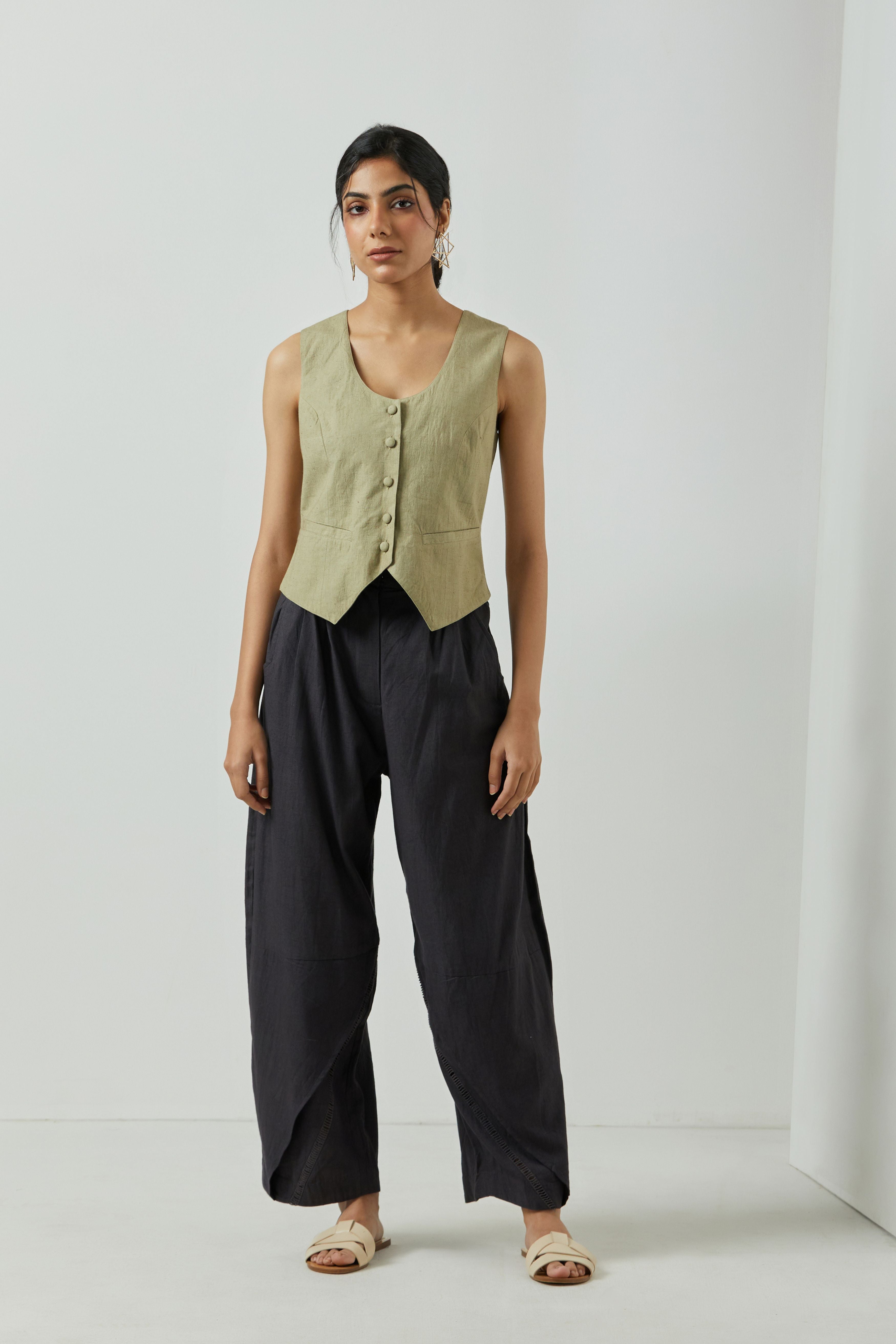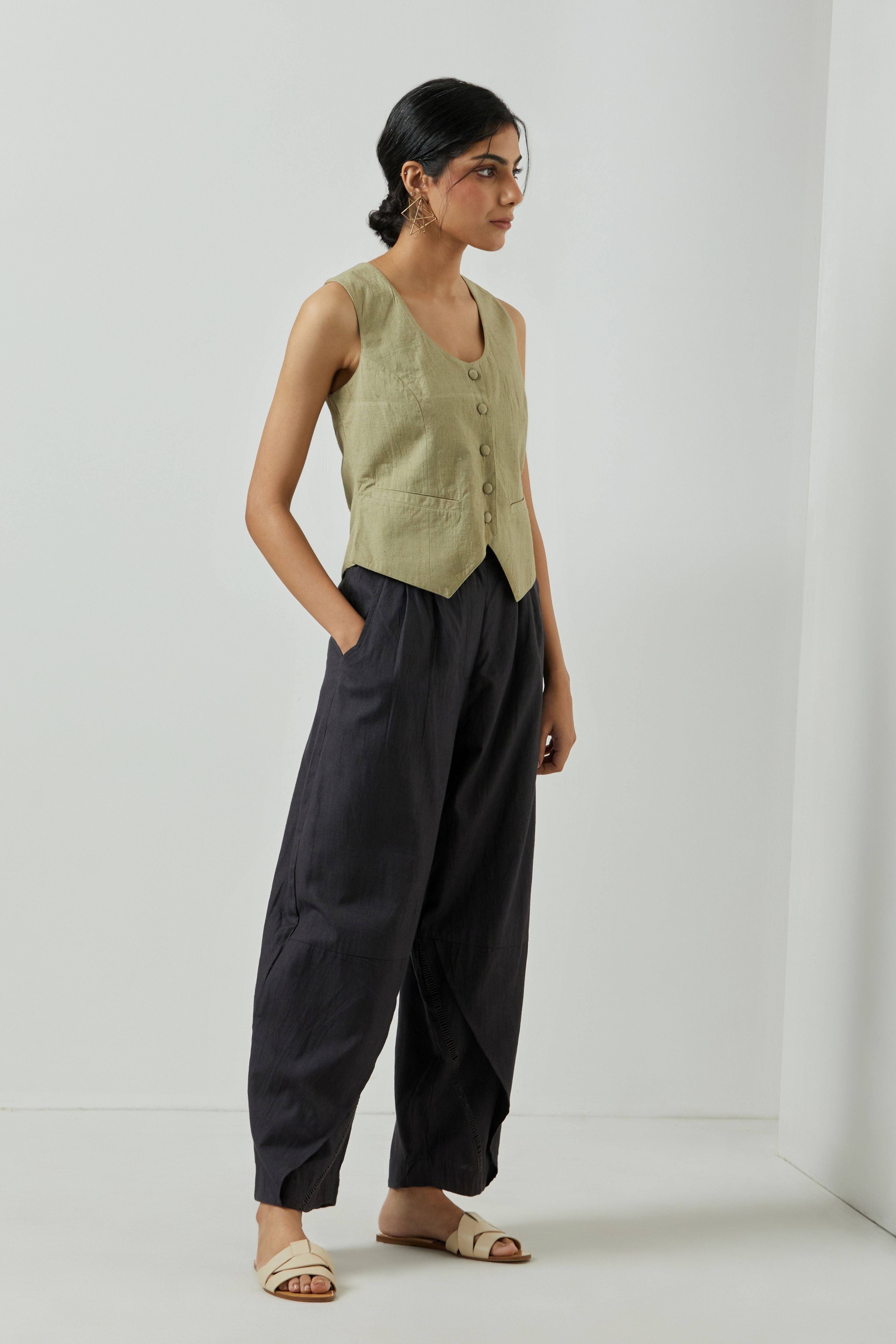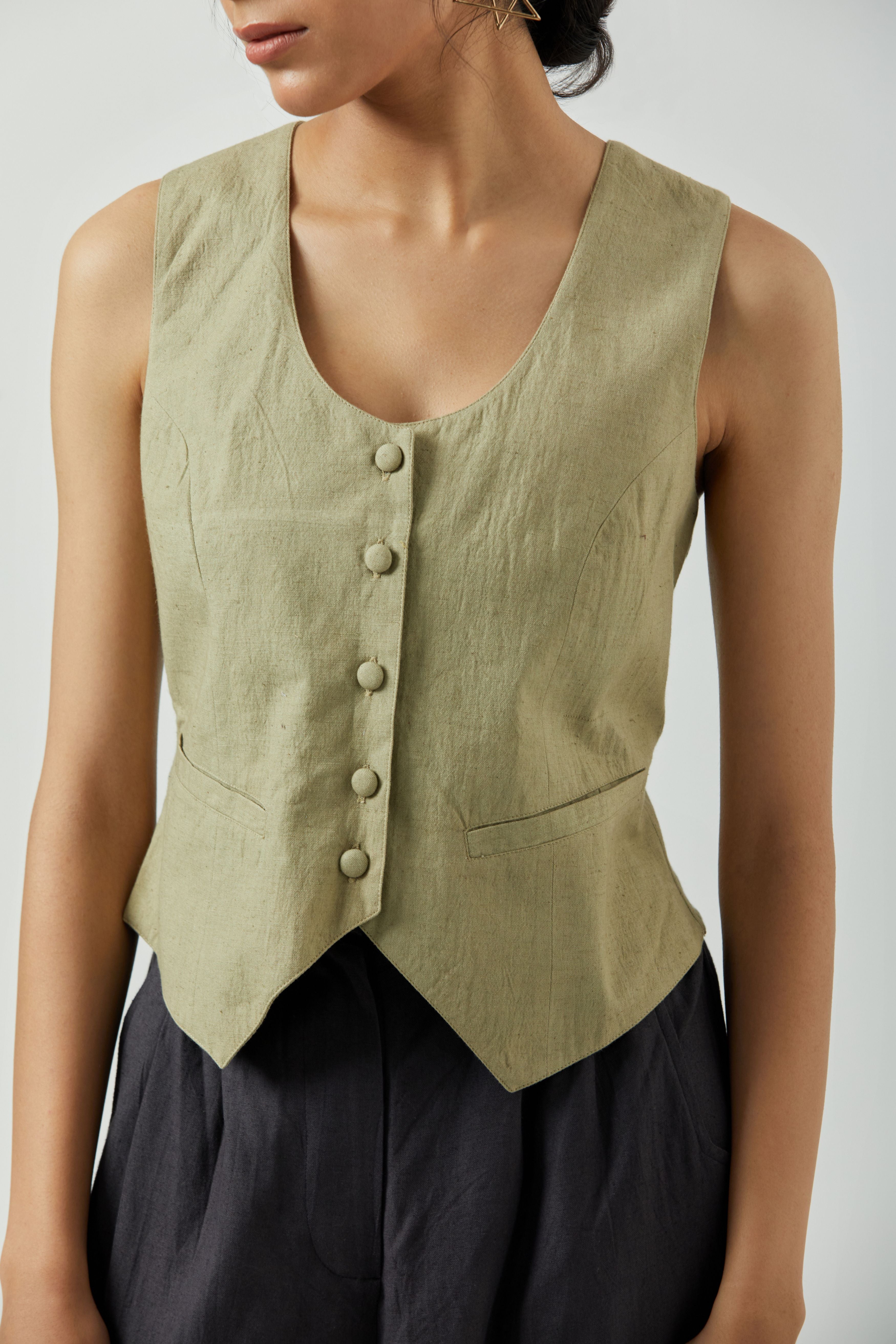 Ecru Waist Coat in khadi cotton is perfect for casual and semi formal styling with U-shaped neckline and asymmetric hemline. This blouse jacket can be coordinated with our Oxford Ash Pants and Ecru-Ash Shirt Jacket. This top is comfort lifestyle inspired , perfect for all seasons. - Front placket with centre front pockets - Asymmetric hemline , sleeveless - Slim fit - Model is wearing size S - This is a textile fabric. The subtle imperfections in the weave, texture and colors are a natural outcome of handcrafted textiles and not a defect.